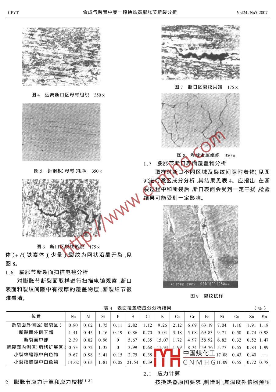 安全分析合成氣裝置中變一段換熱器膨脹節(jié)斷裂分析張維波張洪軍王東1鄭啟文1.中國(guó)石油吉林石化公司吉林吉林1320222.哈爾濱焊接研究所黑龍江哈爾濱150080)摘要某廠(chǎng)中變一段換熱器新?lián)Q上的0Crl8Ni9不銹鋼制U形膨脹節(jié)僅運(yùn)行2個(gè)月即發(fā)生突然斷裂。檢驗(yàn)表明斷裂起始于膨脹節(jié)波峰外壁屬高應(yīng)力下應(yīng)力腐蝕開(kāi)裂。外保溫材料中含Cˉ、S№a等組份并較長(zhǎng)時(shí)間被水浸漬膨脹節(jié)材料已整體嚴(yán)重脆化,顯微組織中馬氏體所占比例達(dá)到50%顯微硬度達(dá)到H√400左右焊接質(zhì)量差膨脹節(jié)波峰處應(yīng)力較高質(zhì)中含氪等是引起破壞的主要原因。本文還提岀防止和控制上述問(wèn)題的技術(shù)措施。關(guān)鍵詞U形膨脹節(jié)應(yīng)力腐蝕開(kāi)裂泐治措施中圖分類(lèi)號(hào):Q050.9文獻(xiàn)標(biāo)識(shí)碼3B章編號(hào)001-483X2007)5-0036-05Fracture Analysis of Expansion Joint for Middle Transform First-sectionHeat Exchanger of Synthesis Gas PlantZHANG Wei-bo' ZHANG Hong-jun, WANG Dong, ZHENG Qi-wen?'(1.Jilin Petrochemical Co. PetroChina Co. Ltd. Jilin 132022, China 2. Harbin Research Institute of Weldg, Harbin 150080 ChinaAbstract The fracture accident of a new U - type expansion joint of middle transform first-section heat ex-changer occurred suddenly in service for only two months it was made ofOCrl8Ni9 austenitic stainlesssteel. Test showed that above fracture originated from out-wall of the expansion joint and was stress corsion cracking at high stress level. Causes of the accident were out-insulating - materials contained CI sNa tc vand were soaked by water for longer time ' expansion joint materials whole were embrittle seriously andits martensite content was about 50% and micro- hardness were about Hv400 i welding quality was inferiorStress on wave crest was higher there was hydrogen in medium and so on. The corresponding prevention measures were put forwardKey words: U- type expansion joint ;stress corrosion cracking prevention measures某廠(chǎng)合成氣車(chē)間中變一段換熱器新?lián)Q上的Umm和16mm材料為16MnR。筒體上原裝置的是圓形膨脹節(jié)運(yùn)行時(shí)間僅2個(gè)月即發(fā)生突然斷裂并引環(huán)狀g形補(bǔ)償器其外徑為D10=900mm截面Dy發(fā)閃爆導(dǎo)致合成氣裝置停車(chē)。為弄清膨脹節(jié)斷裂中國(guó)煤化工N9T斷裂的、新?lián)Q上性質(zhì)和原因開(kāi)展了下述分析試驗(yàn)工作的是CNMHG其波高h(yuǎn)=105m波該換熱器已運(yùn)行22年為直立固定管板、管殼長(zhǎng)W=16m波假外倥DD=616mm圓弧半徑r式換熱器內(nèi)徑D,=600mm高H=7117mm,兩管=35mm厚度δ=8mm材料0Crl8N9。換熱器運(yùn)板間距H=5994mm,筒體和封頭厚度分別為12行參數(shù)見(jiàn)表1第24卷第5期壓力容器總第174期表1換熱器運(yùn)行參數(shù)為斜斷囗與表面之間呈大約45°夾角(見(jiàn)圖2)從項(xiàng)自殼程管程波峰斷裂處到波根壁厚測(cè)量值見(jiàn)表2。設(shè)計(jì)壓力(MPa)2,65設(shè)計(jì)溫度(℃操作壓力(MPa)2.5操作溫度(℃)250~350介質(zhì)合成氣中變氣有小裂紋的縱焊縫未開(kāi)裂的縱焊縫圖1斷裂的膨脹節(jié)(局部)檢測(cè)與試驗(yàn)1.1宏觀(guān)檢查U形膨脹節(jié)在波峰處沿環(huán)向幾乎整圈斷開(kāi),僅??v縫相連見(jiàn)圖1。宏觀(guān)看斷口外壁側(cè)沿壁厚約3.5mm范圍內(nèi)較平坦且大致與表面垂直;內(nèi)壁側(cè)圖2膨脹節(jié)斷囗表2膨脹節(jié)壁厚測(cè)量?jī)啅牟ǚ濉ǜ?位置縱縫附近6.766.75676.886.957147147.327387.367417417.8遠(yuǎn)離縱縫6.686.756.816856486947.007.197.397.427.657.807.52遠(yuǎn)離縱縫6,7446.997.107.217.417.477.617.707.87.837.85斷口上覆蓋一層較厚的附著物,局部區(qū)域表面較窄的、未斷開(kāi)的縱縫區(qū)未發(fā)現(xiàn)裂紋。和裂紋間隙內(nèi)還有薄的白色物膜。斷口上有一處宏膨脹節(jié)采用現(xiàn)場(chǎng)分瓣組裝,瓣間對(duì)接采用手工觀(guān)劈裂。在較寬的、未斷開(kāi)的縱縫區(qū)波峰及其兩側(cè)電弧焊焊接質(zhì)量較差對(duì)接縱縫存在錯(cuò)邊、未焊透40mm范圍內(nèi)內(nèi)壁焊縫表面存在多條與縱縫大致和咬邊等缺陷。垂直的裂紋最長(zhǎng)的約40mm波峰區(qū)表面裂紋張囗1.2膨脹節(jié)材料成分見(jiàn)表3)較大(約1mm)波峰兩側(cè)裂紋張口較小。在另一條1.3膨脹節(jié)材料金相分析表3膨脹節(jié)材料化學(xué)成分分析結(jié)果(%)元素cM樣1/試樣20.050.050.500.591.71.880.016/0.0160.041/0.03218.18/18.188.25/8.39從膨脹節(jié)斷口處和遠(yuǎn)離斷囗處分別取多個(gè)試樣進(jìn)行顯微觀(guān)察另外還從8mm厚鋼板上取樣進(jìn)行對(duì)比分析檢驗(yàn)表明斷囗區(qū)材料組織為:A(奧氏體)+M(馬氏體)+(鐵素體),其中馬氏體組織所占比例約50%見(jiàn)圖3;遠(yuǎn)離斷口的材料組織同斷口處相似,馬氏體組織約50%,見(jiàn)圖4新板材組織為:(奧氏體)+(鐵素體Ⅹ少量),其中沒(méi)有馬氏體組織,見(jiàn)圖5。1.4膨脹節(jié)材料顯微硬度測(cè)定斷冂區(qū)得材組織350×膨脹節(jié)(Hv):366366A38386A56A47A15硬T中國(guó)煤化工穿晶、穿晶+沿晶混新鋼板(Hv)約200CNMHG1.5膨脹節(jié)裂紋金相分析縱向接頭區(qū)內(nèi)壁小裂紋均分布于焊縫金屬中觀(guān)察顯示膨脹節(jié)波峰環(huán)向斷裂及其附近裂紋(包括焊縫邊緣局部補(bǔ)焊打磨平滑區(qū))較大的裂紋均處于母材區(qū)其材質(zhì)已嚴(yán)重脆倀M約50%,顯微深度已達(dá)壁厚之半;焊縫金屬顯微組