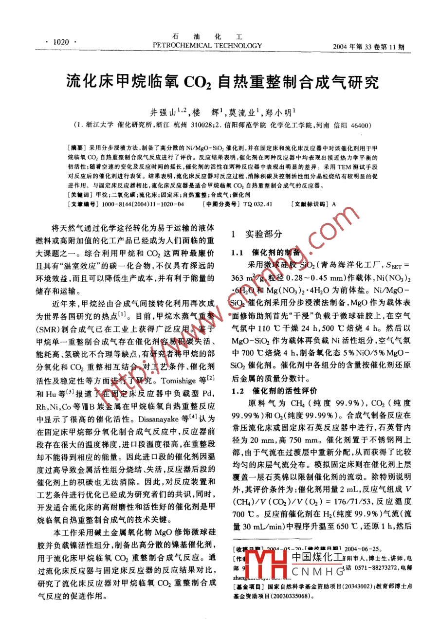 石油化工1020·PETROCHEMICAL TECHNOLOGY2004年第33卷第11期流化床甲烷臨氧CO2自熱重整制合成氣研究井強山2,樓輝1,莫流業(yè)1,鄭小明1(1.浙江大學催化研究所,浙江杭州310028;2.信陽師范學院化學化工學院,河南信陽46400)摘要]采用分步浸漬方法制備了高分散的Ni/MgO-SsO2催化劑,并在固定床和流化床反應(yīng)器中對該催化劑用于甲烷臨氧CO2自熱重整制合成氣反應(yīng)進行了評價。反應(yīng)緒果表明,催化劑在兩種反應(yīng)器中均表現(xiàn)出接近熱力學平衡的初活性;隨著空速的變化及反應(yīng)時間的延長,催化劑的活性在兩種反應(yīng)器中表現(xiàn)出明顯的差異。采用TEM測試手段對反應(yīng)后的催化劑進行表征。結(jié)果表明,流化床反應(yīng)器對反應(yīng)過程消除積碳及控制活性組分晶粒燒結(jié)有較明顯的促進作用。與固定床反應(yīng)器相比,流化床反應(yīng)器是適合甲烷臨氧CO2自熱重整制合成氣的反應(yīng)器關(guān)鬟詞]甲烷;二氧化碳;流化床;固定床;自熱重整;合成氣;催化劑[文章編號]1000-8144(2004)11-1020-04[中圖分類號]TQ032.41文獻標識碼]A將天然氣通過化學途徑轉(zhuǎn)化為易于運輸?shù)囊后w燃料或高附加值的化工產(chǎn)品已經(jīng)成為人們面臨的重1實驗部分大課題之一。綜合利用甲烷和CO2這兩種最廉價1.1催化劑的制備且具有“溫室效應(yīng)”的碳一化合物,不僅具有深遠的采用微球硅膠SiO2(青島海洋化工廠,SBr環(huán)境效益,而且可以降低生產(chǎn)成本,并有利于能量的363m2/g,粒徑028~0.45mm)作載體,Ni(NO3)2儲存和運輸。6H2O和Mg(NO3)24H2O為前體鹽。Ni/MgO近年來,甲烷經(jīng)由合成氣間接轉(zhuǎn)化利用再次成SO2催化劑采用分步浸漬法制備MgO作為載體表為世界各國研究的熱點1。目前,甲烷水蒸氣重整面修飾助劑首先“干浸”負載于微球硅膠上,在空氣(SMR)制合成氣已在工業(yè)上獲得廣泛應(yīng)用。鑒于氣氛中110℃干燥24h,500℃焙燒4h。然后以甲烷單一重整制合成氣存在催化劑容易積碳失活、MgO-SiO2作為載體再負載Ni活性組分,空氣氣能耗高、氫碳比不合理等缺點,有研究者將甲烷的部中700℃焙燒4h,制備氧化態(tài)5%NO/5%MgO分氧化和CO2重整相互結(jié)合,對工藝條件催化劑SiO2催化劑。催化劑中各組分的含量按催化劑還原活性及穩(wěn)定性等方面進行了研究。 Tomishige等(21后金屬的質(zhì)量分數(shù)計。和Hu等{3報道了在固定床反應(yīng)器中負載型Pd1.2催化劑的活性評價Rh,Ni,Co等ⅧB族金屬在甲烷臨氧自熱重整反應(yīng)原料氣為CH4(純度99.9%),CO2(純度中顯示了很高的催化活性。 Dissanayake等4l認為99.99%)和Oh(純度99.99%)。合成氣制備反應(yīng)在在固定床甲烷部分氧化制合成氣反應(yīng)中,反應(yīng)器前常壓流化床或固定床石英反應(yīng)器中進行石英管內(nèi)段存在很大的溫度梯度,進口段溫度很高,在重整段徑為20mm,高750mm。催化劑置于不銹鋼網(wǎng)上卻不能得到相應(yīng)的能量。因此進口段的催化劑因溫部,由于氣流在過渡層中重新分配從而獲得了比較度過高導致金屬活性組分燒結(jié)失活反應(yīng)器后段的均勻的床層氣流分布。模擬固定床則在催化劑上層催化劑上的積碳也無法消除。因此對反應(yīng)裝置和覆蓋一層石英棉以限制催化劑的流動。除特別說明工藝條件進行優(yōu)化已經(jīng)成為研究者們的共識,同時,外,其評價條件為:催化劑用量2mL,反應(yīng)氣組成v開發(fā)適合流化床的高耐磨性和活性好的催化劑是甲(CH4)/V(CO2)/v(O2)=176/71/53,反應(yīng)溫度烷臨氧自熱重整制合成氣的技術(shù)關(guān)鍵700℃。反應(yīng)前催化劑在H2(純度99.9%)氣流(流本工作采用堿土金屬氧化物MgO修飾微球硅量30mL/min)中程序升溫至650℃,還原1h,然后膠并負載鎳活性組分,制備出高分散的鎳基催化劑,用于流化床甲烷臨氧CO2重整制合成氣反應(yīng)。通[收鞭∩.「峰改日12004-06-25中國煤化工陽市人,博士生,講師,電過流化床反應(yīng)器與固定床反應(yīng)器的反應(yīng)結(jié)果對比,部CNMHG話0571-8232電郵研究了流化床反應(yīng)器對甲烷臨氧CO2重整制合成[基金項目]國家自然科學基金資助項目(20343002);教育部博士點氣反應(yīng)的促進作用。基金資助項目(2003033068)第11期井強山等.流化床甲烷臨氧CO2自熱重整制合成氣研究1021切換反應(yīng)氣進行反應(yīng)。反應(yīng)尾氣經(jīng)冷阱(冰水)冷凝熱量一定程度補償了CH4-CO2重整反應(yīng)所需要的后再經(jīng)無水高氯酸鎂除水后,用島津GC-8A型氣熱量,從而極大地促進該反應(yīng)的進行。催化劑顆粒相色譜儀進行在線檢測(TDX-01柱,熱導檢測器,在流化床中的循環(huán)流動使流化床獲得了均勻的床層Ar載氣)。整個反應(yīng)過程中氧氣全部被消耗。溫度分布,流化床催化劑的床層溫降較固定床催化1.3催化劑的表征劑的床層溫降小得多,提高了反應(yīng)性能,使得流化床透射電子顯微鏡(TEM)用于觀察反應(yīng)后催化CH自熱重整反應(yīng)性能接近熱力學平衡值。劑上的積碳。試樣反應(yīng)前后的TEM圖由JM22流化床及固定床反應(yīng)器中催化劑穩(wěn)定性比較2020F(JEOL)型電子顯微鏡測得。催化劑的穩(wěn)定性是催化劑工業(yè)化的一個決定性2結(jié)果與討論因素。前期的研究發(fā)現(xiàn){5),CH臨氧CO2自熱重整反應(yīng)中,鎳物種的燒結(jié)導致了Ni/SiO2的失活。本2.1不同反應(yīng)器中空速對催化劑反應(yīng)性能的彩響實驗