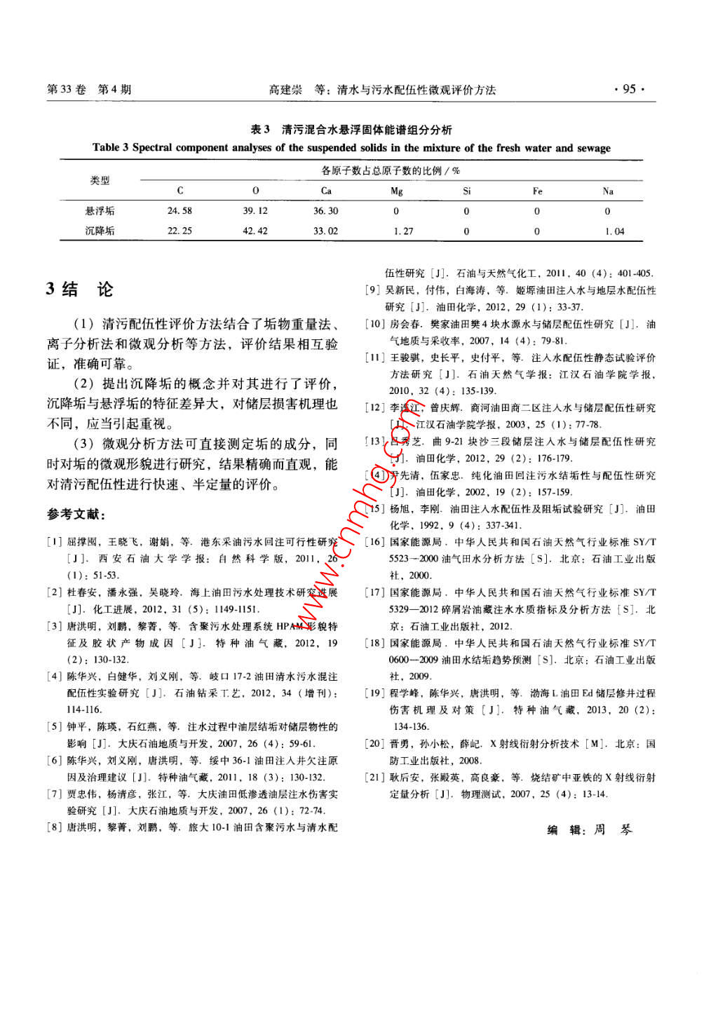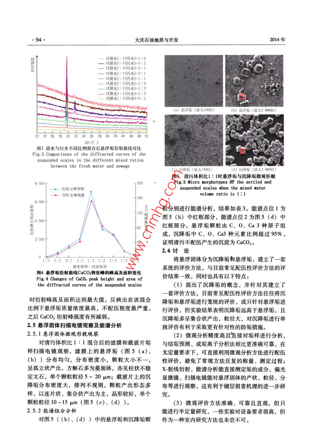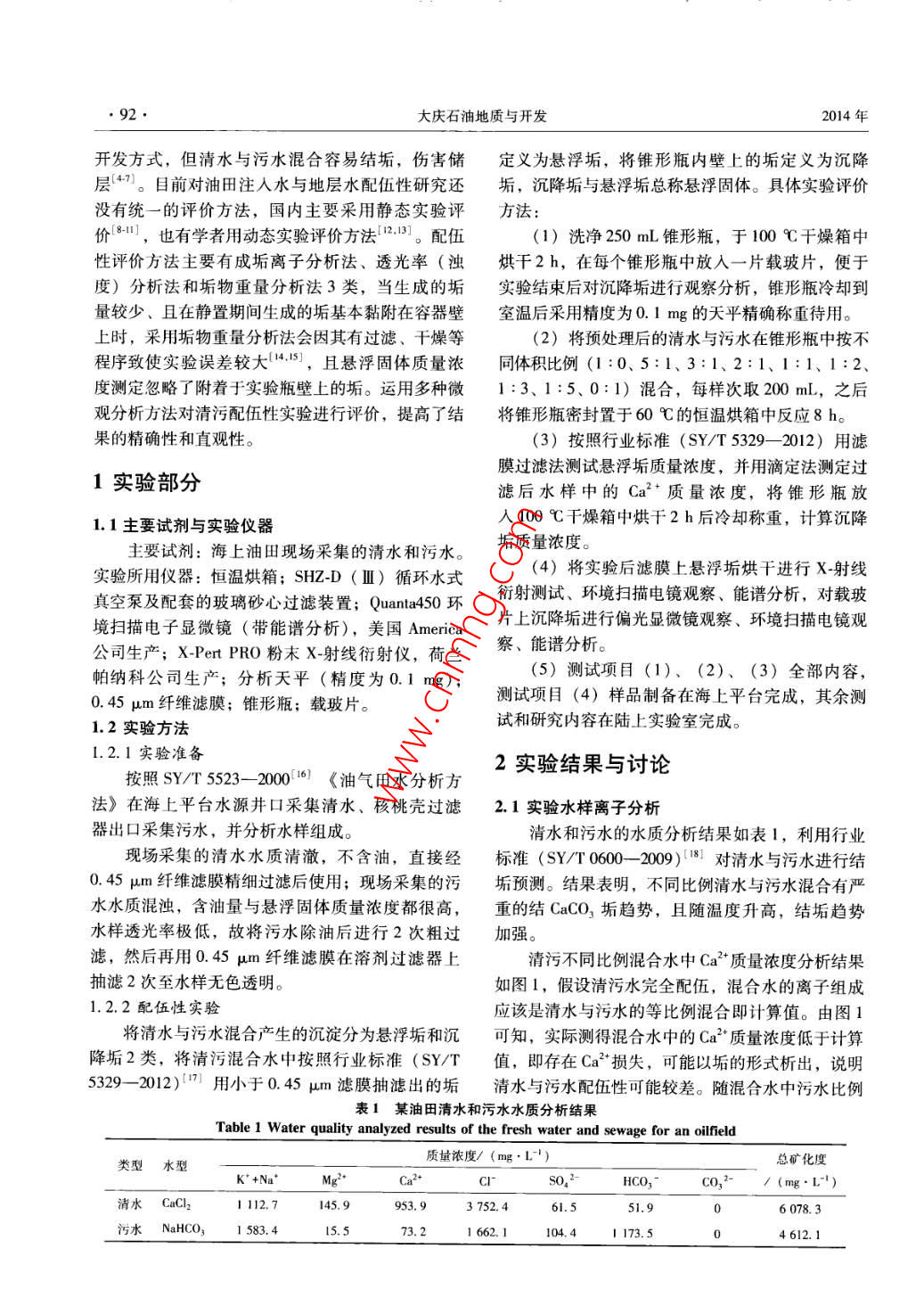 2014年8月大慶石油地質(zhì)與開發(fā)Aug,2014第33卷第4期Petroleum Geology and Oilfield Development in DaqingVol 33 No 4DoI:10.3969/J.ISSN.1000-3754.2014.04.019清水與污水配伍性微觀評(píng)價(jià)方法高建崇!劉義剛山金城張嶺文鑫2唐洪明(1.中海石油(中國(guó))有限公司天津分公司,天津300452;2.中海石油(中國(guó))有限公司深圳分公司廣州研究院,廣東廣州510240;3.西南石油大學(xué)油氣藏地質(zhì)及開發(fā)工程國(guó)家重點(diǎn)實(shí)驗(yàn)室,四川成都610500)摘要:清、污水混注是海上中高含水油田普遍釆用的注水開發(fā)方式,但清水與污水混合容易結(jié)垢,傷害儲(chǔ)層。為評(píng)價(jià)清污混注過(guò)程中清水與污水的配伍性,對(duì)垢物重量法加以改進(jìn),將懸浮固體分為沉降垢和懸浮垢,運(yùn)用偏光顯微鏡、Ⅹ-射線衍射、掃描電鏡和能譜分析等微觀分析手段,建立了一套系統(tǒng)評(píng)價(jià)清污配伍性的新方法和實(shí)驗(yàn)流程。評(píng)價(jià)結(jié)果準(zhǔn)確、可靠且直觀。關(guān)鍵詞:清污配伍性;評(píng)價(jià)方法;垢物重量法;X-射線衍射;掃描電鏡中圖分類號(hào):TE992.2文獻(xiàn)標(biāo)識(shí)碼:A文章編號(hào):1000-3754(2014)04-0091-05MICROSCOPIC EVALUATING METHOD OF THE COMPATIBILITYBETWEEN THE FRESH WATER AND SEWAGEGAO Jianchong, LIU Yigang, SHAN Jincheng, ZHANG ling, WEN Xin, TANG Hongming1. Tianjin Branch of CNOOC China Limited, Tianjin 300452, China; 2. Research Institute of Shenzhen Branchof CNOOC China Limited, Guangzhou 510240, China; 3. National Key Laboratory in Petroleum geologand Development Engineering of Southwest Petroleum University, Chengdu 610500, ChinaAbstract: The mixed injection between the fresh water and sewage is generally adopted waterflooding method in theoffshore oilfields in the periods of medium and high water cuts, but the mixture is prone to scale and damage thereservoirs. In order to evaluate the compatibility between the fresh water and sewage in the process of the abovemixed injection, the scale gravimetric method is improved, thus the suspended solids can be divided into the settledand suspended scales, with the help of the following microscopic analyzing methods such as POM polarizing mi-croscope), XRD, SEM, EDAX (energy dispersive analysis X-ray )and so on, a set of new methods and experi-mental flow charts are established to systematically evaluate the above compatibility. The evaluated results are pre-cise, reliable and intuitiveKey words: fresh water-sewage compatibility; evaluating method; scale weight/ gravimetric method; XRD (X-raydiffraction): SEM (scanning electron microscope產(chǎn)出污水中含有大量的懸浮物、油、無(wú)機(jī)鹽以境污染和水資源浪費(fèi),最好的方法是回注地層3。及各種難分解的有機(jī)物,直接排放會(huì)造成嚴(yán)重的環(huán)清、污水混注是海上中高含水油田普遍采用的注水收稿日期:2013-08-11改回日期:2013-11-25作者簡(jiǎn)介:高建崇,男,1979年生,工程師,現(xiàn)主要從事采油工藝方面的研究。E-mailh@cnooc.com.cn92·大慶石油地質(zhì)與開發(fā)2014年開發(fā)方式,但清水與污水混合容易結(jié)垢,傷害儲(chǔ)定義為懸浮垢,將錐形瓶?jī)?nèi)壁上的垢定義為沉降層。目前對(duì)油田注入水與地層水配伍性研究還垢,沉降垢與懸浮垢總稱懸浮固體。具體實(shí)驗(yàn)評(píng)價(jià)沒(méi)有統(tǒng)一的評(píng)價(jià)方法,國(guó)內(nèi)主要采用靜態(tài)實(shí)驗(yàn)評(píng)方法價(jià)也有學(xué)者用動(dòng)態(tài)實(shí)驗(yàn)評(píng)價(jià)方法配伍(1)洗凈250mL錐形瓶,于100℃干燥箱中性評(píng)價(jià)方法主要有成垢離子分析法、透光率(濁烘干2h,在每個(gè)錐形瓶中放入一片載玻片,便于度)分析法和垢物重量分析法3類,當(dāng)生成的垢實(shí)驗(yàn)結(jié)束后對(duì)沉降垢進(jìn)行觀察分析,錐形瓶冷卻到量較少、且在靜置期間生成的垢基本黏附在容器壁室溫后采用精度為0.Img的天平精確稱重待用。上時(shí),采用垢物重量分析法會(huì)因其有過(guò)濾、干燥等(2)將預(yù)處理后的清水與污水在錐形瓶中按不程序致使實(shí)驗(yàn)誤差較大5,且懸浮固體質(zhì)量濃同體積比例(1:0、5:1、3:1、2:1、1:1、1:2度測(cè)定忽略了附著于實(shí)驗(yàn)瓶壁上的垢。運(yùn)用多種微1:3、1:5、0:1)混合,每樣次取200mL,之后觀分析方法對(duì)清污配伍性實(shí)驗(yàn)進(jìn)行評(píng)價(jià),提高了結(jié)將錐形瓶密封置于60℃的恒溫烘箱中反應(yīng)8h。果的精確性和直觀性。(3)按照行業(yè)標(biāo)準(zhǔn)(SYT53292012)用濾1實(shí)驗(yàn)部分膜過(guò)濾法測(cè)試懸浮垢質(zhì)量濃度,并用滴定法測(cè)定過(guò)濾后水樣中的Ca2質(zhì)量濃度,將錐形瓶放1.1主要試劑與實(shí)驗(yàn)儀器人100℃千燥箱中烘干2h后冷卻稱重,計(jì)算沉降主要試劑:海上油田現(xiàn)場(chǎng)采集的清水和污水垢質(zhì)量濃度實(shí)驗(yàn)所用儀器:恒溫烘箱;SHZ-D(Ⅲ)循環(huán)水式(4)將實(shí)驗(yàn)后濾膜上懸浮垢烘干進(jìn)行X-射線真空泵及配套的玻璃砂心過(guò)濾裝置; Quanta450環(huán)衍射測(cè)試、環(huán)境掃描電鏡觀察、能譜分析,對(duì)載玻片上沉降垢進(jìn)行偏光顯微鏡觀察、環(huán)境掃描電鏡觀公司生產(chǎn); X-Pert PRO粉末X射線銜射儀,荷蘭察、能諧分析帕納科公司生產(chǎn);分析天平(精度為0.1mg);(5)測(cè)試項(xiàng)目(1)、(2)、(3)全部?jī)?nèi)容,0.45μm纖維濾膜;錐形瓶;載玻片。測(cè)試項(xiàng)目(4)樣品制備在海上平