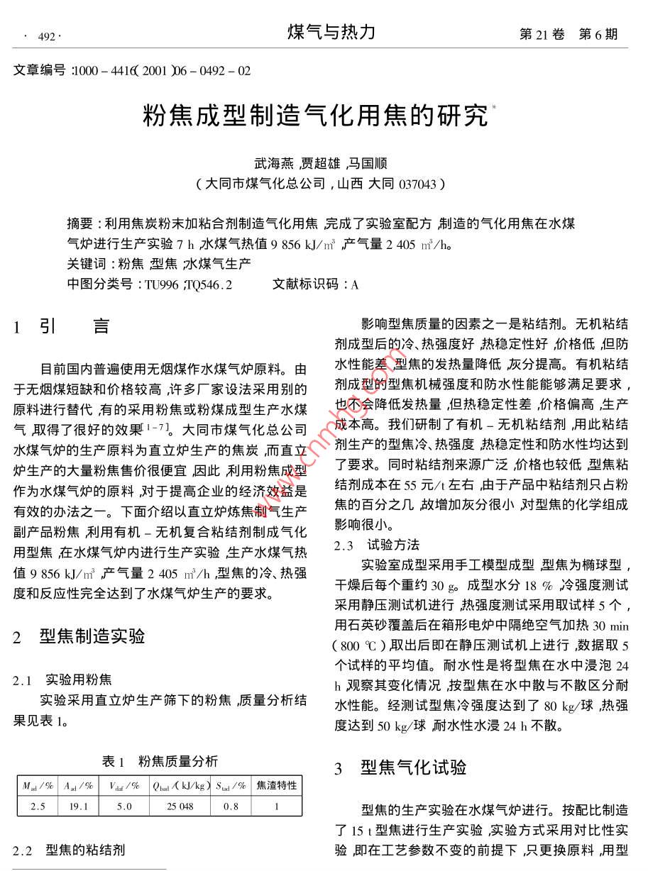 粉焦成型制造氣化用焦的研究