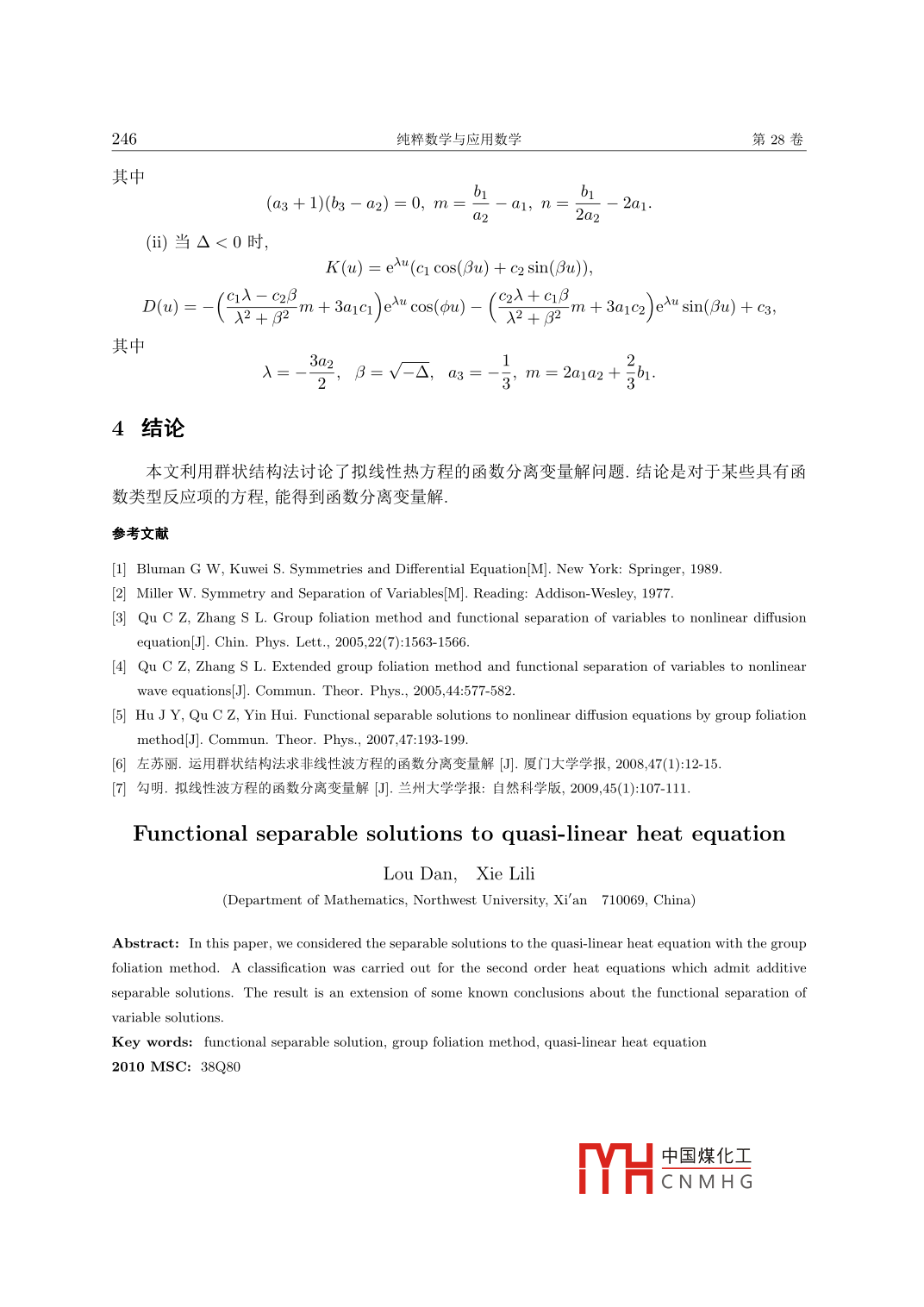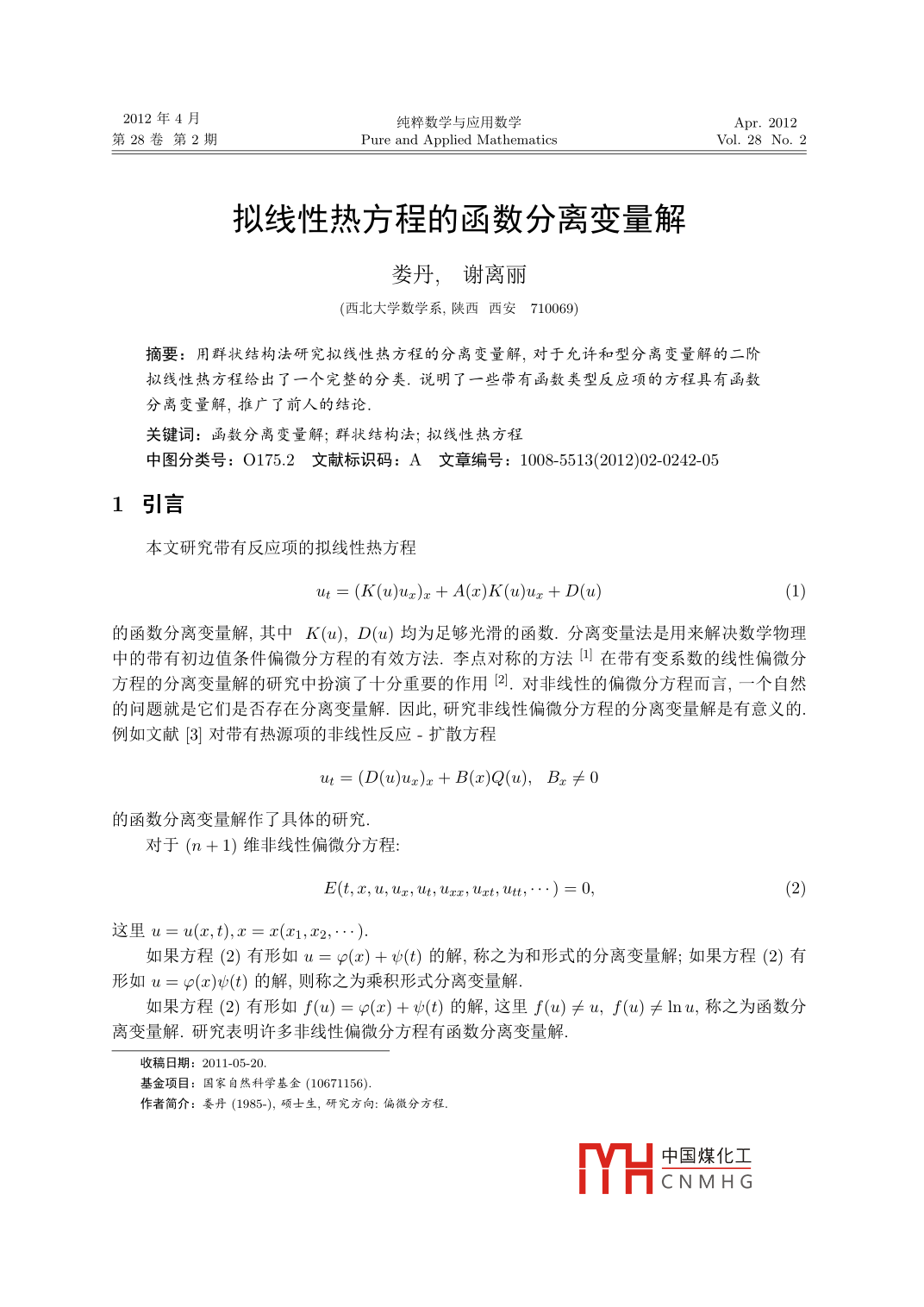 2012年4月純粹數(shù)學(xué)與應(yīng)用數(shù)學(xué)第28卷第2期Pure and Applied MathematicsVol 28 No. 2擬線性熱方程的函數(shù)分離變量解婁丹,謝離麗(西北大學(xué)數(shù)學(xué)系,陜西西安710069)摘要:用群狀結(jié)構(gòu)法研究擬線性熱方程的分離變量解,對于允許和型分離變量解的二階擬線性熱方程給出了一個完整的分類.說明了一些帶有函數(shù)類型反應(yīng)項的方程具有函數(shù)分離變量解,推廣了前人的結(jié)論關(guān)鍵詞:函數(shù)分離變量解;群狀結(jié)構(gòu)法;擬線性熱方程中圖分類號:O175.,2文獻(xiàn)標(biāo)識碼:A文章編號:1008-5513(2012)02-0242051引言本文研究帶有反應(yīng)項的擬線性熱方程ut=(K(uur)x+A(ak(uux+ D(u)的函數(shù)分離變量解,其中K(u),D(u)均為足夠光滑的函數(shù).分離變量法是用來解決數(shù)學(xué)物理中的帶有初邊值條件偏微分方程的有效方法.李點對稱的方法在帶有變系數(shù)的線性偏微分方程的分離變量解的研究中扮演了十分重要的作用2.對非線性的偏微分方程而言,一個自然的問題就是它們是否存在分離變量解.因此,研究非線性偏微分方程的分離變量解是有意義的例如文獻(xiàn)⑧3對帶有熱源項的非線性反應(yīng)-擴(kuò)散方程ut=(D(u)ur)x+ B()Q(u), Bxt0的函數(shù)分離變量解作了具體的研究對于(n+1)維非線性偏微分方程E(t, . u, ux, ut, Urr, Uxt, utt, ..)=0,(2)這里u=u(x,t)C=C( 1, 2,如果方程(2)有形如u=φ(x)+v(t)的解,稱之為和形式的分離變量解;如果方程(2)有形如u=φ(x)(t)的解,則稱之為乘積形式分離變量解如果方程(2)有形如f(u)=g?(x)+v(t)的解,這里f(u)≠t,f(u)≠lnu,稱之為函數(shù)分離變量解.研究表明許多非線性偏微分方程有函數(shù)分離變量解.收稿日期:2011-0基金項目:國家自然科學(xué)基金(10671156)作者簡介:婁丹(1985-),碩士生,研究方向:偏微分方程中國煤化工CNMHG第2期婁丹等:擬線性熱方程的函數(shù)分離變量解243文獻(xiàn)⑧35]中分別研究了方程:ut=(D(uux)x+ b(a)Q(u)utt=(D(uuc)x+b(aQ(a)ut=(A()D(uux)x+ B(a)Q(u)的函數(shù)分離變量解下面將討論帶有反應(yīng)項的擬線性熱方程(1)的函數(shù)分離變量解2群狀結(jié)構(gòu)法如果方程(2)中的E不顯含t,則設(shè)vx=G(x,),u=F(x,u)運用群狀結(jié)構(gòu)法間,得到如下方程組Fr+GF= FGEF.G. F.gm F.G為了獲得方程(2)的函數(shù)分離變量解,令G(x,u)=9(x)h(u),從(3)式第一個方程可以解出F(x,w),得F(x,)=h(u)f(7)(t)=h(sg(y)dy, n(t)=f(n)從而得到如下形式的函數(shù)分離變量解:H(u)=(y)dy +n(t)3擬線性熱方程的函數(shù)分離變量解下面考慮方程(1),根據(jù)群狀結(jié)構(gòu)法理論,把G(x,u)=g(x)h(u),F(x,u)=h(u)f(n)代入到方程(1)中得到∫滿足f= gxK+9(Kh)u+AgK+這里方程(1)具有(5)式確定的函數(shù)分離變量解注意到∫是不依賴x的函數(shù),于是對(6)式兩邊關(guān)于x進(jìn)行微分,得到gxak+ gaghKu+2gg (Kh)u+(Ag)xK +9 (Kh)uh+Ag+ gDu gDh=0.(7)這里考慮h(ω)=1的情況,此時方程(1)有和型的分離變量解:H(u)=t=/9()dy+m(t)中國煤化工CNMHG244純粹數(shù)學(xué)與應(yīng)用數(shù)學(xué)第28卷方程(7)意味著:gxrK+3gg Ku+g Kuu+(Ag)xk+Ag Ku+記r代表由9x,99,g3,(4g)x,Ag2,g張成的線性空間,dim=2.根據(jù)r的維數(shù),求解方程(8)決定的函數(shù)K(u)和D(u)的表達(dá)式情形1dimT=2此時A和g滿足下面的方程組+a2 Ag,(Ag)x=b19+b2 Ag其中a1,a2,b1,b2均為實數(shù).將(9)式代入方程(8)得到函數(shù)K(u)和D(u)滿足下列的ODE系統(tǒng)/a2b162bKu+ajKa+ d)K+5a202Ku+akU+Ku=0下面分情況討論方程(10)的解0,b2≠0K(u)=C1+a202 C1e 02u+其中c1,c2以及以后出現(xiàn)的c3均為積分常數(shù).(i)a2=0,b2=0K(u)D()=-b2C1+c2(i)2≠0.令△=(3a2b2+b2)2-8a2b2(a2b2+2)=(a2b2-2)2,61a2b2+262=-b2≠0時K(u)d(u其中12a2b1+a1b2bK())c2emu-b1c1u+中國煤化工CNMHG第2期婁丹等:擬線性熱方程的函數(shù)分離變量解245其中(c)當(dāng)△=0時K(u)=(c1+c2u)e2,D(u)=-(mc1 +nc2)e-o1u-mc2ue 2u+c3,其中m= a2b1bb2b, n=2a情形2dimr=3此時A和g滿足下面的方程組g9x=019+a2°+a3Aq(11)(Ag)x=b19+b293+b3其中a1,a2,a3,b1,b2,bg均為實數(shù).將(11)式代入方程(8)得到函數(shù)K(u)和D()滿足下列的ODE系統(tǒng)b3+b3)K+(3a3+1)Kn=0,(2a2+a3b2+b2)K+302Kn+Kn=0,(12)+a301+b1)K+3a1Ku+ Du=0下面分情況討論方程(12)的解.令(i)當(dāng)△>0時,分以下幾種情況:(a)a2=0,b2≠0K(u)=cieu +c2e-ouD()=(Ab1-3a1)c(Ab1+3a1)c1e。+e3,其中a3+1(a3+1)62+(303+1)b2=04(b)a2=0,b2=0D()=-(a1a2+b33其中a3=-3,b3=02(c)a2≠0,b2=0.K()D(u)=mc1e-a2+nc2e-2a21中國煤化工CNMHG246純粹數(shù)學(xué)與應(yīng)用數(shù)學(xué)第28卷其中2a2(i)當(dāng)△<0時,K(u)=ea(c1 cos(Bu)+C2 sin(Bu)),C1入-C26C2)+C13+B2其中入2a1a2+=b14結(jié)論本文利用群狀結(jié)構(gòu)法討論了擬線性熱方程的函數(shù)分離變量解問題.結(jié)論是對于某些具有函數(shù)類型反應(yīng)項的方程,能得到函數(shù)分離變量解.參考文獻(xiàn)[1 Bluman G W, Kuwei S Symmetries and Differential Equation M. New York: Springer, 19892 Miller W. Symmetry and Separation of Variables(M. Reading: Addison-Wesley, 1977.3 Qu C Z, Zhang S L. Group foliation method and functional separation of variables to nonlinear diffusionequation J]. Chin. Phys. Lett., 2005, 22(7): 1563-15664 Qu C Z, Zhang S L. Extended group foliation method and functional separation of variables to nonlinearwave equations[J]. Commun. Theor. Phys., 2005, 44: 577-5825 Hu J Y, Qu C Z, Yin Hui. Functional separable solutions to nonlinear diffusion equations by group foliationmethod J. Commun. Theor. Phys., 2007, 47: 193-1996]左蘇麗.運用群狀結(jié)構(gòu)法求非線性波方程的函數(shù)分離變量解門J.