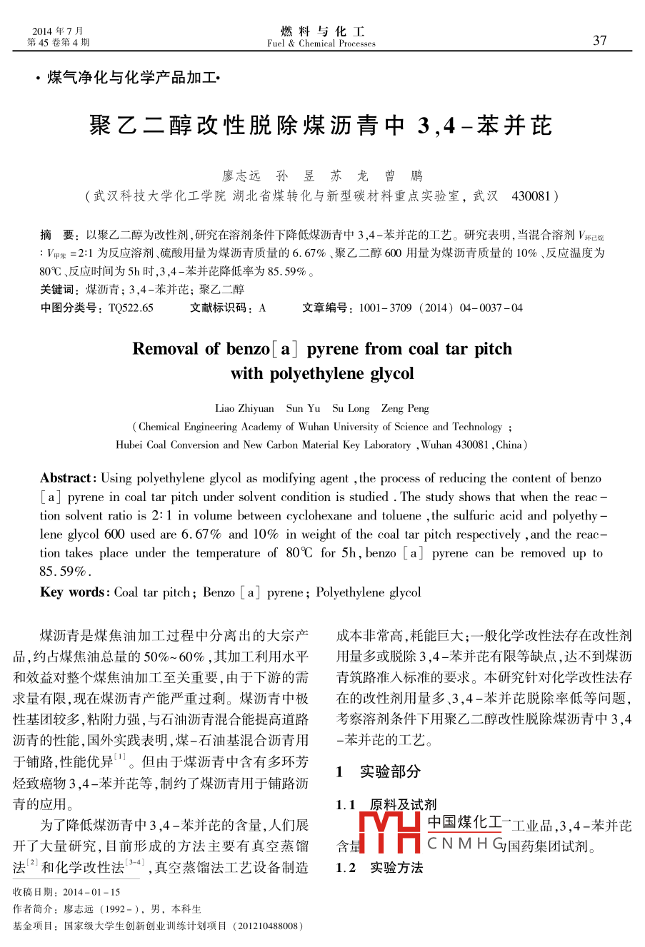 聚乙二醇改性脫除煤瀝青中3,4-苯并芘 聚乙二醇改性脫除煤瀝青中3,4-苯并芘