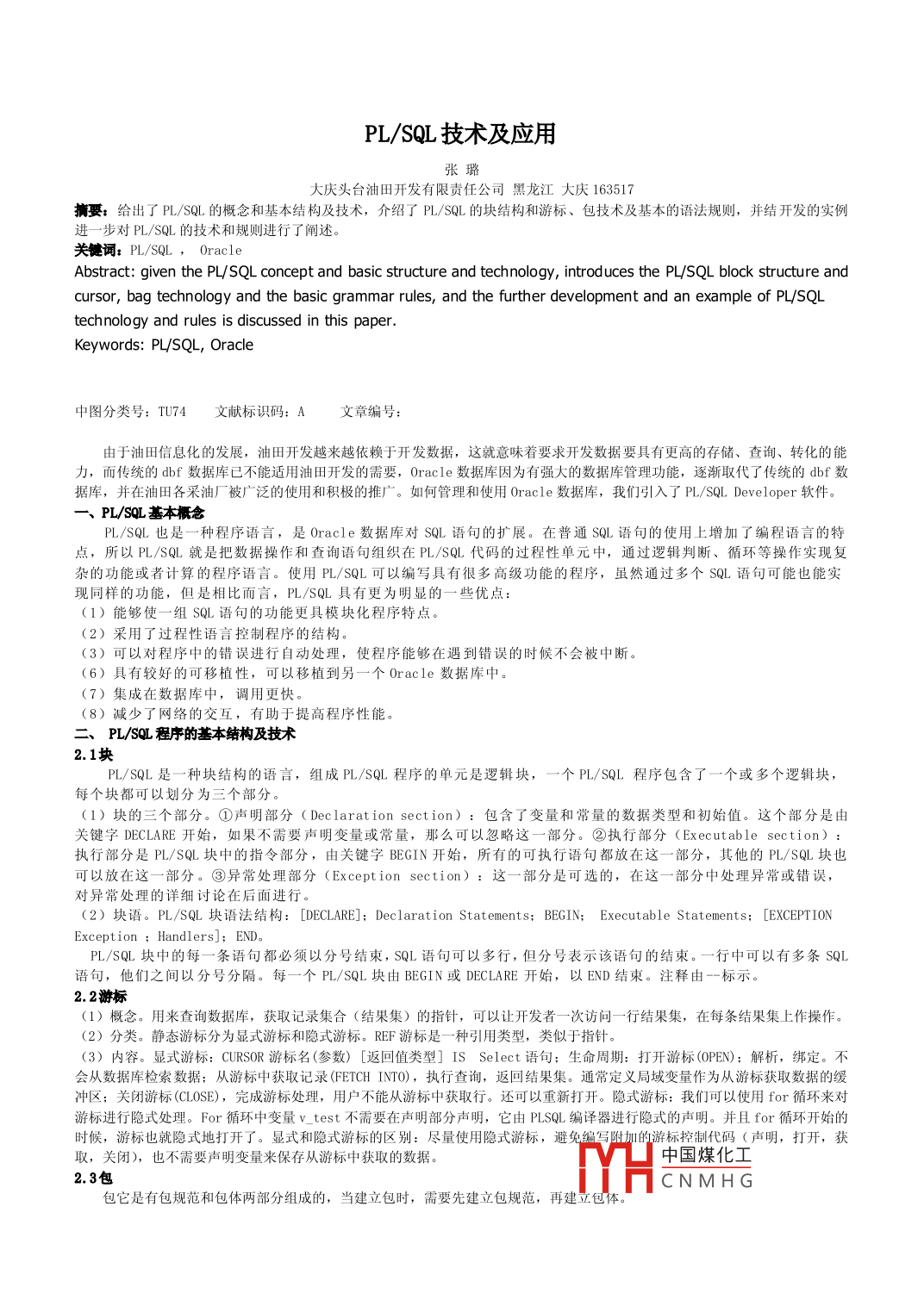 PL/SQL技術(shù)及應(yīng)用大慶頭臺(tái)油田開(kāi)發(fā)有限責(zé)任公司黑龍江大慶163517摘要:給出了PL/SQL的概念和基本結(jié)構(gòu)及技術(shù),介紹了 PL/SQL的塊結(jié)構(gòu)和游標(biāo)、包技術(shù)及基本的語(yǔ)法規(guī)則,并結(jié)開(kāi)發(fā)的實(shí)例進(jìn)一步對(duì)PL/SQL的技術(shù)和規(guī)則進(jìn)行了闡述關(guān)健詞:PL/SQL, OracleAbstract: given the Pl/SQL concept and basic structure and technology introduces the py/sQL block structure andcursor, bag technology and the basic grammar rules, and the further development and an example of PL/SQLKeywords: PL/SQL, Oracle中圖分類(lèi)號(hào):TU74文獻(xiàn)標(biāo)識(shí)碼:A文章編號(hào):由于油田信息化的發(fā)展,油田開(kāi)發(fā)越來(lái)越依賴(lài)于開(kāi)發(fā)數(shù)據(jù),這就意味著要求開(kāi)發(fā)數(shù)據(jù)要具有更高的存儲(chǔ)、查詢(xún)、轉(zhuǎn)化的能力,而傳統(tǒng)的dbf數(shù)據(jù)庫(kù)已不能適用油田開(kāi)發(fā)的需要, Oracle數(shù)據(jù)庫(kù)因?yàn)橛袕?qiáng)大的數(shù)據(jù)庫(kù)管理功能,逐漸取代了傳統(tǒng)的dbf數(shù)據(jù)庫(kù),并在油田各采油廠(chǎng)被廣泛的使用和積極的推廣。如何管理和使用 Oracle數(shù)據(jù)庫(kù),我們引入了PL/SQL. Developer軟件。PL/SL基本概念PL/SQL也是一種程序語(yǔ)言,是 Oracle數(shù)據(jù)庫(kù)對(duì)SQL語(yǔ)句的擴(kuò)展。在普通SQL語(yǔ)句的使用上增加了編程語(yǔ)言的特點(diǎn),所以PL/sQL就是把數(shù)據(jù)操作和査詢(xún)語(yǔ)句組織在PL/SsωL代碼的過(guò)程性單元中,通過(guò)邏輯判斷、循環(huán)等操作實(shí)現(xiàn)復(fù)雜的功能或者計(jì)算的程序語(yǔ)言。使用PL/sαL可以編寫(xiě)具有很多高級(jí)功能的程序,雖然通過(guò)多個(gè)SQL語(yǔ)句可能也能實(shí)現(xiàn)同樣的功能,但是相比而言,PL/SQL具有更為明顯的一些優(yōu)點(diǎn)(1)能夠使一組SQL語(yǔ)句的功能更具模塊化程序特點(diǎn)(2)采用了過(guò)程性語(yǔ)言控制程序的結(jié)構(gòu)(3)可以對(duì)程序中的錯(cuò)誤進(jìn)行自動(dòng)處理,使程序能夠在遇到錯(cuò)誤的時(shí)候不會(huì)被中斷。(6)具有較好的可移植性,可以移植到另一個(gè) Oracle數(shù)據(jù)庫(kù)中。(7)集成在數(shù)據(jù)庫(kù)中,調(diào)用更快8)減少了網(wǎng)絡(luò)的交互,有助于提高程序性能二、PL/SoL程序的基本結(jié)構(gòu)及技術(shù)2.1塊PL/SQL是一種塊結(jié)構(gòu)的語(yǔ)言,組成PL/SQL程序的單元是邏輯塊,一個(gè)PL/SQL程序包含了一個(gè)或多個(gè)邏輯塊每個(gè)塊都可以劃分為三個(gè)部分。(1)塊的三個(gè)部分。①聲明部分( Dec larat ion section):包含了變量和常量的數(shù)據(jù)類(lèi)型和初始值。這個(gè)部分是由關(guān)鍵字 DECLARE開(kāi)始,如果不需要聲明變量或常量,那么可以忽略這一部分。②執(zhí)行部分( Executable section):執(zhí)行部分是PL/SL塊中的指令部分,由關(guān)鍵字 BEGIN開(kāi)始,所有的可執(zhí)行語(yǔ)句都放在這一部分,其他的PL/SQL塊也可以放在這一部分。③異常處理部分( Except ion section):這一部分是可選的,在這一部分中處理異?;蝈e(cuò)誤,對(duì)異常處理的詳細(xì)討論在后面進(jìn)行。(2)塊語(yǔ)。PL/SQL塊語(yǔ)法結(jié)構(gòu):[ DECLARE]; Declaration statements; BEGIN; Executable Statements:[ EXCEPTIONException Handlers]; ENDPL/SQL塊中的每一條語(yǔ)句都必須以分號(hào)結(jié)束,SQL語(yǔ)句可以多行,但分號(hào)表示該語(yǔ)句的結(jié)束。一行中可以有多條SQL語(yǔ)句,他們之間以分號(hào)分隔。每一個(gè)PL/SQL塊由 BEGIN或 DECLARE開(kāi)始,以END結(jié)束。注釋由一標(biāo)示2.2游標(biāo)(1)概念。用來(lái)査詢(xún)數(shù)據(jù)庫(kù),獲取記錄集合(結(jié)果集)的指針,可以讓開(kāi)發(fā)者一次訪(fǎng)問(wèn)一行結(jié)果集,在每條結(jié)果集上作操作(2)分類(lèi)。靜態(tài)游標(biāo)分為顯式游標(biāo)和隱式游標(biāo)。REF游標(biāo)是一種引用類(lèi)型,類(lèi)似于指針3)內(nèi)容。顯式游標(biāo): CURSOR游標(biāo)名(參數(shù))[返回值類(lèi)型] Is Select語(yǔ)句:生命周期:打開(kāi)游標(biāo)(OPEN:解析,綁定。不會(huì)從數(shù)據(jù)庫(kù)檢索數(shù)據(jù);從游標(biāo)中獲取記錄( FETCH INT0),執(zhí)行査詢(xún),返回結(jié)果集。通常定義局域變量作為從游標(biāo)獲取數(shù)據(jù)的緩沖區(qū);關(guān)閉游標(biāo)(CL0SE),完成游標(biāo)處理,用戶(hù)不能從游標(biāo)中獲取行。還可以重新打開(kāi)。隱式游標(biāo):我們可以使用for循環(huán)來(lái)對(duì)游標(biāo)進(jìn)行隱式處理。For循環(huán)中變量νtest不需要在聲明部分聲明,它由PS劬Lλ編譯器進(jìn)行隱式的聲明。并且for循環(huán)開(kāi)始的時(shí)候,游標(biāo)也就隱式地打開(kāi)了。顯式和隱式游標(biāo)的區(qū)別:盡量使用隱式游標(biāo),避免編寫(xiě)附加的游標(biāo)控制代碼(聲明,打開(kāi),獲取,關(guān)閉),也不需要聲明變量來(lái)保存從游標(biāo)中獲取的數(shù)據(jù)。中國(guó)煤化工2.3包CNMHG包它是有包規(guī)范和包體兩部分組成的,當(dāng)建立包時(shí),需要先建立包規(guī)范,再建立包體1)建立包規(guī)范。包規(guī)范實(shí)際是包與應(yīng)用程序之間的接口,它用于定義包的公用組件,包括常量、變量、游標(biāo)。過(guò)程和函數(shù)