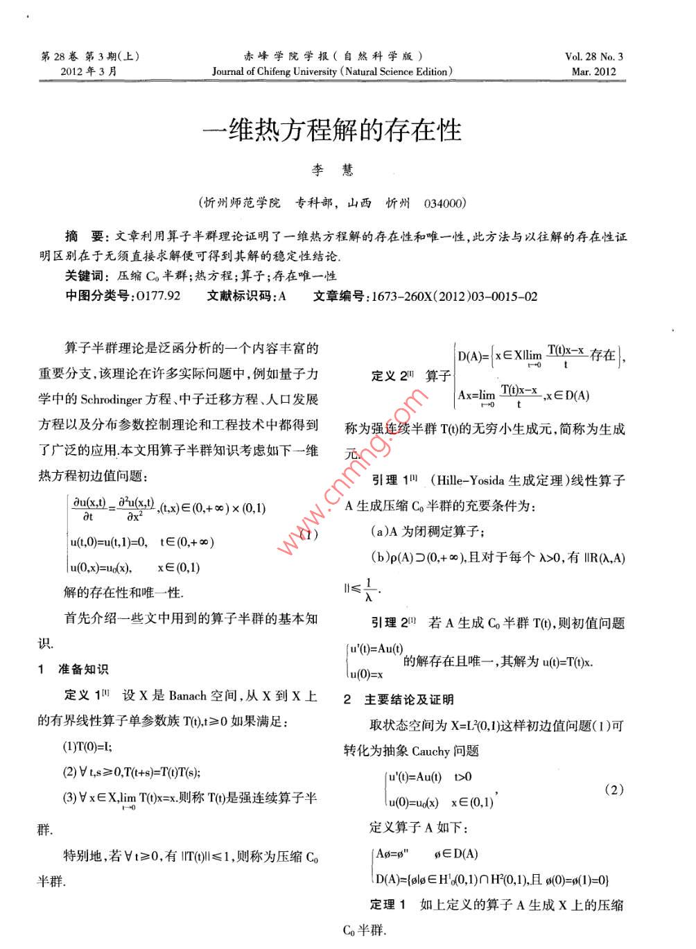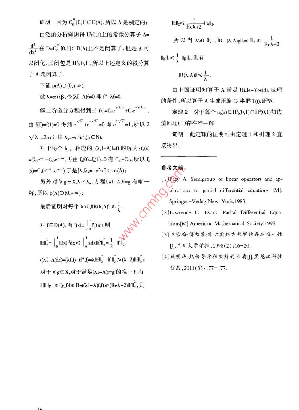 第28卷第3期(上)赤峰學(xué)院學(xué)報(bào)(自然科學(xué)版)Vol. 28 No. 32012年3月Jounal of Chifeng University( Natural Science EditionMar.2012維熱方程解的存在性李慧(忻州師范學(xué)院??撇?山西忻州034000摘要:文章利用算子半群理論證明了一維熱方程解的存在性和唯一性,此方法與以往解的存在性證明區(qū)別在于無須直接求解便可得到其解的穩(wěn)定性結(jié)論.關(guān)鍵詞:壓縮C半群;熱方程;算子;存在唯一性中圖分類號(hào):017792文獻(xiàn)標(biāo)識(shí)碼:A文章編號(hào):1673-260X(2012)03-0015-02算子半群理論是泛函分析的一個(gè)內(nèi)容豐富的DwA=Exm存在重要分支,該理論在許多實(shí)際問題中,例如量子力定義2算子學(xué)中的 Schrodinger方程、中子遷移方程、人口發(fā)展Ax- lim Ttx-x,x∈DOA方程以及分布參數(shù)控制理論和工程技術(shù)中都得到稱為強(qiáng)連續(xù)半群T(的無窮小生成元,簡稱為生成了廣泛的應(yīng)用本文用算子半群知識(shí)考慮如下一維元熱方程初邊值問題引理個(gè)(Hile- Yosida生成定理)線性算子du(x,t)_du(x, t)(,x)∈(0,+∞)×(0,1)A生成壓縮C0半群的充要條件為(a)A為閉稠定算子;u(,O)=u1,1)=0,t∈(0,+∞)(b)p(A)2(0,+∞),且對(duì)于每個(gè)A>0,有IR(A,A)u(O,x)=1(x),x∈(0,1)解的存在性和唯一性≤1首先介紹一些文中用到的算子半群的基本知引理2若A生成C半群T(),則初值問題識(shí).u(O=Au(t1準(zhǔn)備知識(shí)的解存在且唯一,其解為u()=T(uO)=:定義設(shè)X是 Banach空間,從X到X上2主要結(jié)論及證明的有界線性算子單參數(shù)族T,t≥0如果滿足:取狀態(tài)空間為X=L(,1這樣初邊值問題(1)可T(0)=轉(zhuǎn)化為抽象 Cauchy問題(2)VL, s20, T(t+s)=T(UT(s)u(=Au(0) Do(3)Vx∈x,JimT(x=x,則稱T()是強(qiáng)連續(xù)算子半u(O)=ux)x∈(0,1)群.定義算子A如下特別地,若Ⅴt≥0,有mo≤1,則稱為壓縮CoAg="∈D(A)半群D(A)={olo∈H0,1)∩Ho,1),且o(0)=5(1)=0定理1如上定義的算子A生成X上的壓縮C0半群證明因?yàn)镃O,1cDA),所以A是稠定的;Re入+2由泛函分析知識(shí)得L(0,1)上的常微分算子A=d在D=Cn0.1cD()上不是閉算子,但是A可所以當(dāng)A0時(shí),Am≤pg2以閉化其閉包是H.1所以上述定義的微分算gl≤gh,則有子A是閉算子IRAA川≤1下證p(A)0,+∞)由上面證明知算子A滿足Hile- Yosida定理設(shè)A=α+,令A(yù)-A)f=0即f"-Af=0的條件,所以算子A生成壓縮C0半群T(.證畢解二階微分方程得到:(x=CeN'+CeYx定理2對(duì)于每個(gè)u(x)∈HO,1)∩H(0,1)初邊由f0)=1)=0得到eY+e=0即e2=1,所以2值問題(1)存在唯一解VA=2ni,則Aa=-n2r,n∈N證明此定理的證明可由定理1和引理2直對(duì)于每個(gè)A,相應(yīng)的(x-A)=0的解為:fx)接得出=Cnem+Cem,再由fO)=f(1)=0有Cn-Ca,所以f(x)=C(em-em).于是入An=-n2mcoA);參考文獻(xiàn)另外對(duì)g∈x入≠入,方程(X1-A)=g有唯一1) Pazy A. Semigroup of linear operators and ap解;所以p(A)2(0,+∞);plications to partial differential equations M]最后證明對(duì)每個(gè)A0,ROA,A川≤1Springer-Verlag, New York, 1983[2 ]Lawrence C. Evans. Parital Differential Equa對(duì)∈DA),有(x=f0d則tions(M. American Mathematical Society, 1998〔3〕衛(wèi)雪梅;傅初黎;非古典熱方程解的存在唯一性Hn2=dk≤ L. delle2sme2U蘭州大學(xué)學(xué)報(bào),1998(2):16-20(AI-A=A0-(r",=N2+f2≥(A+2)m2;〔4〕姚明華熱傳導(dǎo)方程次解的性質(zhì)黑龍江科技對(duì)于Vg∈X,對(duì)于滿足AI-Af=g的唯一f,有信息,2011(3):177-177l2(g0≥Re(Q-A)0≥(RA+2)mn2,則