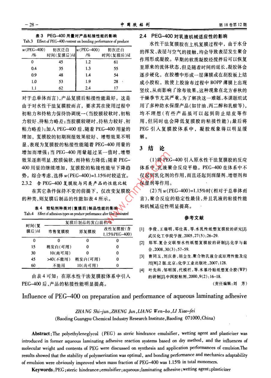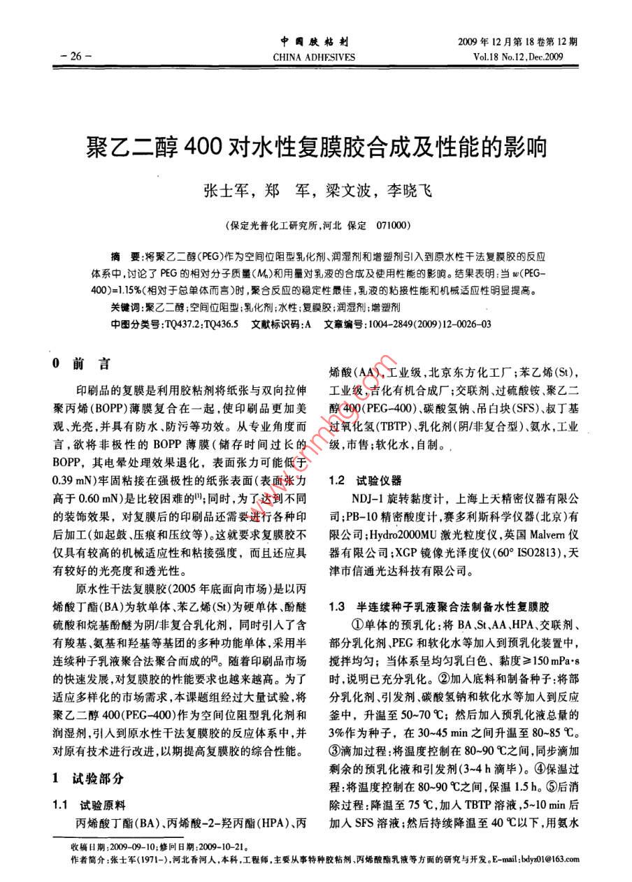 聚乙二醇400對(duì)水性復(fù)膜膠合成及性能的影響