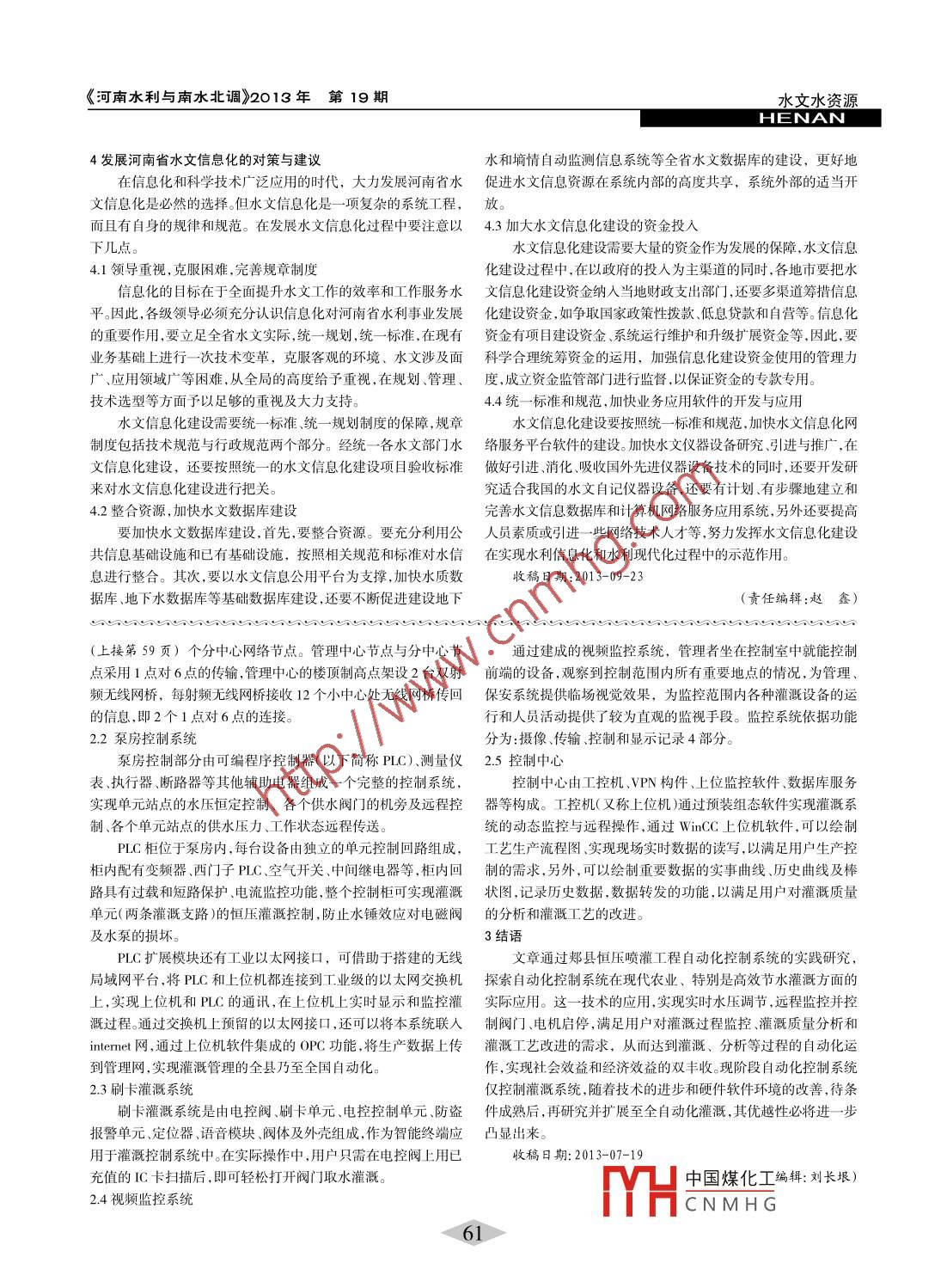 水文水資源《河南水利與南水北調(diào)》2013年第19期HENAN河南省水文信息化研究C ]姬紅旗(商丘市水利施工總隊)摘要:水利信息化是水利現(xiàn)代化的基礎(chǔ),水文信息化建設(shè)對水文工作質(zhì)量與效率的提高起到重要的推動作用,水利信息化采用以計算機(jī)為核心,以網(wǎng)絡(luò)為紐帶,以地表水地下水的水文水資源信息采集、傳輸、處理、存儲.服務(wù)為特征的水文工作。文章對當(dāng)前河南省水文信息化建設(shè)中存在的主要問題進(jìn)行分析,并對推動水文信息化建設(shè)進(jìn)展提出一些建議與對策。關(guān)鍵詞:水文;信息化;問題;對策在信息網(wǎng)絡(luò)日益普遍的今天,網(wǎng)絡(luò)已經(jīng)廣泛應(yīng)用于水利行水文信息化建設(shè)的難度大,首先是因?yàn)樗男畔⒒慕ㄔO(shè)業(yè),而水文信息化建設(shè)已成為當(dāng)前水文工作的重要任務(wù)。水文信成本較高 ,許多地區(qū)惡劣的環(huán)境,再加上水文信息的監(jiān)測點(diǎn)與控息化推動實(shí)現(xiàn)水文為社會發(fā)展起到重要的作用,也是經(jīng)濟(jì)社會制點(diǎn)具有分散的特點(diǎn),都使建設(shè)費(fèi)用增加;其次,水文信息化涉發(fā)展以及科技快速發(fā)展背景下的必然趨勢。及面較廣,為許多行業(yè)服務(wù),如水利、環(huán)保、氣象等部門,各部門1水文信息化概念又對水文需求的標(biāo)準(zhǔn)不同,這樣就使水文信息化共享的實(shí)現(xiàn)面水文信息化是實(shí)現(xiàn)水資源的合理開發(fā)、優(yōu)化配置、科學(xué)管臨較 大困境。理高效利用有效保護(hù)的重要措施,是解決洪澇害、干旱缺水、水3.2 水文數(shù)據(jù)庫建設(shè)滯后于發(fā)展需要影響水文信息系統(tǒng)建設(shè)環(huán)境污染的重要途徑,也是實(shí)現(xiàn)傳統(tǒng)水文向現(xiàn)代水文、大水文轉(zhuǎn)水文的發(fā)展對數(shù)據(jù)庫的需求越來越大,而實(shí)際全省數(shù)據(jù)庫變的重要舉措。的建設(shè)還滯后于發(fā)展的需要。很多水文數(shù)據(jù)仍以紙質(zhì)或電子水文信息是指水位流量泥沙.蒸發(fā)水溫水質(zhì)地下水位文件形式分散管理,水質(zhì)數(shù)據(jù)庫、地下水?dāng)?shù)據(jù)庫等基礎(chǔ)數(shù)據(jù)庫等水文要素。水文信息化就是指充分利用現(xiàn)代計算機(jī)、信息及通建設(shè)仍處于初期階段。同時目前尚未建立水質(zhì)數(shù)據(jù)分析處理訊技術(shù),通過軟硬件措施對水文信息資源進(jìn)行深入開發(fā)和廣泛系 統(tǒng),無法實(shí)現(xiàn)快速提供高水平的分析成果,而且信息整合和利用的過程,包括對水文信息進(jìn)行采集、傳輸存儲處理和利共享能力低。另外,地下水和墑情自動監(jiān)測信息系統(tǒng)還有待加用,以實(shí)現(xiàn)水文信息資源的共享與服務(wù)??旖ㄔO(shè)步伐。2河南省水文信息化現(xiàn)狀3.3資金投人不足河南省水文信息化起步于20世紀(jì)70年代末,隨著河南省水文信息化建設(shè)需要資金作為保障。水文信息化涉及面廣,水文實(shí)時監(jiān)控、水文基礎(chǔ)設(shè)施、水質(zhì)監(jiān)測等項目的深入開展,經(jīng)由于沒有穩(wěn)定的投人渠道,經(jīng)費(fèi)投人嚴(yán)重不足,硬件設(shè)備多已超過幾十年的發(fā)展,現(xiàn)在水文信息采集基礎(chǔ)設(shè)施明顯改善,自動化過服 務(wù)年限,性能降低。有些地市的基礎(chǔ)設(shè)施落后,由于資金問水平明顯提高,并取得了一些可喜的成績,如今水文測報能力有題無法進(jìn)行更換。 - .些建立的水情分析中心,管理成本相對增了較大提高,雨量觀測全部實(shí)現(xiàn)自記,約占總數(shù)51%的水文站加 ,經(jīng)費(fèi)卻難以落實(shí),會影響水文信息的分析。實(shí)現(xiàn)了水位自動測報或固態(tài)存儲。初步建成了河南省國家水文3.4 水文信息化建設(shè)所使用的業(yè)務(wù)應(yīng)用軟件開發(fā)缺乏統(tǒng)- -標(biāo)準(zhǔn)數(shù)據(jù)庫,為水文信息資源的開發(fā)利用奠定了良好基礎(chǔ)。和規(guī)范河南省水文水資源局設(shè)立了專門的計算信息室,明確了信目前,各水文部門在信息化系統(tǒng)建設(shè)中,業(yè)務(wù)應(yīng)用系統(tǒng)的建息化工作主管部i ]的職責(zé),規(guī)范信息化管理。為了促進(jìn)信息溝設(shè)所采用的運(yùn)行平臺 數(shù)據(jù)庫種類、數(shù)據(jù)庫表結(jié)構(gòu)信息傳輸和通,還建立了及時發(fā)布水文信息的網(wǎng)站,向社會公眾及時提供水交換格式等都是各自獨(dú)立運(yùn)行,各不相同,沒有統(tǒng)一的標(biāo)準(zhǔn)和規(guī)文信息服務(wù)。范,使這些水文信息統(tǒng)- -起 來有難度,與其它應(yīng)用系統(tǒng)的銜接也3河南省水文信息化存在的問題難。很容易使各水3中國煤化工法實(shí)現(xiàn)不同應(yīng)3.1全面建設(shè)水文信息化難度大用系統(tǒng)之間、不同地YHCNMHGt60《河南水利與南水北調(diào)》2013年第19期水文水資源HENAN I4發(fā)展河南省水文信息化的對策與建議水和墑情自動監(jiān)測信息系統(tǒng)等全省水文數(shù)據(jù)庫的建設(shè),更好地在信息化和科學(xué)技術(shù)廣泛應(yīng)用的時代,大力發(fā)展河南省水促進(jìn) 水文信息資源在系統(tǒng)內(nèi)部的高度共享,系統(tǒng)外部的適當(dāng)開文信息化是必然的選擇。但水文信息化是一項復(fù)雜的系