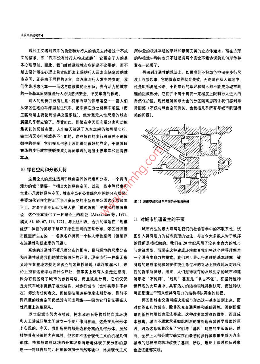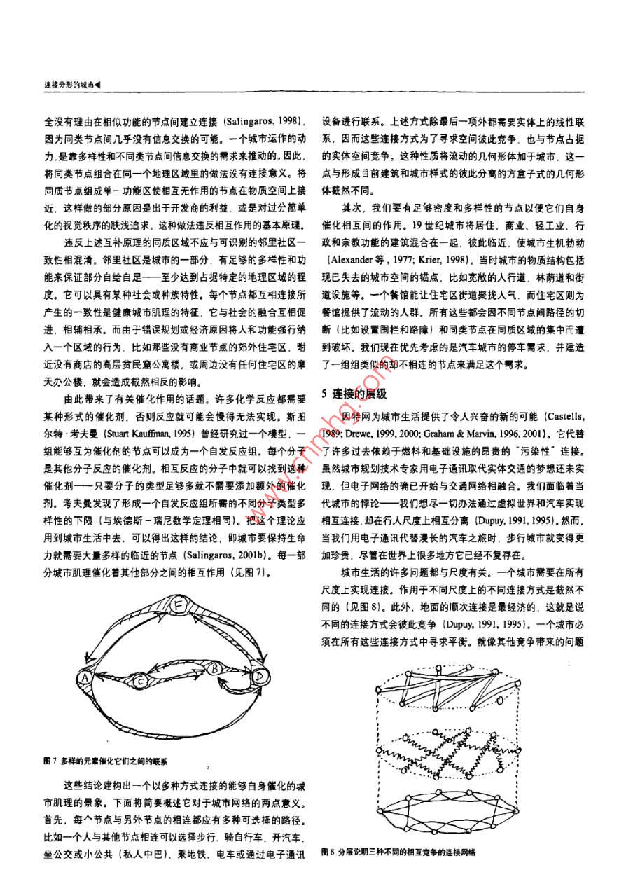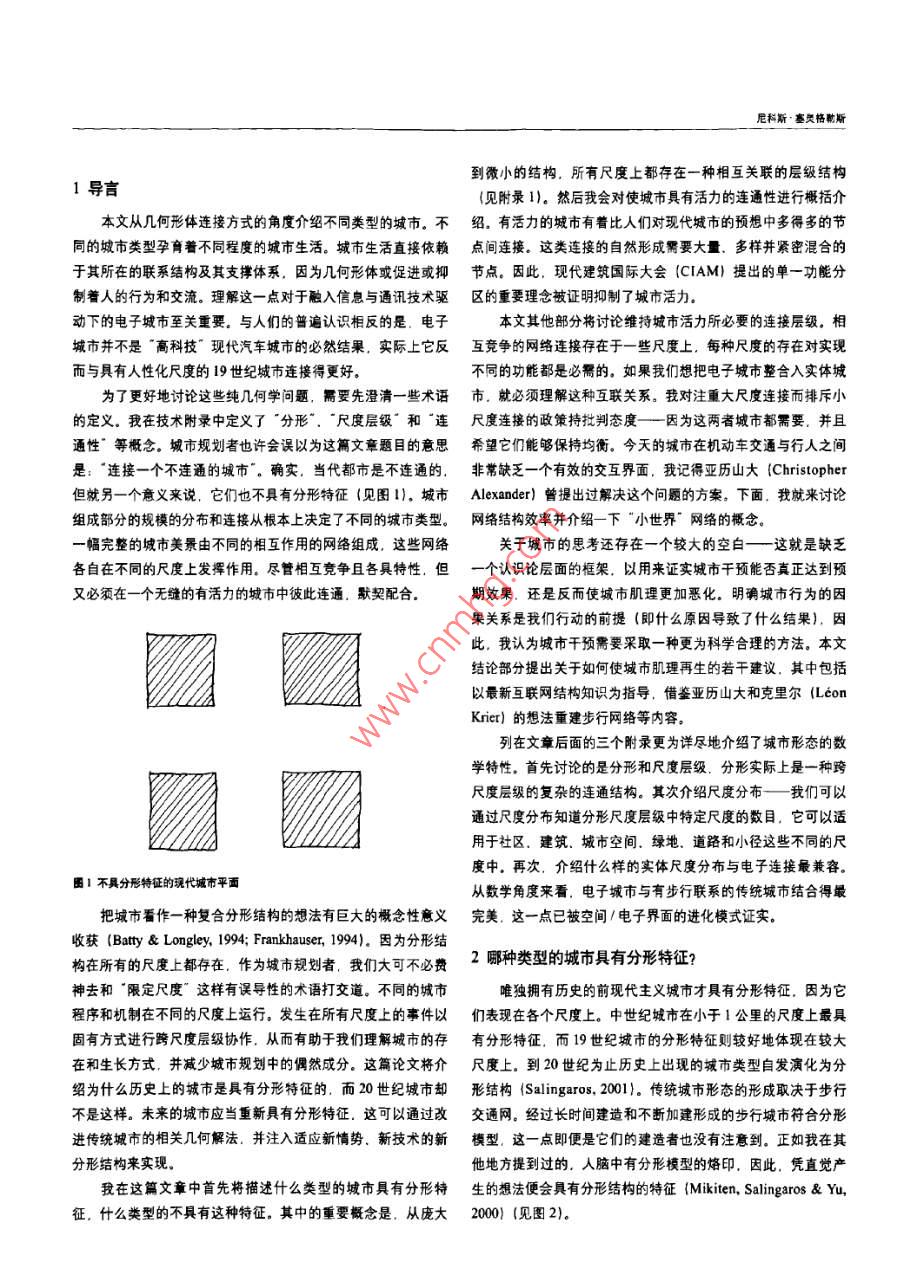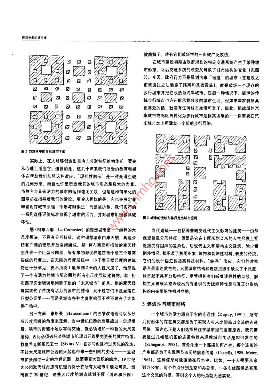 連接分形的城市Connecting the Fractal City尼科斯·塞靈格勒斯著劉洋譯Connecting the Fractal City”是作者在“第5屆歐洲摘要:和所有生命系魷一樣、有活力的城市本質上鄰具有分形特征。汽車和人口增長來的壓城鎮(zhèn)與城市劃師雙年大會(5 h Biennial of towns力迫使20世紀的城市覜劃者推行反分形的幾何美型,傳統(tǒng)城市的分形特狂被去除,給城市肌理and town planners in Europe, Barcelona, ApriL, 2003逗成災難性的影響,要消除這種破壞,必須深人細致地理解一些問題:(1)分形特征有上發(fā)表的主旨發(fā)言,作者投權我刊發(fā)表中譯文啷些;(2)有活力的城市肌理中鐠綜復雜的相互連接;(3)連接和修補城市空間的方法;(4)暨合行人、汽車和公共交通的有效方式;(5)如何將實體聯(lián)系與電于聯(lián)系結合起來。首先,我們應該消除對分形結構的一些基本誤解,然后我會強調層級一致性的豐質和重要性。我們可以用分形標度來檢瞼城市形體—作為城市藏功的一個前提;男一個獨立標度是連通性,應當從拓撲學角度進行斫究。用生物系統(tǒng)進化和因特冏的知識來討論尺度分布、逆冪律度尺度法則和“小世界”路,這些概念表明當代都市一方西向郭區(qū)化菱延發(fā)展,另一方面是摩天樓式發(fā)展這種對棍端害度的偏好嘟是碼態(tài)的。當代都市面臨的挑戰(zhàn)是如何用最佳方式實現(xiàn)競爭性連接網(wǎng)蟮的融合。Abstract: Living cities have intrinsically fractal properties. in common with all living systems. Thepressure to accommodate both the automobile and increased population growth led twentieth-centuryurbanists to impose anti-fractal geometrical typologies, The fractal properties of the traditional ciwere erased, with disastrous consequences for the urban fabric. To undo this damage, it is necessarto understand several things in some detail: (1)what these fractal properties are: 2)the intricateconnectivity of the living urban fabric: (3)methods of connecting and repairing urban space: (4)an effective way to overlay pedestrian, automotive, and public transports: and (5)how to integratephysical connections with electronic connections. First of all, some basic misunderstandings aboutfractal structure have to be cleared up. i will then underine the nature and importance of hierarchicalcoherence, We can use the fractal criterion to test the geometry of cities as one condition for thesuccess. Another independent criterion is connectivity, which has to be studied topologically. I will uslessons leamed from the evolution of biological systems and the intemet to discuss the distribution ofsues, inverse-power sealing laws, and'small-world' networks. These concepts show us that extremedensities favored in contemporary urbanism--suburban sprawl on the one hand, and skyscraperson the other-are pathological, The challenge for the contemporary city is how to superimposecompeting connective networks in an optimal manner.作者:尼科斯·塞靈格勒斯( Nikos A. Salingaros)、關鍵詞,規(guī)劃;城市說計;分形;網(wǎng)絡:尺度;層緹;類國德州大學圣安東尼奧分校數(shù)學系教授,“小世界”網(wǎng)絡;迸寡律度尺度法則;傳統(tǒng)從業(yè)者 INTBAU(傳統(tǒng)變筑與城市地區(qū)催化作用;毛細管見象國際組織)學院成員。nikos@lonestar,utsa. eduwords: Planning: Urban Design; Fractals: Networks; Scaling: Hierarchies,譯者:劉洋,英國麻省理工學院城市規(guī)劃系研究生" Small-world"Networks: Inverse Power- Law ScalinyangLamiteduCatalysis, Capillarity尼科斯·塞靈格歉斯到微小的結構,所有尺度上都存在一種相互關聯(lián)的層級結構1導言見附錄1)。然后我會對使城市具有活力的連通性進行概括介本文從幾何形體連接方式的角度介紹不同類型的城市。不紹。有活力的城市有著比人們對現(xiàn)代城市的預想中多得多的節(jié)同的城市類型孕育著不同程度的城市生活。城市生活直接依賴點間連接。這類連接的自然形成需要大量.多樣并緊密混合的于其所在的聯(lián)系結構及其支撐體系,因為幾何形體或促進或抑節(jié)點。因此,現(xiàn)代建筑國際大會【CIAM)提出的單一功能分制著人的行為和交流。理解這一點對于融入信息與通訊技術驅區(qū)的重要理念被證明抑制了城市活力動下的電子城市至關重要。與人們的普遍認識柜反的是電子本文其他部分將討論維持城市活力所必要的連接層級。相城市并不是高科技現(xiàn)代汽車城市的必然結果,實際上它反互競爭的網(wǎng)絡連接存在于一些尺度上,每種尺度的存在對實現(xiàn)而與具有人性化尺度的19世紀城市連接得更好不同的功能都是必需的。如果我們想把電子城市整合入實體城為了更好地討論這些純幾何學問題,需要先澄清一些術語市.就必須理解這種互聯(lián)關系。我對注重大尺度連接而排的定義。我在技術附錄中定義了“分形,尺度層級和“連尺度連接的政策持批判態(tài)度—因為這兩者城市都需要.并且通性等概念。城市規(guī)劃者也許會誤以為這篇文章題目的意思希望它們能夠保持均衡。今天的城市在機動車交通與行人之間是:“連接一個不連通的城市。確實.當代都市是不連通的,非常缺乏一個有效的交互界面,我記得亞歷山大 Christopher但就另一個意義來說,它們也不具有分形特征(見圖1),城市 Alexander)曾提出過解決這個問題的方案。下面.我就來討論組成部分的規(guī)模的分布和連接從根本上決定了不同的城市類型。網(wǎng)絡結構效率并介紹一下“小世界”網(wǎng)絡的概念幅完整的城市美景由不同的相互