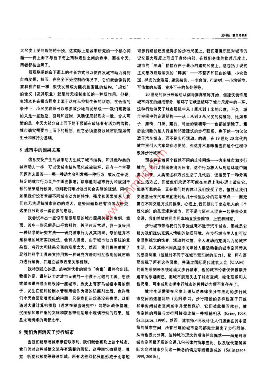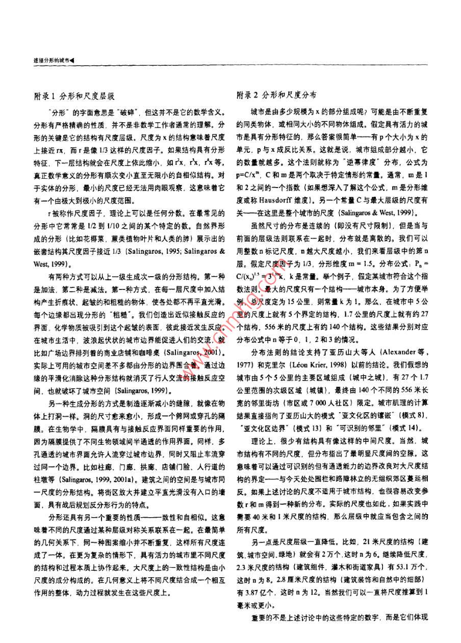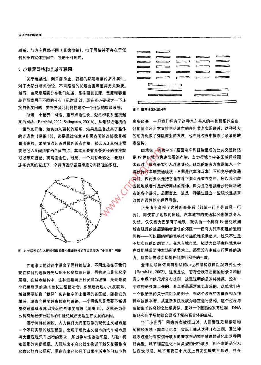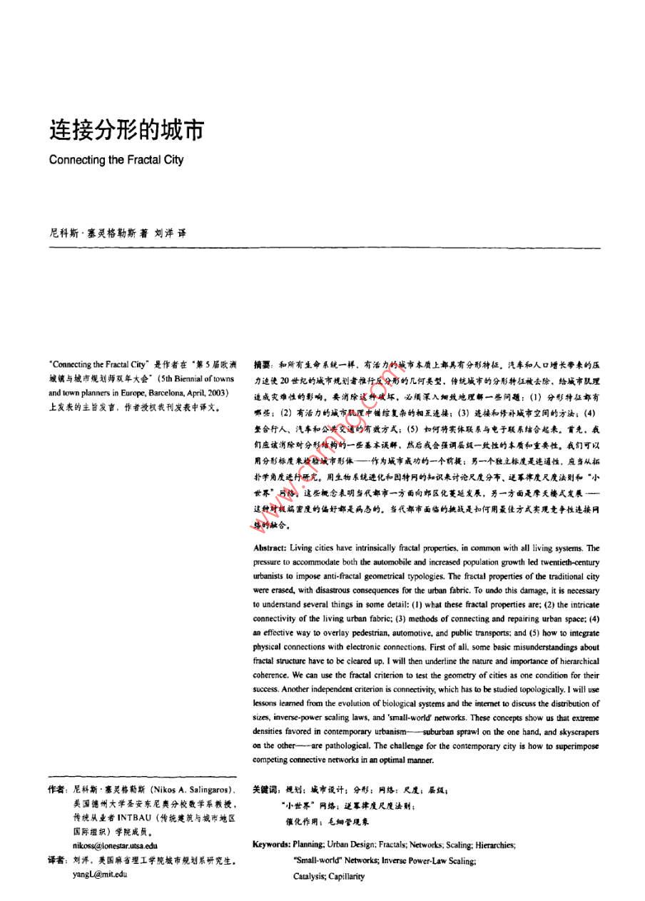 連接分形的城市Connecting the Fractal City尼科斯·塞靈格勒斯著劉洋譯Connecting the Fractal City”是作者在“第5屆歐洲摘要:和所有生命系魷一樣、有活力的城市本質上鄰具有分形特征。汽車和人口增長來的壓城鎮(zhèn)與城市劃師雙年大會(5 h Biennial of towns力迫使20世紀的城市覜劃者推行反分形的幾何美型,傳統(tǒng)城市的分形特狂被去除,給城市肌理and town planners in Europe, Barcelona, ApriL, 2003逗成災難性的影響,要消除這種破壞,必須深人細致地理解一些問題:(1)分形特征有上發(fā)表的主旨發(fā)言,作者投權我刊發(fā)表中譯文啷些;(2)有活力的城市肌理中鐠綜復雜的相互連接;(3)連接和修補城市空間的方法;(4)暨合行人、汽車和公共交通的有效方式;(5)如何將實體聯(lián)系與電于聯(lián)系結合起來。首先,我們應該消除對分形結構的一些基本誤解,然后我會強調層級一致性的豐質和重要性。我們可以用分形標度來檢瞼城市形體—作為城市藏功的一個前提;男一個獨立標度是連通性,應當從拓撲學角度進行斫究。用生物系統(tǒng)進化和因特冏的知識來討論尺度分布、逆冪律度尺度法則和“小世界”路,這些概念表明當代都市一方西向郭區(qū)化菱延發(fā)展,另一方面是摩天樓式發(fā)展這種對棍端害度的偏好嘟是碼態(tài)的。當代都市面臨的挑戰(zhàn)是如何用最佳方式實現(xiàn)競爭性連接網(wǎng)蟮的融合。Abstract: Living cities have intrinsically fractal properties. in common with all living systems. Thepressure to accommodate both the automobile and increased population growth led twentieth-centuryurbanists to impose anti-fractal geometrical typologies, The fractal properties of the traditional ciwere erased, with disastrous consequences for the urban fabric. To undo this damage, it is necessarto understand several things in some detail: (1)what these fractal properties are: 2)the intricateconnectivity of the living urban fabric: (3)methods of connecting and repairing urban space: (4)an effective way to overlay pedestrian, automotive, and public transports: and (5)how to integratephysical connections with electronic connections. First of all, some basic misunderstandings aboutfractal structure have to be cleared up. i will then underine the nature and importance of hierarchicalcoherence, We can use the fractal criterion to test the geometry of cities as one condition for thesuccess. Another independent criterion is connectivity, which has to be studied topologically. I will uslessons leamed from the evolution of biological systems and the intemet to discuss the distribution ofsues, inverse-power sealing laws, and'small-world' networks. These concepts show us that extremedensities favored in contemporary urbanism--suburban sprawl on the one hand, and skyscraperson the other-are pathological, The challenge for the contemporary city is how to superimposecompeting connective networks in an optimal manner.作者:尼科斯·塞靈格勒斯( Nikos A. Salingaros)、關鍵詞,規(guī)劃;城市說計;分形;網(wǎng)絡:尺度;層緹;類國德州大學圣安東尼奧分校數(shù)學系教授,“小世界”網(wǎng)絡;迸寡律度尺度法則;傳統(tǒng)從業(yè)者 INTBAU(傳統(tǒng)變筑與城市地區(qū)催化作用;毛細管見象國際組織)學院成員。nikos@lonestar,utsa. eduwords: Planning: Urban Design; Fractals: Networks; Scaling: Hierarchies,譯者:劉洋,英國麻省理工學院城市規(guī)劃系研究生" Small-world"Networks: Inverse Power- Law ScalinyangLamiteduCatalysis, Capillarity尼科斯·塞靈格歉斯到微小的結構,所有尺度上都存在一種相互關聯(lián)的層級結構1導言見附錄1)。然后我會對使城市具有活力的連通性進行概括介本文從幾何形體連接方式的角度介紹不同類型的城市。不紹。有活力的城市有著比人們對現(xiàn)代城市的預想中多得多的節(jié)同的城市類型孕育著不同程度的城市生活。城市生活直接依賴點間連接。這類連接的自然形成需要大量.多樣并緊密混合的于其所在的聯(lián)系結構及其支撐體系,因為幾何形體或促進或抑節(jié)點。因此,現(xiàn)代建筑國際大會【CIAM)提出的單一功能分制著人的行為和交流。理解這一點對于融入信息與通訊技術驅區(qū)的重要理念被證明抑制了城市活力動下的電子城市至關重要。與人們的普遍認識柜反的是電子本文其他部分將討論維持城市活力所必要的連接層級。相城市并不是高科技現(xiàn)代汽車城市的必然結果,實際上它反互競爭的網(wǎng)絡連接存在于一些尺度上,每種尺度的存在對實現(xiàn)而與具有人性化尺度的19世紀城市連接得更好不同的功能都是必需的。如果我們想把電子城市整合入實體城為了更好地討論這些純幾何學問題,需要先澄清一些術語市.就必須理解這種互聯(lián)關系。我對注重大尺度連接而排的定義。我在技術附錄中定義了“分形,尺度層級和“連尺度連接的政策持批判態(tài)度—因為這兩者城市都需要.并且通性等概念。城市規(guī)劃者也許會誤以為這篇文章題目的意思希望它們能夠保持均衡。今天的城市在機動車交通與行人之間是:“連接一個不連通的城市。確實.當代都市是不連通的,非常缺乏一個有效的交互界面,我記得亞歷山大 Christopher但就另一個意義來說,它們也不具有分形特征(見圖1),城市 Alexander)曾提出過解決這個問題的方案。下面.我就來討論組成部分的規(guī)模的分布和連接從根本上決定了不同的城市類型。網(wǎng)絡結構效率并介紹一下“小世界”網(wǎng)絡的概念幅完整的城市美景由不同的相互