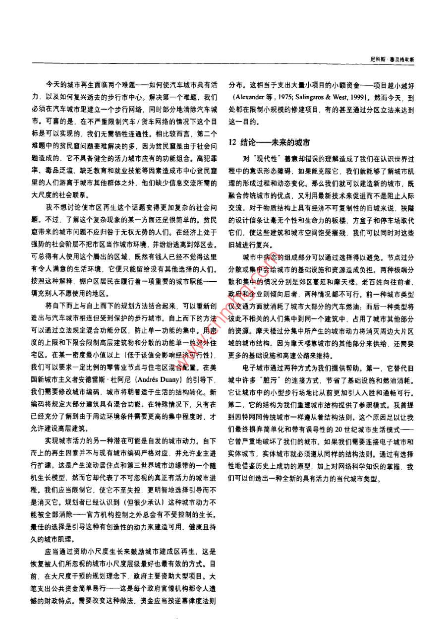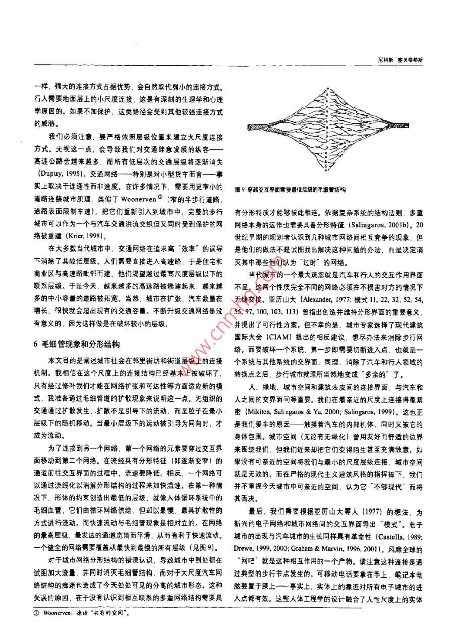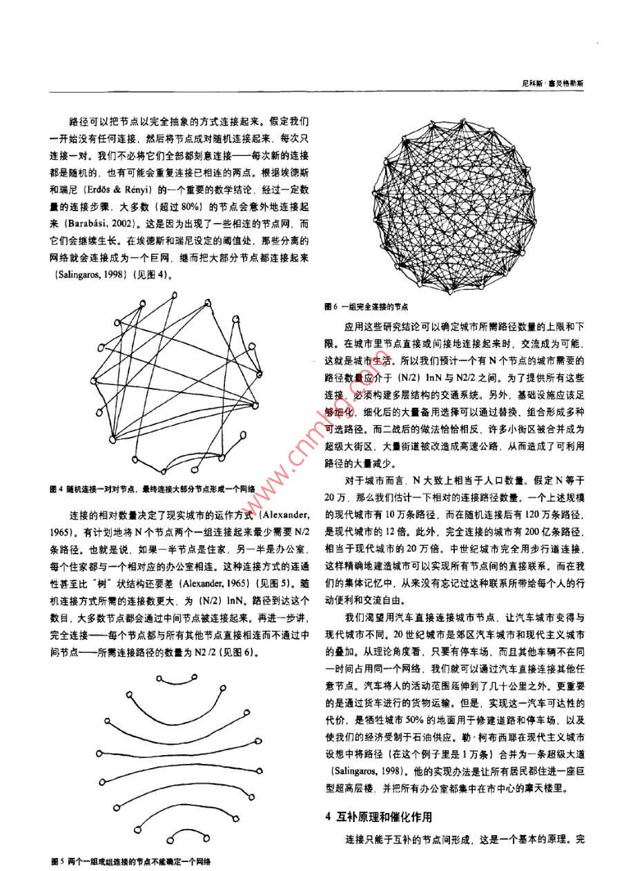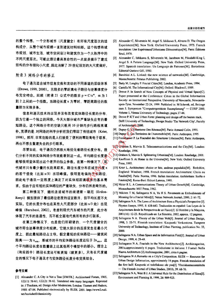 連接分形的城市Connecting the Fractal City尼科斯·塞靈格勒斯著劉洋譯Connecting the Fractal City”是作者在“第5屆歐洲摘要:和所有生命系魷一樣、有活力的城市本質上鄰具有分形特征。汽車和人口增長來的壓城鎮(zhèn)與城市劃師雙年大會(5 h Biennial of towns力迫使20世紀的城市覜劃者推行反分形的幾何美型,傳統(tǒng)城市的分形特狂被去除,給城市肌理and town planners in Europe, Barcelona, ApriL, 2003逗成災難性的影響,要消除這種破壞,必須深人細致地理解一些問題:(1)分形特征有上發(fā)表的主旨發(fā)言,作者投權我刊發(fā)表中譯文啷些;(2)有活力的城市肌理中鐠綜復雜的相互連接;(3)連接和修補城市空間的方法;(4)暨合行人、汽車和公共交通的有效方式;(5)如何將實體聯(lián)系與電于聯(lián)系結合起來。首先,我們應該消除對分形結構的一些基本誤解,然后我會強調層級一致性的豐質和重要性。我們可以用分形標度來檢瞼城市形體—作為城市藏功的一個前提;男一個獨立標度是連通性,應當從拓撲學角度進行斫究。用生物系統(tǒng)進化和因特冏的知識來討論尺度分布、逆冪律度尺度法則和“小世界”路,這些概念表明當代都市一方西向郭區(qū)化菱延發(fā)展,另一方面是摩天樓式發(fā)展這種對棍端害度的偏好嘟是碼態(tài)的。當代都市面臨的挑戰(zhàn)是如何用最佳方式實現(xiàn)競爭性連接網(wǎng)蟮的融合。Abstract: Living cities have intrinsically fractal properties. in common with all living systems. Thepressure to accommodate both the automobile and increased population growth led twentieth-centuryurbanists to impose anti-fractal geometrical typologies, The fractal properties of the traditional ciwere erased, with disastrous consequences for the urban fabric. To undo this damage, it is necessarto understand several things in some detail: (1)what these fractal properties are: 2)the intricateconnectivity of the living urban fabric: (3)methods of connecting and repairing urban space: (4)an effective way to overlay pedestrian, automotive, and public transports: and (5)how to integratephysical connections with electronic connections. First of all, some basic misunderstandings aboutfractal structure have to be cleared up. i will then underine the nature and importance of hierarchicalcoherence, We can use the fractal criterion to test the geometry of cities as one condition for thesuccess. Another independent criterion is connectivity, which has to be studied topologically. I will uslessons leamed from the evolution of biological systems and the intemet to discuss the distribution ofsues, inverse-power sealing laws, and'small-world' networks. These concepts show us that extremedensities favored in contemporary urbanism--suburban sprawl on the one hand, and skyscraperson the other-are pathological, The challenge for the contemporary city is how to superimposecompeting connective networks in an optimal manner.作者:尼科斯·塞靈格勒斯( Nikos A. Salingaros)、關鍵詞,規(guī)劃;城市說計;分形;網(wǎng)絡:尺度;層緹;類國德州大學圣安東尼奧分校數(shù)學系教授,“小世界”網(wǎng)絡;迸寡律度尺度法則;傳統(tǒng)從業(yè)者 INTBAU(傳統(tǒng)變筑與城市地區(qū)催化作用;毛細管見象國際組織)學院成員。nikos@lonestar,utsa. eduwords: Planning: Urban Design; Fractals: Networks; Scaling: Hierarchies,譯者:劉洋,英國麻省理工學院城市規(guī)劃系研究生" Small-world"Networks: Inverse Power- Law ScalinyangLamiteduCatalysis, Capillarity尼科斯·塞靈格歉斯到微小的結構,所有尺度上都存在一種相互關聯(lián)的層級結構1導言見附錄1)。然后我會對使城市具有活力的連通性進行概括介本文從幾何形體連接方式的角度介紹不同類型的城市。不紹。有活力的城市有著比人們對現(xiàn)代城市的預想中多得多的節(jié)同的城市類型孕育著不同程度的城市生活。城市生活直接依賴點間連接。這類連接的自然形成需要大量.多樣并緊密混合的于其所在的聯(lián)系結構及其支撐體系,因為幾何形體或促進或抑節(jié)點。因此,現(xiàn)代建筑國際大會【CIAM)提出的單一功能分制著人的行為和交流。理解這一點對于融入信息與通訊技術驅區(qū)的重要理念被證明抑制了城市活力動下的電子城市至關重要。與人們的普遍認識柜反的是電子本文其他部分將討論維持城市活力所必要的連接層級。相城市并不是高科技現(xiàn)代汽車城市的必然結果,實際上它反互競爭的網(wǎng)絡連接存在于一些尺度上,每種尺度的存在對實現(xiàn)而與具有人性化尺度的19世紀城市連接得更好不同的功能都是必需的。如果我們想把電子城市整合入實體城為了更好地討論這些純幾何學問題,需要先澄清一些術語市.就必須理解這種互聯(lián)關系。我對注重大尺度連接而排的定義。我在技術附錄中定義了“分形,尺度層級和“連尺度連接的政策持批判態(tài)度—因為這兩者城市都需要.并且通性等概念。城市規(guī)劃者也許會誤以為這篇文章題目的意思希望它們能夠保持均衡。今天的城市在機動車交通與行人之間是:“連接一個不連通的城市。確實.當代都市是不連通的,非常缺乏一個有效的交互界面,我記得亞歷山大 Christopher但就另一個意義來說,它們也不具有分形特征(見圖1),城市 Alexander)曾提出過解決這個問題的方案。下面.我就來討論組成部分的規(guī)模的分布和連接從根本上決定了不同的城市類型。網(wǎng)絡結構效率并介紹一下“小世界”網(wǎng)絡的概念幅完整的城市美景由不同的相互