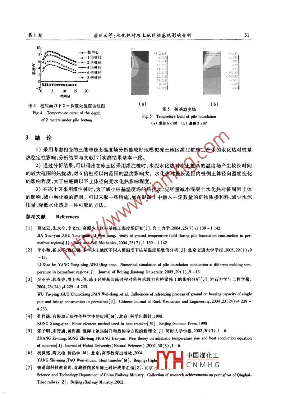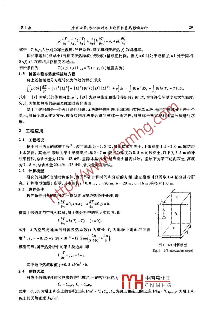 第31卷第1期西安科技大學(xué)學(xué)報Vol 31 No. 1201l年01月 JOURNAL OFⅪI'ANUNⅤ ERSITY OF SCIENCE AND TECHNOLOGYJun.2011文章編號:1672-9315(2011)01-0028-05水化熱對凍土地區(qū)樁基熱影響分析唐麗云,楊更社,讓艷艷,王專兵西安科技大學(xué)建筑與土木工程學(xué)院陜西西安710054)摘要:針對凍土區(qū)灌注樁基礎(chǔ)施工會給凍土引進(jìn)一定的熱量,破壞凍土的穩(wěn)定凍結(jié)狀態(tài)問題,研究水化熱對樁基沿徑向溫度變化規(guī)律及影響樁周凍土溫度場的時間?;跇逗蛢鐾恋娜S非穩(wěn)態(tài)溫度場控制方程,并考慮邊界條件和凍融相變過程,建立了樁基非穩(wěn)態(tài)溫度場控制方程。對樁周溫度場的熱影響分析表明,澆筑混凝土后水化熱在第5d達(dá)到最大,水化熱對樁長范圍內(nèi)樁側(cè)土體徑向溫度變化的影響程度大于樁底面以下土體徑向受水化熱影響程度,水化熱對樁周圍土體有較大的影響而且時間長。得出的一些結(jié)論可為凍土區(qū)樁基設(shè)計施工提供參考關(guān)鍵詞:水化熱;凍土地區(qū);灌注樁;非穩(wěn)態(tài)溫度場;熱擾動;有限元分析中圖分類號:TU47文獻(xiàn)標(biāo)志碼:A0引言凍土區(qū)灌注樁基礎(chǔ)施工會給凍土引進(jìn)一定的熱量,地溫場將相應(yīng)地發(fā)生變化,破壞凍土的穩(wěn)定凍結(jié)狀態(tài),尤其是混凝土灌注樁中的水化熱會給穩(wěn)定的凍土帶來很大的熱擾動。水化熱對凍土樁基溫度場的影響已有一定的研究,但多集中在不同入模溫度下樁基的回凍時間2)、承載力變化及樁與凍土的相互作用方面,而水化熱對樁基沿徑向溫度影響規(guī)律及影響半徑問題未見討論。因此本文中針對上述問題運用考慮相變的三維非穩(wěn)態(tài)有限元分析灌注樁施工中,水化熱對樁基溫度場的熱擾動問題,為設(shè)計和施工提供參考1樁基非穩(wěn)態(tài)溫度場有限元模型1.1樁體溫度場控制方程及初始條件控制方程為(2)(2的)+(m)+cm式中T,k為混凝土的溫度和導(dǎo)熱系數(shù);9為單位時間內(nèi)單位體積中混凝土水化熱,,=C=Cck8其中為不同初始溫度和不同齡期混凝土絕熱溫升,℃,6,為混凝土最大絕熱溫升,℃,k為在初始溫度T時的混凝土水化熱化學(xué)反應(yīng)速率,d1,k=Ae,對于混凝土A=0.1362d-1,B=0.0553℃,t為絕熱溫升中實際養(yǎng)護(hù)時間,d,為絕熱溫升開始時間,dip,C為混凝土的密度及容積熱容量。初始條件為7(x,y,z,t)=T1(x,y,z)(實測得出)1.2凍土溫度場控制方程、初始條件凍土的伴有相變的三維非穩(wěn)態(tài)溫度場控制方程為中國煤化工收稿日期:2010-09-17CNMHG基金項目:國家自然科學(xué)基金項目(4087217,4080068);教育部博士點基金項目(200704001)通訊作者:唐麗云(1977-),女湖南祁陽人副教授博士,主要從事凍土工程和結(jié)構(gòu)工程的研究工作第1期唐麗云等:水化熱對凍土地區(qū)樁基熱影響分析aT-a/, aaq,+式中T,k,p,L分別為凍土溫度、導(dǎo)熱系數(shù)密度和相變潛熱f.為固相率固相率增加(或減小)與相變潛熱釋放(或吸收)量成正比例。當(dāng)∫,=0時處于液相:∫=1處于固相0