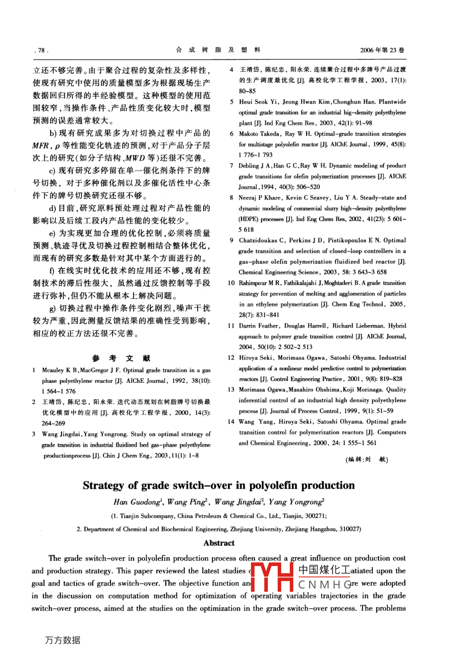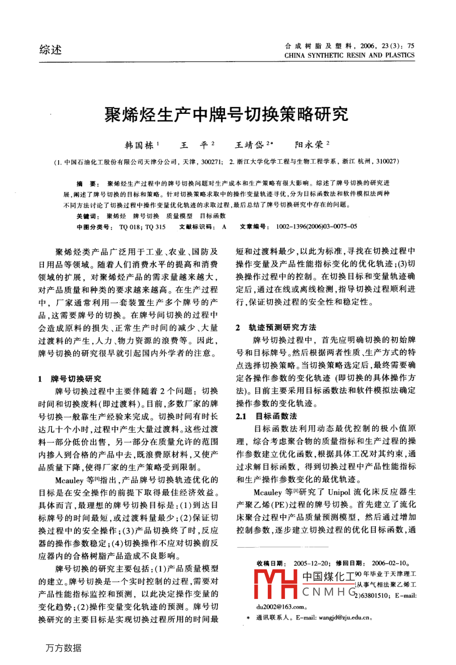 綜述合成樹(shù)脂及塑料,2006,23(3): 75CHINA SYNTHETIC RESIN AND PLASTICS聚烯烴生產(chǎn)中牌號(hào)切換策略研究韓國(guó)棟1E平2王靖岱2°陽(yáng)永榮2(1.中國(guó)石油化工股份有限公司天津分公司,天津, 300271; 2. 浙江大學(xué)化學(xué)工程與生物工程學(xué)系,浙江杭州, 310027)摘要:聚烯烴生產(chǎn)過(guò)程中的牌號(hào)切換問(wèn)題對(duì)生產(chǎn)成本和生產(chǎn)策略有很大影響。綜述了牌號(hào)切換的研究進(jìn)展,闡述了牌號(hào)切換的目標(biāo)和策略。針對(duì)切換策略求取中的操作變量軌跡尋優(yōu),分為目標(biāo)函數(shù)法和軟件模擬法兩種不同方法討論了切換過(guò)程中操作變量?jī)?yōu)化軌跡的求取過(guò)程.最后總結(jié)了牌號(hào)切換研究中存在的問(wèn)題。關(guān)鍵詞:聚烯烴牌號(hào)切換質(zhì)量模型目標(biāo)函數(shù)中圈分類(lèi)號(hào): TQ 018; TQ 315文獻(xiàn)標(biāo)識(shí)碼: A文章編號(hào): 1002-1396(2006)03- 0075- _05聚烯烴類(lèi)產(chǎn)品廣泛用于工業(yè)、農(nóng)業(yè)、國(guó)防及短和過(guò)渡料最少,以此為標(biāo)準(zhǔn),尋找在切換過(guò)程中日用品等領(lǐng)域。隨著人們消費(fèi)水平的提高和消費(fèi)操作變量及產(chǎn)品性能指標(biāo)變化的優(yōu)化軌跡;(3)切領(lǐng)域的擴(kuò)展,對(duì)聚烯烴產(chǎn)品的需求量越來(lái)越大,換操作過(guò)程中的控制。在切換目標(biāo)和變量軌跡確對(duì)產(chǎn)品質(zhì)量和種類(lèi)的要求越來(lái)越高。在生產(chǎn)過(guò)程定后,通過(guò)在線(xiàn)或離線(xiàn)檢測(cè),指導(dǎo)切換過(guò)程順利進(jìn)中,廠家通常利用-一套裝置生產(chǎn)多個(gè)牌號(hào)的產(chǎn)行,保證切換過(guò)程的安全性和穩(wěn)定性。品,這需要牌號(hào)的切換。在牌號(hào)間切換的過(guò)程中會(huì)造成原料的損失、正常生產(chǎn)時(shí)間的減少、大量2軌跡預(yù)測(cè)研 究方法過(guò)渡料的產(chǎn)生,人力、物力資源的浪費(fèi)等。因此,牌號(hào)切換過(guò)程中,首先應(yīng)明確切換的初始牌牌號(hào)切換的研究很早就引起國(guó)內(nèi)外學(xué)者的注意。號(hào)和目標(biāo)牌號(hào)。然后根據(jù)兩者性質(zhì)生產(chǎn)方式的特點(diǎn)選擇切換策略。當(dāng)切換策略選定后,最終需要確1牌號(hào)切換研究定各操作參數(shù)的變化軌跡(即切換的具體操作方牌號(hào)切換過(guò)程中主要伴隨著2個(gè)問(wèn)題:切換法)。目前主要采用目標(biāo)函數(shù)法和軟件模擬法確定時(shí)間和切換廢料(即過(guò)渡料)。目前,多數(shù)廠家的牌操作參數(shù)的變化軌跡。號(hào)切換一般靠生產(chǎn)經(jīng)驗(yàn)來(lái)完成。切換時(shí)間有時(shí)長(zhǎng)2.1 目標(biāo)函數(shù)法達(dá)幾十個(gè)小時(shí),過(guò)程中產(chǎn)生大量過(guò)渡料。這些過(guò)渡目標(biāo)函數(shù)法利用動(dòng)態(tài)最優(yōu)控制的極小值原料-部分低價(jià)出售,另一部分在質(zhì)量允許的范圍理,綜合考慮聚合物的質(zhì)量指標(biāo)和生產(chǎn)過(guò)程的操內(nèi)摻入到合格的產(chǎn)品中去,既浪費(fèi)原材料,又使產(chǎn)作參數(shù)建立優(yōu)化函數(shù),根據(jù)具體工況對(duì)其約束,通品質(zhì)量下降,使得廠家的生產(chǎn)策略受到限制。過(guò)求解目標(biāo)函數(shù),得到切換過(guò)程中產(chǎn)品性能指標(biāo)Mcauley等P指出,產(chǎn)品牌號(hào)切換軌跡優(yōu)化的和生產(chǎn)操作參數(shù)變化的最優(yōu)軌跡。目標(biāo)是在安全操作的前提下取得最佳經(jīng)濟(jì)效益。Mcauley等凹研究了Unipol流化床反應(yīng)器生具體而言,最理想的牌號(hào)切換目標(biāo)是:(1)到達(dá)目產(chǎn)聚乙烯(PE)過(guò)程的牌號(hào)切換。首先建立了流化標(biāo)牌號(hào)的時(shí)間最短,或過(guò)渡料量最少;(2)保證切床聚合過(guò)程中產(chǎn)品質(zhì)量預(yù)測(cè)模型,然后通過(guò)增加換過(guò)程中的安全操作;(3)產(chǎn)品切換終了時(shí),反應(yīng).控制參數(shù),逐步建立切換過(guò)程的優(yōu)化目標(biāo)函數(shù),通器的操作參數(shù)穩(wěn)定;(4)切換操作不應(yīng)對(duì)切換前反應(yīng)器內(nèi)的合格樹(shù)脂產(chǎn)品造成不良影響。收稿日期: 2005 -12- -20;修回日期: 2006 -02 -10。牌號(hào)切換的研究主要包括:(1)產(chǎn)品質(zhì)量模型中國(guó)煤化工90年畢業(yè)于天津理工的建立,。牌號(hào)切換是- - 個(gè)實(shí)時(shí)控制的過(guò)程,需要對(duì)!從事氣相法聚乙媚工產(chǎn)品性能指標(biāo)監(jiān)控和預(yù)測(cè),以此決定操作變量的MHC N M H G2)63801510; E-mail:變化趨勢(shì);(2)操作變量變化軌跡的預(yù)測(cè)。牌號(hào)切du2002@163.com。換研究的主要目標(biāo)是實(shí)現(xiàn)切換過(guò)程所用的時(shí)間最*通訊聯(lián)系人。 E-mail: wangjd@zju.edu.cn.。76.合成樹(shù)脂及塑料2006年第23卷過(guò)對(duì)函數(shù)的求解得到操作變量及產(chǎn)品物性的最優(yōu)軌跡。建立的目標(biāo)函數(shù)()如下:=](0QMFR- InMFR.,J + w(P. -pR + I," wQInMFR. - InMFR.,}+(1)wo(ρp-p.)Hdt +ws(T-TJ}+ , 10(0 _.)d式中,MFR,ρ分別為產(chǎn)品的熔體流動(dòng)速率和密度;T,o分別為反應(yīng)器中溫度和放空流率;下標(biāo)c,一瞬時(shí)值i,sp分別表示累積值、瞬時(shí)值和目標(biāo)值;ho,t為切-...累積值|換開(kāi)始和結(jié)