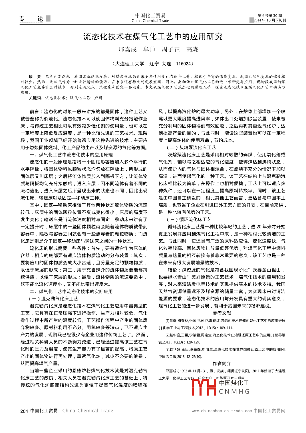 中國化工貿(mào)易第6卷第30期專China Chemical Trade2014 年10月下旬刊流態(tài)化技術(shù)在煤氣化工藝中的應(yīng)用研究邢嘉成牟帥周子正高森(大連理工大學(xué)遼寧大連116024)摘要:改革開發(fā)以來,我國工業(yè)迅猛發(fā)展,對煤炭資源的開采量與使用量也在逐年上升,相比于豐富的煤炭資源,我國天然氣資源的儲量相對較少,然而,天然氣作為一-種比較清潔的能源,在未來還有很大的發(fā)展空間,因此,要加強(qiáng)對煤氣化工藝的進(jìn)一步研究與應(yīng)用?,F(xiàn)階段我國的煤.氣化工藝主要有三種技術(shù),分別是流化床、汽化床和固定一移動床。本文從煤氣化工藝流態(tài)化的原理入手,探究流態(tài)化技術(shù)在煤氣化工藝中的實(shí)際應(yīng)用。關(guān)鍵詞:流態(tài)化技術(shù);煤氣化工藝;應(yīng)用前言:流態(tài)化的對象-般來講指的都是固體,這種工藝又風(fēng),以提高汽化爐的最大功率;另外,在爐體上部增加一個(gè)噴被普遍稱為假液化。流態(tài)化技術(shù)可以使固體物料充分接觸作業(yè)嘴以更大限度提高進(jìn)風(fēng)率,爐體出口處增加除塵裝置,使未被床,與傳統(tǒng)工藝相比可以有效減少催化劑的使用量,也可以在充分利用的固體物得到有效回收,之后再將其重返氣化爐,達(dá)-定程度上降低反應(yīng)溫度,是一種比較先進(jìn)的工藝技術(shù)。現(xiàn)階到提高產(chǎn)量的目的,與此同時(shí),增設(shè)這些裝置也可以在一定程段,我國工業(yè)領(lǐng)域已經(jīng)開始普遍應(yīng)用這種先進(jìn)的技術(shù),主要應(yīng)度.上提高爐體的使用壽命,節(jié)約成本。用于燃燒固體燃料、化工產(chǎn)品的生產(chǎn)以及煤資源的氣化等方面。-一、煤氣化工藝中流態(tài)化技術(shù)的應(yīng)用原理灰熔聚流化床工藝是采用相對較散的碎煤,使用氧化劑或流態(tài)化的一般原理是指將一 個(gè)圓柱形容 器加入多個(gè)平行的氣化劑,輔以與之相適應(yīng)的氣化速度,使碎煤達(dá)到沸騰狀態(tài),水平隔板,將固體物料以顆粒狀態(tài)均勻放在隔板上,所形成的從而使?fàn)t內(nèi)的氣體與固體相混合,在燃燒不充分的情況下加以固體層又叫床層;之后將流體物質(zhì)加入到隔板下方,讓流體物高溫,進(jìn)而使煤氣化的一種工藝。該工藝在結(jié)構(gòu). 上與溫克勒汽質(zhì)與隔板均勻充分接觸后,進(jìn)入床層,因不同流體有著不同的化床相比較為簡單,在操作上也相對便捷,工藝上可以適應(yīng)多流動速度,進(jìn)入床層之后所呈現(xiàn)出來的狀態(tài)也不同,因此出現(xiàn)種煤種,還可以在一定程度 上提高原料轉(zhuǎn)換率。同時(shí),該工藝流化床、輸送床以及固定一移動床三種。是由中國自主研發(fā)的,相比其他工藝而言,更適合與中國本土其中,固定-移動床相較于其他兩種狀態(tài)流體物質(zhì)的流速煤質(zhì),也節(jié)省了企業(yè)在引進(jìn)國外工藝方面的開支,在目前來講,較低,床層中的固體顆粒位置不變或變化微小,床層的高度不是一種比較有優(yōu)勢的工藝。發(fā)生變化;輸送床是當(dāng)流體速度相對與固定-移動床來講有 了(三)循環(huán)流化床工藝-定提升時(shí),床層中的一些固體顆粒就會隨著流體物質(zhì)被帶到循環(huán)流化床工藝是一種比較年輕的工藝,進(jìn)20年來才開始容器中,隔板與容器之間就會有一些漂浮著的顆粒物質(zhì) ;而流真正發(fā)展并應(yīng)用到煤氣化工程中來,是一種相對比較清潔的工化床是則是介于固定一移 動床與輸送床之間的一種狀態(tài)。藝。與此同時(shí),它還具有廣泛的原料適應(yīng)性、流化速度快、氣流化床的形成需要一些條件 :首先,要有適合作為床體的化效率較高、固體廢物排放量低等優(yōu)勢,對煤氣化工程中燃料容器,相應(yīng)的底部要有適應(yīng)流體物質(zhì)流動的分布裝置;其次,質(zhì)量與熱量的相互轉(zhuǎn)換有著非常重要的意義,該工藝也是一種要將應(yīng)用的固體物質(zhì)變成大小合適,且分量充足的顆粒物質(zhì),在未來有很大發(fā)展前景的技術(shù)。以便于床層的形成;第三,用于充當(dāng)媒介的流體物質(zhì)要能夠持結(jié)論:煤資源的氣化是符合我國現(xiàn)階段”既要金山銀山,續(xù)供應(yīng),以便于床層的形成;最后,流體物質(zhì)的流速要適中,也要綠水青山”美好愿景的工藝技術(shù),煤氣化技術(shù)的應(yīng)用和發(fā)既不能比流化速度小,又不能比帶出速度大。展,對未來清潔發(fā)電等技術(shù)的實(shí)現(xiàn)提供基本的技術(shù)支持。我國二、煤氣化工藝中流態(tài)化技術(shù)的實(shí)際應(yīng)用天然氣資源儲量遠(yuǎn)不及煤資源的儲量豐富,為實(shí)現(xiàn)未來對清潔(一)溫克勒氣化床工藝能源的要求,流態(tài)化技術(shù)的應(yīng)用與開發(fā)具有重大的現(xiàn)實(shí)意義,溫克勒汽化床是流態(tài)化技術(shù)在煤氣化工藝應(yīng)用中最典型的煤氣化工藝的進(jìn)一步發(fā)展 ,有利于我國未來的經(jīng)濟(jì)建設(shè)。工藝,它具有在正常壓強(qiáng)下進(jìn)行操作、生產(chǎn)力相對較低、氣化參考文獻(xiàn)操作過程中所產(chǎn)生的溫度較低、工藝操作流程中產(chǎn)生的固體廢[1]董群梅春林,張國甲,孫征,李春紅流態(tài)化技術(shù)在催化裂化工藝中的應(yīng)用進(jìn)展棄物較多、原材料利用不充分、用
