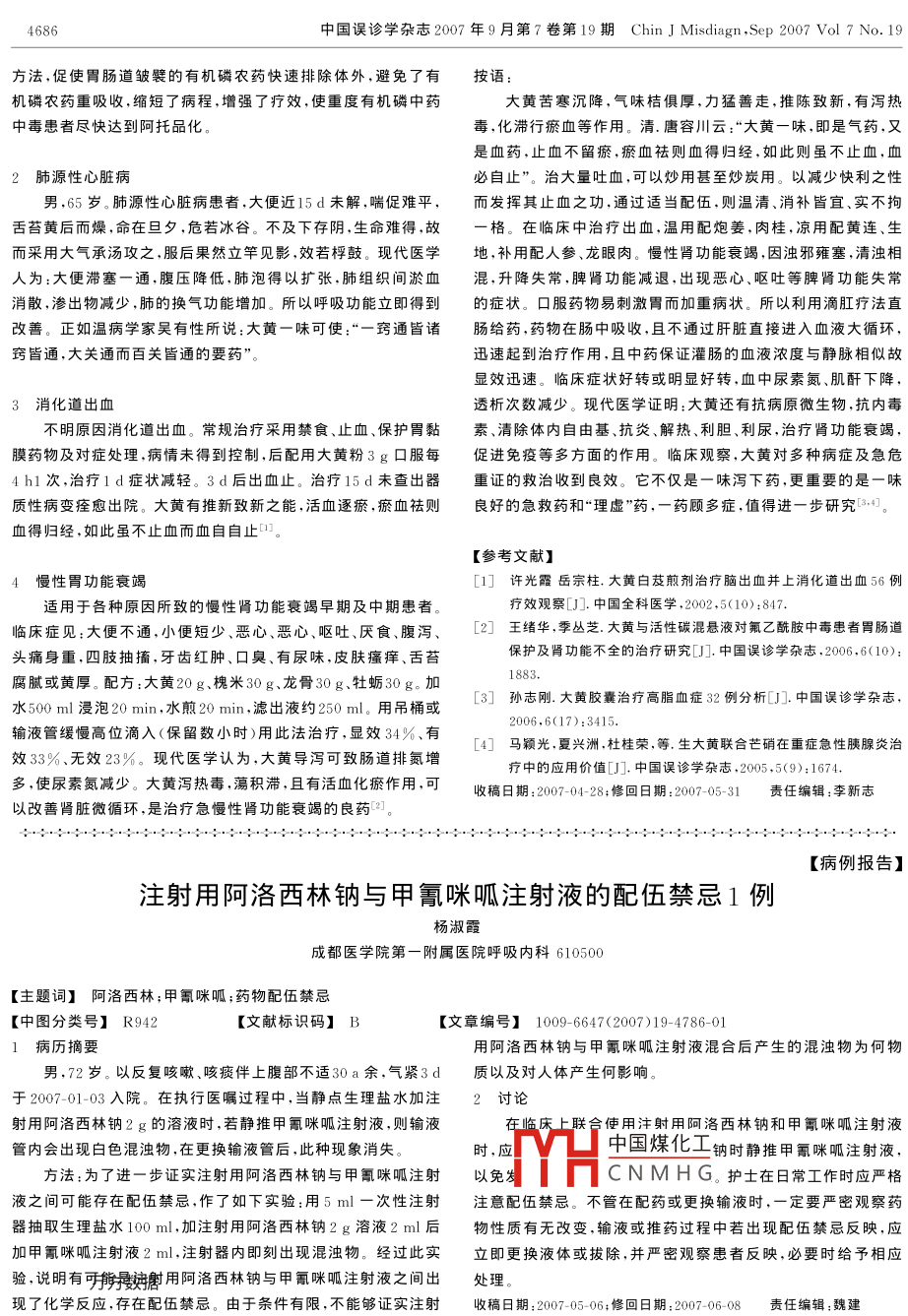 中國誤診學(xué)雜志2007年9月第7卷第19期 Chin J Misdiagn,Sep2007Vol7No.194685【臨床用藥】藥物所致腰痛馬瑞琴,王念立2【主題詞】腰痛/化學(xué)誘導(dǎo)【中圖分類號】R441.1【文獻(xiàn)標(biāo)識碼】B【文章編號】1009-6647(2007)19-4685-01對近年來文獻(xiàn)報(bào)道藥物所致腰痛摘要如下。受,即停藥,予對癥治療,2d后腰骶部疼痛完全消失1奧美拉唑5蓮必治女,52歲。因胃潰瘍給予奧美拉唑20mg口服,2次/d,服用女,24歲。因扁桃體炎給予蓮必治注射液0.5g+0.9%生本品后1個(gè)月,患者出現(xiàn)腰痛,雙腎B超檢查未見異常。停藥后理鹽水25ml靜滴,1次/d,靜滴1h后突然出現(xiàn)頭痛、頭暈、高腰痛癥狀逐漸減輕至消失再次服藥,1d后再次出現(xiàn)腰痛,停熱,雙側(cè)腰痛,全身肌肉酸痛及關(guān)節(jié)疼痛等癥狀。給予對證治藥后,次日腰痛逐漸減輕療,2h后上述癥狀逐漸減輕,4d后癥狀消失2法莫替丁女,67歲。因胃竇炎給予法莫替丁100ml靜滴,在用藥106葛根素min左右,患者突然出現(xiàn)雙下肢疼痛,腰背部劇痛,并有頭暈、胸女,65歲。因腦梗死給予葛根素250mg+250m生理鹽水畏寒和呼吸困難。即停藥,予對癥治療,0.5h后疼痛緩解。靜滴,1次/d,3d后岀現(xiàn)腰痛并逐漸加重,后滴速減慢仍疼痛,其余癥狀基本消失停藥后疼痛減輕。2d后再次按上述用藥又出現(xiàn)腰痛癥狀已酮可可堿【參考文獻(xiàn)】女,67歲。因眩暈癥給予已酮可可堿0.2g靜滴,1次/d,連[1]高夕英,王麗英,奧美拉唑引起腰痛1例報(bào)告[J].中國社區(qū)醫(yī)師續(xù)2d后在輸完本品后約5min,均出現(xiàn)畏寒、四肢發(fā)抖、腰骶部2006,8(17):92劇痛及小腹脹痛,即停藥,予對癥處理,上述癥狀逐漸消失③[2]李曉云.法莫替丁注射液致嚴(yán)重過敏反應(yīng)2例[].中國醫(yī)院藥學(xué)雜志,2006,26(10):13234核糖核酸Ⅱ[3]李靜.靜脈滴注已酮可可堿致不良反應(yīng)1例[冂].藥學(xué)流行病學(xué)雜女,70歲。因胃竇體絨毛腺瘤惡變給予核糖核酸』100mg志,2006,15(2):82.十0.9%生理鹽水250m靜滴,1次/d,用藥第3天,輸入本品5[4]陶天偉唐亞娟.核糖核酸致腰骶部劇烈疼痛].藥物不良反應(yīng)min左右,突然出現(xiàn)下腹部劇痛,隨之出現(xiàn)腰骶部劇痛,難以忍[5]向恩,羅建華,余文杰蓮必治注射液致不良反應(yīng)1例報(bào)告[].藥物流行病學(xué)雜志,2007,16(1)作者單位:1.解放軍第四O一醫(yī)院特檢科,山東青島266071;2.青島大學(xué)醫(yī)學(xué)院北院6]王清波.葛根素注射液致腰痛1例[].工企醫(yī)刊,2006,19(5):50.收稿日期:2007-05-06;修回日期:2007-06-11責(zé)任編輯:魏建大黃應(yīng)用之我見劉萍【主題詞】大黃/治療應(yīng)用【中圖分類號】R282.71【文獻(xiàn)標(biāo)識碼】B【文章編號】1009-6647(2007)19-4685-02大黃別名甚多,同行皆知,不必贅述。干百年來,在人類與得甚捷,并對大黃的應(yīng)用體會如下疾病斗爭史上大黃以將軍之威,屢建奇功。其功效有通閉解結(jié)中國煤化工推陳致新,清熱解毒,瀉中有補(bǔ),調(diào)二便,和五臟,調(diào)理機(jī)體的整體功能。廣泛用于,內(nèi)、外、婦、兒等臨床各科以及急慢性疾病CNMHG急性有機(jī)鎖權(quán)藥中毒,僅憑洗胃要完全清除胃腸道殘留的中。所不同的是,配五、炮制(生、熟、酒、炒、炒炭、粉劑等)煎法有機(jī)磷農(nóng)藥是非常困難的因胃的腸道有很多皺襞除常規(guī)及(浸泡、后下、同煎)在長期的臨床實(shí)踐中,本人應(yīng)用大黃每每獲對癥治療外,在反復(fù)洗胃后灌入大黃煎劑。用法:大黃30g、沸水250m浸泡30min,大火煎10min一次灌入200ml,后改用大黃作者單位:山東省肥城市人民醫(yī)院中醫(yī)科27160030g(每日量)沸水浸泡30min分多次口服或鼻飼。通過下瀉的中國誤診學(xué)雜志2007年9月第7卷第19期 Chin j misdiagn,Sep2007Vol7No.19方法,促使胃腸道皺襞的有機(jī)磷農(nóng)藥快速排除體外,避免了有按語機(jī)磷農(nóng)藥重吸收,縮短了病程,增強(qiáng)了療效,使重度有機(jī)磷中藥大黃苦寒沉降,氣味桔俱厚,力猛善走,推陳致新,有瀉熱中毒患者盡快達(dá)到阿托品化毒,化滯行瘀血等作用。清.唐容川云:“大黃一味,即是氣藥,又是血藥,止血不留瘀,瘀血祛則血得歸經(jīng),如此則雖不止血,血肺源性心臟病必自止”。治大量吐血,可以炒用甚至炒炭用。以減少快利之性男,65歲。肺源性心臟病患者,大便近]5d未解,喘促難平,而發(fā)揮其止血之功,通過適當(dāng)配伍,則溫清、消補(bǔ)皆宜、實(shí)不拘舌苔黃后而燥,命在旦夕,危若冰谷。不及下存陰,生命難得,故格。在臨床中治療岀血,溫用配炮姜,肉桂,涼用配黃連、生而采用大氣承湯攻之,服后果然立竿見影,效若桴鼓?,F(xiàn)代醫(yī)學(xué)地,補(bǔ)用配人參、龍眼肉。慢性腎功能衰竭,因濁邪雍塞,清濁相人為:大便滯塞一通,腹壓降低,肺泡得以擴(kuò)張,肺組織間淤血混,升降失常,脾腎功能減退,岀現(xiàn)惡心、嘔吐等脾腎功能失常消散,滲岀物減少,肺的換氣功能增加。所以呼吸功能立即得到的癥狀??诜幬镆状碳の付又夭?。所以利用滴肛療法直改善。正如溫病學(xué)家吳有性所說:大黃一味可使:“一竅通皆諸腸給藥,藥物在腸中吸收,且不通過肝臟直接進(jìn)入血液大循環(huán)竅皆通,大關(guān)通而百關(guān)皆通的要藥迅速起到治療作用,且中藥保證濯腸的血液濃度與靜脈相似故顯效迅速。臨床癥狀好轉(zhuǎn)或明顯好轉(zhuǎn),血中尿素氮、肌酐下降3消化道出血透析次