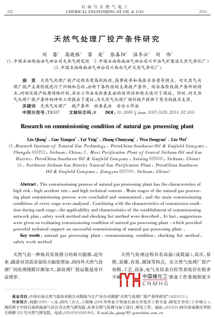 石油與天然氣化工122CHEMICAL ENGINEERING OF OIL gas2014天然氣處理廠投產(chǎn)條件研究劉薔高曉根雷英?張春陽(yáng)溫冬云劉偉(1.中國(guó)石油西南油氣田公司天然氣研究院2.中國(guó)石油西南油氣田公司川中油氣礦磨溪天然氣凈化廠)(3.中國(guó)石油西南油氣田公司川西北氣礦天然氣凈化廠)摘要天然氣處理廠投產(chǎn)過(guò)程具有高風(fēng)險(xiǎn)性、高事故率和高技術(shù)含量等特點(diǎn)。對(duì)天然氣處理廠投產(chǎn)主要階段進(jìn)行了歸納和總結(jié),分析了各階段的主要投產(chǎn)條件。結(jié)合各階段投產(chǎn)條件的特點(diǎn),對(duì)制定投產(chǎn)統(tǒng)籌網(wǎng)絡(luò)計(jì)劃、安全工作法及檢查表法的適用性和特點(diǎn)進(jìn)行了闡述。同時(shí),對(duì)天然氣處理廠投產(chǎn)條件的評(píng)價(jià)工作提出了建議,為天然氣處理廠順利投產(chǎn)提供了有力的技術(shù)支撐關(guān)鍵詞天然氣處理廠投產(chǎn)條件檢查表法安全工作法中圖分類號(hào):TE687文獻(xiàn)標(biāo)志碼:BDOI:10.3969/ 1.Issn.1007-3426,2014.02.003Research on commissioning condition of natural gas processing plantLiu Qiang, Gao Xiaogen, Lei Ying, Zhang Chunyang, Wen Dongyun, Liu Wei(1. Research Institute of Natural Gas Technology, Petro China Southwest Oil Gasfield Com panyChengdu 610213, Sichuan, China; 2. Moxi Purification Plant of Central Sichuan Oil and GasDistrict, Petro China Southwest Oil Gasfield Company, Suining 629000, Sichuan, China)( 3. Northwest Sichuan Gas District MOil Gasfield Com p any, Jiangyou 621709, Sichuan, China)Abstract The com missioning process of natural gas processing plant has the characteristics ofrisk, high accident rate, and high technical content. Main stages of the natural gas processing plant commissioning process were concluded and summarized, and the main commissioningconditions of every stage were analyzed. Com bining with the characteristics of commission condition during each stage, the applicability and characteristics of the establishment of co mmissioningnetwork plan, safety work method and checking list method were described. At last, suggestionswere given on evaluating commissioning condition of natural gas processing plant, w hich providedpowerful technical support on successful commissioning of natural gas processing plantKey words: natural gas processing plant, commissioning condition, checking list method,天然氣是一種極具發(fā)展?jié)摿Φ男屡d能源,近年天然氣處理過(guò)程具有高溫(或低溫)、高壓、易來(lái),隨著對(duì)其需求量的大幅度增加,國(guó)內(nèi)外天然氣處燃、易爆、有毒、腐蝕等特點(diǎn)。在天然氣處理廠投產(chǎn)理廠的處理規(guī)模日漸加大,新處理廠投運(yùn)數(shù)量亦日初期,工藝、設(shè)備、電氣及儀表自控等系統(tǒng)存在較多益增多"H中國(guó)煤化工準(zhǔn)備工作重視程度不CNMHG基金項(xiàng)目:中國(guó)石油天然氣股份有限公司勘探與生產(chǎn)分公司課題“天然氣處理廠投產(chǎn)條件研究”(A201111)。作者簡(jiǎn)介:劉薔(1983—),女,四川三臺(tái)人,工程師,2008年畢業(yè)于西南石油大學(xué)化學(xué)工程專業(yè),研究生學(xué)歷(工學(xué)碩土)現(xiàn)任職于中國(guó)石油西南油氣田公司天然氣研究院,從事天然氣處理與加工設(shè)計(jì)、研究工作。地址:(610213)泗四川省成都市華陽(yáng)天研路218號(hào)天然氣研究院。電話:028-85604563-803。E- mail: liu_qiangdI@ petrochina,om,cn第43卷第2期劉薔等天然氣處理廠投產(chǎn)條件研究123夠、投產(chǎn)準(zhǔn)備目標(biāo)不明確或采用的方法不科學(xué),可能2.2單機(jī)試運(yùn)及工程中間交接階段導(dǎo)致員工操作失誤,嚴(yán)重時(shí)甚至可能引發(fā)重大或惡?jiǎn)螜C(jī)試運(yùn)指現(xiàn)場(chǎng)安裝的驅(qū)動(dòng)裝置空負(fù)荷運(yùn)轉(zhuǎn)或性事故。因此,在完成天然氣處理廠新廠建設(shè)或老單臺(tái)機(jī)器、機(jī)組以水、空氣等為介質(zhì)進(jìn)行的試運(yùn),是改造并進(jìn)入投產(chǎn)過(guò)程時(shí)需開展相關(guān)的投產(chǎn)條件評(píng)為了檢驗(yàn)其除受介質(zhì)影響外的機(jī)械性能和制造、安價(jià),以消除裝置投運(yùn)時(shí)存在的安全隱患,保障裝置的裝質(zhì)量的過(guò)程。單機(jī)試運(yùn)是對(duì)機(jī)電設(shè)備制造、安裝順利試運(yùn)投產(chǎn)質(zhì)量的初次檢驗(yàn),通過(guò)檢驗(yàn)設(shè)備單機(jī)運(yùn)轉(zhuǎn)時(shí)的實(shí)際由于天然氣處理廠投產(chǎn)程序多、涉及面廣、過(guò)程運(yùn)行狀況,按照相關(guān)標(biāo)準(zhǔn)和規(guī)范進(jìn)行驗(yàn)收。復(fù)雜,而國(guó)內(nèi)目前尚缺乏適用于天然氣處理廠的系工程中間交接是指單項(xiàng)工程或單位工程按設(shè)計(jì)統(tǒng)性投產(chǎn)方法,如何將龐大的投產(chǎn)條件系統(tǒng)進(jìn)行整文件所規(guī)定的范圍全部完成,并經(jīng)管道系統(tǒng)和設(shè)備合優(yōu)化,使其規(guī)范化,具有系統(tǒng)性、實(shí)用性和可操作的檢査、電氣和儀表自控系統(tǒng)調(diào)試及單機(jī)試運(yùn)并初性,是當(dāng)前天然氣處理廠投運(yùn)前面臨的重要難題。步驗(yàn)收合格后,承包單位(和/或施工單位建設(shè)單1天然氣處理廠簡(jiǎn)介位(和/或生產(chǎn)單位)所進(jìn)行的交接工作。工程中間交接是承包單位(和或施工單位)向建設(shè)單位(和/天然氣處理廠是指對(duì)原料天然氣進(jìn)行脫硫脫或生產(chǎn)單位)辦