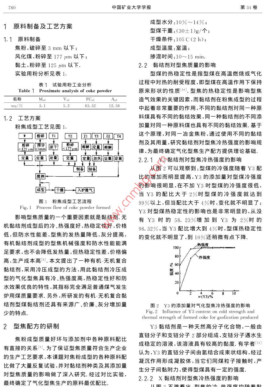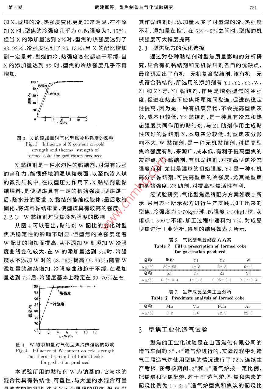 第34卷第6期中國礦業(yè)大學(xué)學(xué)報 Vol. 34 No. 62005年11月 Journal of China University of Mining&. TechnologyNov.2005文章編號:1000-194(2005)06-0779-05型焦制備與氣化試驗研究武建軍,韓甲業(yè),諶天兵,應(yīng)瑩,李飛明(中國礦業(yè)大學(xué)化工學(xué)院,江蘇徐州221008)摘要:以焦粉為原料,添加一種有機(jī)無機(jī)復(fù)合黏結(jié)劑,采用冷壓成型的方法,研究開發(fā)出了冷強(qiáng)度≥70kgf/球,熱強(qiáng)度≥30kgf/球,灰熔點大于1500℃的高質(zhì)量氣化型焦.通過在移動床氣化爐的造氣實驗表明,該氣化型焦完全符合工業(yè)化造氣用煤要求,可替代焦炭作為生產(chǎn)半水煤氣的原料關(guān)鍵詞:焦粉;氣化型焦;冷壓成型;氣化爐中圖分類號:TQ523.4文獻(xiàn)標(biāo)識碼:A Study of Formed Coke Production and Gasification Experiment WU Jian-jun, HAN Jia-ye, CHEN Tian-bing, YING Ying, LI Fei-ming (School of Chemical Engineering and Technology, China University of Mining 8. Technology, Xuzhou, Jiangsu 221008, China) Abstract: The major objective of this study was to explore the use of coke powder as main material of producing formed coke which is formed under a certain pressure at room temperature added with an organic-inorganic multiple binder. The result show that the ashy melting point of the formed coke is above 1 500 C and its cold strength over 70 kg as well as its thermal strength also surpasses 30 kg. It has been proved that the formed coke is qualified to be used as industrial gasification coal that produces gas with the formed coke in the moving bed gasify furnace. Key words: coke powder; gasification formed coke cold briquetting; gasify furnace焦粉是冶金、化工、電石等生產(chǎn)企業(yè)將工業(yè)焦害人身健康焦粉氣化型焦工藝的開發(fā)則可解決炭破碎時產(chǎn)生的一種副產(chǎn)物,因粒度小不符合生造氣用塊煤或塊焦供不應(yīng)求和焦粉大量積壓的矛產(chǎn)工藝要求而被廢棄.據(jù)調(diào)查,焦化廠通常焦粉盾,使制出的型焦達(dá)到高強(qiáng)防水,在氣化爐的高溫、產(chǎn)率約為5%然而,今年由于煉焦煤經(jīng)被人為強(qiáng)制通風(fēng)、快速反應(yīng)、料層移動條件下能夠使的混雜,配煤質(zhì)量下降,因而許多焦化廠焦粉的實用461.用焦粉生產(chǎn)氣化型焦提高了焦粉的經(jīng)濟(jì)附際產(chǎn)率高達(dá)7%~8%2.目前我國大多數(shù)用焦企加值,是焦粉加工利用的一條新的技術(shù)途徑本業(yè)因沒有找到解決焦粉成型的有效辦法,廢棄焦粉文介紹以焦粉為原料,添加一種有機(jī)無機(jī)復(fù)合黏只能當(dāng)作低級燃料廉價處理工業(yè)廢棄焦粉不能再結(jié)劑,采用冷壓成型的方法,生產(chǎn)出了冷、熱強(qiáng)度利用,這不僅造成了大量能源浪費,生產(chǎn)成本上升,高,熱穩(wěn)定性好的氣化型焦在山西焦化有限公司經(jīng)濟(jì)效益下降,更為重要的是廢棄焦粉堆積露天,造氣車間的造氣試驗結(jié)果表明,該氣化型焦完全符風(fēng)吹日曬,四處飛揚,造成對環(huán)境嚴(yán)重的粉塵污染,合工業(yè)化造氣用煤標(biāo)準(zhǔn),用它來替代焦炭作為生產(chǎn)直接影響到生產(chǎn)廠區(qū)及周圍的工作和生活環(huán)境危半水煤氣的原料是可行的收稿日期:2005-06-15780中國礦業(yè)大學(xué)學(xué)報第34卷1原料制備及工藝方案成型水分:10%~14%;型煤干重:(30±1)g/個;1.1原料制備干燥條件:105C(2h);焦粉,破碎至3mm以下;成型溫度:室溫;風(fēng)化煤,粉碎至177m以下;摻混時間:10~15min.黏土,粉碎至125μm以下.2.2黏結(jié)劑對型焦質(zhì)量的影響實驗用粉分析見表1型煤的熱穩(wěn)定性是指型煤在高溫燃燒或氣化表1試驗用粉工業(yè)分析過程中對熱的耐受程度,即型煤在高溫作用下保持 Table 1 Proximate analysis of coke powder原來形狀的性質(zhì)10.型焦的熱穩(wěn)定性是影響型焦名稱 Mad Vad FCad造氣效果的關(guān)鍵因素,而黏結(jié)劑在粉焦成型的過程 wB/%3.11.283.3212.38中起著非常重要的作用,不同的黏結(jié)劑對同一種原1.2工藝方案料煤具有不同的黏結(jié)效果,同一種黏結(jié)劑的不同添粉焦成型工藝見圖1.加量對同一種原料煤也具有不同的黏結(jié)效果.基于粉碎2213Z24這個原理,對同一冶金焦粉,通過使用不同的黏結(jié)粉碎涼干定溶解粉碎劑及其用量,研究黏結(jié)劑對型焦冷熱強(qiáng)度的影響規(guī)律,為最終確定氣化型焦生產(chǎn)配方提供理論基礎(chǔ).定量定量定量定量定最加水定量定量2..13黏結(jié)劑對型焦冷熱強(qiáng)度的影響從圖2可以觀察到:型煤的冷強(qiáng)度隨著Y3配攪拌比的增加而明顯提高,Y3的添加量對型煤冷強(qiáng)度的影響很明顯,在不加Y3時型煤的冷強(qiáng)度很低成型干燥入爐造氣當(dāng)Y3的配比大于2%時型煤的冷強(qiáng)度就達(dá)到圖1粉焦成型工藝流程99%以上,但當(dāng)配比大于4%時,變化就不明顯了 Fig. 1 Process flow of coke powder formedY3對型煤熱穩(wěn)定性的影響也是非常明顯的,從沒影響型焦質(zhì)量的一個重要因素就是黏結(jié)劑.無有Y3時的58.23%增加到Y(jié)3為2%時的機(jī)黏結(jié)劑成型后的冷、熱強(qiáng)度好,熱穩(wěn)定性好,價格9632%,當(dāng)Y3配比增大到4%時,型煤熱穩(wěn)定性低,但防水性能差,型焦的發(fā)熱量降低,灰分提高,的變化就不明顯了,到10%還稍微有點下降有機(jī)黏結(jié)劑成型的型焦機(jī)械強(qiáng)度和防水性能能滿100熱強(qiáng)度足要求,也不會降低發(fā)熱量,但熱穩(wěn)定性差,價格偏高,生產(chǎn