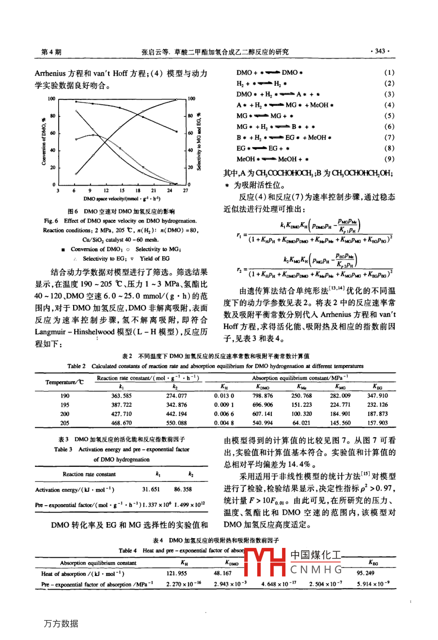 石油化工340PETROCHEMICAL TECHNOLOGY2007年第36卷第4期草酸二甲酯加氫合成乙二醇反應的研究張啟云,黃維捷,文峰,肖文德(華東理工大學化學工程國家重點實驗室,上海200237)[摘要]在微型管式反應器中,采用 Cusio2催化劑在溫度190-210℃、壓力1~3MPa、草酸二甲酯(DMO)與氫氣的摩爾比(氫酯比)40-120,DMO空速6.0-25.0mmo(g·h)的條件下,對DMO加氫制乙二醇的反應進行了研究。實驗結果表明,高溫、高壓高氫酯比和低DMO空速都能提高DMO的轉化率和乙二醇的收率但同時也增加了副產物的選擇性。較適合的反應條件為:壓力2MPa,溫度205~210℃,氫酯比80-100,DM空速10.0mmoW(g·h)。動力學研究表明DMO加氫反應符合Langmuir- Hinshelwood吸附反應動力學模型,表面反應為速率控制步驟,氫氣不解離吸附,由此得到了相應的動力學方程及參數。統(tǒng)計檢驗結果表明,該模型對DMO加氫反應高度適定。[關鍵詞]草酸二甲酯;乙二醇;加氫;銅/二氧化硅催化劑;動力學[文章編號]1000-8144(20070)04-0940-05[中圍分類號]TQ223.162[文獻標識碼]AHydrogenation of Dimethyl Oxalate to Ethylene GlycolZhang Qiyun, Huang Weijie, Wen Feng, Xiao WendeState Key Labotatory of Chemical Engineering, Eest China University of Science and Technology, Shanghai 200237, ChinaAbstract] Hydrogenation of dimethyl oxalate DMO)to ethylene glycol EG)was investigated in atubular microreactor on Cu/SiO, catalyst. Effects of temperature, pressure, mole ratio of H, to DMOnd dMo space velocity on reaction were studied in ranges of 190-210 C, 1-3 MPa, 40-120 and6.0-25.0 mmol(g. h),respectively. Both DMO conversion and EG yield increased at highertemperature, higher pressure, larger mole ratio of H, to DMO and lower DMO space velocity, butselectivity to byproduct also increased. The optimized reaction conditions were pressure 2 MPatemperature 205-210C, mole ratio of H, to DMO 80-100 and DMO space velocity 10. 0 mmol(g. h). Langmuir-Hinshelwood mechanism model with non-dissociative hydrogen adsorption isremarkably suitable to DMO hydrogenation. Surface reaction is the velocity controlling stepkinetic equation was checked by statistic test.Keywords] dimethyl oxalate; ethylene glycol; hydrogenation; copper/silicon dioxide catalyst;乙二醇(EG),又稱甘醇,主要用于生產聚對苯行了深入的研究制備了 Cu/sio2催化劑,并在自制二甲酸乙二醇酯、防凍劑、溶劑等,是一種重要的有三段爐固定床不銹鋼加壓反應器中對該反應進行了機化工原料。近年來,世界聚酯生產迅猛發(fā)展,EG研究。但由于該反應器管徑較粗(φ20mm×2.5需求與日俱增。生產EG的傳統(tǒng)工藝采用環(huán)氧乙烷mm),催化劑床層中難免會存在溫度的徑向分布,而直接水合法,該工藝流程長、設備多能耗高EG且該反應器還存在測溫不準等缺點。DMO加氫反應的生產成本高。為此,人們提出了許多新的合成對溫度極其敏感即使很小的溫度偏差都會對原料轉EG的方法23,其中合成氣經草酸二甲酯(DMo)化率及產物組成產生巨大的影響因此在測溫不準的生產EG的工藝具有很強的競爭力該工藝首先反應器中得到的動力學數據存在較大的誤差由CO氣相氧化偶聯(lián)得DMO,DMO再加氫制EG。本工作采用改進的反應器及溫度控制裝置,使用DMO加氫是一個串聯(lián)反應,首先DMO加氫生中國煤化工成中間產物乙醇酸甲酯(MG),MG再加氫生成[收稿CNMHGo-01-15EG,EG過度加氫則生成副產物乙醇作者簡介]張啟云(1981-),男浙江省寧波市人,碩士生。聯(lián)系李竹霞等6對合成氣經DMO生產EG工藝進:肖文德電話021-64252814,電郵 wdxiao@ ecust,cdu,cm第4期張啟云等.草酸二甲酯加氫合成乙二醇反應的研究CuSO2催化劑,考察了DMO加氫反應的工藝條件,質量流量計控制流量,進入汽化器與汽化的DMO提出了該反應的動力學模型,為工業(yè)化應用提供參考。溶液充分混合后進入反應器進行反應。產物由冰水1實驗部分槽冷卻,液體產物收集后進行分析,尾氣經皂膜流量計計量后放空1.1試劑及儀器無水甲醇:分析純,上海振興化工一廠;DMO:2結果與討論分析純,上海旭光化工廠;氫氣、氮氣:純度999%,2.1內、外擴散對反應的影響上海五鋼氣體公司;CuSO2催化劑:自制。DMO為考察DMO加氫反應的動力學行為,首先要常溫下為固體,難以控制進料,因此將DMO溶于甲排除內外擴散對反應的影響。內擴散的消除可通醇配成DMO質量分數13.6%的甲醇溶液(簡稱過減小催化劑的粒徑來實現(xiàn);外擴散的消除則通過DMO溶液)。提高反應物的空速來實現(xiàn)。為此,考察了 CusiO2產物分析采用惠普上海分析儀器有限公司HP催化劑的粒徑及DMO空速對DMO轉化率的影響,6890氣相色譜儀色譜柱為美國惠普公司 Carbowax-實驗結果見圖2和表1。由圖2可見,當ma/F<20M填充柱,檢測溫度和汽化溫度都為230℃;數1.5g·hg(即在DMoO空速大于5.6mmo據處理采用大連化學物理研究所開發(fā)的 Chrom98(g·h)的高空速區(qū))時,外擴散的影響已消除。由(V2.0)色譜數據處理系統(tǒng)。表1可見,當采用40~80目的cu/SiO2催化劑時,12實驗裝置與流程DMO轉化率基本上不隨CuSO2催化劑粒徑的變改進的反應器為微型不銹鋼U形管反應器化而變化,說明在此粒徑范圍內無內擴散的影響。(中3.6mm×1mm),反應溫度由程序控溫式油浴實驗中選用40~60目的Cu/SO2催化劑,DMO空裝置控制,溫度誤差小于0.1℃,由于反應器管徑速大于等于6.0mmo/(g·h)。小,導熱油熱容大,因此可消除催化劑床層中溫度的徑向分布。測溫熱電偶插入到反應器的內部,可準確測量反應溫度。實驗裝置見圖1。0406081.01214161202.2DMOd FDMo/(g·h·g)圖2ma/Fwo對DMO加氫反應的影響RDLFig. 2 Effect 