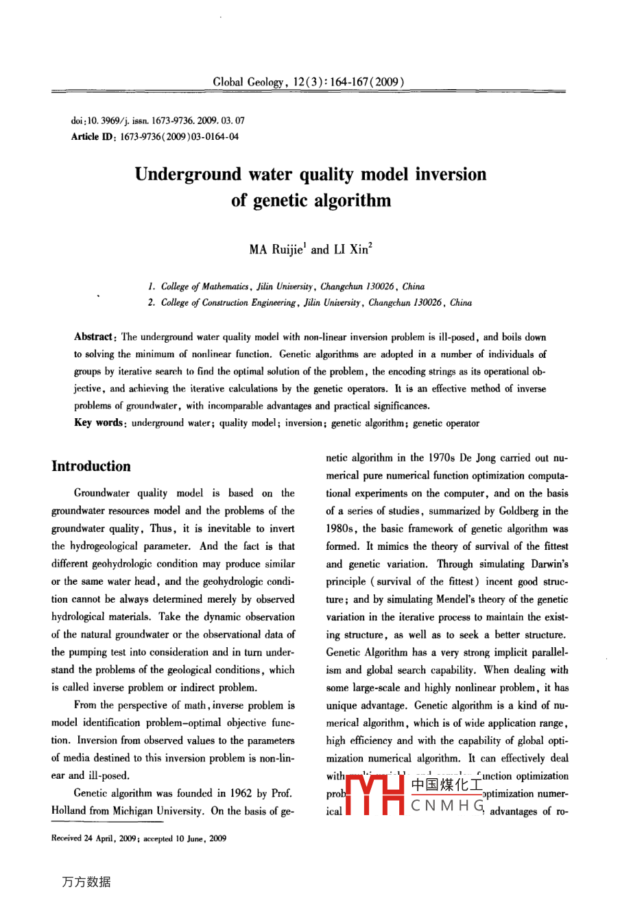 Clobal Geology, 12(3): 164-167(2009)doi:10. 3969/j. isn. 1673-9736. 2009.03.07Article D: 1673-9736(2009 )03-0164-04Underground water quality model inversionof genetic algorithmMA Rujjie' and LI Xin21. College of Mathemais, Jjlin Uniersity, Changchun 130026, China2. College of Construcion Eninering, Jilin Uniersiy, Changchun 130026, ChinaAbstract: The underground walter quality model with non-linear inversion problem is ill. posed, and boils downto solving the minimum of nonlinear function. Genetie algorithms are adopted in a number of individuals ofgroups by iterative search to find the optimal solution of the problem, the encoding strings as its operational ob-jective, and achieving the iterative calculations by the genetic operators. It is an effective method of inverseproblems of groundwater, with incomparable advantages and practical significances.Key words: underground water; quality model; inversion; genetie algorithm; genetic operatornetic algorithm in the 1970s De Jong carried out nu-Introductionmerical pure numerical function optimization computa-Groundwater quality model is based on thetional experiments on the computer, and on the basisgroundwater resources model and the problems of theof a series of studies , summarized by Goldberg in thegroundwater quality, Thus, it is inevitable to invert1980s, the basic framework of genetic algorithm wasthe hydrogeological parameter. And the fact is thatformed. It mimics the theory of survival of the fttestdifferent geohydrologic condition may produce similarand genetic variation. Through simulating Darwin'sor the same water head, and the geohyrologic condi-principle ( survival of the fttest) incent good struc-tion cannot be always determined merely by observedture; and by simulating Mendel's theory of the genetichydrological materials. Take the dynamic observationvariation in the iterative process to maintain the exist-of the natural groundwater or the observational data ofing structure, as well as to seek a better structure.the pumping test into consideration and in turm under-Genetic Algorithm has a very strong implicit parallel-stand the problems of the geological conditions, whichism and global search capability. When dealing withis called inverse problem or indirect problem.some large-scale and highly nonlinear problem, it hasFrom the perspective of math , inverse problem isunique advantage. Genetic algorithm is a kind of nu-model identification problem- -optimal objective func-merical algorithm, which is of wide application range,tion. Inversion from observed values to the parametershigh efficiency and with the capability of global opti-of media destined to this inversion problem is n-lin-mization numerical algorthm. It can efectively dealear and il-posed.withInction optimizationGenetie algrithm was founded in 1962 by Prof.pr中國煤化inaon numHolland from Michigan University. On the basis of ge-ical:TYHCNMH G avantages of r0Recrired 24 April, 2009; acepted 10 June, 2009, Underground water quality model inversion of genetic algorithm165bustness, parallel and high eficiency.and computer technology.Genetic algorithm has three basic elements :enco-1 Mathematic modelded mode , genetic operators and ftness function.Let's suppose that there are N wells in the regionEncoding of which is to convert the solutions ofG (Zhou et al. , 2000) made by the closed curve T ,the problem into coded strings to simulate the way thethe distrbution as shown in Fig. 1, and among themBiological chromosomes genetic computing for geneticm wells are extraction wells,operations; operator is a series of operations , the sim-ulation of individual survival environment; fitnessfunction is measuring function, the criteria for evalua-P0tion of the viability of the individual. Apart from the)(x,y)three fundamental elements, the genetic algorithm alsoinvolves some parameters of controlling factors, name-ly group size, crossover probability ,mutation proba-Fig.1 Distribution of wellsbility, genetic algebra and so on. Genetic algorithmbasic idea is to abstract the biological evolutionNe wells are observation wells, m + Ne = N; iprocess and then described as reproduction , crossoverwell centroid coordinates are (x;,y;), Well Radius isand mutation operator three operators. Genetic algo-rci, Well Perimeter areT; To (x, y;) as the center ofrithm can effectively deal with multivariate and thea circle, to rci for the radius ,this circular domain re-solving of complex function relation optimization prob-corded as Kci (i=1, 2, .., N); also assumed thatlems, due to genetic algorithm not required differenti-the N; extraction wells has three wells of given produc-able, parallel and widely applicable. The generaltion volumes and heads ha(a=1,2,.*,N ) on thestructure of genetic algorithm model and its applica-wall; has N; exploration wells on the wall only giventions are as fllows:head ha(a=N; +1,N+2,-,N, +N,) ,here N; +N;(1)Genetic encoding: Will solve the problem in=m, three observation wells centroid given the well-which each variable is seen as a gene, according tohead value h(x,y) (i=m+1,.. ,m +Ne) ,and setthe type of variables and range , and select the appro-valueh;(x, y, t) to the border r , in the region Gpriate digit binary code to be encoded separately ,given the initial head hq(x, y).called the genetic code , such as: x=[a,a2, a3,Known leakage recharge intensity E (Xu,2003 )as].recharge q, initial value ho , exterior boundary's head(2) fitness function: Genetic algorithm when inhl, Partial wall boundary head h。and flow rate Q2(asearch, substantially without using external informna-=1,2, .. m), part of the observation head h。(ation, only appropriate value function as the basis ,=m+1,... ,m +Ne),to reverse hydrogeology param-Zhu ( 1997) used species of each individual's fitness toeters of the mathematics model.carry out the search. According to the functional rela-tionship between problem solving and gene encoding2 Genetic algorithm stepsrules calculate all individuals