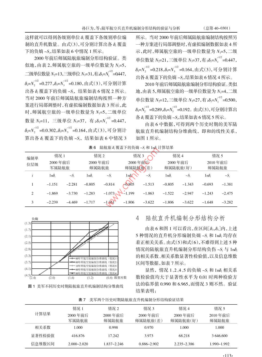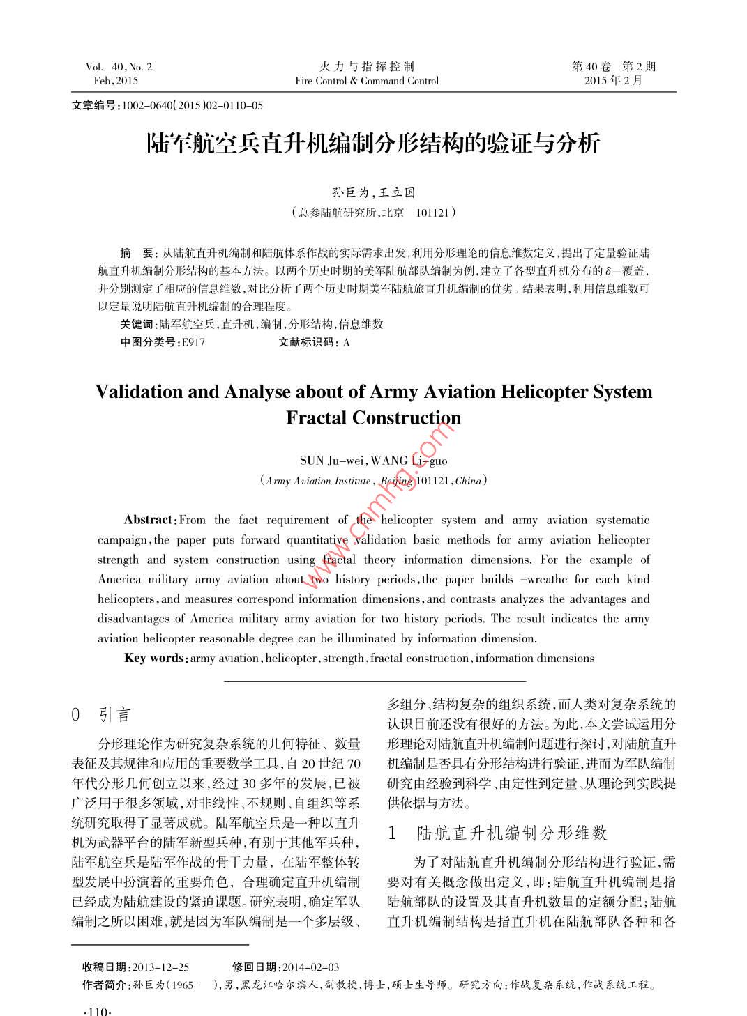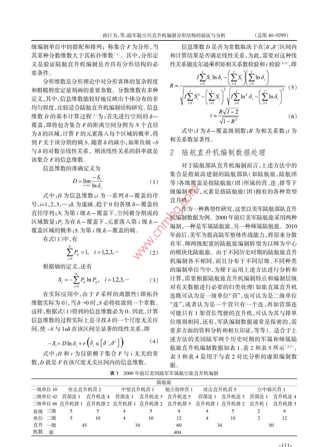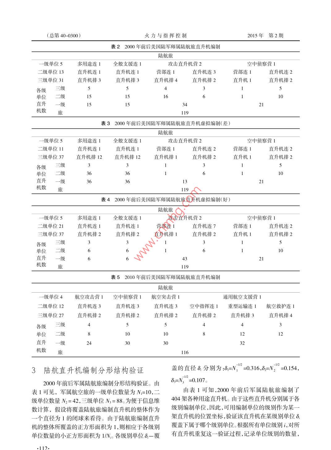 Vol 40. No. 2火力與指揮控制第40卷第2期Feb,2015Fire control command Control2015年2月文章編號:1002-0640(2015)02-0110-05陸軍航空兵直升機編制分形結構的驗證亐分析孫巨為,王立國(總參陸航研究所,北京101121)摘要:從陸航直升機編制和陸航體系作戰(zhàn)的實際需求岀發(fā),利用分形理論的信息維數(shù)定義,提岀了定量驗證陸航直升機編制分形結構的基本方法。以兩個歷史時期的美軍陸航部隊編制為例,建立了各型直升機分布的δ一覆蓋,并分別測定了相應的信息維數(shù),對比分析了兩個歷史時期美軍陸航旅直升機編制的優(yōu)劣。結果表明,利用信息維數(shù)可以定量說明陸航直升機編制的合理程度關鍵詞:陸軍航空兵,直升機,編制,分形結構,信息維數(shù)中圖分類號:E917文獻標識碼:AValidation and analyse about of Army aviation Helicopter SystemFractal ConstructionSUN Ju-wei, WANG Li-guoBAbstract: From the fact requirement of the helicopter system and army aviation systematiccampaign, the paper puts forward quantitative validation basic methods for army aviation helicopterstrength and system construction using fractal theory information dimensions. For the example ofAmerica military army aviation about two history periods, the paper builds -wreathe for each kindhelicopters, and measures correspond information dimensions, and contrasts analyzes the advantages anddisadvantages of America military army aviation for two history periods. The result indicates the armyaviation helicopter reasonable degree can be illuminated by information dimensionKey words: army aviation, helicopter, strength, fractal construction, information dimensions0引言多組分、結構復雜的組織系統(tǒng),而人類對復雜系統(tǒng)的認識目前還沒有很好的方法。為此,本文嘗試運用分分形理論作為研究復雜系統(tǒng)的幾何特征、數(shù)量形理論對陸航直升機編制問題進行探討,對陸航直升表征及其規(guī)律和應用的重要數(shù)學工具,自20世紀70機編制是否具有分形結構進行驗證,進而為軍隊編制年代分形幾何創(chuàng)立以來,經(jīng)過30多年的發(fā)展,已被研究由經(jīng)驗到科學、由定性到定量、從理論到實踐提廣泛用于很多領域,對非線性、不規(guī)則、自組織等系供依據(jù)與方法。統(tǒng)研究取得了顯著成就。陸軍航空兵是一種以直升機為武器平臺的陸軍新型兵種,有別于其他軍兵種、1陸航直升機編制分形維數(shù)陸軍航空兵是陸軍作戰(zhàn)的骨干力量,在陸軍整體轉(zhuǎn)為了對陸航直升機編制分形結構進行驗證,需型發(fā)展中扮演著的重要角色,合理確定直升機編制要對有關概念做岀定義,即:陸航直升機編制是指已經(jīng)成為陸航建設的緊迫課題。研究表明,確定軍隊陸航部隊的設置及其直升杋數(shù)量的定額分配;陸航編制之所以困難,就是因為軍隊編制是一個多層級、直升機編制結構是指直升機在陸航部隊各種和各收稿日期:2013-12-25修回日期:201402-03作者簡介:孫巨為(1965-),男,黑龍江哈爾濱人,副教授,博士,碩士生導師。研究方向:作戰(zhàn)復雜系統(tǒng),作戰(zhàn)系統(tǒng)工程。孫巨為,等:陸軍航空兵直升機編制分形結構的驗證與分析(總第40-0299)級編制單位中的搭配和排列;稱集合F為分形,當信息維數(shù)D是否為常數(shù)取決于在[8,8]區(qū)間內(nèi)其某種分數(shù)維數(shù)大于其拓撲維數(shù)1。其中,分形定和計算結果是否滿足線性關系,為此,需要對這種線義是驗證陸航直升機編制是否具有分形結構的必性關系做皮爾遜乘積矩相關系數(shù)檢驗和t檢驗2-3,即要條件。分形維數(shù)是分形理論中對分形客體的復雜程度Shno-∑S∑m和粗糙程度定量刻畫的重要參數(shù)。分數(shù)維數(shù)有多種R(5)定義,其中,信息維數(shù)能較好地反映出個體分布的非s2-∑S1∑ln26-∑l均勻程度,比較適合陸航直升機編制結構研究。信息R√I-2維數(shù)D的基本計算過程1.:首先進行空間的δt:(6)覆蓋,即將包含集合F的距離空間分割為N個直徑為δ的區(qū)域,計算F的元素落入每個區(qū)域的概率,得式中:/為δ覆蓋級別數(shù);R為相關系數(shù);t為到F關于該分割的熵S隨著δ的減小,如果負熵-S相關系數(shù)顯著性。與8的對數(shù)呈線性關系,則該線性關系的斜率就是2陸航直升機編制數(shù)據(jù)處理該集合F的信息維數(shù)。信息維數(shù)的準確定義為對于陸航部隊直升機編制而言,上述方法中的集合是指最高建制的陸航部隊(如陸航旅,陸航團D=lim(1)等)各級覆蓋是指陸航旅(團)所屬的營、連、排等下式中:D為信息維數(shù):為一系列6—覆蓋的序級編制單位,元素是指陸航旅(團)擁有的各種類型號,=1,2,3,…;:6為遞減、趨于0的各級δ一覆蓋的直升機。直徑序列;N為第i級δ一覆蓋下,空間被分割成的作為一種典型性研究,這里以美軍陸航部隊直升區(qū)域數(shù)量;P為在δ一覆蓋下,元素落入第i級δ機編制數(shù)據(jù)為例。2000年前后美軍陸航旅采用兩種覆蓋區(qū)域的概率;S;為第i級δ一覆蓋的熵。編制,一種是軍屬陸航旅,另一種師屬陸航旅。2010在式(1)中,有年前后,美軍為提高陸軍整體作戰(zhàn)能力,將原來分散在軍、師兩級配置的陸航旅編制轉(zhuǎn)型為以師為中心∑P=1,=12,3(2)的模塊化陸航旅。由于不同歷史時期的陸航旅直升機編制各不相同,而且分布于不同層級、不同種類根據(jù)熵的定義,還有的編制單位當中,為便于運用上述方法進行分析和S=∑PlnP,i=123,…(3)計算,需要根據(jù)陸航旅直升機編制