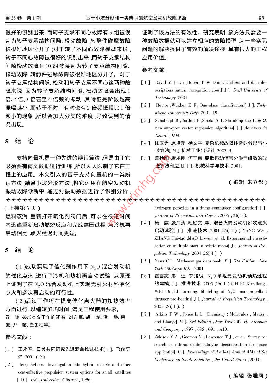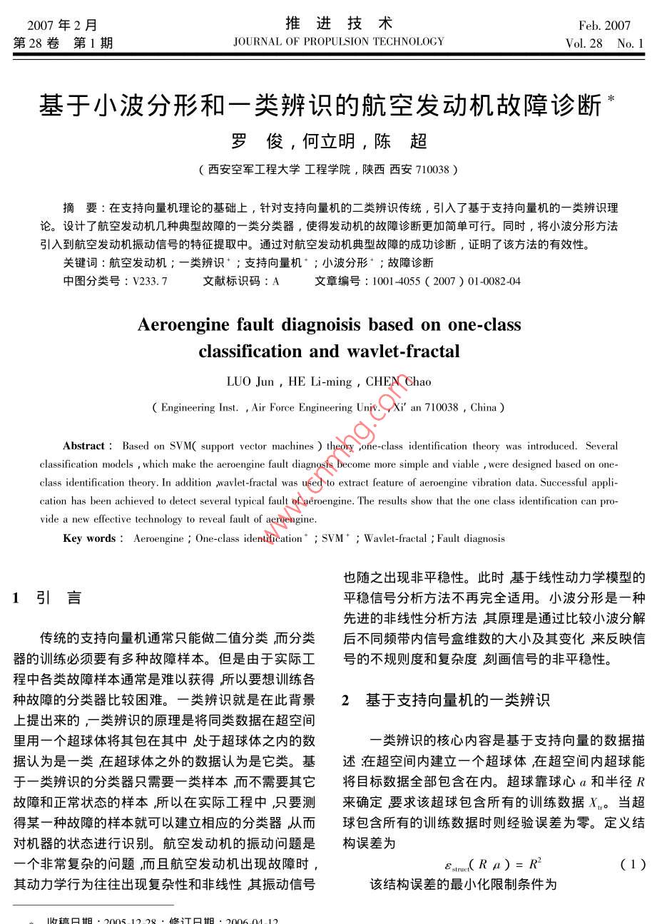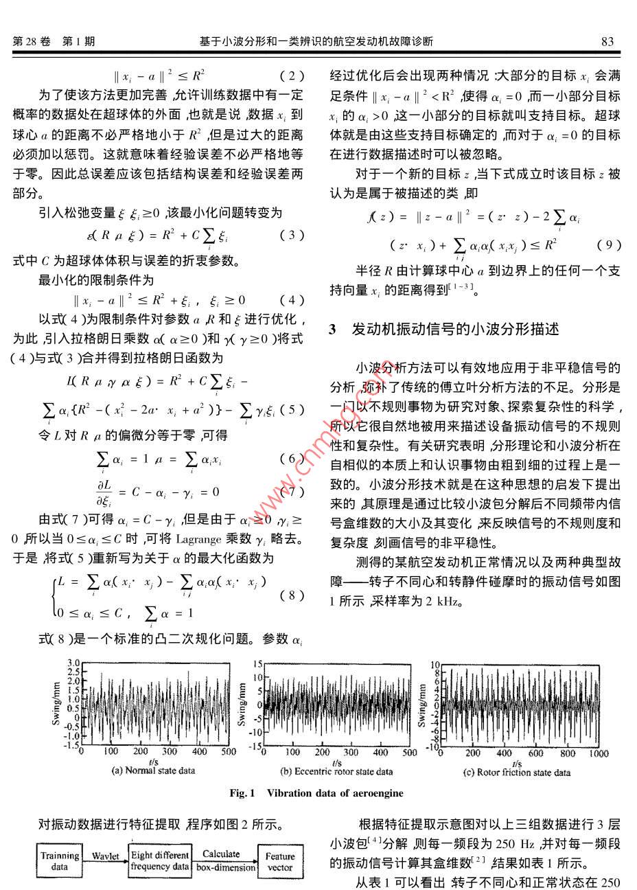 2007年2月推進(jìn)技術(shù)第28卷第1期JOURNAL OF PROPULSION TECHNOLOGYVol 28 No. I基于小波分形和一類辨識(shí)的航空發(fā)動(dòng)機(jī)故障診斷羅俊,何立明,陳超西安空軍工程大學(xué)工程學(xué)院,陜西西安710038)摘要∶在支持向量杋理論的基礎(chǔ)上,針對(duì)支持向量機(jī)的二類辨識(shí)傳統(tǒng),引入了基于支持向量機(jī)的一類辨識(shí)理論。設(shè)計(jì)了航空發(fā)動(dòng)機(jī)幾種典型故障的一類分類器,使得發(fā)動(dòng)機(jī)的故障診斷更加簡(jiǎn)單可行。同時(shí),將小波分形方法引入到航空發(fā)動(dòng)機(jī)振動(dòng)信號(hào)的特征提取中。通過(guò)對(duì)航空發(fā)動(dòng)機(jī)典型故障的成功診斷,證明了該方法的有效性。關(guān)鍵詞∶航空發(fā)動(dòng)機(jī);一類辨識(shí);支持向量機(jī)ˉ;小波分形;故障診斷中圖分類號(hào):V233.7文獻(xiàn)標(biāo)識(shí)碼:A文章編號(hào):10014055(2007)01-0082404Aeroengine fault diagnoisis based on one-classclassification and wavlet-fractalLUO Jun, he Li-ming, chen ChaoEngineering Inst., Air Force Engineering Univ. Xi an 710038, ChinaAbstract: Based on SVM( support vector machines theory one-class identification theory was introduced. Severalclassification models which make the aeroengine fault diagnosis become more simple and viable were designed based on one-c lass identification theory In addition wavlet -fractal was used to extract featurereengine vibration data. Successful application has been achieved to detect several typical fault of aeroengine. The results show that the one class identification can pro-vide a new effective technology to reveal fault of aeroengine.Key worderoengine One-class identification"; SVM Wavlet-fractal Fault diagnosis也隨之岀現(xiàn)非平穩(wěn)性。此時(shí)基于線性動(dòng)力學(xué)模型的平穩(wěn)信號(hào)分析方法不再完全適用。小波分形是一種先進(jìn)的非線性分析方法其原理是通過(guò)比較小波分解傳統(tǒng)的支持向量機(jī)通常只能做二值分類而分類后不同頻帶內(nèi)信號(hào)盒維數(shù)的大小及其變化來(lái)反映信器的訓(xùn)練必須要有多種故障樣本。但是由于實(shí)際工號(hào)的不規(guī)則度和復(fù)雜度刻畫信號(hào)的非平穩(wěn)性程中各類故障樣本通常是難以獲得所以要想訓(xùn)練各種故障的分類器比較困難。一類辨識(shí)就是在此背景2基于支持向量機(jī)的一類辨識(shí)上提岀來(lái)的,類辨識(shí)的原理是將同類數(shù)據(jù)在超空間里用一個(gè)超球體將其包在其中處于超球體之內(nèi)的數(shù)類辨識(shí)的核心內(nèi)容是基于支持向量的數(shù)據(jù)描據(jù)認(rèn)為是一類在超球體之外的數(shù)據(jù)認(rèn)為是它類?;鲈诔臻g內(nèi)建立一個(gè)超球體在超空間內(nèi)超球能于一類辨識(shí)的分類器只需要一類樣本而不需要其它將目標(biāo)數(shù)據(jù)全部包含在內(nèi)。超球靠球心a和半徑R故障和正常狀態(tài)的樣本所以在實(shí)際工程中只要測(cè)來(lái)確定翌求該超球包含所有的訓(xùn)練數(shù)據(jù)X。當(dāng)超得某一種故障的樣本就可以建立相應(yīng)的分類器從而球包含所有的訓(xùn)練數(shù)據(jù)時(shí)則經(jīng)驗(yàn)誤差為零。定義結(jié)對(duì)機(jī)器的狀態(tài)進(jìn)行識(shí)別。航空發(fā)動(dòng)機(jī)的振動(dòng)問(wèn)題是構(gòu)誤差為一個(gè)非常復(fù)雜的問(wèn)題而且航空發(fā)動(dòng)機(jī)出現(xiàn)故障時(shí),(R a)=R(1)其動(dòng)力學(xué)行為往往出現(xiàn)復(fù)雜性和非線性其振動(dòng)信號(hào)該結(jié)構(gòu)誤差的最小化限制條件為第28卷第1期基于小波分形和一類辨識(shí)的航空發(fā)動(dòng)機(jī)故障診斷x1-a‖2≤R2(2)經(jīng)過(guò)優(yōu)化后會(huì)出現(xiàn)兩種情況大部分的目標(biāo)x會(huì)滿為了使該方法更加完善允許訓(xùn)練數(shù)據(jù)中有一定足條件‖x1-a‖20這一小部分的目標(biāo)就叫支持目標(biāo)。超球球心a的距離不必嚴(yán)格地小于R2但是過(guò)大的距離體就是由這些支持目標(biāo)確定的而對(duì)于a=0的目標(biāo)必須加以懲罰。這就意味著經(jīng)驗(yàn)誤差不必嚴(yán)格地等在進(jìn)行數(shù)據(jù)描述時(shí)可以被忽略。于零。因此總誤差應(yīng)該包括結(jié)構(gòu)誤差和經(jīng)驗(yàn)誤差兩對(duì)于一個(gè)新的目標(biāo)κ,當(dāng)下式成立時(shí)該目標(biāo)z被認(rèn)為是屬于被描述的類即引入松弛變量ξξ≥0,該最小化問(wèn)題轉(zhuǎn)變?yōu)閦)=‖z-a‖2=(2z)-2∑aRa6)=R2+C∑6(3)(2x,)+∑aa(xx)≤R2(9)式中C為超球體體積與誤差的折衷參數(shù)。最小化的限制條件為半徑R由計(jì)算球中心a到邊界上的任何一個(gè)支持向量x,的距離得到以式4)為限制條件對(duì)參數(shù)aR和進(jìn)行優(yōu)化為此引入拉格朗日乘數(shù)a(a≥0)和yy≥0)將式3發(fā)動(dòng)機(jī)振動(dòng)信號(hào)的小波分形描述(4)與式3)合并得到拉格朗日函數(shù)為小波分析方法可以有效地應(yīng)用于非平穩(wěn)信號(hào)的I(Raya)=R2+C∑s分析彌補(bǔ)了傳統(tǒng)的傅立葉分析方法的不足。分形是aR2-(x2-2a·x,+a2)}-∑y(5)-門以不規(guī)則事物為研究對(duì)象、探索復(fù)雜性的科學(xué),令L對(duì)Ra的偏微分等于零可得所以它很自然地被用來(lái)描述設(shè)備振動(dòng)信號(hào)的不規(guī)則性和復(fù)雜性。有關(guān)研究表明分形理論和小波分析在a(6