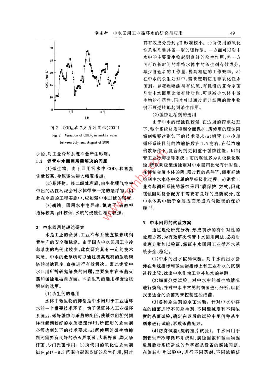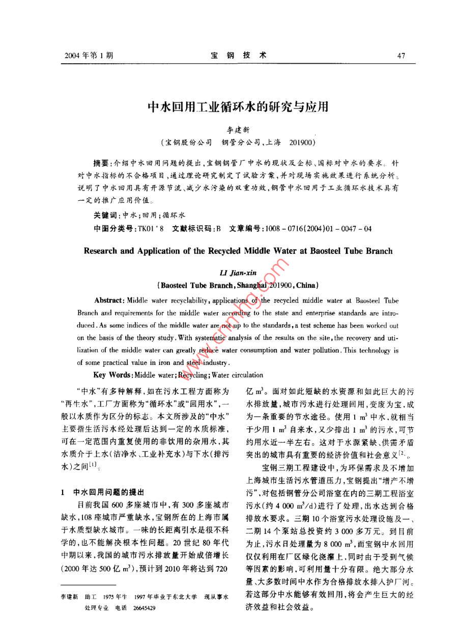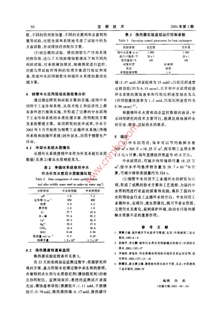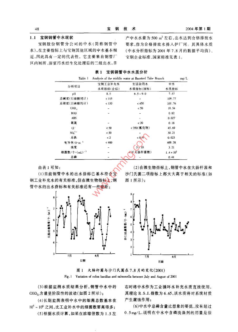 004年第1期47中水回用工業(yè)循環(huán)水的研究與應(yīng)用李建新寶鋼股份公司鋼管分公司,上海201900)摘要:介紹中水回用問題的提出,寶鋼鋼管廠中水的現(xiàn)狀及企標(biāo)、國標(biāo)對(duì)中水的要求。針對(duì)中水指標(biāo)的不合格項(xiàng)目,通過理論研究制定了試驗(yàn)方案,并對(duì)現(xiàn)場實(shí)施效果進(jìn)行系統(tǒng)分析說明了中水回用具有開源節(jié)流、減少水污染的雙重功效,鋼管中水回用于工業(yè)循環(huán)水技術(shù)具有一定的推廣應(yīng)用價(jià)值關(guān)鍵詞:中水;回用;循環(huán)水中圖分類號(hào):TK0l·8文獻(xiàn)標(biāo)識(shí)碼:B文章編號(hào):1008-0716(2004)01-0047-04Research and Application of the Recycled Middle Water at Baosteel Tube branchBaosteel Tube Branch, Shanghai 201900, ChinaAbstract: Middle waler recyclability, applications of the recycled middle water at Baosteel TubeBranch and requirements for the middle wuter according to the state and enterprise standards are intro-duced. As some indices of the middle water are not up lo the standards, a test scheme has been worked outon the basis of the theory study, with systematic analysis of the results on the site, the recovery andization of the middle watereatly reduce water consumption and water pollution. This lechnologyof some practical value in iron and steel industryKey Words: Middle water; Recycling: Water circulation中水”有多種解釋,如在污水工程方面稱為億m3。面對(duì)如此短缺的水資源和如此巨大的污再生水”,工廠方面稱為“循環(huán)水”或“回用水”,水排放量,城市污水進(jìn)行處理回用,變廢為寶,成般以水質(zhì)作為區(qū)分的標(biāo)志。本文所涉及的“中水”為一條重要的節(jié)水途徑。使用1m3中水,就相當(dāng)主要指生活污水經(jīng)處理后達(dá)到一定的水質(zhì)標(biāo)準(zhǔn),于少用1m3自來水,又少排出1m3的污水,可節(jié)可在一定范圍內(nèi)重復(fù)使用的非飲用的雜用水,其約用水近一半左右。這對(duì)于水源緊缺、供需矛盾水質(zhì)介于上水(潔凈水、工業(yè)補(bǔ)充水)與下水(排污突出的城市具有重要的經(jīng)濟(jì)價(jià)值和社會(huì)意義2水)之間寶鋼三期工程建設(shè)中,為環(huán)保需求及不增加上海城市生活污水管道壓力,寶鋼提出“增產(chǎn)不增1中水回用問題的提出污”,對(duì)包括鋼管分公司浴室在內(nèi)的三期工程浴室目前我國600多座城市中,有300多座城市污水(約4000m3/d)進(jìn)行了處理,出水達(dá)到合格缺水,108座城市嚴(yán)重缺水,寶鋼所在的上海市屬排放水要求。三期10個(gè)浴室污水處理設(shè)施及于水質(zhì)型缺水城市。一味的長距離引水是很不科二期14個(gè)泵站總投資約3000多萬元。到目前學(xué)的,也不能解決根本性問題。20世紀(jì)80年代為止,污水日處理量為80m3,而寶鋼中水回用中期以來我國的城市污水排放量開始成倍增長僅僅利用在廠區(qū)綠化澆灌上,同時(shí)由于受到氣候(2000年達(dá)500億m3),預(yù)計(jì)到2010年將達(dá)到720等因素的影響,可利用量十分有限。絕大部分水量、大多數(shù)時(shí)間中水作為合格排放水排入護(hù)廠河。李建新助工1975年生199年畢業(yè)于東北大學(xué)現(xiàn)從事水若這部分中水能夠有效回用將會(huì)產(chǎn)生巨大的經(jīng)處理專業(yè)電話26645429濟(jì)效益和社會(huì)效益。寶鋼技2004年第1期11寶鋼鋼管中水現(xiàn)狀產(chǎn)中水水量為500m3左右,出水達(dá)到合格排放水寶鋼股份鋼管分公可的中水(簡稱鋼管中要求,作為合格排放水排入護(hù)廠河。其具體水質(zhì)水),在主要指標(biāo)上與寶鋼其他區(qū)域的中水基本相(中水分析指標(biāo)為2001年78月的數(shù)據(jù)平均值)近因此具有一定的代表性。它主要來自鋼管廠寶鋼企業(yè)標(biāo)準(zhǔn)、國家標(biāo)準(zhǔn)見表1區(qū)內(nèi)廁所、浴室污水經(jīng)生化處理后的二級(jí)出水,日表1寶鋼鋼管中水水質(zhì)分析分析項(xiàng)日寶鋼工業(yè)補(bǔ)允水生活雜用水水質(zhì)指標(biāo)(企標(biāo)木質(zhì)指標(biāo)(國標(biāo))水質(zhì)指標(biāo)總堿度(以碳酸鈣計(jì))18.54<350(氰化物)300.023電導(dǎo)率/Sm5-10細(xì)菌數(shù)/個(gè)·(mL)