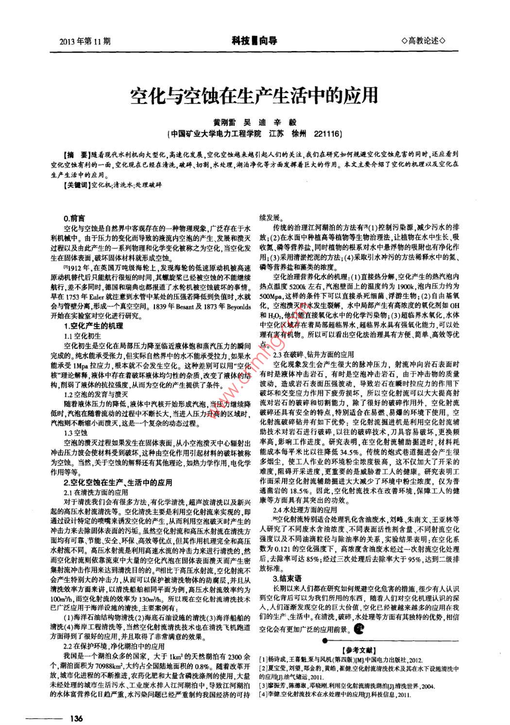 2013年第11期科技國向?qū)А蟾呓陶撌觥罂栈c空蝕在生產(chǎn)生活中的應(yīng)用黃剛雷吳迪辛毅(中國礦業(yè)大學(xué)電力工程學(xué)院江蘇徐州22116【摘要】隨看現(xiàn)代水利機(jī)向大型化,高速化發(fā)展,空化空蝕越來越引起人們的關(guān)注,我們在研究如何規(guī)避空化空蝕危害的同時,還應(yīng)看到化空蝕有利的一面,空化現(xiàn)在已經(jīng)在清洗,破碎、切割水處理湖泊凈化等方面發(fā)揮著巨大的作用。本文主要介紹了空化的機(jī)理以及空化在生產(chǎn)生活中的應(yīng)用。關(guān)鍵詞】空化機(jī);清洗水處理破碎0前言續(xù)發(fā)展??栈c空蝕是自然界中客觀存在的一種物理現(xiàn)象廣泛存在于水傳統(tǒng)的治理江河湖泊的方法有(1)控制污染源減少污水的排利機(jī)械中。由于壓力的變化而導(dǎo)致的液流內(nèi)空泡的產(chǎn)生發(fā)展和潰滅放(2)在水面中種植高等植物等生物治理法讓植物在水中生長、吸過程以及由此產(chǎn)生的一系列物理和化學(xué)變化被稱之為空化當(dāng)空化發(fā)收氮磷等營養(yǎng)鹽同時植物的根系對水中懸浮物的吸附也有凈化作生在固體表面破壞固體材料就形成空蝕用;(3)采用清淤挖泥的方法;(4)采取引水沖污的方法稀釋水中的氮、1912年,在英國萬噸級海輪上,發(fā)現(xiàn)海輪的低速原動機(jī)被高速磷等營養(yǎng)鹽和藻類的濃度。原動機(jī)替代后只能航行很短的時間,其螺旋槳已經(jīng)被空蝕的不能繼續(xù)空化治理營養(yǎng)化水的機(jī)理:(1)直接熱分解,空化產(chǎn)生的熱汽泡內(nèi)航行差不多同時德國和瑞典也都報道了水輪機(jī)被空蝕破壞的事情。熱點(diǎn)溫度5200k左右汽泡壁面上的溫度約為190k,.泡內(nèi)壓力約為早在1753年 Euler就注意到水管中某處的壓強(qiáng)若降低到負(fù)值時,水就500Mp,這樣的條件下可以直接殺死細(xì)菌、浮游生物;(2)自由基氧會與管壁分離形成一個真空空間。1839年 Besant及1873年 Beyond化,空泡潰滅時水發(fā)生裂解,水中局部產(chǎn)生有高濃度的氧化劑如oH開始在實(shí)驗(yàn)室對空化進(jìn)行研究。和HO2,他們能直接氧化水中的化學(xué)污染物;(3)超臨界水氧化,水體1空化產(chǎn)生的機(jī)理中空化區(qū)域存在著局部超臨界水超臨界水具有強(qiáng)氧化能力可以處空化初生理有害有機(jī)物。所以可以看出空化法治理具有方便、簡單、高效等優(yōu)空化初生是空化在局部壓力降至臨近液體飽和蒸汽壓力的瞬間點(diǎn)。完成的。純水能承受張力但實(shí)際自然界中的水不能承受拉力如果水23在破碎、鉆井方面的應(yīng)用能承受1Mpa拉應(yīng)力,根本就不會發(fā)生空化。這種差別可以用“空化空化現(xiàn)象發(fā)生會產(chǎn)生很大的脈沖壓力,射流沖向巖石表面時核“理論解釋液體中存在著破壞液體均勻性的雜質(zhì)改變了液體的結(jié)有時是液體沖擊巖石,有時是空泡沖擊巖石,由于沖擊物的質(zhì)量構(gòu)削弱了液體的抗拉強(qiáng)度從而為空化的產(chǎn)生提供了條件。波動,造成巖石表面壓強(qiáng)波動,導(dǎo)致巖石在瞬時拉應(yīng)力的作用下12空泡的發(fā)育與漬滅破壞和交變應(yīng)力作用下疲勞損壞,所以空化射流可以大大提高射隨著液體壓力的降低液體中汽核開始形成汽泡,當(dāng)壓力繼續(xù)降流對巖石的破碎和切割能力,除了很好的破碎作用外,空化射流低時汽泡在隨著流動的過程中不斷長大當(dāng)進(jìn)入壓力升高的區(qū)域時,破碎還具有安全的特點(diǎn)特別適合在易燃、易爆的環(huán)境下使用??掌輨t不斷縮小面潰滅,這是一個復(fù)雜的動態(tài)過程化射流破碎鉆井有如下優(yōu)勢:空化射流據(jù)進(jìn)機(jī)是利用空化射流輔13空蝕助技術(shù)對巖石進(jìn)行破碎,以往的破碎技術(shù),刀具容易破壞,更換頻空泡的潰滅過程如果發(fā)生在固體表面從小空泡潰滅中心輻射出率高影響工作進(jìn)度。研究表明,在空化射流輔助掘進(jìn)時,材料耗沖擊壓力波會使材料受到破壞,這種由空化作用引起材料的破壞被稱能成本每平米比以往降低34.5%。傳統(tǒng)的炮式巷道掘進(jìn)會產(chǎn)生很為空蝕。當(dāng)然關(guān)于空蝕的解釋還有其他理論如熱力學(xué)作用電化學(xué)多煙塵,使工人作業(yè)的環(huán)境粉塵濃度極高,這不僅加大了開采的作用等等。難度,阻礙開采進(jìn)度,更重要的是威脅著工人的健康。研究表明工2空化空蝕在生產(chǎn)、生活中的應(yīng)用作面采用空化射流輔助掘進(jìn)大大減少了環(huán)境中粉塵濃度,僅為普21在清洗方面的應(yīng)用通鑿巖的18.5%。因此,空化射流技術(shù)在改善環(huán)境,保障工人的健對于清洗我們會有很多方法有化學(xué)清洗,超聲波清洗以及新興康等方面具有其突出的功效起的高壓水射流清洗等??栈逑粗饕抢每栈淞鱽韺?shí)現(xiàn)的,即24水處理方面的應(yīng)用通過設(shè)計特定的噴嘴來誘發(fā)空化的產(chǎn)生從而利用空泡破滅時產(chǎn)生的空化射流特別適合處理乳化含油廢水劉峰、朱南文、王亞林等沖擊力來去除固體表面的污垢。雖然空化射流和高壓水射流在清洗方人研究了不同廢水含油濃度、不同表面活性劑含量、不同射流空化面均有可靠、節(jié)能安全環(huán)保高效等優(yōu)點(diǎn)但其作用機(jī)理完全和高壓強(qiáng)度以及不同油滴粒徑與除油率的