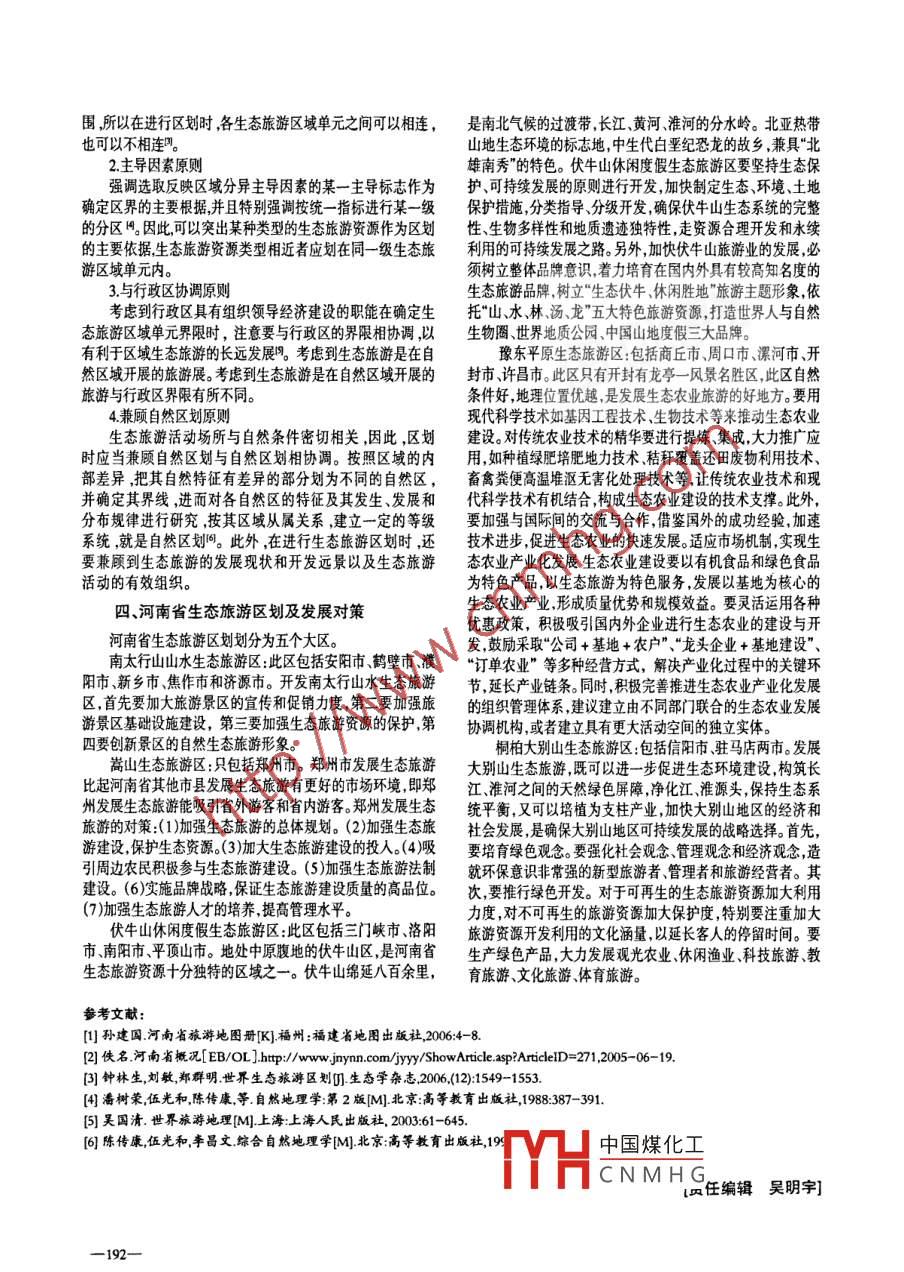 2008年第11期經(jīng)濟研究導(dǎo)刊N0.11,2008總第30期ECONOMIC RESEARCH CUIDESerial No.30河南省生態(tài)旅游區(qū)劃研究毛道云(河南師范大學(xué)社會發(fā)展學(xué)院,河南新鄉(xiāng)453007)摘要:生態(tài)旅游的建設(shè)水平代表著一個地區(qū)社會文明及發(fā)展進(jìn)步水平,體現(xiàn)著經(jīng)濟社會可持續(xù)發(fā)展和人與自然和諧發(fā)展的程度。建設(shè)生態(tài)旅游,開展生態(tài)旅游,能有效地保護(hù)生態(tài)環(huán)境。建設(shè)生態(tài)旅游是我們轉(zhuǎn)變觀念、深化改革,利用自身資源為社會提供高質(zhì)量的旅游環(huán)境所進(jìn)行的立體開發(fā)、綜合利用的優(yōu)勢項目,使人們對生態(tài)建設(shè)與人類關(guān)系認(rèn)識的深化,也是全面發(fā)揮生態(tài)多種效益的一項重要舉措和一項系統(tǒng)工程。關(guān)鍵詞:生態(tài)旅游;區(qū)劃;河南省中圖分類號:F590.7文獻(xiàn)標(biāo)志碼:A 文章 編號:1673-291(2008)011-0191-02太行山及伏牛山東側(cè)向潮土過渡地區(qū)的油黃土等,都是褐土一、河南省生態(tài)旅游環(huán)境的總體特征類的土屬。由秦嶺人河南段(靈寶南部起,東到嵩山、東南到1.河南省地質(zhì)、地貌特點方城北,熊耳山、嵩山和伏牛山二支層疊的中山山地,太行山河南省位于黃河中下游,中國地勢第二階梯和第三階梯的中山山地均分布著棕壤。豫西低山與丘陵的南坡和大別山的過渡地帶。地形總體特征西高東低,高差懸殊,地貌類型復(fù)北坡,或稱坡積侵蝕緩崗坡地,發(fā)育有黃棕壤。是河南亞熱帶雜多樣。北、西南三面由太行山、伏牛山、桐柏山和大別山環(huán)林木,特別是茶葉、油桐等經(jīng)濟林木的適宜土壤”。抱,山間有丘陵和陷落盆地,中部和東部為豫東平原,西南部二、河南省生態(tài)旅游資源空間分布特征:廣泛為南陽盆地”。分布、相對集中2.河南省氣候特點河南省大部分地處暖溫帶,南部跨亞熱帶,其氣候具有明河南省國家森林公園4處,分別是甘山國家森林公園,顯的過渡性特征:伏牛山淮河干流以南屬亞熱帶濕潤半濕潤亞武山國家森林公園,寺山國家森林公園,南灣國家森林公氣候區(qū),以北屬暖溫帶半濕潤半干旱氣候區(qū)。全省年平均氣溫園。自然保護(hù)區(qū)13處,分別是毛樓生態(tài)旅游區(qū)、白天鵝濕地、12.8C ~ 15.5C,年均降水量為600mm ~ 800mm,降雨以八九黃河故道濕地、西泰山、龍池曼、木札嶺龍峪灣、白云山、老月份最多。雨熱同期,四季分明,對農(nóng)作物生長極為有利。界嶺森林生態(tài)旅游區(qū)、龍?zhí)稖献匀簧鷳B(tài)旅游區(qū)、寶天曼自然3.河南省水文特點保護(hù)區(qū)石漫灘董寨鳥類自然保護(hù)區(qū)。河南省風(fēng)景名勝區(qū)有河南省地處南北氣候、山區(qū)到平原的過渡地帶,橫跨長紅旗渠、太行大峽谷云夢山、大坯山、百泉、云臺山、青天河、江、淮河、黃河海河四大流域,總面積16.7萬km',降水量南神農(nóng)山五龍口、九里溝王屋山、黃河風(fēng)景區(qū)、龍亭、環(huán)翠峪、多北少。浮戲山雪花洞嵩山龍門石窟、青要山、大壩風(fēng)景區(qū)雞冠4.河南省生物特點洞、石人山昭平湖丹江、銅山湖.嵖岈山、薄山湖淮潭、靈河南省境內(nèi)動植物資源也很豐富,植物種類據(jù)不完全統(tǒng)山、雞公山、青龍峽、九龍溝。計就多達(dá)1 700余種,僅陸棲脊椎動物資源就達(dá)400種以上。從上述河南省自然保護(hù)區(qū)、國家森林公園、河南省風(fēng)景5.河南省土壤特點名勝區(qū)分布可以看出,生態(tài)旅游資源空間分布上具有廣泛分河南的土壤大類型有黃棕壤、棕壤褐土、潮土、沙漿黑布相對集中的特點。其中只有周口市、漯河市、許昌市、商丘土鹽堿土和水稻土七種。京線以東,沙潁河以北的廣大市沒有生態(tài)資源的分布,其他市都有生態(tài)資源的分布。而這些黃河海河沖積平原,是河南分布面積最大的潮土區(qū),山丘區(qū)生態(tài)資源又集中分布在南太行山伏牛山、大別山等區(qū)內(nèi)部。較大河流的河灘地一般也是潮土分布區(qū)。沙穎河以南的淮三、河南省生態(tài)旅游地分區(qū)原則北平原和南陽盆地唐、白河兩岸的南陽、唐河、新野、鄧州等是沙漿黑土分布區(qū)。黃河兩岸的新鄉(xiāng)、商丘、開封、濮陽等四.綜合分析原則地區(qū)的部分縣是鹽堿土的分布區(qū)。淮河以南的洪積傾斜平強調(diào)在進(jìn)行某- -級區(qū)劃時,必須全面考慮構(gòu)成環(huán)境的各原,淮河北岸的淮濱、息縣、正陽及省境內(nèi)的唐、百合下段河組成成分和其本身綜合特征的相似和差別.挑選具有互相聯(lián)流兩側(cè)等地區(qū)有水稻土的分布。豫西的黃土丘陵的白土階地系的指中國煤化工旅游發(fā)展水平很低,和緩丘上中部的立黃土、低山丘陵區(qū)位置較高處的紅黏土、或暫時或,就不列人區(qū)劃范MHCNMHG收稿日期:2008-03- -16作者簡介:毛道云(1976-),女,安徽霍人,碩士研究生,從事旅游規(guī)劃研究。一191-圍所以在進(jìn)行區(qū)劃時,各生態(tài)旅游區(qū)域單元之間可以相連,是南北氣候的過渡帶,長江、黃河、淮河的分水嶺。北亞熱帶也可以不相連。山地生態(tài)環(huán)境的標(biāo)志地,中生代白堊紀(jì)恐龍的故鄉(xiāng),兼具“北2.主導(dǎo)因素原則雄南秀”的特色。伏牛山休閑度假生態(tài)旅游區(qū)要堅持生態(tài