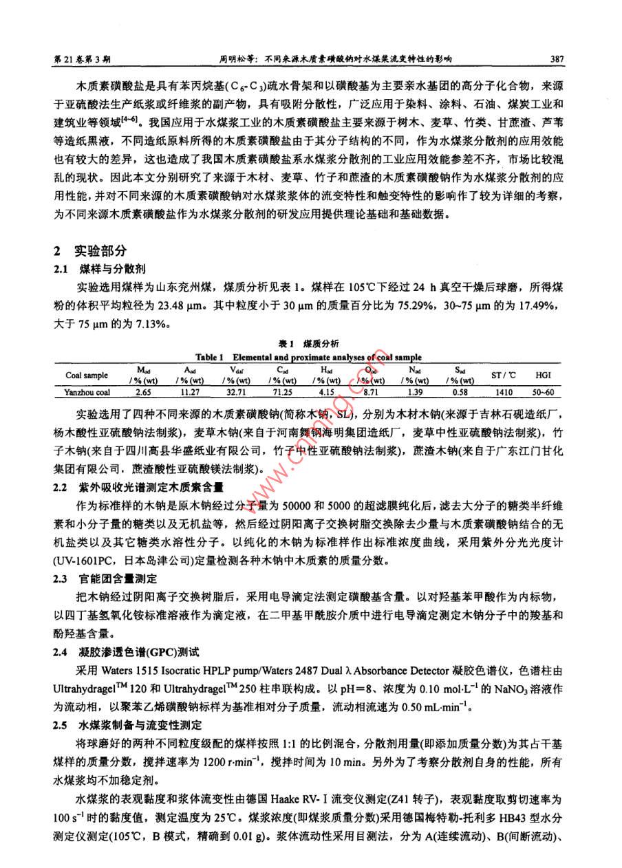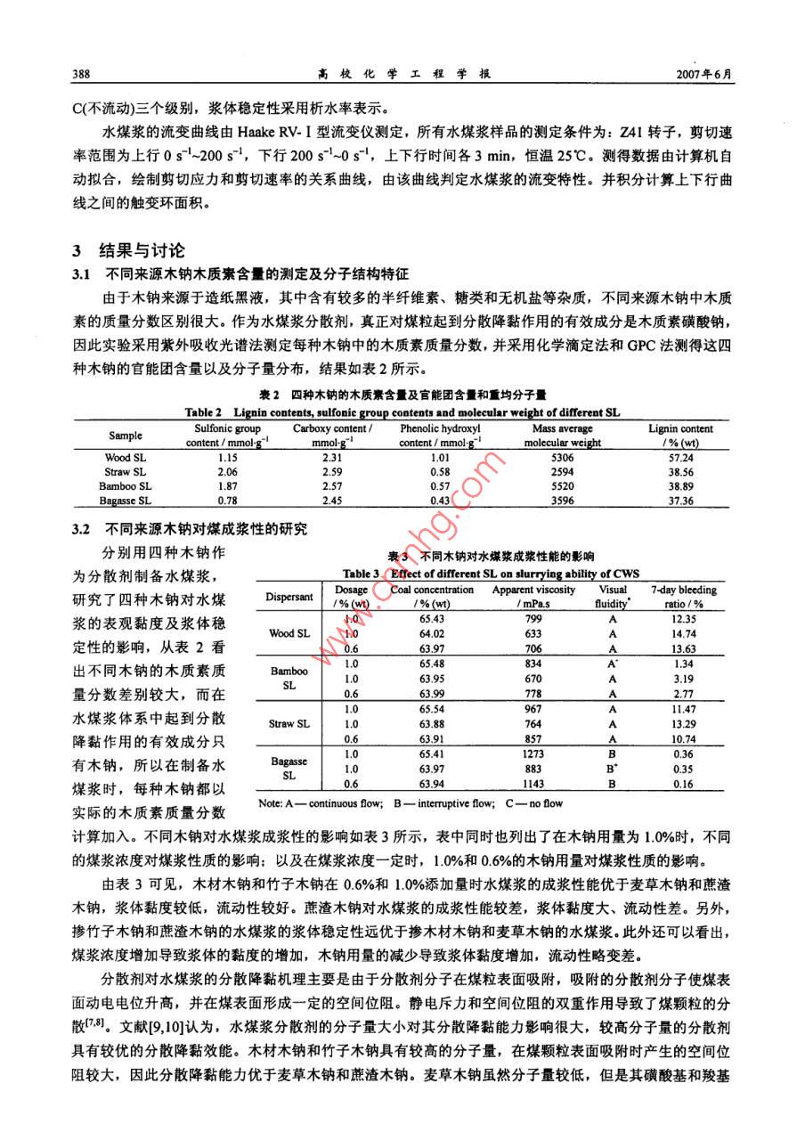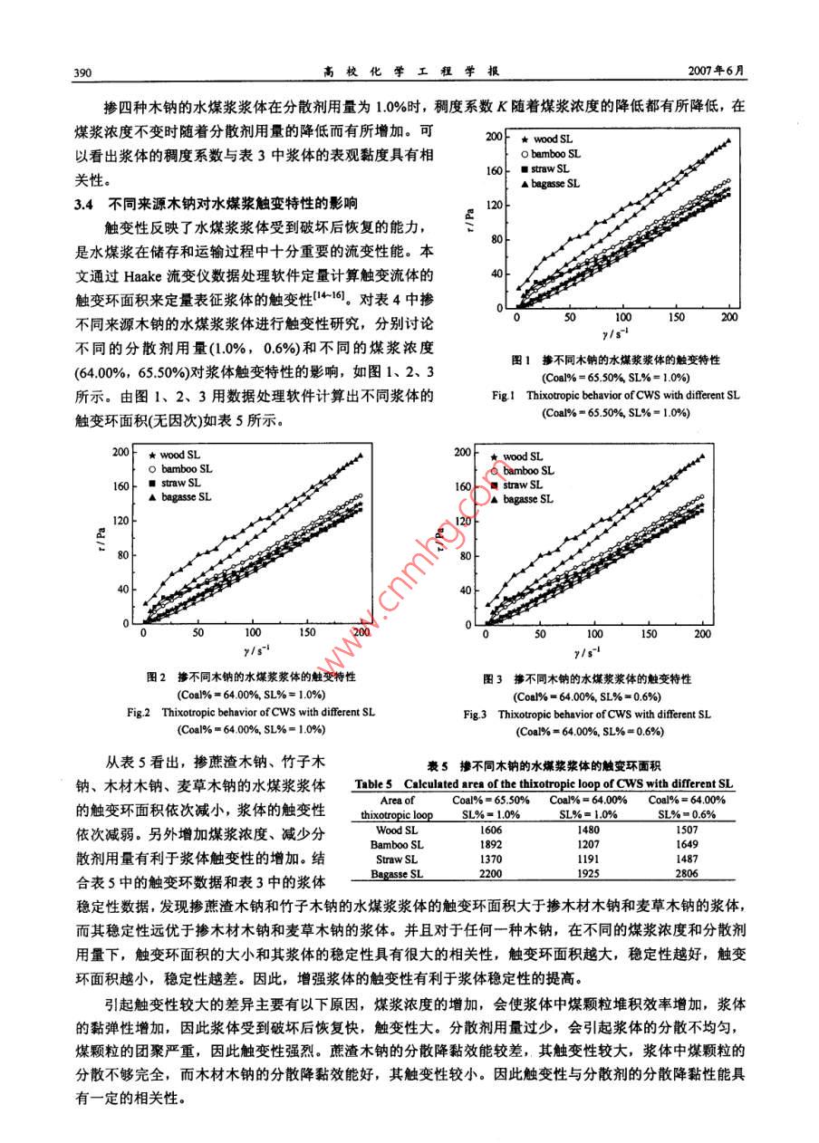第21巒第3期高?;瘜W(xué)工程學(xué)報No. 3 VoL 212007年6月of Chemical Engineering of Chinese Universities文章編號:1003-9015(2007)030386-06不同來源木質(zhì)素磺酸鈉對水煤漿流變特性的影響周明松12,楊東杰12,邱學(xué)青12(1.華南理工大學(xué)化工與能源學(xué)院,廣東廣州510640;2.華南理工大學(xué)廣東省綠色化學(xué)產(chǎn)品技術(shù)重點實驗室,廣東廣州510640)摘要:針對木質(zhì)素磺酸鹽結(jié)構(gòu)復(fù)雜,用作水煤漿分散劑性能差異較大的特點,分別研究了來源于木材、麥草、竹子和蔗渣造紙黑液的木質(zhì)素磺酸鈉作為水煤漿分散劑的性能,結(jié)果發(fā)現(xiàn)木材和竹子木質(zhì)素磺酸鈉的分子量較高,對水煤漿的分散降黏性能優(yōu)于麥草和蔗渣木質(zhì)素磺酸鈉。采用流變儀測試水煤漿的流變性,用 Herschel-Bulkley模型對不同漿體的流變曲線進(jìn)行擬合,發(fā)現(xiàn)摻竹子和蔗渣木質(zhì)素磺酸鈉的水煤漿漿體的假塑性較強(qiáng),觸變環(huán)面積較大,漿體的穩(wěn)定性較優(yōu):而摻木材和麥草木質(zhì)素磺酸鈉的水煤漿漿體多表現(xiàn)出輕微的脹塑性特征,觸變環(huán)面積較小,穩(wěn)定性較差關(guān)健詞:木質(zhì)素磺酸鈉;水煤漿;流變特性;流變模型;觸變環(huán)中圖分類號:TQ42334;Q5361文獻(xiàn)標(biāo)識碼:AEffect of the Sodium Lignosulphonate from Different Materialon Rheological Behavior of Coal Water SlurryZHOU Ming-song", YANG Dong-jie 2, QIU Xue-qing.2(ISchool of Chemical and Energy Engineering; 2. Guangdong Provincial Laboratory of Green ChemicalTechnology, South China University of Technology, Guangzhou 510640, China)Abstract: The sodium lignosulphonate (SL) of the black liquor originated separately from wood, straw,bamboo and bagasse were used as dispersant for coal water slurry (CWS), and the influences of the complexmolecular structure of sl on the viscosity-reducing ability, the rheological behavior and thixotropy of cwswere studied. The Haake rheometer was used to measure the rheological properties, and the rheological datathe shear-stress/shear rate data of each CwS prepared with different SL were fitted by using the three-parameterHerschel-Bulkley model. Moreover, the thixotropy loop areaculated to characterize the thixotropy ofCwS. The results show that the CwS prepared with bamboo or bagasse SL exhibits evidently pseudoplasticharacteristic, stronger thixotropy and better stability. However, the Cws prepared with wood or straw SLshows slightly dilatant characteristic, weaker thixotropy and worse stability. Furthermore, the difference ofrheological properties of CwS is associated with the molecular weight and the functional groups content of theused SLKey words: sodium lignosulphonate(SL); coal water slurry(CWS); rheological behavior rheological modelthixotropy loop1前言水煤漿(CWS)是煤與水的非均相液固懸浮液,屬于非牛頓流體。水煤漿流變學(xué)著重研究流變屬性流變參數(shù)、流動性和觸變性等內(nèi)容,這些特性影響著水煤漿的配制、儲存、運輸以及霧化燃燒3,研究水煤漿的流變學(xué)特性對水煤漿的工業(yè)應(yīng)用具有重要意義。收稿日期修訂日期基盒項目:學(xué)基金(20276024)廣東省自然科學(xué)重點基金(5103536):廣州市科技攻關(guān)項目(200523D0161)作者簡介0-),男,河南信陽人,華南理工大學(xué)博士生通訊聯(lián)系人:邱學(xué)青, E-mall cexqgiu@ cut. edu.en第21卷第3期周明松等:不同來源木質(zhì)素磺酸鈉對水煤菜流變特性的影響木質(zhì)素磺酸鹽是具有苯丙烷基(C6C)疏水骨架和以磺酸基為主要親水基團(tuán)的高分子化合物,來源于亞硫酸法生產(chǎn)紙漿或纖維漿的副產(chǎn)物,具有吸附分散性,廣泛應(yīng)用于染料、涂料、石油、煤炭工業(yè)和建筑業(yè)等領(lǐng)域46。我國應(yīng)用于水煤漿工業(yè)的木質(zhì)素磺酸鹽主要來源于樹木、麥草、竹類、甘蔗渣、蘆葦?shù)仍旒埡谝?不同造紙原料所得的木質(zhì)素磺酸鹽由于其分子結(jié)構(gòu)的不同,作為水煤漿分散劑的應(yīng)用效能也有較大的差異,這也造成了我國木質(zhì)素磺酸鹽系水煤漿分散劑的工業(yè)應(yīng)用效能參差不齊,市場比較混亂的現(xiàn)狀。因此本文分別研究了來源于木材、麥草、竹子和蔗渣的木質(zhì)素磺酸鈉作為水煤漿分散劑的應(yīng)用性能,并對不同來源的木質(zhì)素磺酸鈉對水煤漿漿體的流變特性和觸變特性的影響作了較為詳細(xì)的考察,為不同來源木質(zhì)素磺酸鹽作為水煤漿分散劑的研發(fā)應(yīng)用提供理論基礎(chǔ)和基礎(chǔ)數(shù)據(jù)2實驗部分21煤樣與分散劑實驗選用煤樣為山東兗州煤,煤質(zhì)分析見表1。煤樣在105℃下經(jīng)過24h真空干燥后球磨,所得煤粉的體積平均粒徑為2348μm。其中粒度小于30μm的質(zhì)量百分比為7529%,30-75um的為1749%,大于75μm的為713%1煤質(zhì)分析Table 1 Elemental and proximate analyses ofCoal samplesT/℃HGI%(w)/%(w/%(w)/%w)/%(wYanzhou coal1410實驗選用了四種不同來源的木質(zhì)素磺酸鈉(簡稱木鈉,SL),分別為木材木鈉(來源于吉林石硯造紙廠,楊木酸性亞硫酸鈉法制漿),麥草木鈉(來自于河南舞鋼海明集團(tuán)造紙廠,麥草中性亞硫酸鈉法制漿),竹子木鈉(來自于四川高縣華盛紙業(yè)有限公司,竹子中性亞硫酸鈉法制漿),蔗渣木鈉(來自于廣東江門甘化集團(tuán)有限公司,蔗渣酸性亞硫酸鎂法制漿)22紫外吸收光譜測定木質(zhì)素含量作為標(biāo)準(zhǔn)樣的木鈉是原木鈉經(jīng)過分子量為50000和5000的超濾膜純化后,濾去大分子的糖