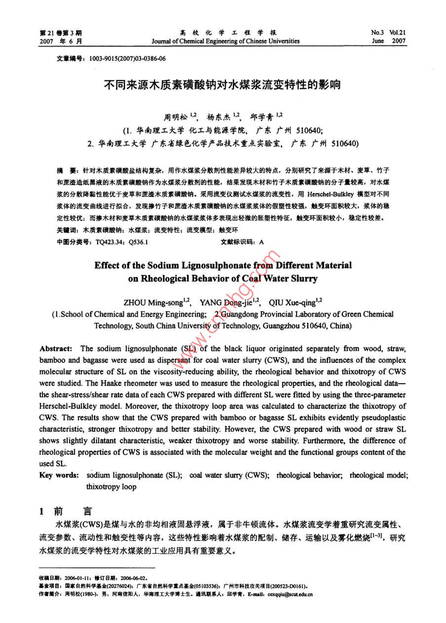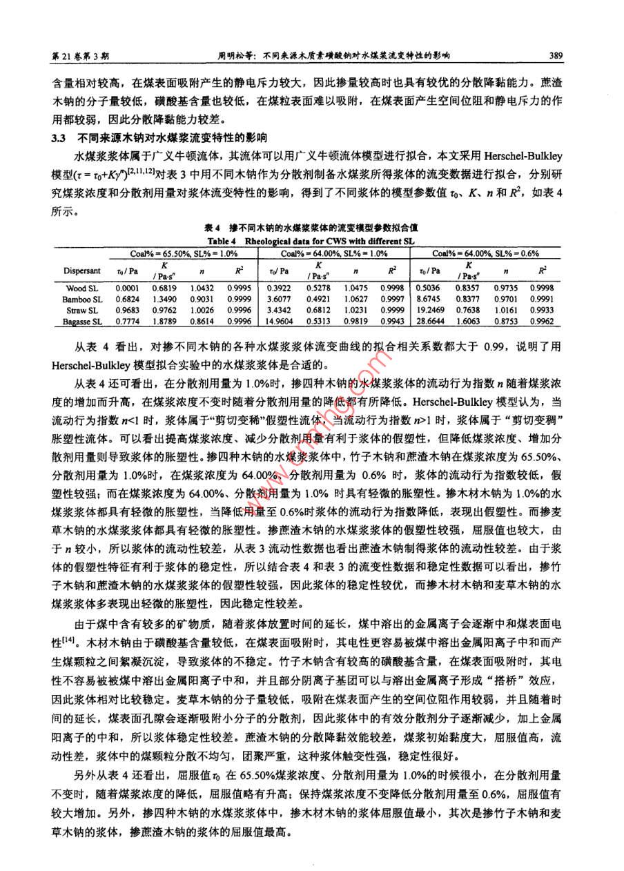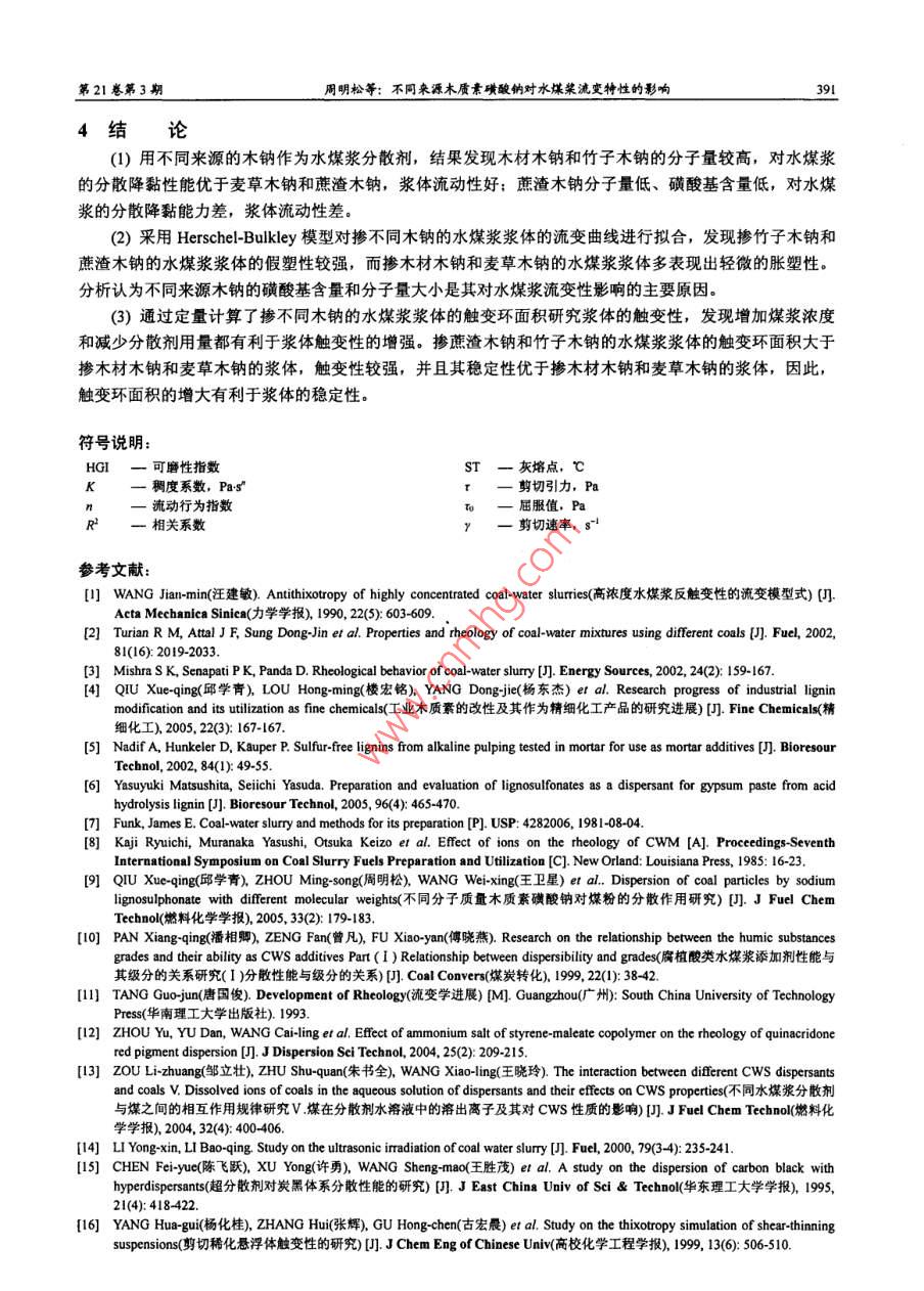 第21巒第3期高?;瘜W(xué)工程學(xué)報No. 3 VoL 212007年6月of Chemical Engineering of Chinese Universities文章編號:1003-9015(2007)030386-06不同來源木質(zhì)素磺酸鈉對水煤漿流變特性的影響周明松12,楊東杰12,邱學(xué)青12(1.華南理工大學(xué)化工與能源學(xué)院,廣東廣州510640;2.華南理工大學(xué)廣東省綠色化學(xué)產(chǎn)品技術(shù)重點實驗室,廣東廣州510640)摘要:針對木質(zhì)素磺酸鹽結(jié)構(gòu)復(fù)雜,用作水煤漿分散劑性能差異較大的特點,分別研究了來源于木材、麥草、竹子和蔗渣造紙黑液的木質(zhì)素磺酸鈉作為水煤漿分散劑的性能,結(jié)果發(fā)現(xiàn)木材和竹子木質(zhì)素磺酸鈉的分子量較高,對水煤漿的分散降黏性能優(yōu)于麥草和蔗渣木質(zhì)素磺酸鈉。采用流變儀測試水煤漿的流變性,用 Herschel-Bulkley模型對不同漿體的流變曲線進(jìn)行擬合,發(fā)現(xiàn)摻竹子和蔗渣木質(zhì)素磺酸鈉的水煤漿漿體的假塑性較強(qiáng),觸變環(huán)面積較大,漿體的穩(wěn)定性較優(yōu):而摻木材和麥草木質(zhì)素磺酸鈉的水煤漿漿體多表現(xiàn)出輕微的脹塑性特征,觸變環(huán)面積較小,穩(wěn)定性較差關(guān)健詞:木質(zhì)素磺酸鈉;水煤漿;流變特性;流變模型;觸變環(huán)中圖分類號:TQ42334;Q5361文獻(xiàn)標(biāo)識碼:AEffect of the Sodium Lignosulphonate from Different Materialon Rheological Behavior of Coal Water SlurryZHOU Ming-song", YANG Dong-jie 2, QIU Xue-qing.2(ISchool of Chemical and Energy Engineering; 2. Guangdong Provincial Laboratory of Green ChemicalTechnology, South China University of Technology, Guangzhou 510640, China)Abstract: The sodium lignosulphonate (SL) of the black liquor originated separately from wood, straw,bamboo and bagasse were used as dispersant for coal water slurry (CWS), and the influences of the complexmolecular structure of sl on the viscosity-reducing ability, the rheological behavior and thixotropy of cwswere studied. The Haake rheometer was used to measure the rheological properties, and the rheological datathe shear-stress/shear rate data of each CwS prepared with different SL were fitted by using the three-parameterHerschel-Bulkley model. Moreover, the thixotropy loop areaculated to characterize the thixotropy ofCwS. The results show that the CwS prepared with bamboo or bagasse SL exhibits evidently pseudoplasticharacteristic, stronger thixotropy and better stability. However, the Cws prepared with wood or straw SLshows slightly dilatant characteristic, weaker thixotropy and worse stability. Furthermore, the difference ofrheological properties of CwS is associated with the molecular weight and the functional groups content of theused SLKey words: sodium lignosulphonate(SL); coal water slurry(CWS); rheological behavior rheological modelthixotropy loop1前言水煤漿(CWS)是煤與水的非均相液固懸浮液,屬于非牛頓流體。水煤漿流變學(xué)著重研究流變屬性流變參數(shù)、流動性和觸變性等內(nèi)容,這些特性影響著水煤漿的配制、儲存、運輸以及霧化燃燒3,研究水煤漿的流變學(xué)特性對水煤漿的工業(yè)應(yīng)用具有重要意義。收稿日期修訂日期基盒項目:學(xué)基金(20276024)廣東省自然科學(xué)重點基金(5103536):廣州市科技攻關(guān)項目(200523D0161)作者簡介0-),男,河南信陽人,華南理工大學(xué)博士生通訊聯(lián)系人:邱學(xué)青, E-mall cexqgiu@ cut. edu.en第21卷第3期周明松等:不同來源木質(zhì)素磺酸鈉對水煤菜流變特性的影響木質(zhì)素磺酸鹽是具有苯丙烷基(C6C)疏水骨架和以磺酸基為主要親水基團(tuán)的高分子化合物,來源于亞硫酸法生產(chǎn)紙漿或纖維漿的副產(chǎn)物,具有吸附分散性,廣泛應(yīng)用于染料、涂料、石油、煤炭工業(yè)和建筑業(yè)等領(lǐng)域46。我國應(yīng)用于水煤漿工業(yè)的木質(zhì)素磺酸鹽主要來源于樹木、麥草、竹類、甘蔗渣、蘆葦?shù)仍旒埡谝?不同造紙原料所得的木質(zhì)素磺酸鹽由于其分子結(jié)構(gòu)的不同,作為水煤漿分散劑的應(yīng)用效能也有較大的差異,這也造成了我國木質(zhì)素磺酸鹽系水煤漿分散劑的工業(yè)應(yīng)用效能參差不齊,市場比較混亂的現(xiàn)狀。因此本文分別研究了來源于木材、麥草、竹子和蔗渣的木質(zhì)素磺酸鈉作為水煤漿分散劑的應(yīng)用性能,并對不同來源的木質(zhì)素磺酸鈉對水煤漿漿體的流變特性和觸變特性的影響作了較為詳細(xì)的考察,為不同來源木質(zhì)素磺酸鹽作為水煤漿分散劑的研發(fā)應(yīng)用提供理論基礎(chǔ)和基礎(chǔ)數(shù)據(jù)2實驗部分21煤樣與分散劑實驗選用煤樣為山東兗州煤,煤質(zhì)分析見表1。煤樣在105℃下經(jīng)過24h真空干燥后球磨,所得煤粉的體積平均粒徑為2348μm。其中粒度小于30μm的質(zhì)量百分比為7529%,30-75um的為1749%,大于75μm的為713%1煤質(zhì)分析Table 1 Elemental and proximate analyses ofCoal samplesT/℃HGI%(w)/%(w/%(w)/%w)/%(wYanzhou coal1410實驗選用了四種不同來源的木質(zhì)素磺酸鈉(簡稱木鈉,SL),分別為木材木鈉(來源于吉林石硯造紙廠,楊木酸性亞硫酸鈉法制漿),麥草木鈉(來自于河南舞鋼海明集團(tuán)造紙廠,麥草中性亞硫酸鈉法制漿),竹子木鈉(來自于四川高縣華盛紙業(yè)有限公司,竹子中性亞硫酸鈉法制漿),蔗渣木鈉(來自于廣東江門甘化集團(tuán)有限公司,蔗渣酸性亞硫酸鎂法制漿)22紫外吸收光譜測定木質(zhì)素含量作為標(biāo)準(zhǔn)樣的木鈉是原木鈉經(jīng)過分子量為50000和5000的超濾膜純化后,濾去大分子的糖