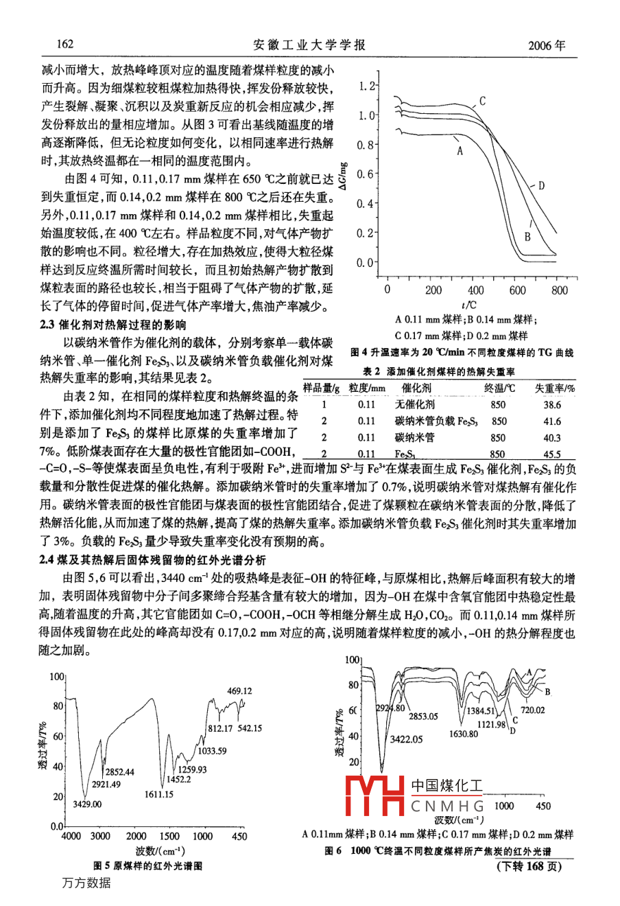 Vol 23 No. 2安徽工業(yè)大學學報第23卷第2期April 2006J of Anhui University of Technology2006年4月文章編號:1671-7872(2006)02-0160-03義馬煤的熱解及產(chǎn)物分布的研究駱艷華,崔平,胡潤橋(安徽工業(yè)大學化學與化工學院,安徼馬鞍山243002)摘要利用DTA,TG與紅外光譜對義馬煤的熱解行為進行研究??疾炝松郎厮俾蕵悠妨6纫约按呋瘎┑纫蛩貙αx馬煤熱解的影響。結(jié)果表明隨著升溫速率的提高熱滯現(xiàn)象明顯,熱解的總產(chǎn)氣量也隨之增多;粒度越小熱解速率越大;FeS3在熱解過程中的催化作用較明顯,可使煤的熱解失重率提高7%;熱解過程中有機質(zhì)發(fā)生裂解、縮聚等反應(yīng)導(dǎo)致義馬煤熱解后所得固體殘留物中羥基有較明顯的增加,而脂肪基團、環(huán)烷烴基團含量明顯減少。關(guān)鍵詞煤熱解;紅外光譜;差熱分析中圖分類號:TQ531.9文獻標識碼:AResearch of Yima Coal Pyrolysis and Its Products'RangeLUO Yan-hua, CUI Ping, HU Run-qiao(School of Chemisty Chemical Engneering, Anhui University of Technology, Ma'anshan 243002, China)Abstract: The pyrolysis behaviors of Yima coal were studied by means of DTA, TG and FTIR spectrum. Theffects of heating rate and size of samples and catalyst on the coal pyrolysis were studied. Along with rising ofheating rate, the phynomenent of caloric-set is prolonged obviously and the gas production is increased; The sizeof sample is smaller, heating rate is quicker; FeS,'s catalysis in the coal pyrolysis is obvious, moreover it canmake the loss of weight ratio raise 7%. On the other hand, the results indicated that the hydroxide's contentresidue getting from Yima coal's pyrolysis increase obviously in the contrary, the content of hydrocarbon andcycloalkane decrease obviously, these appearance may be resulted from the organic substances cracking andpolymeKey words: coal pyrolysis; FTIR spectrum; DTA analysis引言煤的熱解是從煤直接獲得液體燃料和化工產(chǎn)品的一個重要途徑,是能源領(lǐng)域中的重要研究課題之一。研究煤的熱解過程可以為煤的有效燃燒以及煤的熱解化工生產(chǎn)提供技術(shù)指導(dǎo)。目前,關(guān)于熱解的研究大多仍用總揮發(fā)份模型,即由揮發(fā)份總失重表達煤的熱解行為。義馬煤具有煤化程度低、揮發(fā)份高、燃點低和焦油產(chǎn)率高等特點,適合作低溫熱解的原料。文中運用DTA與TG技術(shù)對義馬煤的煤質(zhì)及影響其熱解失重行為的因素進行研究。著重研究升溫速度、樣品粒度、催化劑等因素對義馬煤熱解的影響。同時運用紅外光譜對義馬煤中官能團的熱解行為進行分析。表1義馬煤的基本性質(zhì)1實驗G M /% Va% Ay%11煤樣4.8744.0149641.0實驗用煤樣性質(zhì)如表1。M空氣干燥基水份(w%)(u/%);G-粘結(jié)指數(shù)。TH中國煤化工;A。干燥基灰份CNMHG收稿日期:2005-06-15基金項目:安撒省教育廳自然科學基金項目(2004kj054-zd)作者簡介:駱艷華(1977-),女,河北故城人,碩士研究生,主要從事新型碳材料的研究。第2期駱艷華等:義馬煤的熱解及產(chǎn)物分布的研究1611.2試劑FeS3、碳納米管氮氣(純度為999913實驗儀器TGA-50型差熱天平、傅立葉紅外光譜分析儀14實驗方法選取粒度為02,0.17,014,011mm的煤樣分別于510,20,30℃/min的加熱速率在TGA-50型差熱天平中進行熱解試驗2結(jié)果與討論21加熱速率對熱解過程的影響02004006008001000以017mm的煤樣為例,由圖1可知,對于同一粒度1升溫速率為10/min;2升溫速率為20℃/mn煤樣而言,不同的升溫速率對DA曲線的影響趨勢基本3升溫速率為30/mn是相同的在120℃左右,有一個吸熱峰,是煤析出水份圖1粒度為017m煤樣不同升溫速率的DTA曲線和脫除吸附氣體的過程;在350400℃范圍內(nèi)出現(xiàn)放熱峰,屬于煤熱解的初始階段;在500-600℃范圍內(nèi),出現(xiàn)1.2個大的放熱峰,是煤的主要熱解階段,即煤發(fā)生解聚和分解釋放出大量的可燃氣體后,變成半焦的階段。DTA1.0曲線上3個明顯的熱效應(yīng)峰與熱解過程的3個主要階段是一致的,這與文獻3報道的結(jié)果一致。當升溫速率增大時,放熱峰、吸熱峰的位置向溫度升高的方向移動,即煤熱解各階段發(fā)生的反應(yīng)溫度將提高。即是文獻[2]中的熱滯現(xiàn)象。0由圖2可知,相同粒度煤樣以不同升溫速率進行熱解時,升溫速率的提高使得達到熱解終溫時失重量有較明顯降低。因為在較高的升溫速率下,煤結(jié)構(gòu)受到較強1升溫速率為10℃min;2升溫速率為20℃min;的熱力作用,煤大分子側(cè)鏈的斷裂和芳香稠環(huán)的破裂速3升溫速率為30vmin度加快,生成的CH急劇增加,而熱解產(chǎn)物的縮合相對圖2粒度為017mm煤樣不同升溫速率的TG曲線減弱,快速干餾時還使側(cè)鏈斷裂的深度加強;再者在快速加熱的條件下,揮發(fā)份從煤粒內(nèi)部釋放時,來不及進行裂解沉積和二次反應(yīng),因而揮發(fā)份釋放量增加即熱解的總氣量增大。由此可見,快速干餾可以獲得較多的氣、液25相產(chǎn)物,由于減弱了一次液相產(chǎn)物的二次裂解故干餾產(chǎn)物中氣體產(chǎn)率降低而焦油產(chǎn)率提高。從圖2還可得知隨著升溫速率的提高失重開始的號15曲線就會變成平臺升溫速率較高時失重曲線則出現(xiàn)彎0溫度向高溫區(qū)移動。升溫速率越低分解程度越大,失重怒曲。但并不是升溫速率快總是不利的,當樣品量很小時,快速升溫可以檢查出分解過程中形成的中間產(chǎn)物,慢速升溫則不能達到此目的。中國煤化工22煤樣粒度對煤熱解過程的影響CNMH8001000以20℃min的升