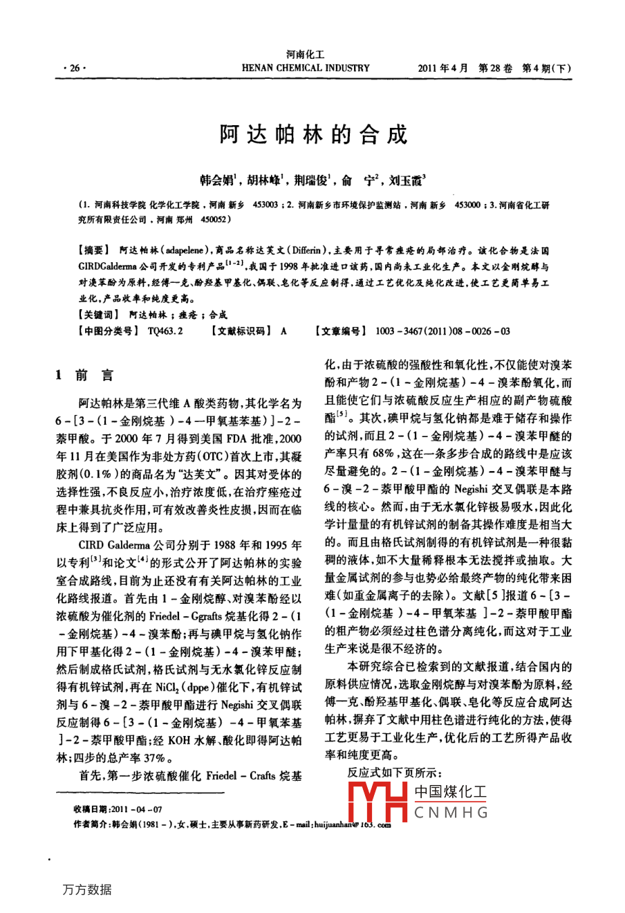 河南化工●26.HENAN CHEMICAL INDUSTRY2011年4月第28卷 第4期(下)阿達(dá)帕林的合成韓會娟' ,胡林峰',荊瑞俊',俞寧, 劉玉霞’(1. 河南科技學(xué)院化學(xué)化工學(xué)院,河南新鄉(xiāng)453003 :2.河南新鄉(xiāng)市環(huán)境保護(hù)監(jiān)測站.河南新鄉(xiāng)453000 ; 3.河南省化工研究所有限責(zé)任公司.河南鄭州450052)[摘要]阿達(dá) 帕林(adapelene),商品名稱達(dá)芙文(Diferin),主要用于尋常痤瘡的局部治療。該化合物是法國GIRDGalderma公司開發(fā)的專利產(chǎn)品1-2]。我國于1998年批準(zhǔn)進(jìn)口該藥,國內(nèi)尚未工業(yè)化生產(chǎn)。本文以金剛烷醇與.對渙苯酚為原料,經(jīng)傅一克酚羥基甲基化、偶聯(lián)、皂化等反應(yīng)制得,通過工藝優(yōu)化及純化改進(jìn),使工藝更簡單易工業(yè)化,產(chǎn)品收率和純度更高。[關(guān)鍵詞]阿達(dá)帕林;瘦瘡 ;合成[中圖分類號] TQ463.2 [文獻(xiàn)標(biāo)識碼] A[文章編號] 1003 -3467(2011 )08 -0026 -03化,由于濃硫酸的強酸性和氧化性,不僅能使對溴苯1前言酚和產(chǎn)物2-(1 -金剛烷基) -4-溴苯酚氧化,而阿達(dá)帕林是第三代維A酸類藥物,其化學(xué)名為且能使它們與濃硫酸反應(yīng)生產(chǎn)相應(yīng)的副產(chǎn)物硫酸6-[3-(1-金剛烷基)-4一甲氧基苯基)]-2-酯5。其次,碘甲烷與氫化鈉都是難于儲存和操作萘甲酸。于2000年7月得到美國FDA批準(zhǔn),2000的試劑,而且2-(1 -金剛烷基) -4-溴苯甲醚的年11月在美國作為非處方藥(OTC)首次上市,其凝產(chǎn)率只有68% ,這在- - 條多步合成的路線中是應(yīng)該膠劑(0. 1% )的商品名為“達(dá)芙文”。因其對受體的盡量避免的。2-(1-金剛烷基) -4-溴苯甲醚與選擇性強,不良反應(yīng)小,治療濃度低,在治療痤瘡過6-溴-2-萘甲酸甲酯的Negishi 交叉偶聯(lián)是本路程中兼具抗炎作用,可有效改善炎性皮損,因而在臨線的核心。然而,由于無水氯化鋅極易吸水,因此化床上得到了廣泛應(yīng)用。學(xué)計量量的有機(jī)鋅試劑的制備其操作難度是相當(dāng)大CIRD Galderma公司分別于1988 年和1995年的。而且由格氏試劑制得的有機(jī)鋅試劑是- -種很黏以專利和論文“的形式公開了阿達(dá)帕林的實驗稠的液體.如不大量稀釋根本無法攪拌或抽取。大室合成路線,目前為止還沒有有關(guān)阿達(dá)帕林的工業(yè)量金屬試劑的參與也勢必給最終產(chǎn)物的純化帶來困化路線報道。首先由1-金剛烷醇、對溴苯酚經(jīng)以難(如重金屬離子的去除)。文獻(xiàn)[5 ]報道6-[3-濃硫酸為催化劑的Friedel - Ggrafts烷基化得2-(1(1-金剛烷基)-4-甲氧苯基]-2 -萘甲酸甲酯-金剛烷基) -4-溴苯酚;再與碘甲烷與氫化鈉作的粗產(chǎn)物必須經(jīng)過柱色譜分離純化,而這對于工業(yè)用下甲基化得2-(1-金剛烷基) -4-溴苯甲醚;生產(chǎn)來說是很不經(jīng)濟(jì)的。然后制成格氏試劑,格氏試劑與無水氯化鋅反應(yīng)制本研究綜合已檢索到的文獻(xiàn)報道,結(jié)合國內(nèi)的得有機(jī)鋅試劑,再在NiCl2 (dppe )催化下,有機(jī)鋅試原料供應(yīng)情況,選取金剛烷醇與對溴苯酚為原料,經(jīng)劑與6-溴-2-萘甲酸甲酯進(jìn)行Negishi 交叉偶聯(lián)傅一克、酚羥基甲基化、偶聯(lián)、皂化等反應(yīng)合成阿達(dá)反應(yīng)制得6-[3-(1-金剛烷基) -4-甲氧苯基帕林,摒棄了文獻(xiàn)中用柱色譜進(jìn)行純化的方法,使得]-2 -萘甲酸甲酯;經(jīng)K0H水解、酸化即得阿達(dá)帕工藝更易于工業(yè)化生產(chǎn),優(yōu)化后的工藝所得產(chǎn)品收林;四步的總產(chǎn)率37%。率和純度更高。首先,第一步濃硫酸催化Friedel - Crafts烷基反應(yīng)式如下頁所示:中國煤化工收稿日期:2011 -04-07MHCNMHG作者簡介:韓會娟(1981 - ),女,碩士,主要從事新藥研發(fā). E - mail:huijuanbane 103. com河南化工2011年4月第28卷 第4期(下)HENAN CHEMICAL INDUSTRY●27.Br) HLSO4辦CHyLBr MgTHEMgBrI AcOH- -BrK,CO辦。~oFMeOOHHO'MeO'格氏試劑COOH, .COOH,ZnC2z田有機(jī)鋅試劑COOH!) KOH,McOH2) HCI1.6-[3-(1-金剛烷基)-4-甲氧苯基]-2-蔡甲酸即阿達(dá)帕林2.2-(1- 金剛烷基)-4-溴苯酚3.2-(1-金剛烷基)-4-溴苯甲醚4.6-[3-(1- 金剛烷基)-4-甲氧苯基]-2-萘甲酸甲酯圍1阿達(dá)帕林合 成路線圖在250mL圓底燒瓶里依次加入DMF39mL、產(chǎn)2實驗部分物(2)6.0 g、CH, 17.8 mL、無水碳酸鉀9.9 g,于室2.1實驗所 用主要試劑和儀器的型號規(guī)格溫攪拌24 h;過濾,濾液可循環(huán)使用,以降低成本,濾Bruker DPX - 400M核磁共振儀, Waters液質(zhì)聯(lián)餅用100 mL水分三次充分洗滌。濾餅在50 C常壓鼓風(fēng)干燥16 h,得白色粉末6.0 g, 收率為:96.0% ;用,pH復(fù)合精密酸度計。1-金剛烷醇(工業(yè)級,北京精益精化工有限公(文獻(xiàn)收率[3)68% ,熔點138~ 139 C)。TLC跟蹤檢司),對溴苯酚(工業(yè)級,青島三力本諾化學(xué)工業(yè)有測終點(展開劑:正己烷:乙酸乙酯=4: 1)。.限公司),碘甲烷(分析純,山東綠生生化科技有限2.2.3 6-[3-(1-金剛烷基)-4- 甲氧苯基]-2-蔡甲酸甲酯合成公司) ,其他主要原料的含量≥98.5%。取5 g產(chǎn)物(3)與30 mL THF攪拌30 min,備作2.2實驗操作步驟 .滴加用。氮氣保護(hù)下,向250 mL三頸瓶內(nèi)依次加入2.2.1 2-(1 -金剛烷基)-4-溴苯酚合成在250mL圓底燒瓶依次加入二氯甲烷60mL、THF12 mL、鎂屑1.95 g、碘0.026 g、碘甲烷1 mL,攪1-金剛烷醇15.2 g(0. 10 mol)、對溴苯酚17.3 g拌10 min,開始微加熱。并滴加10 mL(3)與THF的(0. 10 mol), 攪拌至全溶,為微棕色透明液,于常溫混合液,引發(fā)
