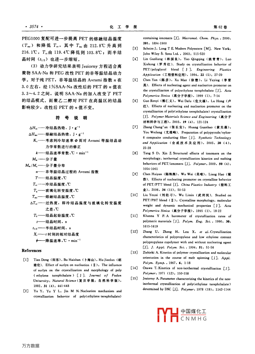 第62卷第12期化工學(xué)報(bào)Vol. 62 No. 122011年12月CIESC Journa!December 2011e 研究論文索苯乙烯-丙烯酸鈉離聚物與聚乙二醇復(fù)合對(duì)PET結(jié)晶行為的影響唐仕東,辛忠,趙亞囡(華東理工大學(xué)化學(xué)工程聯(lián)合國(guó)家重點(diǎn)實(shí)驗(yàn)室,產(chǎn)品工程系,上海200237)摘要:利用差示掃描量熱儀(DSC) 研究了離聚物苯乙烯-丙烯酸鈉(SAA-Na) 和聚乙二醇(PEG)復(fù)配物對(duì)PET結(jié)晶性能的影響。結(jié)果表明,1% (質(zhì)量分?jǐn)?shù)) SAA-Na 與5%PEG復(fù)配能夠進(jìn)一步提高PET的結(jié)晶速率,使熔融結(jié)晶溫度由PET/SAA-Na的212. 8C升高到216.1C,冷結(jié)晶溫度由119.4C降低到103.8C,玻璃化轉(zhuǎn)變溫度則由79. 4C降低到66. 2C.非等溫結(jié)晶動(dòng)力學(xué)的分析表明,SAA-Na 和PEG復(fù)配物的加人使PET的Avrami指數(shù)增加.關(guān)鍵詞: PET; 苯乙烯~丙烯酸鈉離聚物;聚乙二醇;結(jié)晶行為;復(fù)合成核DOI: 10. 3969/j. issn. 0438- 1157.2011. 12. 039中圖分類號(hào): TQ 323.4*1文獻(xiàn)標(biāo)志碼: A文章編號(hào): 0438- 1157 (2011) 12- 3569-06Effect of styrene -sodium acrylate ionomer/ poly( ethylene glycol)on crystallization behavior of PETTANG Shidong, XIN Zhong, ZHAO Yanan(State Key Laboratory of Chemical Engineering, Department of Product Engineering, East China Universityof Science and Technology, Shanghai 200237, China)Abstract: The crystallization of PET modified by the mixture of styrene -sodium acrylate ionomer (SAA-Na) and poly( ethylene glycol)(PEG) was investigated by differential scanning calorimeter (DSC). Withthe addition of 5% (mass) PEG, cold-crystallization temperature (Tc) and glass transition temperature(T,) of PET decreased significantly. Compared with PET/SAA-Na,the crystallization of PET/mixture(1%SAA-Na and 5%PEG) was further enhanced, melt-crystallization temperature (Tm ) increased from212.8C to 216. 1C, Tce decreased from 119.4C to 103. 8C and Tg from 79. 4C to 66.2C. The Jeziornyequation was used to analyze the non-isothermal crystallization kinetics of PET/ mixture, and the resultsshowed that the Avrami exponent n of PET/mixture was greater than that of neat PET.Key words: PET; styrene-sodium acrylate ionomer; poly ( ethylene glycol); crystallization behavior;complex nucleating于纖維、包裝瓶和薄膜等領(lǐng)域。但由于PET分子引言鏈中的剛性苯環(huán)阻礙了鏈段的運(yùn)動(dòng),使其結(jié)晶速度PET因具有優(yōu)異的物理化學(xué)性能而廣泛應(yīng)用緩慢,用作工程塑料時(shí)需要添加成核劑以提高2010-11-08收到初稿,2011-09 - 05收到修改稿.Recelved date; 2010-11 - 08. .聯(lián)系人:辛忠。第一作者:唐仕東(1981-), 男,博士研Correpodin中國(guó)煤化工@cus. edu. cn究生。FondatioCHCN MH G Natunl Ssience薔金項(xiàng)目:國(guó)家自然科學(xué)基金項(xiàng)目(20206019, 20806023); Foundation of China tcucoovIs, cUovocol.上海市科委優(yōu)秀學(xué)科帶頭人計(jì)劃項(xiàng)目。●3570●化工學(xué)報(bào)第62卷PET的結(jié)晶速率。離聚物(ionomer) 是- -類金屬120C干燥3h后測(cè)定各項(xiàng)性能。離子含量在15%以下的聚合物,作為成核劑使用1.3測(cè)試方法.時(shí)能同時(shí)顯著提高PET在高溫區(qū)和低溫區(qū)的結(jié)晶DSC測(cè)試前使用銦進(jìn)行溫度校正和熱滯后校速率,而對(duì)PET的降解較小,避免了成核改性后正,樣品量3.0~4.0 mg,全部測(cè)試均在氮?dú)獗Wo(hù)PET力學(xué)性能的較大幅度下降[13]。但PET的玻下進(jìn)行。將PET樣品在300°C熔融5min后液氮淬璃化轉(zhuǎn)變溫度(Tg) 較高,當(dāng)要求模溫降到70~冷,將該淬冷樣置于DSC中以10C●min-'從80°C時(shí),只經(jīng)離聚物改性后的PET自身分子鏈已20C升溫至300C,從該DSC曲線中得到玻璃化接近于凍結(jié)狀態(tài)(離聚物成核劑的加入并不改變.轉(zhuǎn)變溫度(Tg) 和冷結(jié)晶溫度(Ta). 或直接將PET的Tg),因此要達(dá)到快速結(jié)晶的目的,還必PET樣品置于DSC中以50C●min-'升溫至須降低PET的Tg.林國(guó)良等[]的研究表明,加入300C,恒溫5 min消除熱歷史后以10C●min-14% (質(zhì)量分?jǐn)?shù),下同)相對(duì)分子質(zhì)量為12000的降溫至50C,得到試樣的熔融結(jié)晶溫度(Tm)。聚乙二醇后PET的Tg由70.5C降低到55. 3C,非等溫結(jié)晶動(dòng)力學(xué)研究:將樣品快速升溫到效果非常明顯。進(jìn)一步的研究顯示,聚乙二醇通過(guò)300C,恒溫5 min以消除熱歷史,然后分別以設(shè)改善PET分子鏈的柔性和提高分子鏈的運(yùn)動(dòng)能力定的冷卻速率從300°C等速降溫至50C,并記錄該以降低PET的T.,但自身不具備成核能力,因過(guò)程的熱焓變化,所采用的冷卻速率分別為5、此需要和成核劑復(fù)配使用[5-)。本文考察了所制備10、20、40C●min-.的高效成核劑苯乙烯丙烯酸鈉離聚物[8]與聚乙二2結(jié)果與討論醇的復(fù)配物對(duì)PET結(jié)晶性能的影響。2.1聚乙二醇對(duì)PET結(jié)晶性能的影響1實(shí)驗(yàn)部分PET結(jié)晶速率的快慢,可由其熔融結(jié)晶溫度1.1材料(Tm)或冷結(jié)晶溫度(T)來(lái)表征,Tm越高,PET,特征黏度[y]=0. 66 dL.g-' (苯酚:T.越低,均表明PET的結(jié)晶越快。從表1可以看四氯乙烷質(zhì)量比1 : 1, 25°C測(cè)定),中國(guó)石化儀征出,經(jīng)聚乙二醇改性后PET的玻璃化轉(zhuǎn)變溫變化纖股份有限公司;離聚物苯乙烯-丙烯酸鈉(Tg)大幅度下降,T。也明顯降低,表明聚乙二醇(SAA-Na),由苯乙烯-丙烯酸共聚物[Mw =2.3X的加人促進(jìn)了PET在低溫區(qū)的結(jié)晶。作為結(jié)晶促10*,M/M.=1.3,丙烯酸含量9.2%