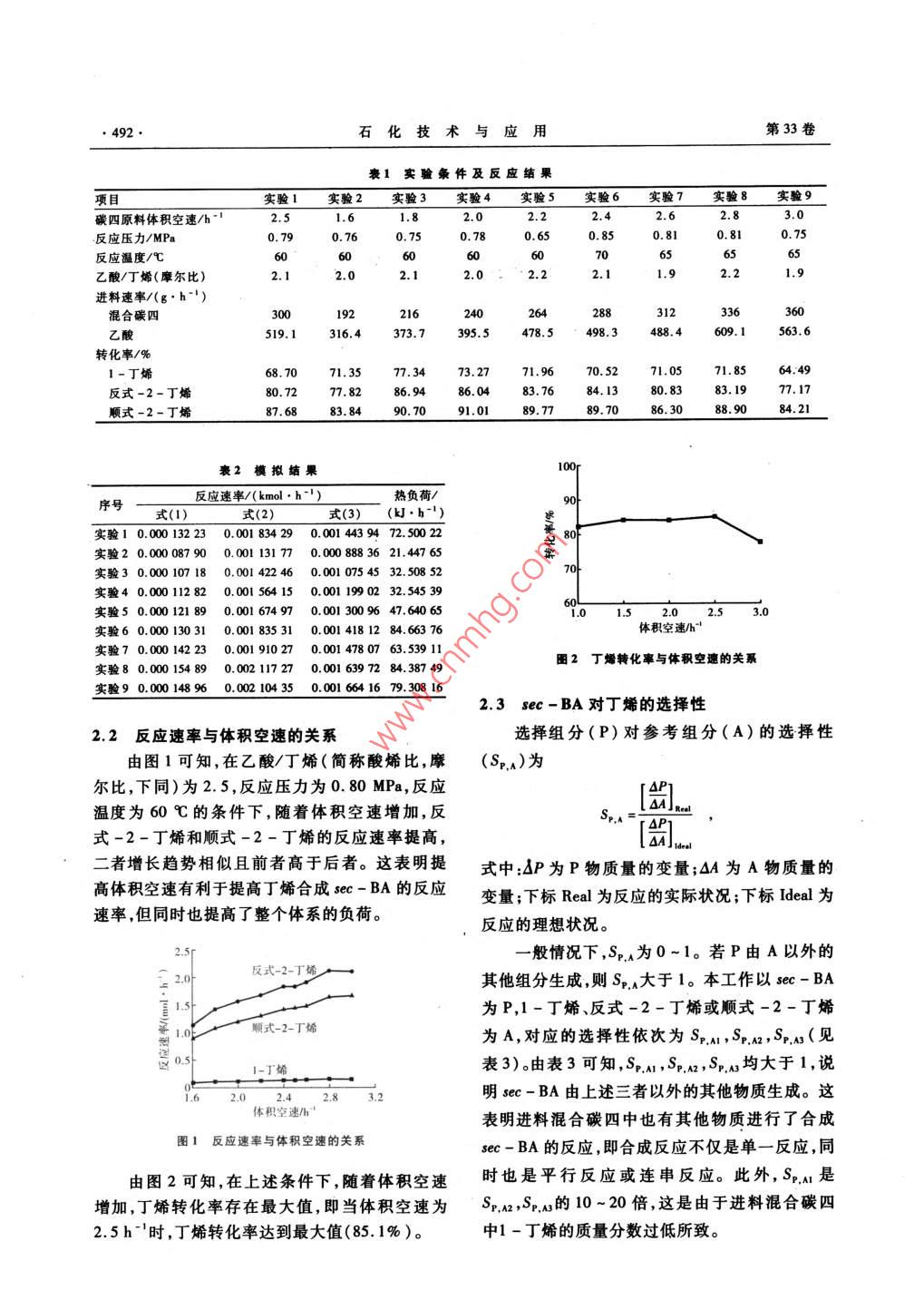 第33卷第6期石化技術(shù)與應(yīng)Vol.33 No.62015年11月Petrochemical Technology & ApplicationNov. 2015研究與開發(fā)(491 ~493 )碳四烯烴法乙酸仲丁酯合成反應(yīng)模擬王艷飛,茍文甲,周金波,董炳利,程中克(中國石油蘭州化工研究中心,甘肅蘭州730060)摘要:以混合碳四為原料,采用碳四烯烴法可制備乙酸仲丁酯(sec - BA),并用Aspen plus軟件模擬反應(yīng)過程。結(jié)果表明,各反應(yīng)的熱負荷均為正值.即總反應(yīng)為放熱反應(yīng)。在反應(yīng)壓力為0.80 MPa,反應(yīng)溫度為60 C,體積空速為2.5 h-' ,乙酸/丁烯(摩爾比)為2.5的條件下,丁烯轉(zhuǎn)化率達到最大值(85.1%)。sec-BA分別對1-丁烯、反式-2-丁烯和順式-2-丁烯的選擇性均大于1,說明合成反應(yīng)不僅是單一反應(yīng),同時也是平行反應(yīng)或連串反應(yīng)。關(guān)鍵詞:混合碳四;乙酸;丁烯;乙酸仲丁酯;轉(zhuǎn)化率;選擇性中團分類號:TQ 221.21'3文獻標志碼:B文章編號 :1009 - 0045(2015)06 -0491 -03乙酸仲丁酯(sec-BA)具有辛烷值(研究法式-2-丁烯分別與乙酸反應(yīng),各反應(yīng)的反應(yīng)式辛烷值可達125)高,無毒、無腐蝕等優(yōu)點,可作為依次稱為式(1) ~式(3)。本工作共進行了9次汽油添加劑用以提高辛烷值。sec- BA的合成方平行實驗,其相應(yīng)的實驗條件見表1。法有酸醇法"-9)和碳四烯烴法10-18。前者以仲1.3反應(yīng)熱及反應(yīng)速率的計算丁醇和乙酸(或乙酸酐)為原料,在酸性催化劑作用化學計量反應(yīng)器RStoic 模塊模擬sec - BA用下,酯化脫水生成sec- BA,生產(chǎn)成本較高。后的合成反應(yīng),由此可得反應(yīng)熱。此外,在模擬計者以正丁烯和乙酸為原料,在酸性催化劑(強酸算時,需設(shè)定操作條件,選擇反應(yīng)器的閃蒸計算性陽離子交換樹脂)作用下合成sec-BA。樹脂相態(tài),確定反應(yīng)器中發(fā)生的反應(yīng)及化學計量系催化劑的最大優(yōu)點是丁烯轉(zhuǎn)化率和sec- BA選擇數(shù),指定每個反應(yīng)的轉(zhuǎn)化率或產(chǎn)品流量。性均較高,缺點是對溫度較為敏感,高溫下易失活。本工作采用碳四烯烴法,利用Aspen plus 軟2結(jié)果與討論件模擬制備sec- BA的反應(yīng)過程,表明各反應(yīng)的2.1模擬結(jié)果 .熱負荷均為正值,即總反應(yīng)為放熱反應(yīng)。由表1可知,對于不同的實驗,其轉(zhuǎn)化率的變化趨勢均相同,即反應(yīng)物的轉(zhuǎn)化率均按下列順1實驗部分序依次遞減:順式-2-丁烯,反式-2-丁烯,1.1 原材料1-丁烯。原料為混合碳四,其組成質(zhì)量分數(shù)為:正丁由表2可知,盡管每個反應(yīng)的熱負荷各不相烷21. 0%,反式-2-丁烯42. 5%,1-丁烯同,但均為正值,因此確定總反應(yīng)為放熱反應(yīng);另3.6%,異丁烯2.1% ,順式-2-丁烯30.8%,由外,式(1)的反應(yīng)速率低于式(2)和式(3),并且中國石油蘭州石化公司生產(chǎn)。乙酸:工業(yè)級,相差10倍以上,所以提高前者是提高總反應(yīng)速CH,COOH質(zhì)量分數(shù)為99.9%,由陜西勝方化工率的關(guān)鍵。有限公司提供。催化劑:牌號為KC 117,由河北凱瑞化工股份有限公司生產(chǎn)。1.2 試樣制備收稿日期:2015 -07 -10:修回日期:2015-09-16在200mL固定床反應(yīng)器中,以混合碳四為基金項目:中國石油天然氣股份有限公司煉油與化工分公司原料,采用碳四烯烴法可制備sec- BA。反應(yīng)存資助項目(項目編號:2012 B-2304 -0305 -2)作者簡介:王艷飛(1982-),女,山東東營人,碩士,工程師, .在3個主反應(yīng):1 -丁烯、反式-2-丁烯和順主要從事清潔汽油工藝的研發(fā)工作。已發(fā)表論文5篇。●492●石化技術(shù)與應(yīng)用第33卷表1實驗條件及反應(yīng)結(jié)果實驗1實驗2實驗3實驗4實驗5實驗6實驗7實驗8實驗9碳四原料體積空速/h-2.51.61.82.02.22.42.62.83.0反應(yīng)壓力/MPa0.790.760.750.780.650.850.81反應(yīng)溫度/心60°606(656:乙酸/丁烯(摩爾比).12..0。2..9,1.9進料速率/(g.h-)混合碳四30019224026428812336360乙酸519.1316.4373.7395.5478.5498.3488.4609.1563.6轉(zhuǎn)化率/%1-丁烯68.70 .71.3577.3473.2771.9670.5271.0571.8564:49反式-2-丁烯80.7277.8286. 9486.0484.1380.8377.17順式-2-丁烯87. 68.83.8490.7091.0189.7789.7086.3088.90B4.21表2模擬結(jié)果100p反應(yīng)速率/(kmol .h)熱負荷/90序號式(1)式(2)式(3) (k.h-1)實驗1 0.00013223 0.001 834290.001 4439472.50022工8(實驗2 00008790 0.001 13177 0.000 8883621.447 65實驗3 0.000107 180.001 42246 0.001 07545 32. 508 527實驗4 0.00011282 0.001 56415 0.001 19902 32.545 39實驗50.00012189 0.001 67497 0.001 30096 47.640 6560.5.0 2.5 3.0實驗6 0.00013031 0.001 83531 0.00 4181284.663 76實驗7 0.00014223 0.001 910270.001 47807 63.539 11圈2丁烯轉(zhuǎn)化率與體積空速的關(guān)系實驗80.00015489 0.00211727 0.001 63972 84.387 49實驗9 0.000 148960.002 10435 0.001 6641679.308 162.3 sec-BA對丁烯的選擇性2.2 反應(yīng)速率與體積空速的關(guān)系選擇組分(P)對參考組分(A)的選擇性由圖1可知,在乙酸/丁烯(簡稱酸烯比,摩(Sp,)為爾比,下同)為2.5,反應(yīng)壓力為0. 80 MPa,反應(yīng)[1]..溫度為60 C的條件下,隨著體積空速增加,反Sp.=[1式-2-丁烯和順式-2-丁烯的反應(yīng)速率提高,二者增長趨勢相似且前者高于后者。這表明提式中:&P為P物質(zhì)量的變量;0A為A物質(zhì)量的高體積空速有利于提高丁烯合成sec-BA的反應(yīng)變量;下標Real為反應(yīng)的實際狀況;下標Ideal為速率,但同時也提高了整個體系的負荷。反應(yīng)的理想狀況。2.5p一般情況下,Sp,為0~1。若P由A以外的反式-2-T烯其他組分生成,則Sp.A大于1。本工
