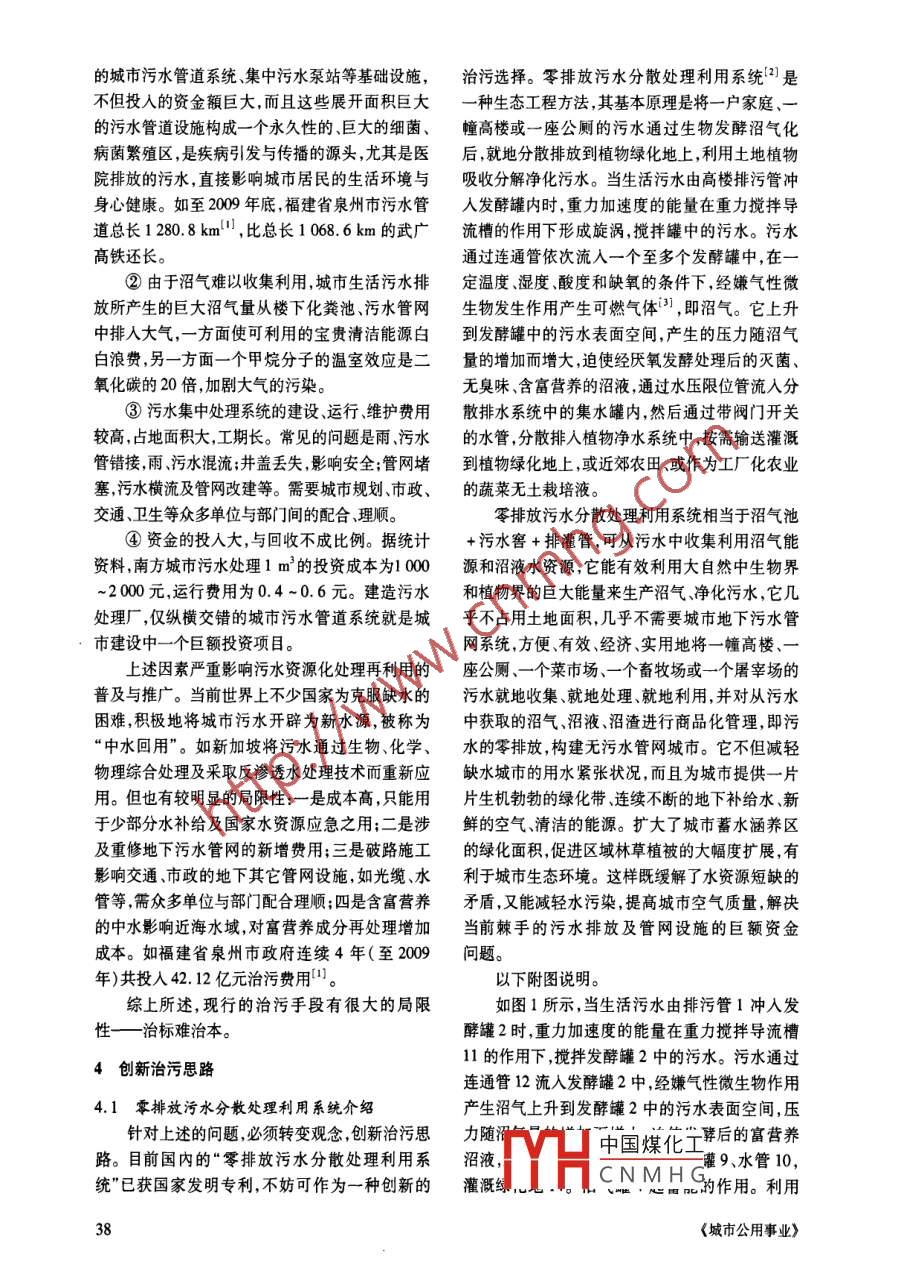 [來稿選登]探索污水零排放構(gòu)建無污水管網(wǎng)城市福建泉州經(jīng)濟(jì)技術(shù)開發(fā)區(qū)市政公司王曉川摘要為破解城市污水零排放這一難題,該文提出將城市污水轉(zhuǎn)化為沼氣新能源與水資源,構(gòu)建無污水管網(wǎng)城市的新設(shè)想。關(guān)鍵詞:城市污水零排放沼氣分散處理管網(wǎng)議定書》,并積極參與國際社會(huì)應(yīng)對全球氣候變.1問題的提出化。為有效控制溫室氣體及污水排放等我國投幾十年前,我國政府就+分重視沼氣的開發(fā)人了巨額資金,污染減排工作取得了積極進(jìn)展。和利用,早在1982年美國舉辦的世博會(huì)上中國館全國設(shè)市城市污水處理率已由2005年的52%增就展示了我國當(dāng)時(shí)的農(nóng)村沼氣。至今沼氣技術(shù)已加到2007年的63%,全國七大水系的水質(zhì)總體比較成熟,并取得了可觀的效果,得到一-定程度的保持穩(wěn)定,407個(gè)國家監(jiān)控?cái)嗝嬷?劣V類水質(zhì)斷推廣。然而,在人口密集的城市中污水所產(chǎn)生的面所占比例與2006年相比下降了2. 4%。但我沼氣能量巨大,至今尚未獲得開發(fā)與利用,白白地國水環(huán)境安全仍面臨威脅,全國七大水系中,劣V從樓下化糞池及污水管網(wǎng)系統(tǒng)中排人大氣,非常類水質(zhì)斷面占23. 6% ,超過五分之一,距離完成可惜!事實(shí)上,城市中--座高樓居住的人口相當(dāng)“十一五”規(guī)劃綱要提出的主要污染物排放達(dá)標(biāo)于農(nóng)村的一個(gè)小村莊,高樓下建-一個(gè)沼氣池,相當(dāng)依然有較大的差距,減排的達(dá)標(biāo)任務(wù)仍十分艱巨,于小村莊家家戶戶建沼氣池所產(chǎn)沼氣的總量,而責(zé)任與壓力很大。我國是能源短缺的國家,又是成本卻很低。據(jù)資料統(tǒng)計(jì),我國城鎮(zhèn)人口占全國一個(gè)耗能大國, 燃煤發(fā)電占全國發(fā)電總量的總?cè)丝诘慕?0% ,污水既集中,有機(jī)物含量也多,78% ,溫室氣體排放居世界第二。我國嚴(yán)重缺水,而這些污水排人水體既影響水環(huán)境安全,又十分同時(shí)污水排放量巨大,年污水排放量達(dá)800億t, .浪費(fèi)。“城市,讓生活更美好”是2010年上海世90%的污水未經(jīng)處理就直接排人江河湖海,水污博會(huì)的主題。自古以來,城市地下污水管網(wǎng)系統(tǒng)染又促使水資源短缺進(jìn)-步加劇,形成惡性循環(huán),的延用,為人類社會(huì)文明做出了巨大的貢獻(xiàn),然.已經(jīng)成為影響我國環(huán)境的主要問題之一。水是國而,隨著城市化的高速擴(kuò)展,人口高度集中,世界家建設(shè)發(fā)展的戰(zhàn)略性資源,現(xiàn)卻成為制約我國經(jīng)各城市中的污水管網(wǎng)系統(tǒng)縱橫交錯(cuò),施工與維護(hù)濟(jì)社會(huì)可持續(xù)發(fā)展的“瓶頸”,應(yīng)該從根本上破解成本高,已給城市造成巨大的壓力。尤其是它的長效治理污水、提高水資源利用率的難題。展開面積巨大,直接為蚊蠅、蟑螂、老鼠等害蟲提3城市污水治理 現(xiàn)狀及存在問題供繁殖與生存空間,數(shù)以萬計(jì)的污水井口不斷冒出夾帶病菌的臭氣,引發(fā)與傳播疾病,直接影響城我國城市現(xiàn)行的污水處理是這樣的:由縱橫市衛(wèi)生環(huán)境。因此,筆者設(shè)想移植農(nóng)村成熟的沼交錯(cuò)的城市污水管道系統(tǒng)排放出的污水,通過污氣工程為城市所應(yīng)用,構(gòu)建無污水管網(wǎng)城市,對污水泵站集中到污水處理廠, 經(jīng)過二級(jí)生化處理,通染減排、環(huán)境保護(hù)工作可起到事半功倍的作用。過沉淀等物理處理后,進(jìn)人曝氣池,經(jīng)活性污泥生物處中國煤化工集中處理方法2責(zé)任與壓力帶MHCNMHG我國已簽署《聯(lián)合國氣候框架公約》和《京都U城巾生活巧水果中處埋需要縱橫交錯(cuò)2010年第24卷第6期37的城市污水管道系統(tǒng)、集中污水泵站等基礎(chǔ)設(shè)施,治污選擇。零排放污水分散處理利用系統(tǒng)]是不但投人的資金額巨大,而且這些展開面積巨大一種生態(tài)工程方法,其基本原理是將-一戶家庭-的污水管道設(shè)施構(gòu)成-一個(gè)永久性的、巨大的細(xì)菌、幢高樓或一座公廁的污水通過生物發(fā)酵沼氣化病菌繁殖區(qū),是疾病引發(fā)與傳播的源頭,尤其是醫(yī)后,就地分散排放到植物綠化地上,利用土地植物院排放的污水,直接影響城市居民的生活環(huán)境與吸收分解凈化污水。當(dāng)生活污水由高樓排污管沖身心健康。如至2009年底,福建省泉州市污水管人發(fā)酵罐內(nèi)時(shí),重力加速度的能量在重力攪拌導(dǎo)道總長1 280.8 km'l ,比總長1 068.6 km的武廣流槽的作用下形 成旋渦,攪拌罐中的污水。污水高鐵還長。通過連通管依次流人一個(gè)至多個(gè)發(fā)酵罐中,在一②由于沼氣難以收集利用,城市生活污水排定溫度、濕度、酸度和缺氧的條件下,經(jīng)嫌氣性微放所產(chǎn)生的巨大沼氣量從樓下化糞池、污水管網(wǎng)生物發(fā)生作用產(chǎn)生可燃?xì)怏wB] ,即沼氣。它上升中排入大氣,-方面使可利用的寶貴清潔能源白到發(fā)酵罐中的污水表面空間,產(chǎn)生的壓力隨沼氣白浪費(fèi),另一方面一個(gè)甲烷分子的溫室效應(yīng)是二量的增加而增大,迫使經(jīng)厭氧發(fā)酵處理后的滅菌、氧化碳的20倍,加劇大氣的污染。無臭味含富營養(yǎng)的沼液,通過水壓限位管流人分③污水