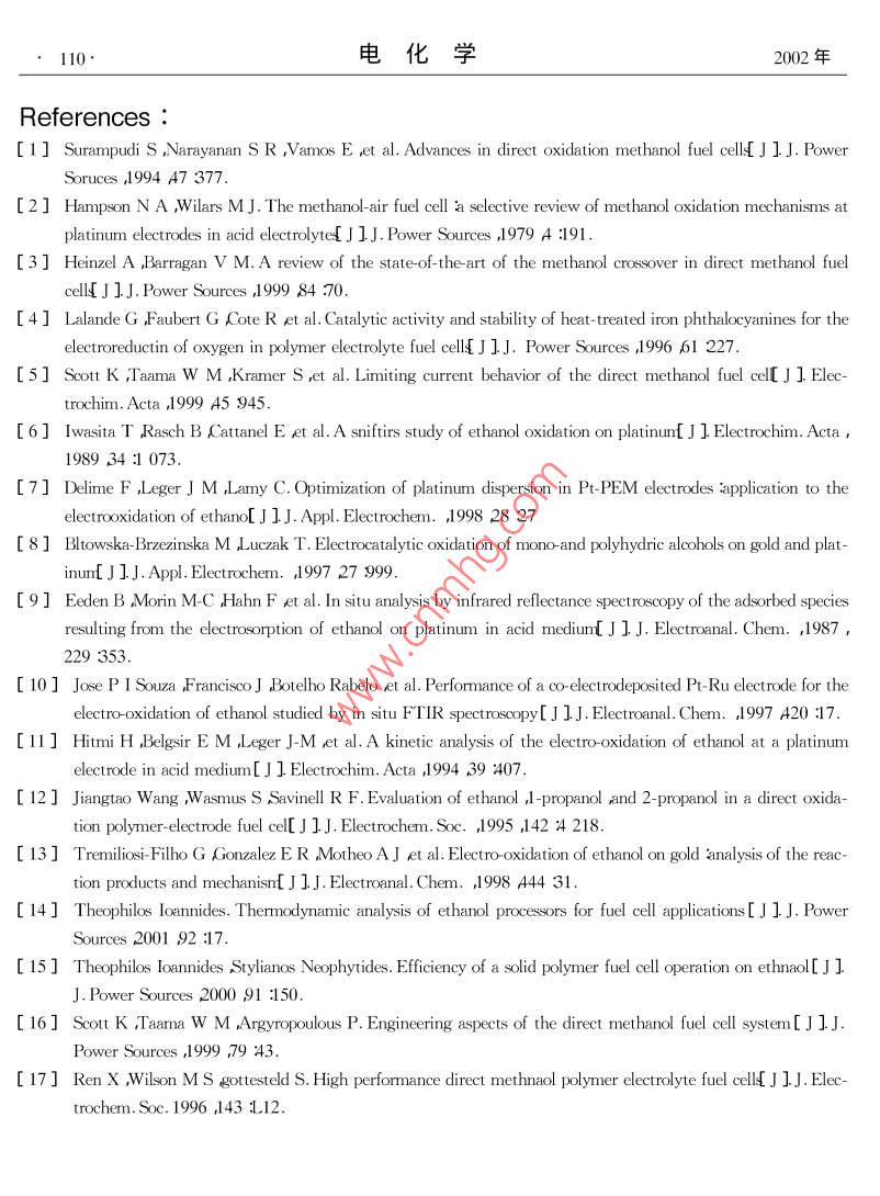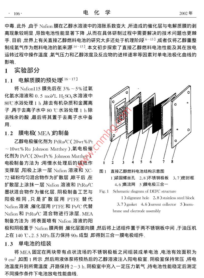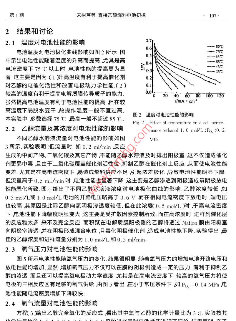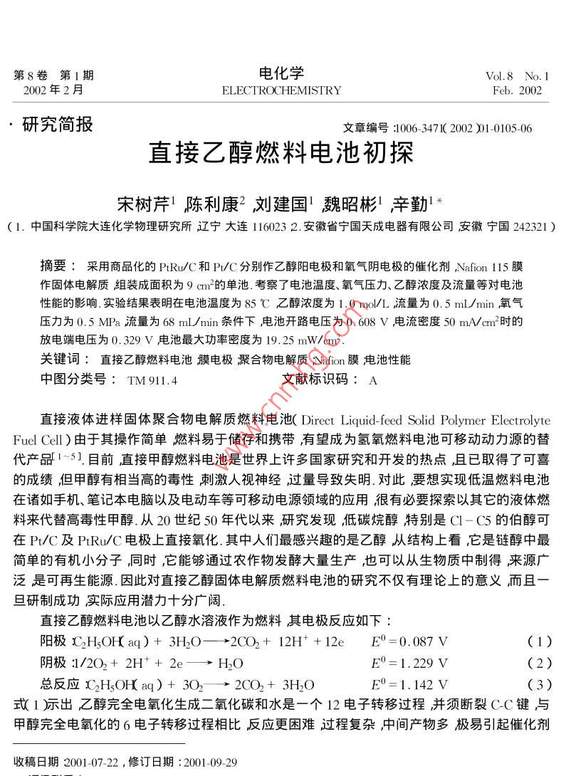 第8卷第1期電化學(xué)Vol 8 No. 12002年2月ELECTROCHEMISTRYFeb.2002研究簡(jiǎn)報(bào)文章編號(hào)1006-34712002)1-01050直接乙醇燃料電池初探宋樹(shù)芹陳利康2劉建國(guó)魏昭彬l辛勤11.中國(guó)科學(xué)院大連化學(xué)物理研究所遼寧大連1160232.安徽省寧國(guó)天成電器有限公司安徽寧國(guó)242321摘要:采用商品化的PRu/C和PC分別作乙醇陽(yáng)電極和氧氣陰電極的催化劑 Nafion15膜作固體電解質(zhì)組裝成面積為9cm2的單池考察了電池溫度、氧氣壓力、乙醇濃度及流量等對(duì)電池性能的影響實(shí)驗(yàn)結(jié)果表眀在電池溫度為δ5℃乙醇濃度為1.0mol/L流量為0.5mL/mi氧氣壓力為0.5MPa流量為68ml/min條件下電池開(kāi)路電壓為0.608V電流密度50mMcm3時(shí)的放電端電壓為0.329V電池最大功率密度為19.25mW/cm2關(guān)鍵詞:直接乙醇燃料電池膜電極聚合物電解質(zhì)灬 afion膜電池性能中圖分類號(hào):TM911.4文獻(xiàn)標(biāo)識(shí)碼:A直接液體進(jìn)樣固體聚合物電解質(zhì)燃料電池( Direct Liquid- feed Solid Polymer ElectrolyteFuel cell〕由于其操作簡(jiǎn)單燃料易于儲(chǔ)存和攜帶有望成為氬氧燃料電池可移動(dòng)動(dòng)力源的替代產(chǎn)品1-5].目前直接甲醇燃料電池是世界上許多國(guó)家研究和開(kāi)發(fā)的熱點(diǎn)且已取得了可喜的成績(jī)但甲醇有相當(dāng)高的毒性刺激人視神經(jīng)過(guò)量導(dǎo)致失明.對(duì)此要想實(shí)現(xiàn)低溫燃料電池在諸如手機(jī)、筆記本電腦以及電動(dòng)車等可移動(dòng)電源領(lǐng)域的應(yīng)用很有必要探索以其它的液體燃料來(lái)代替髙毒性甲醇.從20世紀(jì)50年代以來(lái)研究發(fā)現(xiàn)柢碳烷醇特別是Cl-C5的伯醇可在P/C及PRu/C電極上直接氧化.其中人們最感興趣的是乙醇從結(jié)構(gòu)上看它是鏈醇中最簡(jiǎn)單的有機(jī)小分子同時(shí),它能夠通過(guò)農(nóng)作物發(fā)酵大量生產(chǎn)也可以從生物質(zhì)中制得來(lái)源廣泛是可再生能源.因此對(duì)直接乙醇固體電解質(zhì)燃料電池的研究不僅有理論上的意義而且旦研制成功實(shí)際應(yīng)用潛力十分廣闊.直接乙醇燃料電池以乙醇水溶液作為燃料其電極反應(yīng)如下陽(yáng)極x2 HS OH aq)+3H2O—2CO2+12H++12eE0=0.087V陰極:1/2O2+2H++2e—H2O(2)反應(yīng)X2 HsOH aq)+3O22O2+3HOE0=1.142V(3)式1示出乙醇完全電氧化生成二氧化碳和水是一個(gè)12電子轉(zhuǎn)移過(guò)程并須斷裂CC鍵與甲醇完全電氧化的6電子轉(zhuǎn)移過(guò)程相比反應(yīng)更困難過(guò)程復(fù)雜中間產(chǎn)物多極易引起催化劑收稿日期2001-07-22,修訂日期:2001-0929106電化學(xué)2002年中毒.此外由于 Nafion膜在乙醇水溶液中的溶脹系數(shù)變大所造成的催化層與電解質(zhì)膜的剝離現(xiàn)象較明顯導(dǎo)致電池性能顯著下降從而在具體研制過(guò)程中需要解決旳技術(shù)問(wèn)題也更棘手.目前世界上有關(guān)直接乙醇燃料電池的研究大多還處于機(jī)理階段6-131或者僅將乙醇重整制成氬氣作為燃料電池的氫來(lái)源-15]本文初步探索了直接乙醇燃料電池性能及其在放電運(yùn)轉(zhuǎn)過(guò)程中操作溫度氰氣壓力和乙醇濃度及反應(yīng)物的進(jìn)樣速率等因素對(duì)單電池極化曲線的影響實(shí)驗(yàn)部分1.1電解質(zhì)膜的預(yù)處理16-17將 Nafion115膜先后在3%~5%過(guò)氧化氫水溶液和0.5mol/LHSO4水溶液中80℃水浴處理1h除去有機(jī)雜質(zhì)和金屬離子再于去離子水中80℃水浴處理1h除去殘余的酸最后將其置于去離子水中備用1.2膜電極(MEA制備乙醇電極催化劑為PtRu/C(20wt%Pt10wt% Ru Johnson Matthey),氧電極催化劑為P/C(20wPt% Johnson Matthey)電極制備方法為:用憎水處理后的碳紙作支撐層陽(yáng)極上涂一層 Nafion溶液和XC圖1直接乙醇燃料電池結(jié)構(gòu)示意圖72碳粉均勻混合物作為擴(kuò)散層晾干后在Ⅰ緊固螺絲孔2、8環(huán)銹鋼極板3、7磨封框擴(kuò)散層上涂抹一層 Nafion溶液和PtRu/C4、6渫集流網(wǎng)5膜電極三合墨狀混合物作為催化層.陰極制備工藝與Fig. I Schematic diagram of DEFC structure陽(yáng)極相同,只是擴(kuò)散層用PTFE替代I)alignmnt hole 2,8)stainless steel blockNafion溶液催化層用PTFE和Pt/C代替3.7) gasket 4,6 urrent collector 5 )merNafion和PRuC混合物進(jìn)行涂層.MEAbrane and electrode assembly制備方法為:將表面噴有 Nafion溶液的陽(yáng)極和陰極置于 Nafion膜兩側(cè)催化層面向膜然后將上述組件置于兩不銹鋼板中間于油壓機(jī)上在140℃、2.5MPa壓力保持90s成型即得到三合一膜電極組件13單電池的組裝將MEA固定在兩塊帶有點(diǎn)狀流場(chǎng)的不銹鋼極板之間組裝成單電池電池有效面積為cm2如圖1所示然后用液體泵將預(yù)熱后的乙醇溶液注入陽(yáng)電極室.陰極室保持常壓將電池溫度升到所需溫度開(kāi)路保持2~3h.陰極室中充入一定壓力氧氣待電池性能穩(wěn)定后測(cè)定不同操作條件下電池放電性能曲線第1期宋樹(shù)芹等直接乙醇燃料電池初探1072結(jié)果和討論2.1溫度對(duì)電池性能的影響電池溫度對(duì)電池極化曲線影響如圖2所示.圖c75℃中示出電池性能隨著溫度的升高而提高尤其是高一△-65℃℃電流密度下75℃以上時(shí)電池性能的提高更為顯03一-:5℃著.這主要是因?yàn)?1升高溫度有利于提高催化劑0.2對(duì)乙醇的電催化活性和改善電極動(dòng)力學(xué)性能(2)0.1較高的溫度有利于提高電解質(zhì)膜傳導(dǎo)質