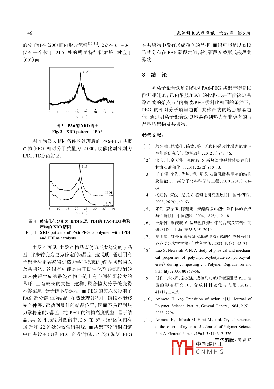 第28卷第5期天津科技大學(xué)學(xué)報(bào)Vol.28 No. 52013年10月Journal of Tianjin University of Science & TechnologyOct. 2013聚酰胺6-聚乙二醇共聚物的合成與性能劉宇,揣成智,許國賀,呂愛龍(天津科技大學(xué)材料科學(xué)與化學(xué)工程學(xué)院,天津300457)摘要:采用陰離子聚合法合成了一系列聚酰胺6- 聚乙二醇(PA6-PEG)嵌段共聚物,對(duì)已內(nèi)酰胺/PEG投料比對(duì)共聚物熱性能的影響進(jìn)行重點(diǎn)研究,并分析此方法所得產(chǎn)物的結(jié)晶性能.通過傅里葉變換紅外光譜、差示掃描量熱儀、XRD等測試對(duì)產(chǎn)物結(jié)構(gòu)、熱性能及結(jié)晶性能進(jìn)行了分析.研究結(jié)果表明:嵌段共聚物以酯基相連;PEG質(zhì)量分?jǐn)?shù)低于20%時(shí),熔點(diǎn)呈規(guī)律性下降;高于20%時(shí),共聚物的熔點(diǎn)波動(dòng)性較大,已內(nèi)酰胺/PEG的投料比不能決定共聚產(chǎn)物的熔點(diǎn);已內(nèi)酰胺/PEG配比相同時(shí),PEG相對(duì)分子質(zhì)量越低,共聚物的熔點(diǎn)也越低;通過陰離子聚合法更容易得到熱力學(xué)非穩(wěn)態(tài)的γ晶型產(chǎn)物.關(guān)鍵詞:己內(nèi)酰胺;聚乙二醇;尼龍6;陰離子聚合中圖分類號(hào): TQ323.6文獻(xiàn)標(biāo)志碼: A文章編號(hào): 1672-6510(2013)05-0043-04Synthesis and Properties of PA6 _PEG CopolymerLIU Yu,CHUAI Chengzhi, XU Guohe,LU Ailong(College of Material Science and Chemical Engineering, Tianjin University of Science & Technology ,Tianjin 300457, China)Abstract: A series of PA6-PEG segmented copolymer was synthetized through anionic polymerization. The effect ofcaprolactam/PEG feeding ratio on thermal properties was focused on, and the performance of crystallization of the copoly-mer was also analyzed. The structure , thermal and crystalline properties of the products were studied with Fourier transforminfrared spectroscopy , dffrential scanning calorimetry ,XRD and other tests. The results showed that the products weresegmented copolymers connected with ester bonds ; the melting point declines regularly when the PEG mass percentage wasless than 20%. However it had big volatility when the percentage was more than 20%, which could indicate that the caprolac-tam/PEG ratio was not the decisive factor of the melting point. The melting point of the copolymer went down when the rela-tive molecular mass of PEG was low but the caprolactam/PEG ratio was the same. It was easier to get thermodynamicallyunsteady y polymorph products by anionic polymerization.Key words: caprolactam; polyethylene glycol; nylon 6; anionic polymerization聚酰胺6(PA6)是指高分子鏈上具有酰胺基重復(fù)具有不同熱性能的共聚物[5].結(jié)構(gòu)單元的聚合物[I-21,作為工程塑料中最早開發(fā)的目前,合成己內(nèi)酰胺與聚醚或聚酯的嵌段共聚物品種,擁有較高的力學(xué)強(qiáng)度、電氣性能優(yōu)良、加工性主要有2種方法:水解開環(huán)聚合法和陰離子聚合能好3-41.為了賦予聚酰胺6產(chǎn)品更好的柔韌性,可法.2種方法各有利弊,前者需要較高的反應(yīng)溫度及采用共聚改性方法,引人聚醚或聚酯,如四氫呋喃聚較長的反應(yīng)時(shí)間,后者則要求較高純度的原料以及對(duì)醚(PTMG)、聚乙二醇(PEG)、聚己內(nèi)酯(PCL)等,它工藝條件的嚴(yán)格控制2.本文采用陰離子聚合法合成們作為軟段可賦予聚合物柔軟性和可延伸性,而PA6了一系列聚酰胺6-聚乙二醇嵌段共聚物(PA6-作為硬段,以玻璃態(tài)或半結(jié)晶型硬段微區(qū)起到物理交PEG),研究了產(chǎn)物的分子結(jié)構(gòu)、沸水萃取和己內(nèi)酰胺聯(lián)點(diǎn)的作用.通過改變其結(jié)構(gòu)和配比,可得到- - 系列/PEG投料比中國煤化工,并分析了陰.YHCNMHG收稿日期: 2012-12-13; 修回日期: 2013-02-23作者簡介:劉宇(1988- -),女,河北人,碩士研究生;通信作者:揣成智,教授, chuai@tust.cdu.cn.●44●天津科技大學(xué)學(xué)報(bào)第28卷第5期離子聚合法所得產(chǎn)物的結(jié)晶性能.高于1000時(shí),在后期階段,反應(yīng)物呈現(xiàn)明顯“韋森堡效應(yīng)”,所得共聚產(chǎn)物有較高黏度,手感柔韌,具有1材料與方法較好的強(qiáng)度并呈現(xiàn)- -定 彈性.而當(dāng)聚乙二醇相對(duì)分子質(zhì)量高于2 000時(shí),出現(xiàn)熔體分離現(xiàn)象,聚合難以1.1 原料進(jìn)行,本文將重點(diǎn)針對(duì)聚乙二醇相對(duì)分子質(zhì)量己內(nèi)酰胺,化學(xué)純,天津市北聯(lián)精細(xì)化學(xué)品開發(fā)1 000 ~ 2000的共聚物進(jìn)行研究討論.有限公司;聚乙二醇,分析純,上海浦東高南化工廠;2.2紅外光譜分析氫氧化鈉,分析純,天津市化學(xué)試劑一廠;甲苯2,4圖1為PA6與PA6-PEG(PEG相對(duì)分子質(zhì)量為二異氰酸酯(TDI)、異佛爾酮二異氰酸酯(IPDI),分1 500)共聚物的紅外光譜圖.析純,天津市福晨化學(xué)試劑廠: ;脂肪烴、甲酸,分析PA6純,天津市北方天醫(yī)化學(xué)試劑廠.1.2 樣品制備1 265.07采用陰離子聚合法(0],制備PA6-PEG共聚物.在反應(yīng)器中加入一定量的己內(nèi)酰胺,加熱至熔融,抽真PA6-PEG2937.061 639.23 299.612 368.161 546.63空約30 min除濕,加微量氫氧化鈉后攪拌,使己內(nèi)酰胺在催化劑作用下形成已內(nèi)酰胺陰離子,抽真空約1720.191 108.8730 min除濕;分別加人聚乙二醇、異氰酸酯和分散劑,升溫至160~180°C反應(yīng),在體系呈現(xiàn)黏稠狀時(shí)4000 3500 3000 2500 2000 1 500 1 000 .快速出料,于高于80C熱水中洗滌,抽濾,烘干得到波數(shù)lem"'粉末或者顆粒狀PA6-PEG樣品.圖1 PA6 與PA6-PEG共聚物的紅外光譜圖1.3表