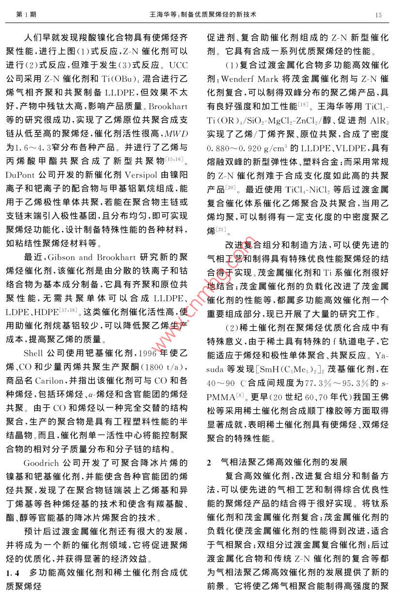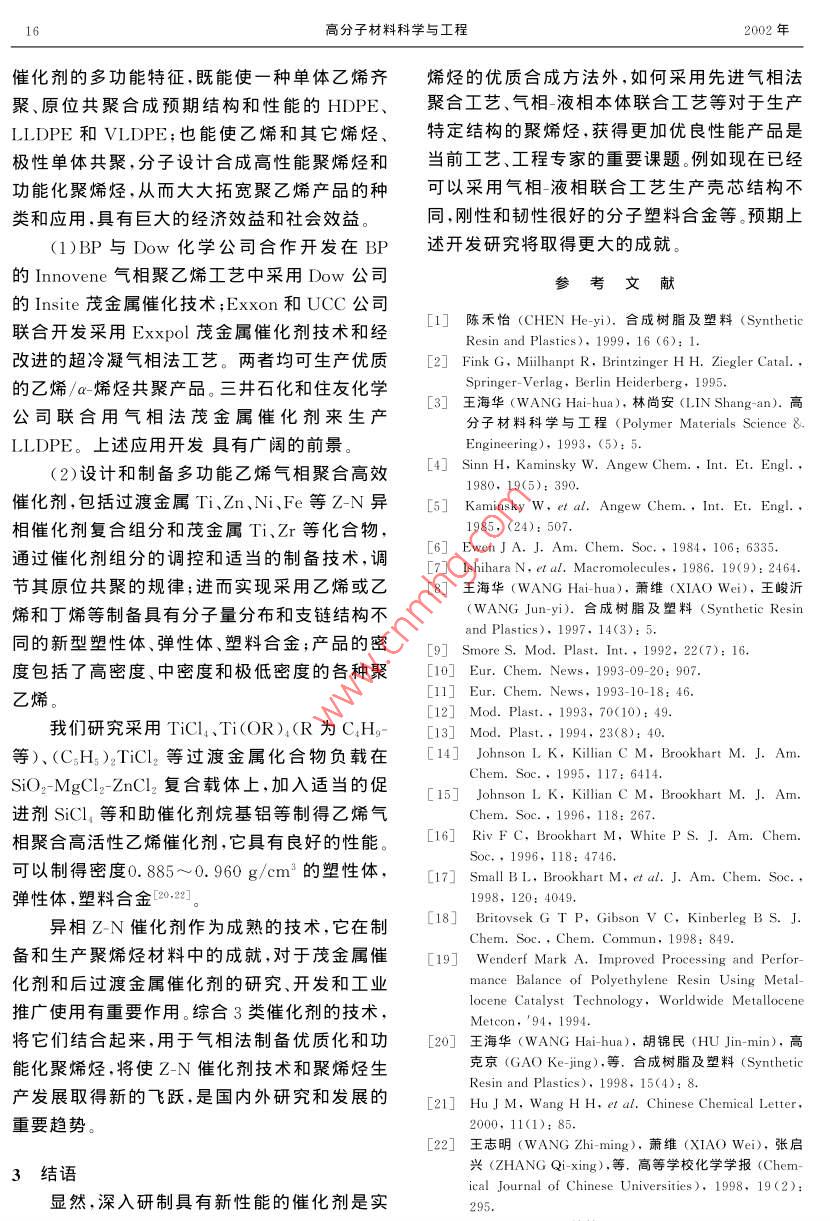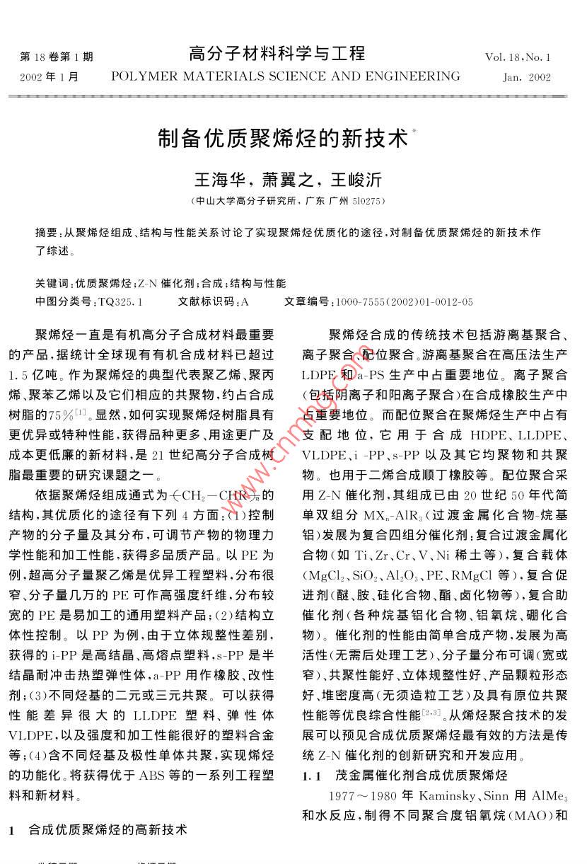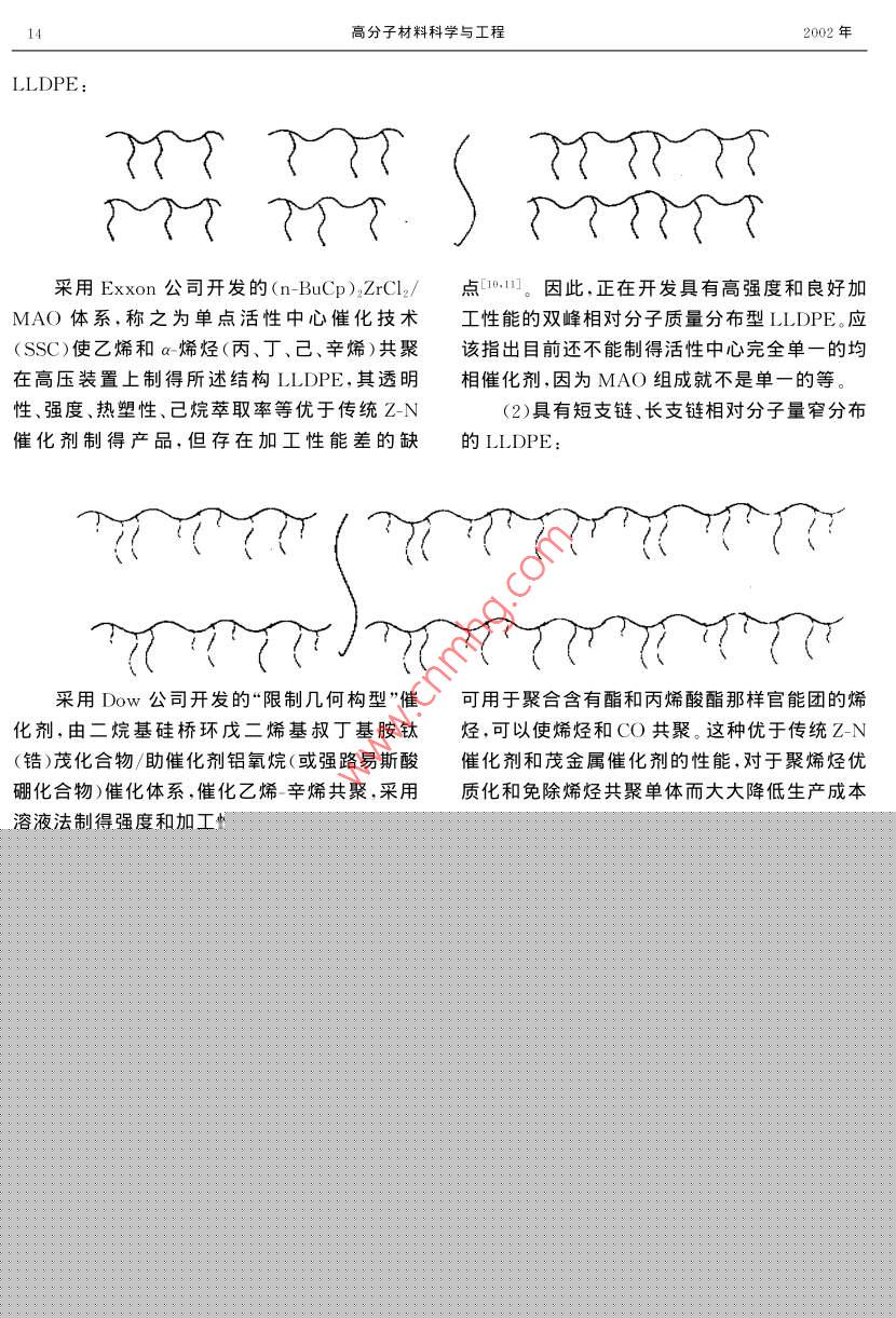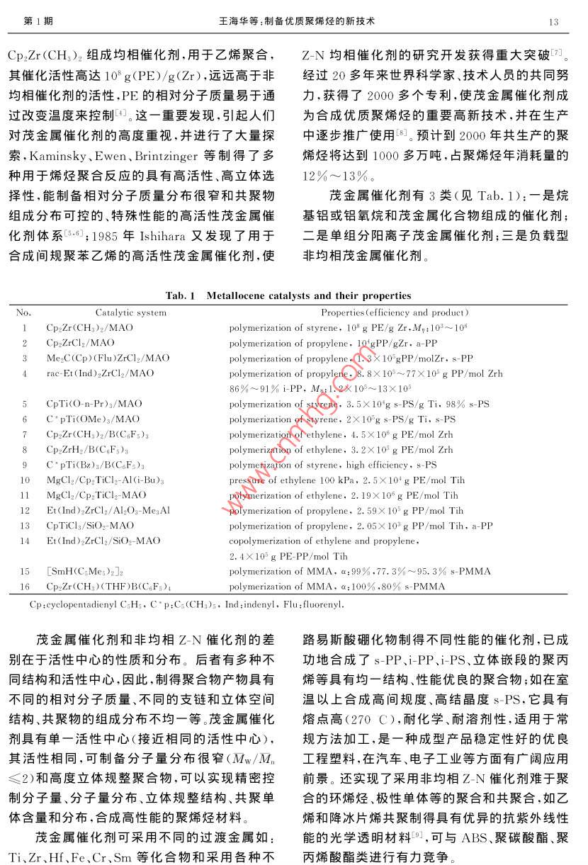 第18卷第1期高分子材料科學(xué)與工程Vol. 18,No. 12002年1月POLYMER MATERIALS SCIENCE AND ENGINEERINGJan.2002制備優(yōu)質(zhì)聚烯烴的新技術(shù)王海華,蕭翼之,王峻沂(中山大學(xué)高分子研究所,廣東廣州510275)摘要:從聚烯烴組成、結(jié)構(gòu)與性能關(guān)系討論了實(shí)現(xiàn)聚烯烴優(yōu)質(zhì)化的途徑,對(duì)制備優(yōu)質(zhì)聚烯烴的新技術(shù)作了綜述。關(guān)鍵詞:優(yōu)質(zhì)聚烯烴;Z-N催化劑;合成;結(jié)構(gòu)與性能中圖分類號(hào):TQ325.1文獻(xiàn)標(biāo)識(shí)碼:A文章編號(hào):1000- 7555(2002)01-0012-05聚烯烴一直是有機(jī)高分子合成材料最重要聚烯烴合成的傳統(tǒng)技術(shù)包括游離基聚合、的產(chǎn)品,據(jù)統(tǒng)計(jì)全球現(xiàn)有有機(jī)合成材料已超過離子聚合、配位聚合。游離基聚合在高壓法生產(chǎn)1.5億噸。作為聚烯烴的典型代表聚乙烯、聚丙LDPE和a-PS生產(chǎn)中占重要地位。離子聚合烯、聚苯乙烯以及它們相應(yīng)的共聚物,約占合成(包括陰離子和陽離子聚合)在合成橡膠生產(chǎn)中樹脂的75%。顯然,如何實(shí)現(xiàn)聚烯烴樹脂具有占重要地位。而配位聚合在聚烯烴生產(chǎn)中占有更優(yōu)異或特種性能,獲得品種更多、用途更廣及支配地位,它用于合成HDPE、LLDPE、成本更低廉的新材料,是21世紀(jì)高分子合成樹VLDPE、i -PP、s-PP以及其它均聚物和共聚脂最重要的研究課題之-。物。也用于二烯合成順丁橡膠等。配位聚合采依據(jù)聚烯烴組成通式為∈CH2-CHR為的.用Z-N催化劑,其組成已由20世紀(jì)50年代簡(jiǎn)結(jié)構(gòu),其優(yōu)質(zhì)化的途徑有下列4方面:(1)控制單雙組分MX..-AlR3 (過渡金屬化合物烷基產(chǎn)物的分子量及其分布,可調(diào)節(jié)產(chǎn)物的物理力鋁)發(fā)展為復(fù)合四組分催化劑:復(fù)合過渡金屬化學(xué)性能和加工性能,獲得多品質(zhì)產(chǎn)品。以PE為合物(如Ti、Zr.Cr.V.Ni稀土等),復(fù)合載體例,超高分子量聚乙烯是優(yōu)異工程塑料,分布很(MgCl2、SiO2、Al.O3、PE、RMgCl等),復(fù)合促窄、分子量幾萬的PE可作高強(qiáng)度纖維,分布較進(jìn)劑(醚、胺、硅化合物、酯、鹵化物等),復(fù)合助寬的PE是易加工的通用塑料產(chǎn)品;(2)結(jié)構(gòu)立催 化劑(各種烷基鋁化合物、鋁氧烷、硼化合體性控制。以PP為例,由于立體規(guī)整性差別,物)。 催化劑的性能由簡(jiǎn)單合成產(chǎn)物,發(fā)展為高獲得的i-PP是高結(jié)晶、高熔點(diǎn)塑料,s-PP是半活性 (無需后處理工藝)、分子量分布可調(diào)(寬或結(jié)晶耐沖擊熱塑彈性體,a-PP用作橡膠、改性窄)、共聚性能好、立體規(guī)整性好、產(chǎn)品顆粒形態(tài)劑;(3)不同烴基的二元或三元共聚??梢垣@得好、堆密度高(無須造粒工藝)及具有原位共聚性能差異很大的LLDPE塑料、彈性體性能等優(yōu)良綜合性能[2.3]。從烯烴聚合技術(shù)的發(fā)VLDPE,以及強(qiáng)度和加工性能很好的塑料合金展可以預(yù)見合成優(yōu)質(zhì)聚烯烴最有效的方法是傳等;(4)含不同烴基及極性單體共聚,實(shí)現(xiàn)烯烴統(tǒng)Z-N催化劑的創(chuàng)新研究和開發(fā)應(yīng)用。的功能化。將獲得優(yōu)于ABS等的一系列工程塑1.1茂金屬催化劑合成優(yōu)質(zhì)聚烯烴料和新材料。1977~ 1980年Kaminsky 、Sinn用AlMeg和水反應(yīng),制得不同聚合度鋁氧烷(MAO)和1合成優(yōu)質(zhì)聚烯烴的高新技術(shù).收稿日期: 2000-05- 09;修訂日期:2000-08- 14基金項(xiàng)雷方武物據(jù)然科學(xué)基金及燕山石化研究院聯(lián)合資助項(xiàng)目(29874039)作者簡(jiǎn)介:王海華,男,博士導(dǎo)師,教授.第1期王海華等:制備優(yōu)質(zhì)聚烯烴的新技術(shù)13Cp2Zr(CH)z組成均相催化劑,用于乙烯聚合,Z-N 均相催化劑的研究開發(fā)獲得重大突破叮。其催化活性高達(dá)10* g(PE)/g(Zr),遠(yuǎn)遠(yuǎn)高于非經(jīng)過 20多年來世界科學(xué)家、技術(shù)人員的共同努均相催化劑的活性,PE的相對(duì)分子質(zhì)量易于通力,獲得了2000多個(gè)專利,使茂金屬催化劑成過改變溫度來控制[4。這一-重要發(fā)現(xiàn),引起人們?yōu)楹铣蓛?yōu)質(zhì)聚烯烴的重要高新技術(shù),并在生產(chǎn)對(duì)茂金屬催化劑的高度重視,并進(jìn)行了大量探中逐步推廣使用[8]。預(yù)計(jì)到2000年共生產(chǎn)的聚;索, Kaminsky、Ewen. Brintzinger等制得了多烯烴將達(dá)到1000多萬噸,占聚烯烴年消耗量的種用于烯烴聚合反應(yīng)的具有高活性、高立體選12% ~13%。擇性,能制備相對(duì)分子質(zhì)量分布很窄和共聚物.茂金屬催化劑有3類(見Tab.1):一是烷組成分布可控的、特殊性能的高活性茂金屬催基鋁或鋁氧烷和茂金屬化合物組成的催化劑;化劑體系(5.6];1985年Ishihara又發(fā)現(xiàn)了用于二是單組分陽離子茂金屬催化劑;三是負(fù)載型合成間規(guī)聚苯乙烯的高活性茂金屬催化劑,使非均相茂金屬催化劑。Tab.1 Metallocene catalysts and their propertiesNo.Catalytic systemProperties (efficiency and product)Cp2Zr(CH3)2/MAOpolymerization of styrene, 108 g PE/g Zr,My:103~ 10"Cp2ZrCl2/MAOpolymerization of propylene, 10*gPP/gZr, a-PPMe2C(Cp)(Flu)ZrCl2/MAOpolymerization of propylene, 1. 3X 10°gPP/molZr, s- PPrac Et(Ind)2ZrCl2/MAOpolymerization of propylene,8. 8X105~77X 105 g PP/mol Zrh86%~91% i-PP, My:1.2X 105~13X105CpTi(O- n- Pr):/MAOpolymerization of styrene, 3. 5X10*gs-PS/g Ti, 98% s- PSC* pTi(OMe)3/MAOpolymerization of styrene, 2X10°gs-P