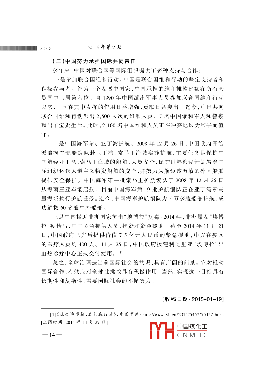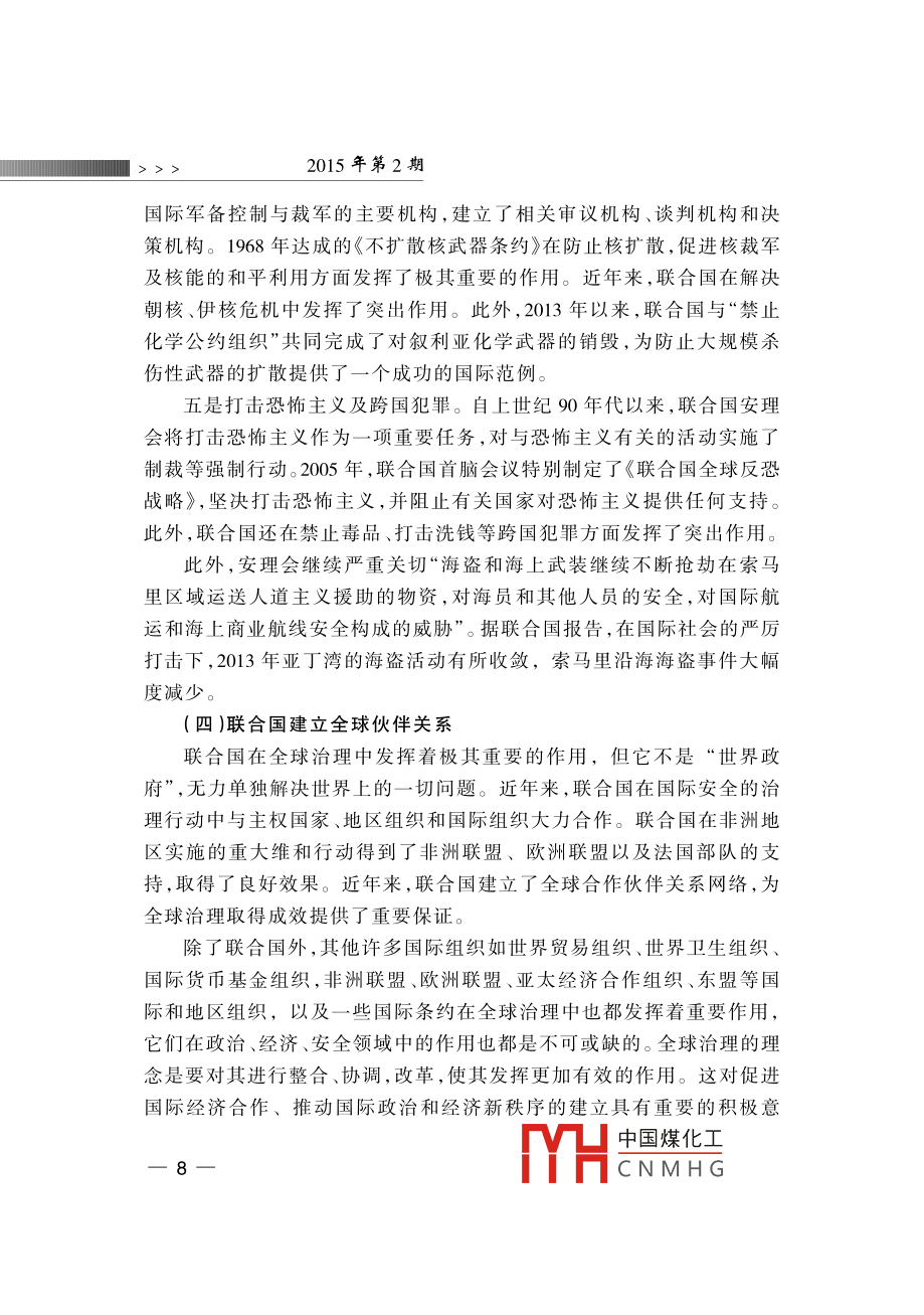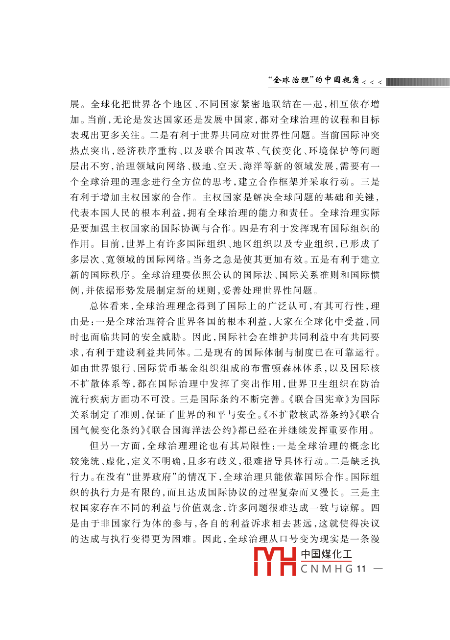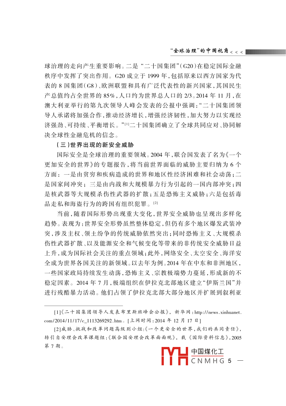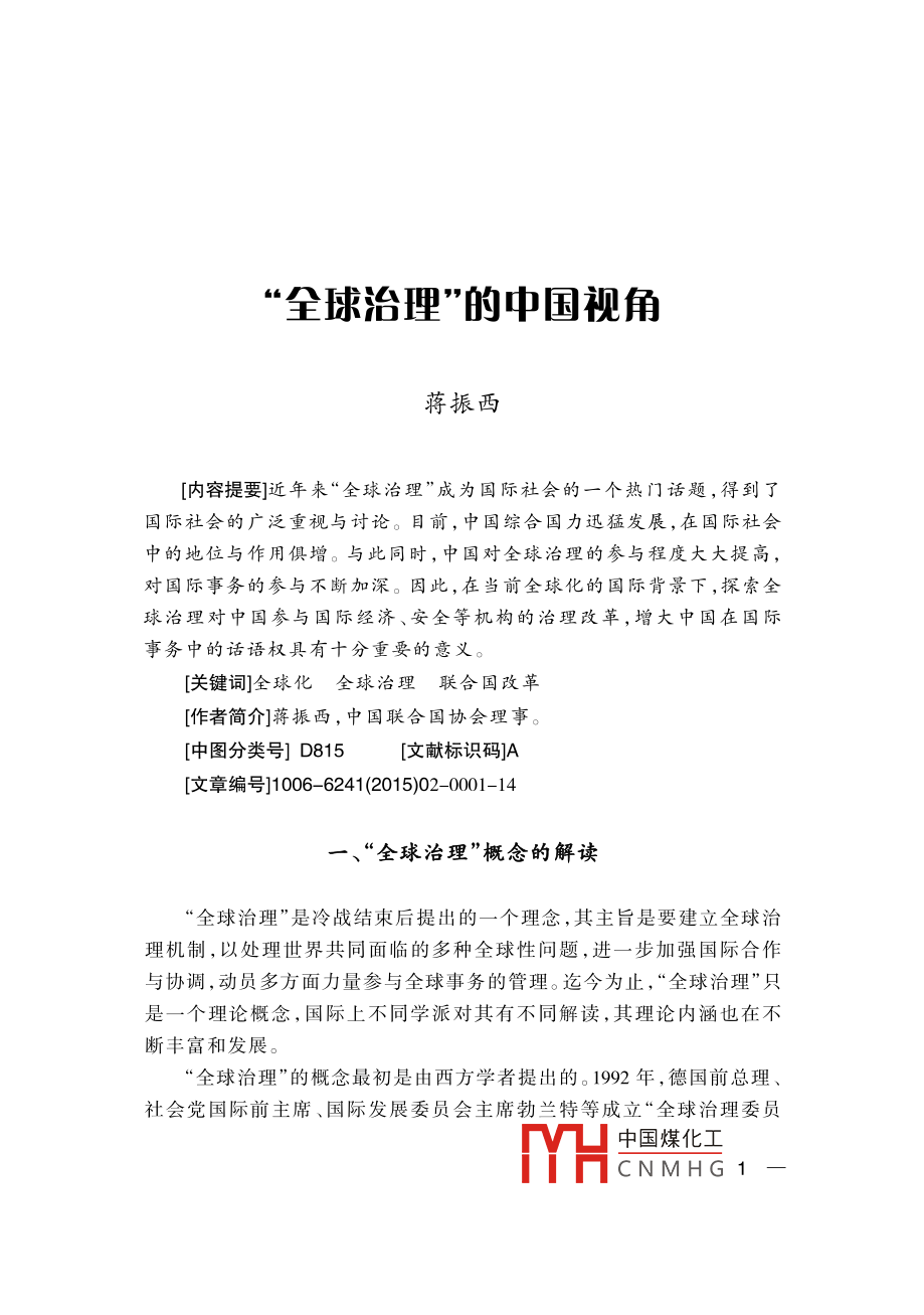 全球治理”的中國視角蔣振西[內(nèi)容提要]近年來“全球治理”成為國際社會的一個熱門話題,得到了國際社會的廣泛重視與討論。目前,中國綜合國力迅猛發(fā)展,在國際社會中的地位與作用俱增。與此同時,中國對全球治理的參與程度大大提高對國際事務(wù)的參與不斷加深。因此,在當前全球化的國際背景下,探索全球治理對中國參與國際經(jīng)濟、安全等機構(gòu)的治理改革,增大中國在國際事務(wù)中的話語權(quán)具有十分重要的意義。[關(guān)鍵詞]全球化全球治理聯(lián)合國改革作者簡介]蔣振西,中國聯(lián)合國協(xié)會理事。[中圖分類號]D815[文獻標識碼]A[文章編號]1006-6241(2015)02-0001-14“全球治理”概念的解讀¨全球治理”是冷戰(zhàn)結(jié)束后提出的一個理念,其主旨是要建立全球治理機制,以處理世界共同面臨的多種全球性問題,進一步加強國際合作與協(xié)調(diào),動員多方面力量參與全球事務(wù)的管理。迄今為止,“全球治理”只是一個理論概念,國際上不同學派對其有不同解讀,其理論內(nèi)涵也在不斷豐富和發(fā)展?!蛑卫怼钡母拍钭畛跏怯晌鞣綄W者提出的。1992年,德國前總理、社會黨國際前主席、國際發(fā)展委員會主席勃蘭特等成立“全球治理委員中國煤化工CNMHG 12015年第2期會”,專門研究這一問題。該委員會在1995年聯(lián)合國成立50周年時,發(fā)表了標題為《我們的全球家園》的專題報告,呼吁國際社會開展廣泛合作,共同應對在全世界范圍出現(xiàn)的公共問題。迄今,該報告已經(jīng)發(fā)表20年了。20年來,國際形勢發(fā)生了巨大變化:2001年發(fā)生了針對美國的“9ll”恐怖主義襲擊;美國在阿富汗和伊拉克發(fā)動了兩場戰(zhàn)爭;2008年,世界性金融危機爆發(fā),國際經(jīng)濟陷亼低迷。在此背景下,¨全球治理”概念再次受到關(guān)注(一)“全球治理”的定義1995年發(fā)表的《我們的全球家園》報告中對“全球治理”作了以下闡述:“全球治理是個人與機構(gòu),公共部門與私營部門管理共同事務(wù)的多種方式的總合。它是使相互沖突或不同利益的各方得以調(diào)和并采取聯(lián)合行動的持續(xù)過程。這既包括通過擁有權(quán)力的官方正式機構(gòu)和機制強制執(zhí)行,也包括有關(guān)人員或機構(gòu)認為是符合他們利益的非正式安排?!边@是迄今對“全球治理”較為權(quán)威的解釋,其中強調(diào)了全球治理參與者的多元化和所處理問題的多樣性,拓展了現(xiàn)有國際治理機制的治理方式。(二)全球治理的范圍全球治理是一個廣泛的世界議程,包括眾多領(lǐng)域:一是全球安全,包括國家間或區(qū)域性的武裝沖突、一些國家爆發(fā)的內(nèi)戰(zhàn)和動亂、國際核武器的擴散、常規(guī)武器的貿(mào)易與非法流通等;二是國際經(jīng)濟發(fā)展,包括保護全球金融市場、處理債務(wù)危機等;三是生態(tài)環(huán)境的保護,包括資源的合理利用與開發(fā)、生物多樣性的保護、應對氣候變化等;四是打擊國際恐怖活動,以及走私、毒品交易等跨國犯罪活動;五是保護基本人權(quán),提供人道主義救援、防止流行疾病的傳播等?!段覀兊娜蚣覉@》報告將全球治理的對象確定為世界共同面對的全球性問題,涵蓋政治、經(jīng)濟、安全、文化等多個領(lǐng)域。報告還著重強調(diào)了軍事變革、軍備競賽、軍火貿(mào)易、武裝沖突等多種安全威脅,并提到了經(jīng)濟發(fā)展不平衡造成南北國家差距擴大、發(fā)展中國家貧困等問題。此外,[1 ]the Commission on Global Governance, Our Global Neighborhood, Oxford University1995中國煤化工CNMHG全球治理”的中國視角<<<2008年世界金融危機爆發(fā)后,全球經(jīng)濟治理也被列為主要議程之(三)全球治理的主體全球治理的主體大概分為三個層面:第一層面是主權(quán)國家政府及有關(guān)當局。主權(quán)國家是全球治理的基本層面,也是國際上最重要的行為主體。它們擁有重要的國家治理權(quán)力和資源,也承擔著全球治理的責任和義務(wù);第二層面是政府間的國際組織,主要包括聯(lián)合國、世界銀行、世界貿(mào)易組織、國際貨幣基金組織等世界性綜合國際組織和專門組織。此外,由地區(qū)國家組成的地區(qū)性組織也是其重要組成部分,如歐洲聯(lián)盟、非洲聯(lián)盟、亞太經(jīng)濟合作組織等。政府間國際組織是解決國際事務(wù)的主力軍,直發(fā)揮著重要作用與影響;第三層面是非政府國際組織,由非國家行為體組成,包括民營商業(yè)機構(gòu)、非政府組織和民眾組織。據(jù)國際組織聯(lián)盟統(tǒng)計,目前世界上共有6.7萬個國際組織,其中大多數(shù)為非政府組織,包括各種學術(shù)團體、研究機構(gòu)、專業(yè)協(xié)會和跨國商業(yè)組織等。山其中,“國際紅十字協(xié)會”“綠色和平組織”等最為知名。它們組織世界論壇,提供研究報告,為政府出謀劃策,或單獨采取大規(guī)模行動,已經(jīng)成為實行人道主義援助、保護生態(tài)環(huán)境的重要力量。另外,非政府組織的有些活動是與政府共同組織的,比如每年在瑞士達沃斯召開的世界經(jīng)濟論壇,除了邀請世界頂尖經(jīng)濟學家外,還邀請政府官員出席,共同為世界經(jīng)濟把脈會診。(四)全球治理的方式與規(guī)則全球治理的目標是建立完善的國際機制,制定有效的國際規(guī)章,實現(x