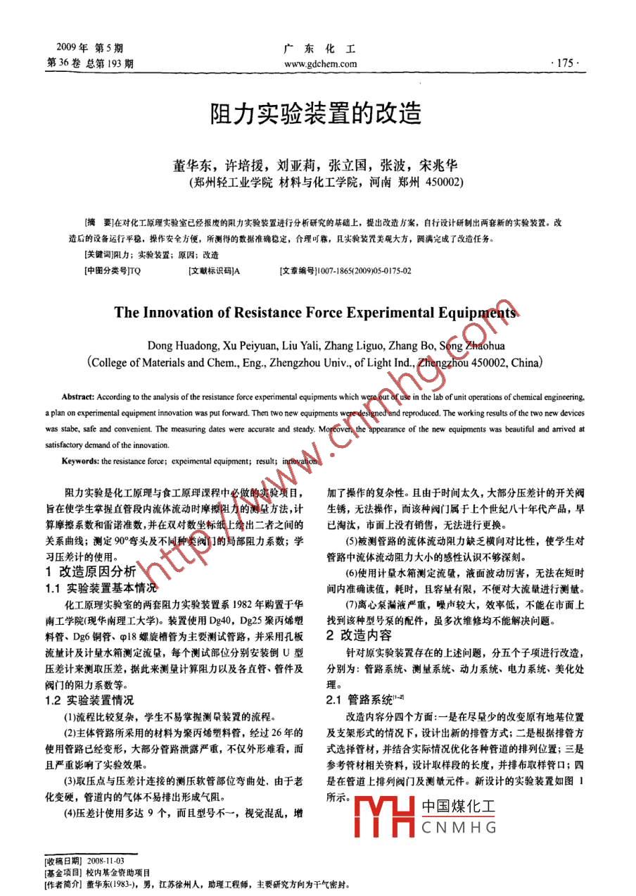 年第5期廣東化工第36卷總第193期www.gdchem.com175阻力實(shí)驗(yàn)裝置的改造董華東,許培援,劉亞莉,張立國,張波,宋兆華鄭州輕工業(yè)學(xué)院材料與化工學(xué)院,河南鄭州450002)摘要]在對化工原理實(shí)驗(yàn)室已經(jīng)報(bào)廢的阻力實(shí)驗(yàn)裝置進(jìn)行分析研究的基礎(chǔ)上,提出改造方案,自行設(shè)計(jì)研制出兩套新的實(shí)驗(yàn)裝置。改造后的設(shè)備運(yùn)行平穩(wěn),操作安全方便,所測得的歌據(jù)準(zhǔn)確穩(wěn)定,合理可靠,且實(shí)驗(yàn)裝置美觀大方,闕滿完成了改造任務(wù)。關(guān)鍵詞阻力;實(shí)驗(yàn)裝置;原因;改造中圖分類號TQ文賦標(biāo)識碼]A[文章編號]007-186502009)05017502The Innovation of Resistance Force Experimental EquipmentsDong Huadong, Xu Peiyuan, Liu Yal, Zhang Liguo, Zhang Bo, Song ZhaohuaCollege of Materials and Chem., Eng, Zhengzhou Univ, of Light Ind, Zhengzhou 450002, China)Abstract: According to the analysis of the resistance force experimental equipments which were out of use in the lab of unit operations of chemical engineering,was stabe, safe and convenient The measuring dates were accurate and steady. moreover, the appearance of the new equipments was beautiful and arrived atsatisfactory demand of the innovation.Keywords: the resistance force; expeimental equipment; result; innovation阻力實(shí)驗(yàn)是化工原理與食工原琿課程中必做的實(shí)驗(yàn)項(xiàng)目,加了操作的復(fù)雜性。且由于時(shí)間太久,大部分壓差計(jì)的開關(guān)閥旨在使學(xué)生掌握直管段內(nèi)流體流動時(shí)摩擦阻力的測量方法,計(jì)生銹,無法操作,而該種閥門屬于上個(gè)世紀(jì)八十年代產(chǎn)品,早算摩擦系數(shù)和雷諾準(zhǔn)數(shù),并在雙對數(shù)坐標(biāo)紙上繪出二者之間的已淘汰,市面上沒有銷售,無法進(jìn)行更換。關(guān)系曲線;測定90°彎頭及不同種類閥門的局部阻力系數(shù);學(xué)(5)被測管路的流體流動阻力缺乏橫向?qū)Ρ刃?使學(xué)生對習(xí)壓差計(jì)的使用管路中流體流動阻力大小的感性認(rèn)識不夠深刻。1改造原因分析(6)使用計(jì)量水箱測定流量,液面波動厲害,無法在短時(shí)1.1實(shí)驗(yàn)裝置基本情況間內(nèi)準(zhǔn)確讀值,耗時(shí),且容量有限,不便對大流量進(jìn)行測量?;ぴ韺?shí)驗(yàn)室的兩套阻力實(shí)驗(yàn)裝置系1982年購置于華(7)離心泵漏液嚴(yán)重,噪聲較大,效率低,不能在市面上南工學(xué)院現(xiàn)華南理工大學(xué))。裝置使用D940,Dg25聚丙烯塑找到該種型號泵的配件,雖多次維修均不能解決問題。料管、Dg6銅管、q18螺旋槽管為主要測試管路,并采用孔板2改造內(nèi)容流量計(jì)及計(jì)量水箱測定流量,每個(gè)測試部位分別安裝倒U型針對原實(shí)驗(yàn)裝置存在的上述問題,分五個(gè)子項(xiàng)進(jìn)行改造,壓差計(jì)來測取壓差,據(jù)此來測量計(jì)算阻力以及各直管、管件及分別為:管路系統(tǒng)、測量系統(tǒng)、動力系統(tǒng)、電力系統(tǒng)、美化處閥門的阻力系數(shù)等理12實(shí)驗(yàn)裝置情況2.1管路系統(tǒng)(1)流程比較復(fù)雜,學(xué)生不易掌握測碌裝置的流程。改造內(nèi)容分四個(gè)方面:一是在盡量少的改變原有地基位置(2)主體管路所采用的材料為丙烯塑料管,經(jīng)過26年的及支架形式的情況下,設(shè)計(jì)出新的排管方式;二是根據(jù)排管方使用管路已經(jīng)變形,大部分管路泚露嚴(yán)重,不僅外形難看,而式選擇管材,并結(jié)合實(shí)際情況優(yōu)化各種管道的排列位置;三是且嚴(yán)重影響了實(shí)驗(yàn)效果。參考管材相關(guān)資料,設(shè)計(jì)取樣段的長度,并排布取樣管口;四(3)取壓點(diǎn)與壓差計(jì)連接的測壓軟管部位彎曲處,由于老是在管道上排列閥門及測量元件。新設(shè)計(jì)的實(shí)驗(yàn)裝置如圖化變硬,管道內(nèi)的氣體不易排出形成氣阻(4)壓差計(jì)使用多達(dá)9個(gè),而且型號不一,視覺混亂,增中國煤化工CNMHG收稿日期]2081103基金項(xiàng)目校內(nèi)基金資助項(xiàng)目作者簡介董華東(1983),男,江蘇徐州人,助理工程師,主要研究方向?yàn)楦蓺饷芊鈴V東化工2009年第5期176www.gdchem.com第36卷總第193期1,2,3,4管道;5,7,8,13-波測敏元件;6,9—局部阻力管;10,Ⅱ,12-閥門;14,15,16,17,18球閥;19離心泵;20—水箱;21-法蘭(測壓孔圖中并未標(biāo)示圖1實(shí)驗(yàn)裝置Fig. I Experimental equipment原有裝置只能測敏兩個(gè)直管段的流體阻力及一個(gè)彎頭的增加的級沖器用來穩(wěn)定壓力,上接所有的測壓點(diǎn),每次測阻力,實(shí)驗(yàn)僅是使學(xué)生掌握阻力測量的方法,實(shí)驗(yàn)結(jié)果單調(diào),量一個(gè)部位的相應(yīng)壓差,根據(jù)面板上的閥門調(diào)節(jié)測壓管路。在缺乏對比性。通過該設(shè)計(jì),可以使學(xué)生測量同種直徑不同管材面板上明確標(biāo)示了各個(gè)管段、閥門及管件的旋轉(zhuǎn)閥門,學(xué)生操的阻力系數(shù),不同直徑同種管材的阻力系數(shù),擴(kuò)大了縱向及橫作十分方便。向的對比;測量同種管徑不同閥門的阻力系數(shù),及彎頭、突擴(kuò)2.3動力系統(tǒng)管的阻力系數(shù),對局部阻力有更加深刻的認(rèn)識;學(xué)習(xí)使用各種改造主要是經(jīng)過參考相關(guān)資料,對管路的阻力進(jìn)行初步估流量測量元件,加深了對測量機(jī)理的認(rèn)識。算,選擇適當(dāng)揚(yáng)程及流量的