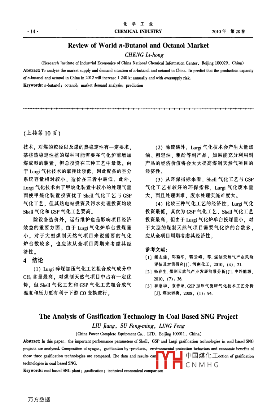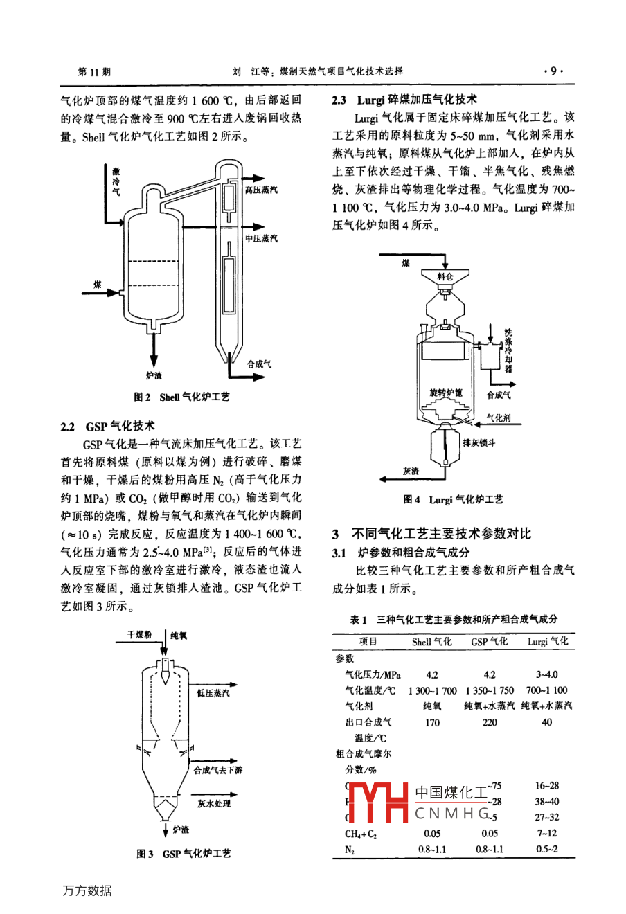 化學(xué)工業(yè)第28卷第11期8CHEMICAL INDUSTRY2010年11月煤制天然氣項目氣化技術(shù)選擇劉江,宿鳳明,凌鋒(中國電能成套設(shè)備有限公司,北京10011)摘要:分析了She'氣化工藝,CSP氣化工藝與Lugi氣化工藝在煤制天然氣項目參數(shù)、粗合成氣成分、主要副產(chǎn)品產(chǎn)量、環(huán)保指標(biāo)以及經(jīng)濟性,為煤制天然氣項目中氣化技術(shù)的選擇提供參考和依據(jù)。關(guān)鍵詞:煤氣化廠;煤氣化;技術(shù)經(jīng)濟對比文章編號:1673-9647(2010)11-0008-04中圖分類號:TQ54文獻標(biāo)識碼:A隨著可持續(xù)發(fā)展戰(zhàn)略和加強環(huán)保等政策的實成分、主要副產(chǎn)品產(chǎn)量、環(huán)保指標(biāo)以及經(jīng)濟性的施,國內(nèi)對天然氣的需求與日俱增。國務(wù)院發(fā)展差異,為煤制天然氣項目中氣化技術(shù)的選擇提供研究中心市場經(jīng)濟研究所研究報告預(yù)計,2015年參考和依據(jù)。我國天然氣消費量將增長至1500億m,2020年1煤制天然氣工藝簡介增長至3000億m3。而與此同時,我國天然氣產(chǎn)煤制天然氣流程見圖1。如圖1所示,煤制天量將分別為1400億m3、1500億m3左右,因此然氣包括以下幾大部分:空分、煤氣化,凈化(C0我國未來天然氣的供需將出現(xiàn)很大的缺口。由于變換,酸性氣體脫除、冷凍)、甲烷化(含甲烷化、我國巨大的天然氣消費市場及強勁的增長趨勢,壓縮、干燥)及硫回收等裝置2。氣化爐是源頭許多大型能源企業(yè)相繼開展煤制天然氣項目。煤備,一般采用煤加壓氣化技術(shù)生產(chǎn)粗合成氣。由于氣化工藝為煤制天然氣項目的源頭,是需要重點粗合成氣中的CO和H2成分比例不適合直接用考慮的環(huán)節(jié)。針對項目實際情況,正確選擇煤氣于天然氣合成,為滿足甲烷化的需要,需通過部化技術(shù),對于整個項目的成敗至關(guān)重要。本文分析分C0變換,調(diào)整合成氣中H/C比。在變換工藝了She氣化工藝、GSP氣化工藝與Lurg氣化工后,脫除酸性氣體中HS及CO2等,然后再通過藝在煤制天然氣工藝中的重要性能參數(shù)及對系統(tǒng)甲烷化及干燥,生產(chǎn)合成天然氣產(chǎn)品,合格產(chǎn)品的影響,對比分析了這三種氣化技術(shù)的粗合成氣送管網(wǎng)??辗盅b置煤天化/氣變換適宜的脫硫脫碳凈的甲烷化天然號干燥CO/H2比合成氣硫回收卜硫或硫圖1煤制天然氣流程2氣化技術(shù)加熱到一定溫度后,與中壓蒸汽混合,經(jīng)工藝噴2IShe氣化技術(shù)嘴送人爐內(nèi)。煤粉與氧氣在40MPa表壓下,發(fā)Shel.氣化(廢鍋流程)是一種氣流床加壓氣生部分氧化反應(yīng),轉(zhuǎn)化為高有效氣體含量的粗合化工藝。氣化用的原料煤(粒度≤30mm)由原成氣中國煤化工氣化爐頂排出。煤貯運系統(tǒng)的皮帶式輸送機送入碎煤倉中,經(jīng)過收稿日CNMHG破碎、磨煤及干燥過程后,由N2或CO2輸送進人作者簡介:劉江(1962-),男,北京人,副總經(jīng)理,從事專業(yè)氣化爐噴嘴;而來自空分的氧氣,經(jīng)氧氣預(yù)熱器熱能動力工程工作第11期劉江等:煤制天然氣項目氣化技術(shù)選擇氣化爐頂部的煤氣溫度約1600℃,由后部返回2.3 Lurgi碎煤加壓氣化技術(shù)的冷煤氣混合激冷至900℃左右進人廢鍋回收熱urgi氣化屬于固定床碎煤加壓氣化工藝。該量。 Shell氣化爐氣化工藝如圖2所示。工藝采用的原料粒度為5-50mm,氣化劑采用水蒸汽與純氧;原料煤從氣化爐上部加入,在爐內(nèi)從上至下依次經(jīng)過干燥、干餾、半焦氣化、殘焦燃高壓蒸汽燒、灰渣排出等物理化學(xué)過程。氣化溫度為700~1100℃,氣化壓力為30-40MPa。 Lurgi碎煤加壓氣化爐如圖4所示。中壓蒸汽合成氣圖2Shl氣化爐工藝旋轉(zhuǎn)爐篦‖合成氣氣化劑22GSP氣化技術(shù)GSP氣化是一種氣流床加壓氣化工藝。該工藝排灰鎖斗首先將原料煤(原料以煤為例)進行破碎、磨煤灰和干燥,干燥后的煤粉用高壓№2(高于氣化壓力約1MPa)或CO2(做甲醇時用CO2)輸送到氣化圖4 Lurgi氣化爐工藝爐頂部的燒嘴,煤粉與氧氣和蒸汽在氣化爐內(nèi)瞬間(≈10s)完成反應(yīng),反應(yīng)溫度為1400-1600℃,3不同氣化工藝主要技術(shù)參數(shù)對比氣化壓力通常為25-40MPa;反應(yīng)后的氣體進31爐參數(shù)和粗合成氣成分入反應(yīng)室下部的激冷室進行激冷,液態(tài)渣也流入比較三種氣化工藝主要參數(shù)和所產(chǎn)粗合成氣激冷室凝固,通過灰鎖排入渣池。CSP氣化爐工成分如表1所示。藝如圖3所示。表1三種氣化工藝主要參數(shù)和所產(chǎn)粗合成氣成分于煤粉|純氧項目She氣化GSP氣化 Lurgi氣化參數(shù)氣化壓力MPa423~40低壓蒸汽氣化溫度r℃C1300-17001350-1750700-1100純氧純氧+水蒸汽純氧+水蒸汽出口合成氣度粗合成氣摩爾合成氣去下游分?jǐn)?shù)%灰水處理dH中國煤化工CNMHGS 27-32爐渣CH+C?圖3GSP氣化爐工藝08~1.108-1.1化學(xué)工業(yè)CHEMICAL INDUSTRY2010年第28卷三種氣化技術(shù)中,由于 Lurgi氣化技術(shù)的氣化量、廢水排放量及廢水的處理難度有較大區(qū)別,溫度比較低,溫度范圍控制在700-1100℃之間,有必要進行對比分析因此其合成氣中CH4摩爾分?jǐn)?shù)能到7%-12%,遠由于 Shell氣化為干法氣流床氣化,而且選擇高于She及CSP氣化技術(shù)的005%。粗合成氣中廢鍋流程,因此在生產(chǎn)過程中產(chǎn)生的廢水最少。較高的CH4含量能夠有效控制后續(xù)裝置的規(guī)模及GSP氣化技術(shù)采用水激冷流程,氣化爐產(chǎn)生的廢水相