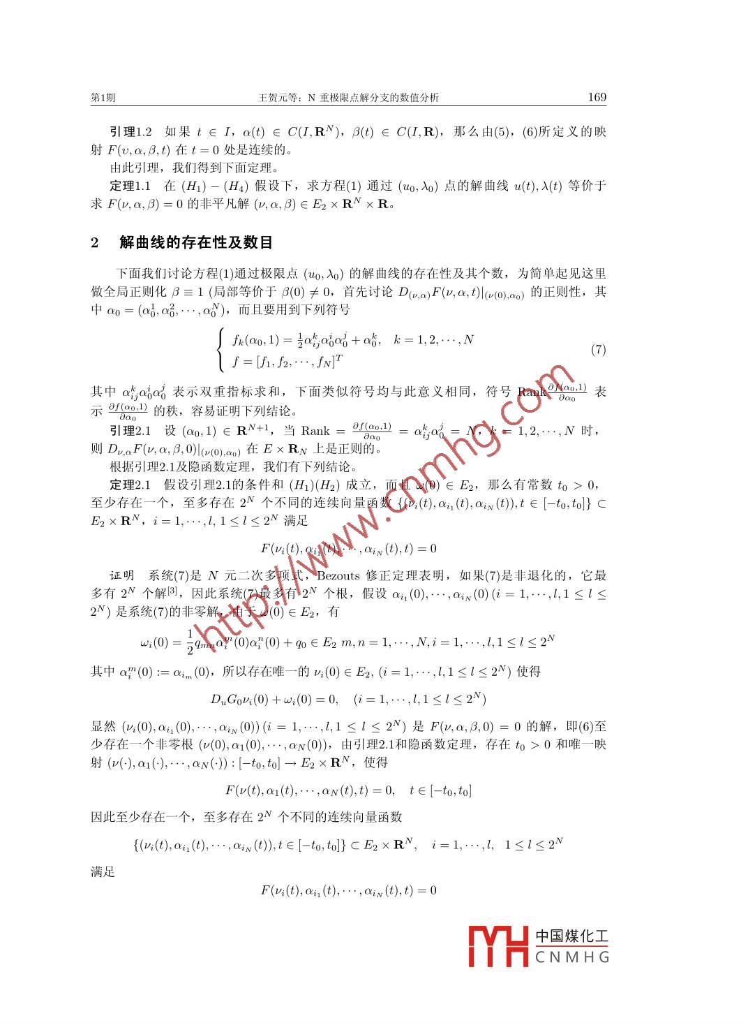 第22卷第1期工程數(shù)學學報2005年02月CHINESE JOURNAL OF ENGINEERING MATHEMATICSFeb.2005文章編號:1005-30852005)01-0167-04N重極限點解分支的數(shù)值分析*王賀元,徐美進,王偉志,襲著有(遼寧工學院數(shù)理系,錦州121001)摘要:對N階分歧問題極限點解分支的數(shù)值逼近問題進行了研究。給出了解分支的結(jié)構(gòu)及求解分支的擴充系統(tǒng),證明了擴充系統(tǒng)解的存在性,討論了解曲線的數(shù)目,并給出了誤差估計關鍵詞:N重極限點;分歧方程;數(shù)值分析分類號:AMS(200065J15;47H15:58F14中圖分類號:O175.29;O17791文獻標識碼:A1N重極限點處解分支的結(jié)構(gòu)及求解分支的擴充系統(tǒng)方程奇異點處解的數(shù)值逼近是分歧數(shù)值計算的焦點,文獻(1]討論了分歧點處解分支的數(shù)值逼近問題,本文討論另一類奇異點,極限點處解分支的數(shù)值逼近問題設E是 Hilbert空間,G:E×R→E是非線性c3映射,考慮參數(shù)獨立方程假設點(u,0)∈E×R滿足(H1)Go:=G(u0,Ao)=0這里及以后的下標0均表示相應的函數(shù)或算子在(0,0)點的值(H2)DGo是指標為0的 Fredholm算子,0為其一個代數(shù)重數(shù)為N的特征值。(H3) dim(ker(Du)=N(H4) DAGo Range(D, Go在(H1)-(H3)假設下,方程(1)稱為N階分歧方程,如果條件(H4)成立,(u0,)0)稱為方程(1)的N重極限點。下面我們討論N重極限點(uo,A)處解分支的結(jié)構(gòu)及其數(shù)值逼近,所用符號D,D2,Dx,…分別代表全導數(shù)或相應的偏導數(shù),由 Fredholm算子理論可知,存在p,∈E,=1,2,…,N,使得E1=ker(D2G0)=span{1,92,…,N}(9,9)=6E1= ker(D Go)=span(1, /2,., Nvi, vi)=dijE2=Range(D Go)=alue (u, api)E2= Range(D,Gt){ulu∈E(u,p)=01≤i≤N}E=E1⊕E2=E1⊕E2收稿日期:2002-11-26.作者簡介:王賀元(1963年3月生),男,博士,教授,研究方向:分歧理論及其數(shù)值分析基金項目:國家重大基礎研究專項基金(973)(G19992801-7);遼寧工學院博士啟動基金中國煤化工CNMHG第22卷其中D2G是DCo的共軛算子,(,)是ExE上的對偶積或內(nèi)積,⊕表示E子空間的直和。以后將用到下列符號i=DmG09;9;1≤i,j≤N=(k,9)1≤k≤Ngo= DAGoa6=(vk,9)1≤k≤N眾所周知2,并非方程(1)的所有根(u0,0)都產(chǎn)生解分支,然而孤立根卻是如此2,我們僅考慮此種情況下解分支曲線的結(jié)構(gòu)及路徑跟蹤問題引理11在(H1)-(H4)假設下,方程(1)在(o,A0)處解分支曲線具有如下形式∫u()=0+2+P,v∈B2A(t)=Aot∈T=[-to,tol這里a=(a2,a2,…,aN)∈RN,B∈R是t的函數(shù),a2y;=∑a;y;為張量記法。證明如果G(v(t),A(t)=0|≤to并且(v(0),入(0)=(0,o),在t=0處關于t求導得D Gou(0)+ DAGoA(0)=0由(H4)必有)=0,因此v'(0)=ta+t(t),v(t)∈E2,(t)=+ap1=09,結(jié)合(2)我們可以假設u()=20+t),t∈I=-to,tol所以有(0)=a2+v(0),X(0)=B(0)=0,因此,v(0)=0,故有t2u(t)u(t)∈EA(t)=o+tB(t)t∈I=[-to,tol證畢為尋求合適的函數(shù)v,a,B,定義如下擴充系統(tǒng)F:E×RN×R→E×RMF(,a, B, t)≠0WN, v))Go(0)+w(0)F(,a, B,0)=FIt其中()=(t)a(t)+96(t)(0)=5qijaoao, a0=a(0), Bo= 6(0中國煤化工CNMHG王賀元等:N重極限點解分支的數(shù)值分析引理12如果t∈I,a(t)∈C(I,RN),B(t)∈C(I,R),那么由(5),(6)所定義的映射F(v,a,3,t)在t=0處是連續(xù)的。由此引理,我們得到下面定理定理11在(H1)-(H4)假設下,求方程(1)通過(0,A)點的解曲線u(t),A(t)等價于求F(va,B)=0的非平凡解(v,a,B)∈E2×RNxR。2解曲線的存在性及數(shù)目下面我們討論方程(1)通過極限點(uo,A0)的解曲線的存在性及其個數(shù),為簡單起見這里做全局正則化≡1(局部等價于(0)≠0,首先討論Dva)F(v,a,t)((o,a)的正則性,其中ao=(ab,a2,…,a),而且要用到下列符號f&(ao, 1)=202 aao+ao, kf=[f1,f2,…,fN]其中aaab表示雙重指標求和,下面類似符號均與此意義相同,符號Rank"02表示y0的秩,容易證明下列結(jié)論引理21設(a0,1)∈RN+1,當Rank=B0=a2a=N,k=1,2,…,N時,則DaF(,a,A,0)(m(0)a0)在ExRN上是正則的根據(jù)引理2.1及隱函數(shù)定理,我們有下列結(jié)論。定理21假設引理21的條件和(H1)(H2)成立,而且u(0)∈E,那么有常數(shù)to>0,至少存在一個,至多存在2N個不同的連續(xù)向量函數(shù){(v1(t),a1(t),aN(t),t∈(-to,tol}cE21,…,,1≤l≤2N滿足(vi(t), ai(t),證明系統(tǒng)(7)是N元二次多項式, Bezout修正定理表明,如果(7)是非退化的,它最多有2N個解,因此系統(tǒng)(7)最多有2N個根,假設aa1(O),…,a3N(0)(=1,…,,1≤l≤2)是系統(tǒng)(7)的非零解,由于(0)∈E2,有u(0)=qmno(O)a00)+∈E2m,n=1,…,N,=1,…1,1≤l≤2其中a(0):=a1n(0),所以存在唯一的n(0)∈E2,(=1,…,l,1≤l≤2)使得DCov1(0)+u(0)=0,(i=1,…,,1≤l≤2N)顯然(n(O),a1(0),…,a(0)(=1,…,1,1≤1≤2)是F(v,a,3,0)=0的解,即(6)至少存在一個非零根(v(0),a1(0),…,aN(0),由引理21和隱函數(shù)定理,存在to>0和唯一映射((),a1(),…,aN():{-t0,to→E2×RN,使得F(u(t),a1(t),……,aN(t),t)=0,t∈[-to,tol因此至少存在一個,至多存在2N個不同的連續(xù)向量函數(shù){(v1(t),ai1(t),…,aN(1),t∈[-to,tl}cE2×RN,i=1,…,,1≤l≤2滿足F(v(t),aa1(t),…,aN(t),t)=0中國煤化工CNMHG第22卷證畢所以我們有下列結(jié)論推論21如果定理21的假設成立,方程(1)至少存在一個,至多存在2N個如下形式的不同解曲線相于(o,o)ui(t)=wotap+tvi(t)入(t)=A0∈[-to,to],這里a2=a;°參考文獻:[1 Mei Zhen. Numerical approximation of simple corank 2 bifurca tion problem[D]. Doctorate dissertation,of Marburg. 1999: 83-872 Dwight W. Decker, Multiple limit point bifurcation[J]. Journal of mathematical analysis and applications,1980:75:417-4303 Bouligaand G. Revue Gener, Sc Pur Appl, Bull Soc Philomath, 1984: 55Numerical Analysis of Solution Branches of Multiple Limit PointWANG He-yuan, XU Mei-jin, WANG Wei-zhi, XI Zhu-youDepartment of Mathematics and P