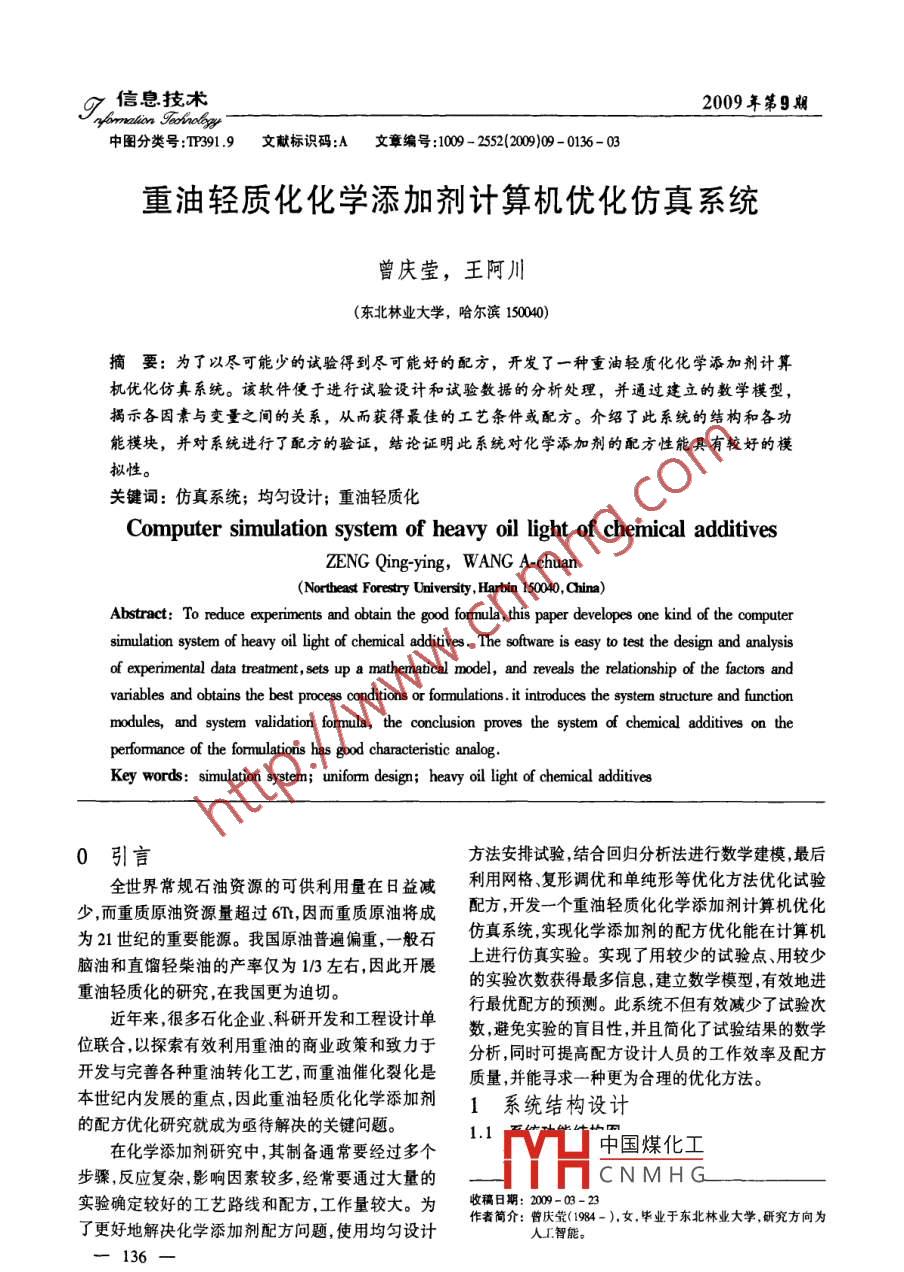 信息技術2009年第9期mation Ioholoy中圖分類號:TP391.9文獻標識碼:A文章編號:1009 - 252009)09- 0136- 03重油輕質(zhì)化化學添加劑計算機優(yōu)化仿真系統(tǒng)曾慶瑩,王阿川(東北林業(yè)大學,哈爾濱150040)摘要:為了以盡可能少的試驗得到盡可能好的配方,開發(fā)了一種重油輕質(zhì)化化學添加劑計算機優(yōu)化仿真系統(tǒng)。該軟件便于進行試驗設計和試驗數(shù)據(jù)的分析處理,并通過建立的數(shù)學模型,揭示各因素與變量之間的關系,從而荻得最佳的工藝條件或配方。介紹了此系統(tǒng)的結構和各功能模塊,并對系統(tǒng)進行了配方的驗證,結論證明此系統(tǒng)對化學添加劑的配方性能具有較好的模擬性。關鍵詞:仿真系統(tǒng);均勻設計;重油輕質(zhì)化Computer simulation system of heavy oil light of chemical additivesZENG Qing ying, WANG A-chuan(Northeast Forestry University , Harbin 150040,China)Abstract: To reduce experiments and obtain the good formula, this paper developes one kind of the computersimulation system of heavy oil light of chemical additives. The software is easy to test the design and analysisof experimental data treatment, sets up a mathematical model, and reveals the relationship of the factors andvariables and obtains the best process conditions or formulations . it introduces the system structure and functionmodules, and system validation formula, the conclusion proves the system of chemical additives on theperformance of the formulations has good characteristic analog.Key words: simulation system; uniform design; heavy oil light of chemical additives0引言方法安排試驗,結合回歸分析法進行數(shù)學建模,最后全世界常規(guī)石油資源的可供利用量在日益減利用網(wǎng)格、復形調(diào)優(yōu)和單純形等優(yōu)化方法優(yōu)化試驗少,而重質(zhì)原油資源量超過6Tt,因而重質(zhì)原油將成配方,開發(fā)一個重油輕質(zhì)化化學添加劑計算機優(yōu)化為21世紀的重要能源。我國原油普遍偏重,一般石.仿真系統(tǒng),實現(xiàn)化學添加劑的配方優(yōu)化能在計算機腦油和直餾輕柴油的產(chǎn)率僅為1/3 左右,因此開展上進行仿真實驗。實現(xiàn)了用較少的試驗點、用較少的實驗次數(shù)獲得最多信息,建立數(shù)學模型,有效地進重油輕質(zhì)化的研究,在我國更為迫切。近年來,很多石化企業(yè)科研開發(fā)和工程設計單行最優(yōu)配方的預測。此系統(tǒng)不但有效減少了試驗次位聯(lián)合,以探索有效利用重油的商業(yè)政策和致力于數(shù),避免實驗的盲目性,并且簡化了試驗結果的數(shù)學分析,同時可提高配方設計人員的工作效率及配方開發(fā)與完善各種重油轉化工藝,而重油催化裂化是質(zhì)量,并能尋求一種更為合理的優(yōu)化方法。本世紀內(nèi)發(fā)展的重點,因此重油輕質(zhì)化化學添加劑1系統(tǒng)結構設計的配方優(yōu)化研究就成為亟待解決的關鍵問題。1.1在化學添加劑研究中,其制備通常要經(jīng)過多個中國煤化工步驟,反應復雜,影響因素較多,經(jīng)常要通過大量的MHCNMHG實驗確定較好的工藝路線和配方,工作量較大。為收稿日期: 2009-03- 23作者簡介:曾慶瑩(1984-),女. 畢業(yè)于東北林業(yè)大學,研究方向為了更好地解決化學添加劑配方問題,使用均勻設計人工.,智能。一136一計算機優(yōu)化仿真系統(tǒng)|因例車|數(shù)關助變系化|線型臨對美形|多十對性線多造回回回歸回歸¥1系統(tǒng)功能結構圖1.2系統(tǒng)功能簡介數(shù)據(jù),也稱為用戶數(shù)據(jù)庫,與系統(tǒng)數(shù)據(jù)庫分離。模型(1)試驗設計數(shù)據(jù)庫中的數(shù)據(jù)是直接參與配方優(yōu)化計算的數(shù)據(jù),用戶可逐個輸人因數(shù)值,也可輸人因數(shù)的上下用戶也可通過人機接口對該數(shù)據(jù)庫進行編輯、維護,限,系統(tǒng)根據(jù)所需的試驗次數(shù),自動平均分配因數(shù)其中數(shù)據(jù)的修改與系統(tǒng)數(shù)據(jù)庫無關。值。系統(tǒng)根據(jù)用戶輸人的試驗數(shù)據(jù)(因素數(shù)級水平(7)文件操作數(shù))安排試驗,用戶也可根據(jù)試驗因數(shù)是否有約束條系統(tǒng)生成的各種模型和配方可以文件形式存件,選擇有約束配方還是無約束配方進行設計。儲,也可對配方文件進行打開瀏覽、換名存儲或打印(2)模型分析輸出等操作。用戶可根據(jù)試驗的結果集,選擇適當?shù)幕貧w對(8)系統(tǒng)幫助應關系。根據(jù)以往的經(jīng)驗選擇回歸模型分析方法和為用戶提供有關系統(tǒng)使用的各種幫助信息。回歸計算方法,分析出回歸模型后,進行顯著性檢2重油 輕質(zhì)化化學添加劑試驗驗,如果此模型不顯著,重新選擇回歸模型分析方法要使重油輕質(zhì)化,就要打破傳統(tǒng)重油乳化技術,和回歸計算方法,直至模型顯著為止。研究一種化學添加劑,使它降低粘度、脫硫、提高熱(3)試驗優(yōu)化系統(tǒng)為用戶提供了三種優(yōu)化方法:單純形,網(wǎng)格值,使其燃料油能充分燃燒。針對重油具有粘度高、法,復形調(diào)優(yōu)法。用戶可根據(jù)優(yōu)化結果配置試驗數(shù)流動性差、閃點高、可燃性差等特點,以增加(H/C)a值為主攻方向,使其接近柴油(H/C)a值1.72"。據(jù),進行試驗。HS-A柴油機燃料油技術的關鍵是化學添加劑,(4)繪制因數(shù)變化曲線繪制目標與各因素之間的關系曲線,各因素之在化學添加劑中,以加氫劑為主進行反復試驗,尋找間的影響曲線。幫助用戶