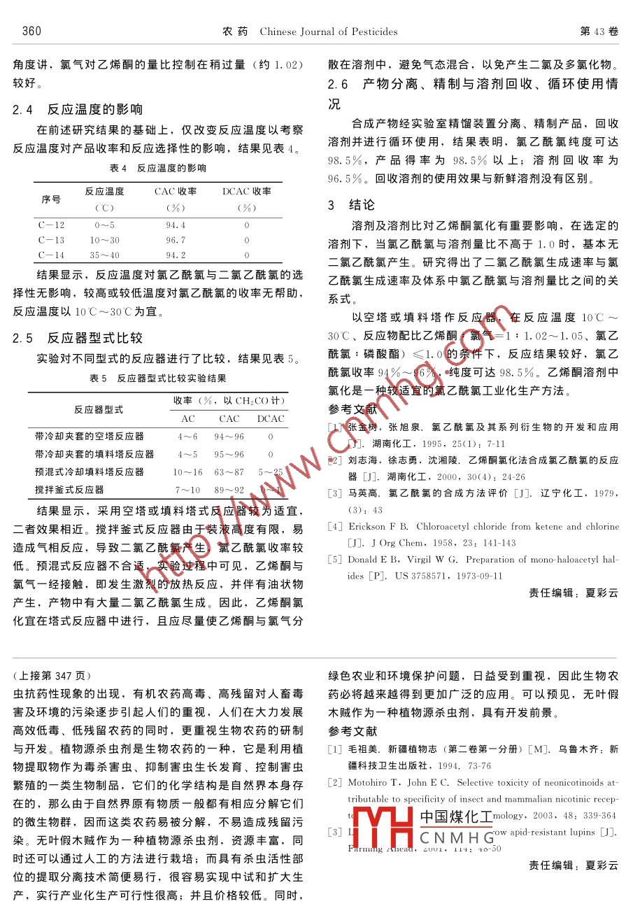 ,第43卷第8期農(nóng)藥Vol. 43 No. 82004年8月Chinese Joumal of Pesiticides .Aug. 2004生產(chǎn)工藝乙烯酮氯化法合成氯乙酰氯張金樹(湖南化工研究院,長沙410007)摘要研究了乙烯酮氯化法合成氯乙酰氯。考察了溶劑、溶劑比、氯氣配比、反應(yīng)溫度及反應(yīng)器型式等對乙烯酮氯化的影響。得出溶劑及溶劑比對乙烯酮氯化有重要影響。以空塔或填料塔作反應(yīng)器,在反應(yīng)溫度10'C~30C,反應(yīng)物配比乙烯酮:氯氣=1 : 1.02~1.05,氯乙酰氯:溶劑磷酸酯≤1.0的條件下,基本無二氯乙酰氯產(chǎn)生,氯乙酰氯收率94%~96%,純度可達(dá)91. 5%。關(guān)鍵詞氯乙酰氯, 乙烯酮,氯化.中圖分類號: TQ460. 31文獻(xiàn)標(biāo)識碼: A文章編號: 1006-0413(2004)08-358-03Synthesis of Chloroacetyl Chloride by the Chlorination of KeteneZHANG Jin-Shu( Hunan Research Institute of Chemical Industry, Changsha 410007,China)Abstract: The synthesis of chloroacetyl chloride by the chlorination of ketene was studied in the article. The affec-tion of solvent kinds, the solventratio, the chlorine ratio, the reaction temperature, and the reactor mode etc. tothe chlorination of ketene was investigated. It was found that solvent kinds and the solvent ratio had importanteffects on the chlorination of ketene, and the P-ester was a suitable solvent for the synthesis of chloroacetyl chlo-ride by the chlorination of ketene. In a column or packing column reactor, and under the conditions of the reactiontemperature of 10 to 30'C ,n(CH2CO) : n(Cl)=1 : 1.02-1. 05,and n(CAC) : n(P-ester)≤1. 0,dichloroacetylchloride wouldn't be formed, the yield of chloroacetyl chloride was 94 to 96%,and the purity of chloro -acetylchloride was upon 98. 5%.Key words: chloroacetyl chloride, ketene, chlorination氯乙酰氯是一種重要的有機(jī)合成中間體,廣泛應(yīng)用1實驗部分于農(nóng)藥、醫(yī)藥、染料、助劑等領(lǐng)域,還可用于萃取溶劑.制冷劑、滅火劑等。尤其在農(nóng)藥方面應(yīng)用最廣,用量亦1. 1主要試劑與儀器最大。試劑:乙烯酮,實驗室發(fā)生;氯氣,鋼瓶裝工業(yè)品;氯乙酰氯合成方法很多,但具有大規(guī)模工業(yè)化生產(chǎn)溶劑,市售化學(xué)純。價值的主要為氯乙酸光氣氯化法和乙烯酮氯化法,國際儀器: SP-502氣相色譜儀,具有雙氣路并裝有雙色上工業(yè)生產(chǎn)裝置主要基于這兩種。目前,國內(nèi)尚只有基譜柱,帶熱導(dǎo)檢測器。于氯乙酸氯化法的小規(guī)模生產(chǎn)裝置。該法是一種傳統(tǒng)工藝方法,存在多氯化物多,收率低;設(shè)備腐蝕較嚴(yán)重;1.2實驗方法 .氯氣耗量高、三廢量大且處理困難等問題,特別是反應(yīng)乙烯酮自發(fā)生系統(tǒng)經(jīng)計量后連續(xù)通入裝有溶劑的帶過程中不可避免地生成一定量的二氯乙酰氯,因與氯乙.冷卻裝置的反應(yīng)器中(溶劑可預(yù)先加入亦可連續(xù)加入),酰氯分離困難,導(dǎo)致產(chǎn)品純度低,影響產(chǎn)品的商用價值。同時,氯氣自鋼瓶經(jīng)計量連續(xù)通入反應(yīng)器中,反應(yīng)完取氯乙酸光氣氯化法則還因光氣是一種高毒監(jiān)控化學(xué)品而樣分析或反應(yīng)過程中連續(xù)取樣分析。受到諸多限制。比較而言,乙烯酮氯化法是-種產(chǎn)品純主反應(yīng):度高、收率高、氯氣耗量低、三廢少且易于工業(yè)化的較.CH2CO+Cl2-→CICH2COCI理想方法。因此,開展乙烯酮氯化法合成氯乙酰氯工藝中國煤化工研究對于提高我國氯乙酰氯生產(chǎn)工藝水平具有十分重要MHC N M H GHCOCI+ HC1↑的意義。CH2CO+ HCI一→CH;COCI收稿日期: 2003-08-25, 修返日期: 2004-02-13作者簡介:張金樹(1963-), 男,湖南湘潭人,高級工程師,MBA.主要從事化工開發(fā)研究、設(shè)計與生產(chǎn)經(jīng)營管理工作。肪數(shù)據(jù)5386033E- mail: kingsh- zhang@ 163. ne第8期張金樹:乙烯酮氯化法合成氯乙酰氯359等非極性溶劑作介質(zhì)時,二氯乙酰氯生成量很高,氯乙2結(jié)果與討論酰氯的收率也很低。只有強(qiáng)極性溶劑才有利于抑制二氯2.1反應(yīng)溶劑的選擇乙酰氯的產(chǎn)生。文獻(xiàn)報導(dǎo)與實驗均表明乙烯酮與氯氣反應(yīng)激烈,要合適的溶劑選擇應(yīng)考慮:①與反應(yīng)物和生成物不發(fā)想得到較高收率的目標(biāo)產(chǎn)物,反應(yīng)必須在合適的溶劑中.生反應(yīng);②使反應(yīng)目標(biāo)產(chǎn)物有盡可能高的收率;③價格進(jìn)行。在無溶劑的氣相反應(yīng)條件下,乙烯酮必須過量較低,易于得到;④容易回收。據(jù)此,選擇P酯(磷酸80%以上才無二氯乙酰氯生成,收率很低。以四氯化碳酯)作為合適的溶劑作進(jìn)-步研究。表1不同溶劑對反應(yīng)結(jié)果的影響實驗條件反應(yīng)溫度收率(%,以CH2CO計)序號溶劑m (溶劑) :m (反n (CH2CO) :(C)CACACDCAC應(yīng)最終混合物)n (Cl2)無溶劑氣相反應(yīng)1.60: 1> 13537.8.5.91.82 : 1> 13129.118. 0四氯化碳42431.2二氯乙烷3:1乙腈46176磷酸三乙酯0.5: 11 : 1.0114~1696.90.0.45: 11: 1.08249醋酸丁酯0.6: 11: 1.02.15~2080.4碳酸二乙酯1 : 1.0215~2575200磷酸酯10~3593~ 973~7注: CAC為氯乙酰氯,AC為乙酰氯,DCAC為二氯乙酰氯酰氯生成;二氯乙酰氯的生成與反應(yīng)體系中氯乙酰氯與2.2 溶劑比對反應(yīng)的影響在反應(yīng)溫度10C~35C,反應(yīng)物配比乙烯酮:氯氣溶劑的量比有密切的關(guān)系,當(dāng)氯乙酰氯與溶劑量比不高=1:1.02,反應(yīng)壓力約10kPa的條件下,考察反應(yīng)體系于1.0時,不會生成二氯乙酰氯。將反應(yīng)產(chǎn)物中二氯乙中溶劑比對反應(yīng)結(jié)果的