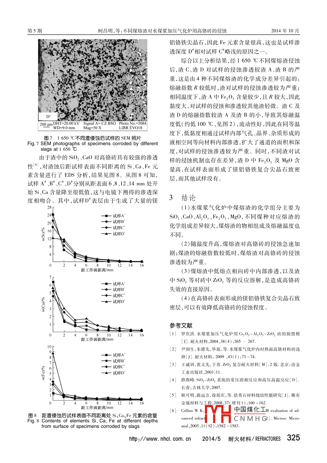 2014年10月oMi耐火材料321 ~ 326第48卷第5期.不同煤熔渣對(duì)水煤漿加壓氣化爐用高鉻磚的侵蝕柯昌明”李有奇趙繼增2)李楠'韓兵強(qiáng)'1)武漢科技大學(xué)省部共建耐火材料與冶金國(guó)家重點(diǎn)實(shí)驗(yàn)室湖 北武漢4300812)洛陽(yáng)利爾耐火材料有限公司河 南洛陽(yáng)471023摘要:為研究不同煤熔渣對(duì)高鉻磚的侵蝕機(jī)制,選取4種物理化學(xué)性能差異較大的典型氣化爐用后煤熔渣,采用化學(xué)分析、XRD、SEM及EDS等研究了不同煤熔渣的性能及其對(duì)w(Cr203)≥90%的高鉻磚的侵蝕、滲透情況。結(jié)果表明:氣化爐中煤熔渣主要由SiO2、CaO、Al203、Fe203、Mg0組成,但不同煤熔渣的化學(xué)組成差異較大,礦物組成及熔融特性溫度也不同;在相同條件下,高鉻磚侵蝕的主要影響因素是溫度和熔渣的化學(xué)組成,隨溫度升高,煤熔渣對(duì)高鉻磚的侵蝕急速加劇;煤渣中的熔融指數(shù)較低時(shí),煤熔渣對(duì)高鉻磚的侵蝕滲透較為嚴(yán)重;煤熔渣中低熔點(diǎn)相向材料內(nèi)部滲透、渣中SiO2等對(duì)材料中ZrO2等的反應(yīng)溶解是造成高鉻磚失效的直接原因;高.鉻磚表面形成鎂鋁鉻鐵復(fù)合尖晶石致密層可以有效降低高鉻磚的侵蝕程度。關(guān)鍵詞:水煤漿加壓氣化爐;煤熔渣;熔融指數(shù);抗渣侵蝕性;尖晶石致密層中圖分類號(hào):TQ175.7文獻(xiàn)標(biāo)識(shí)碼:A文章編號(hào):1001 - 1935(2014)05 -0321 -06DOI:10. 3969/j. isn.1001 - 1935. 2014. 05.001水煤漿加壓氣化爐是整個(gè)水煤漿氣化生產(chǎn)線的C灼燒后備用,編號(hào)分別為A、B、C、D。試驗(yàn)用坩堝核心設(shè)備,其內(nèi)襯所用高鉻磚除了承受高溫高壓外,由w(Cr203)≥90%、w(ZrO2) =4%、w(Al203) =5%還要遭受還原性氣氛、熔渣的侵蝕和高溫氣流的沖的LR-HCB95高鉻磚鉆孔而得,孔的尺寸為φ35 mm刷,使用環(huán)境十分惡劣。隨著煤化工行業(yè)的發(fā)展,對(duì)x30 mm。應(yīng)的氣化爐操作壓力更高,操作溫度更高,單位投煤1.2 試驗(yàn)過程量更大,煤種更多,對(duì)氣化爐用高鉻磚的性能也提出首先利用化學(xué)分析、LZ-I爐渣熔化特性測(cè)試儀、了更高的要求[1-2]。不同煤種對(duì)應(yīng)的熔渣差異很大,XRD.SEM等分析手段對(duì)不同煤渣的性能進(jìn)行了分因此對(duì)高鉻磚的侵蝕滲透也不同。為此,研究了不同析,然后采用靜態(tài)坩堝法進(jìn)行了不同煤渣的渣侵蝕試煤種對(duì)應(yīng)煤渣的特性以及不同煤熔渣對(duì)高鉻磚的侵驗(yàn)。將不同煤渣分別等量(約20 g)置于4個(gè)坩堝中,蝕滲透情況,以期為提高氣化爐用高鉻磚的煤種適應(yīng)分別在電爐中進(jìn)行1350 C和梭式窯中1650 C保溫性以及使用壽命提供理論及實(shí)踐基礎(chǔ)。10h的熱處理,渣侵蝕試驗(yàn)后的坩堝試樣分別記為A"、B*、C#、D*(與煤渣A、B、C、D相對(duì)應(yīng))。冷卻后的試驗(yàn)坩堝在切割機(jī)上沿坩堝中軸線切開,觀察坩堝中殘?jiān)闆r及渣侵蝕情況,SEM分析渣侵蝕后試樣的顯微1.1 煤渣和坩堝的制備氣化爐煤熔渣主要來自于煤中的雜質(zhì)成分,如結(jié)構(gòu)Si02、CaO、 Fe2O3、Al2O3 等;另外,部分廠家在氣化爐運(yùn)行過程中由于液態(tài)排渣要求需要額外加入一定量2結(jié)果與討論的石英砂等對(duì)煤漿成分進(jìn)行調(diào)整,最終這些物質(zhì)在高2.1不同煤渣的性能分析溫下熔化形成了煤熔渣。本試驗(yàn)共在全國(guó)不同地域2.1.1煤渣的化學(xué)組成采集了12種氣化爐用后煤熔渣,選取了其中4種物煤渣的化學(xué)組成見表1??梢钥闯?4種典型渣理化學(xué)性能差異較大的典型熔渣作為研究對(duì)象,在--中國(guó)煤化工定程度上,該渣也代表了國(guó)內(nèi)氣化爐用煤熔渣的基本柯昌明:男CNMHGE-mail :qisprMYH特征。由于煤渣中煤的含量較高,所以將渣經(jīng)1 000收稿日期:2014- -01-16編輯:張子英http://www. nhcl. com. cn2014/5耐 火材料/ REFRACTORIES 321耐火材料/NAIHUO CAILIAO2014年第48卷樣中Al2O3、MgO、TiO2、K,0和Na2O的含量變化較溫度(T)較高。小, SiO2、CaO和Fe203的含量變化較大。渣樣C中結(jié)合煤渣的物相分析及Si02 -Al2O3-CaO相圖,含有0.60%(w)的Cr2O3,這可能是高鉻磚在使用過當(dāng)CAS(熔點(diǎn)1 553 C)與C2AS(熔點(diǎn)1 593 C)共存程中Cr2O3溶蝕進(jìn)人渣中所致。時(shí),低共熔溫度降至1380C,且渣A和渣B中含有表1 不同煤渣的化學(xué)組成石英相(熔點(diǎn)1723C),因此渣A和渣B熔融溫度高Table 1 Chemical compositions of different coal slags于渣C和渣D的。煤渣5i02 CaO Al203 Fe203 MgO Ti02 K2O Na2O Cr2O32.1.4煤渣的 顯微形貌A 58.94 12.78 19.20 4.43 2.41 0.79 0.71 0.741000C灼燒后的4種熔渣的顯微照片見圖3。可B 54.24 10.89 16.71 13.54 2.53 0.92 0.61 0.5C 46.78 18.64 14.80 14.17 2.97 0.57 0.69 0.77 0.60以看出,煤渣A經(jīng)1000C灼燒處理后仍呈顆粒狀,并_D 33.23 22.34 17.28 20.02 4.66 0.55 0.63 1.29且顆粒上分布著較多的大氣孔;煤渣B中有少許熔球;煤渣C和D中有較多熔融態(tài)或半熔融態(tài)的熔球及玻璃2.1.2煤渣的物相組成4種典型煤渣的XRD圖譜見圖1。可以看出,煤.相。此種現(xiàn)象與四種渣樣的熔融溫度相對(duì)應(yīng)。渣A與B的晶相為鈣長(zhǎng)石(CAS2)、輝石(Ca( Mg, Al,Fe)Si2O。)和石英( Si02);煤渣C和渣D的晶相除了含有CAS2和Ca( Mg,Al,Fe)Si20。外,還有鋁方柱石(C2AS)。- CAS,-Ca(Mg.AI,Fe)S-石英A20 pumDHT- 20.00kV Signal A=CZ BSO Photo No.-276WD-8.5 mm Mag-200 xLIRR EVO18Dwin01o460圖1不同煤渣的 XRD圖譜Fig.1 XRD patt