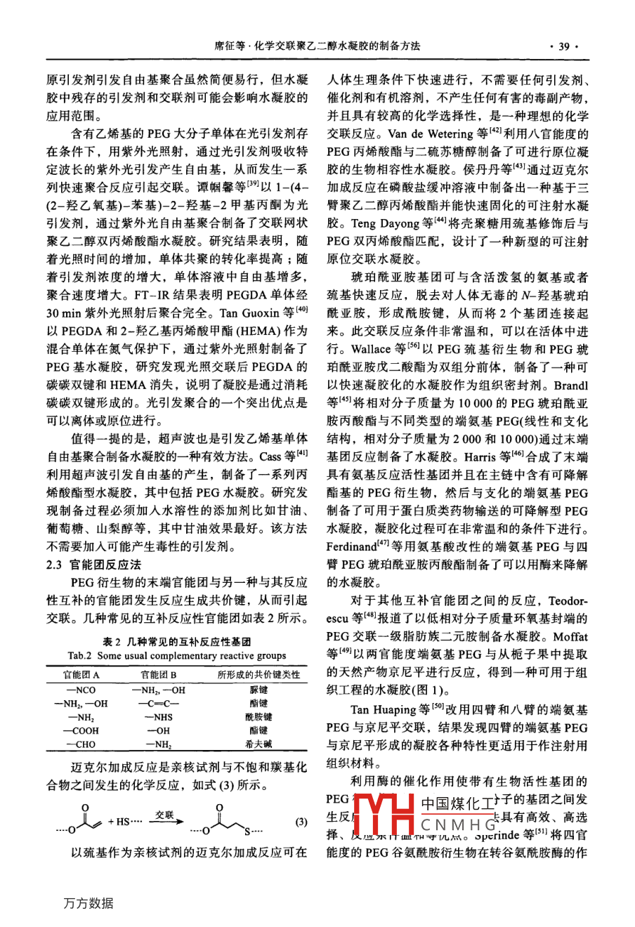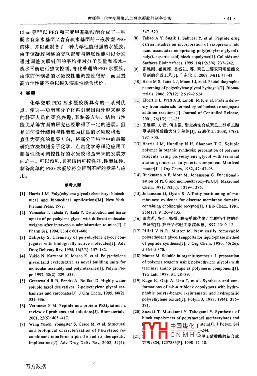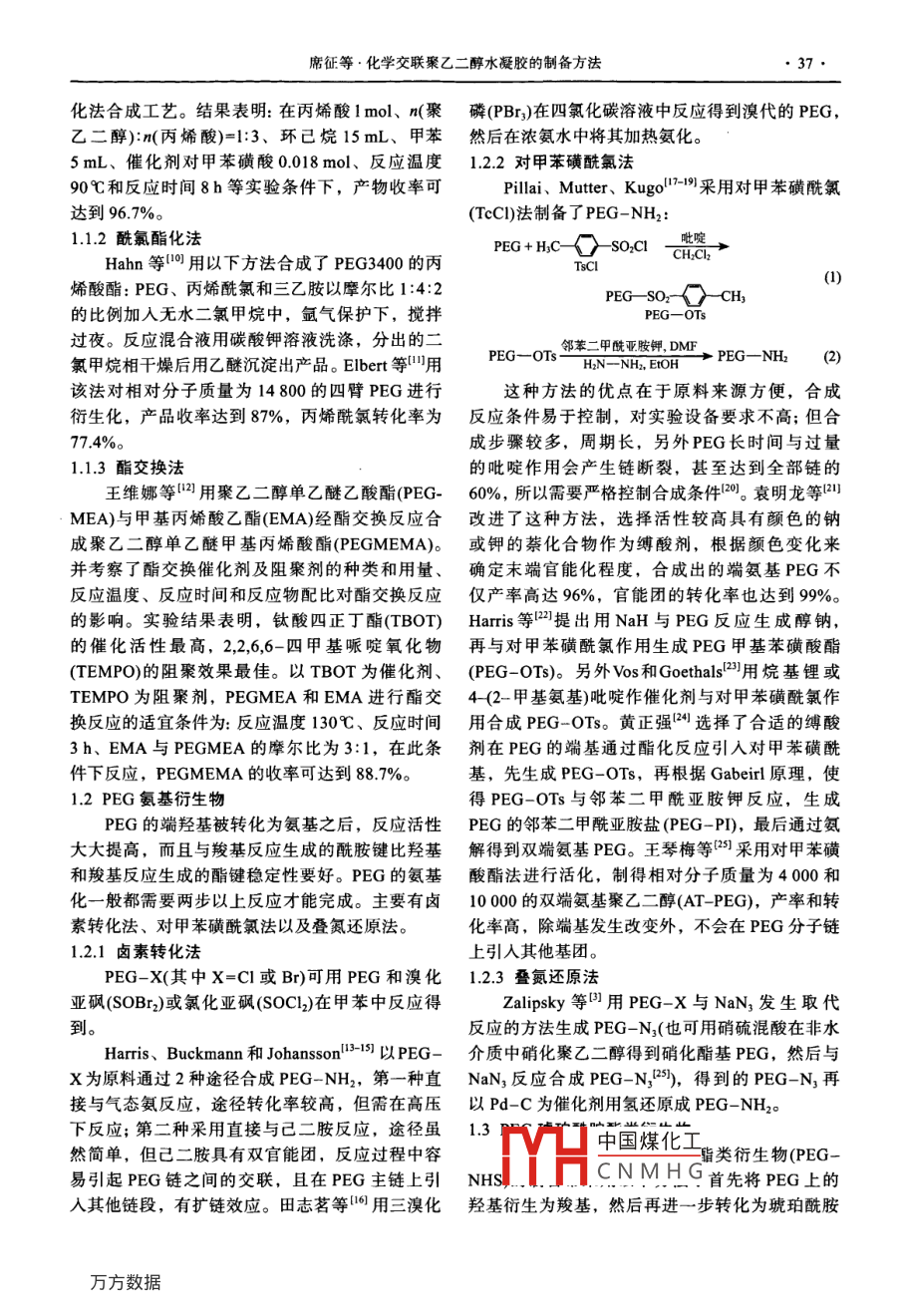 化學(xué)推進(jìn)劑與高分子材料Chemical Propellants & Polymeric Materials2011年第9卷第3期化學(xué)交聯(lián)聚乙二醇水凝膠的制備方法席征,蒿銀偉,張志國(guó),趙傳富,牛群釗,王波(黎明化工研究院,河南洛陽471000)摘要: 對(duì)化學(xué)交聯(lián)聚乙二醇基水凝膠的研究進(jìn)展進(jìn)行了綜述。介紹了該類水凝膠的制備方法,包括幾種常見的前體制備方法和常用的交聯(lián)方法,并討論了影響水凝膠溶脹性能和力學(xué)性能的幾種因素關(guān)鍵詞:聚乙二醇;水凝膠;前體;合成;交聯(lián)中圖分類號(hào): R318.08文獻(xiàn)標(biāo)識(shí)碼:A 文章編號(hào): 1672 -2191(2011)03 -0036 -08聚乙二醇(PEG)是一種水溶性聚醚型高分子物通過物理或化學(xué)交聯(lián)的方式生成,具有較多的化合物,廣泛用于醫(yī)藥、衛(wèi)生、食品、化工等領(lǐng)交聯(lián)方式,因而可得到許多結(jié)構(gòu)及功能不同的水域。PEG具有很多優(yōu)點(diǎn),如低毒性、不凝血性以凝膠?;瘜W(xué)交聯(lián)水凝膠是水凝膠的-個(gè)主要種類,及生物相容性,而且能被機(jī)體迅速排出體外而不是由高分子鏈段間以共價(jià)鍵的形式交聯(lián)而形成,產(chǎn)生任何毒副作用1-2]。PEG 和其他分子偶合時(shí),具有結(jié)構(gòu)穩(wěn)定性較好,制備相對(duì)容易,物理化學(xué)其許多優(yōu)良性質(zhì)也會(huì)隨之轉(zhuǎn)移到結(jié)合物中(-51。因性質(zhì)調(diào)控性好等優(yōu)點(diǎn)。PEG化學(xué)交聯(lián)水凝膠在藥此,它在醫(yī)學(xué)上的應(yīng)用受到了廣泛的重視,并得物控釋載體、組織工程、燒傷輔料以及組織黏合到美國(guó)食品與藥物管理局(FDA)的認(rèn)可。劑等方面有很好的應(yīng)用前景,目前已有幾種產(chǎn)品水凝膠是一種三維親水性網(wǎng)絡(luò)狀聚合物,可獲準(zhǔn)上市(表1)。以吸收大量的水或生物體液6-7。這種網(wǎng)絡(luò)狀聚合化學(xué)交聯(lián)水凝膠制備-般分 為兩步進(jìn)行,首.物可由均聚物或共聚物構(gòu)成,由于交聯(lián)的存在而先進(jìn)行前體物的制備,即末端帶有功能基團(tuán)的線不會(huì)溶于水中。水凝膠所具有的高含水量和柔軟形 或星形PEG(包括聚氧化乙烯, PEO), 然后再.結(jié)構(gòu),相比其他人工合成的生物材料,更類似于選擇不同的交聯(lián)方式進(jìn)行凝膠化,利用某些交聯(lián)活體組織問,因此可應(yīng)用于生物和醫(yī)學(xué)工程領(lǐng)域。方法比如高能輻射法也可以使PEG不需衍生化直PEG基水凝膠一般可由PEG或其末端修飾接進(jìn)行凝膠化。表1幾種已經(jīng)上市的PEG水凝膠產(chǎn)品Tab.1 Several PEG hydrogel products on market商品名應(yīng)用領(lǐng)域凝膠組成交聯(lián)方式生產(chǎn)商Vigilon傷口輔料PEO高能輻射交聯(lián)HypolM傷口輔料、藥物傳遞PEGSprayGelTM預(yù)防腹腔粘連PEG-NHS, PEG-NH2官能團(tuán)反應(yīng)交聯(lián)Confuent SurgicalDuraScald組織密封劑PEG-NHS,三賴氨酸Confluent SurgicalOcutecTM隱形眼鏡OcutecsQZ GelIDM藥物挖釋PEG,殼聚糖Macromed (Sandy, UT, USA)注: NHS為琥珀酰胺。1凝膠前體的制備體;采用較高相對(duì)分子質(zhì)量的常用末端官能團(tuán)反1.1 PEG 丙烯酸酯類衍生物應(yīng)法。PEG丙烯酸酯的制備方法主要有:直接酯PEG丙烯酸酯類衍生物是最常用的一種凝膠化法、酰氯酯化法、酯交換法等。制備前體,可以用不同的方式進(jìn)行交聯(lián),如低相1.1.1 直接酯化法對(duì)分子質(zhì)量的可作為自由基聚合交聯(lián)的大分子單。 中國(guó)煤化工丙烯酸酯的直接酯收稿日期: 2010-12-14FYHCNMHG作者簡(jiǎn)介:席征(1979-),男,助理工程師,主要從事推進(jìn)劑原材料研發(fā)工作。電子信箱: lricixzh@yahoo.cn席征等.化學(xué)交聯(lián)聚乙二醇水凝膠的制備方法●37●化法合成工藝。結(jié)果表明:在丙烯酸1mol、n(聚磷(PBr,)在四氯 化碳溶液中反應(yīng)得到溴代的PEG,乙二醇):n(丙烯酸)=1:3、環(huán)已烷15mL、甲苯然后在濃氨水中將其加熱氨化。5mL、催化劑對(duì)甲苯磺酸0.018mol、反應(yīng)溫度1.2.2對(duì)甲苯磺酰氯法90和反應(yīng)時(shí)間8h等實(shí)驗(yàn)條件下,產(chǎn)物收率可Pillai、 Mutter、 Kugo17-19)采 用對(duì)甲苯磺酰氯達(dá)到96.7%。(TcC1)法制備了PEG- NH2:1.1.2酰氯酯化法吡啶PEG+H2C- o -SO2ClCH2ChHahn等I0]用以下方法合成了PEG3400的丙TsCl烯酸酯: PEG、丙烯酰氯和三乙胺以摩爾比1:4:2PEG- -SO2- > -CH, .的比例加入無水二氯甲烷中,氬氣保護(hù)下,攪拌PEG-OTs過夜。反應(yīng)混合液用碳酸鉀溶液洗滌,分出的二鄰苯二甲酰亞胺鉀, DMF十PEG-NH(2氯甲烷相干燥后用乙醚沉淀出產(chǎn)品。Elbert等川用HN- NH2, ETOH該法對(duì)相對(duì)分子質(zhì)量為14800的四臂PEG進(jìn)行這種方法的優(yōu)點(diǎn)在于原料來源方便,合成衍生化,產(chǎn)品收率達(dá)到87%,丙烯酰氯轉(zhuǎn)化率為反應(yīng)條件易 于控制,對(duì)實(shí)驗(yàn)設(shè)備要求不高;但合77.4%。成步驟較多,周期長(zhǎng),另外PEG長(zhǎng)時(shí)間與過量1.1.3酯交換法的吡啶作用會(huì)產(chǎn)生鏈斷裂,甚至達(dá)到全部鏈的王維娜等121用聚乙二醇單乙醚乙酸酯(PEG-60%,所以需要嚴(yán)格控制合成條件120。袁明龍等[2MEA)與甲基丙烯酸乙酯(EMA)經(jīng)酯交換反應(yīng)合改進(jìn)了這種方法,選擇活性較高具有顏色的鈉成聚乙二醇單乙醚甲基丙烯酸酯(PEGMEMA)?;蜮浀妮粱衔镒鳛榭`酸劑,根據(jù)顏色變化來并考察了酯交