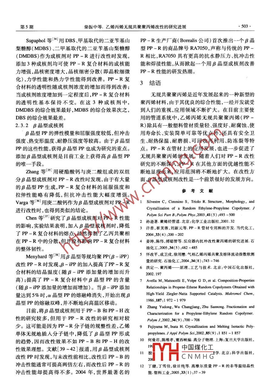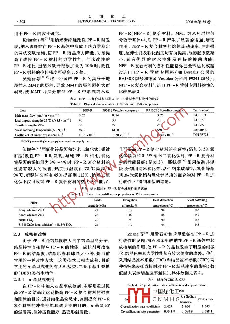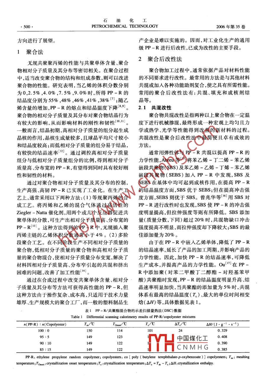 工2006年第35卷第5PETROCHEMICAL TECHNOLOGY乙烯丙烯無(wú)規(guī)共聚聚丙烯改性的研究進(jìn)展柴振中,郭紹輝!,馮嘉春2,鄭德3(1中國(guó)石油大學(xué)(北京)化工學(xué)院,北京102249;2.復(fù)旦大學(xué)高分子科學(xué)系,上海2004333.廣東煒林納功能材料有限公司,廣東佛山528521)[籀要]乙烯丙烯無(wú)規(guī)共聚聚丙烯(PP-R)因具有均衡的力學(xué)性能及良好的綜合性能,成為近年通用聚烯烴材料研究的熱點(diǎn)。但PP-R仍存在高溫?zé)崤蛎浵禂?shù)大缺口沖擊強(qiáng)度不夠高等不足。通過(guò)聚合法或聚合后改性法可進(jìn)一步改善這種材料的性能針對(duì)PP-R改性方法——聚合法和聚合后改性法(包括共混、填充、成核劑改性)進(jìn)行了綜述;并結(jié)合以前的工作,對(duì)PP-R的應(yīng)用及改性方向進(jìn)行了展望[關(guān)鍵詞]聚丙烯;乙烯;丙烯;無(wú)規(guī)共聚;改性;聚合[文章編號(hào)]1000-8144(2005-049-06[中圖分類(lèi)號(hào)]TQ325.14[文獻(xiàn)標(biāo)識(shí)碼]AAdvances in Modification of Ethylene Propylene Random CopolymerChai Zhenzhong, Guo Shaohui, Feng Jiachun?, Zheng De(1. College of Chemical Science andring, China University of Petroleum, Beijing 102249, China;2 Department of Macromolecule Science, Fudan University, Shanghai 200433, China;3. Guangdong Winner Functional Materials Co Ltd., Foshan Guangdong 528521, China)Abstract] Ethylene propylene random copolymer( PP-R)is a thermoplastic with many desirableproperties including low cost, good processability and balanced mechanical properties. However, someshortages, namely poor impact property, particularly at low temperature, and large thermal expansioncoefficient'at higher temperatures, limit its wide application. The polymerization and post-olymerization modification are two main categories in which its performance is improved. Recentlymore attention was paid to the latter due to its cheapness, effectiveness, handy and environmentallyfriendly in features. In this paper, current situation in research and development for post-polymerizationmodification, including blending, nano-composite filling, crystal-modification etc., were reviewed indetail. Current problems in this field were also introducedKeywords polypropylene; ethylene; propylene; random copolymerization; modificationpolymerization聚丙烯(PP)具有來(lái)源豐富、價(jià)格便宜加工容高特別是低溫時(shí)沖擊性能等方面還達(dá)不到要求。易、力學(xué)性能好、密度小等優(yōu)點(diǎn),是一種綜合性能良為了改善并提高PP-R的性能,拓寬其應(yīng)用領(lǐng)域好的通用塑料,廣泛應(yīng)用于汽車(chē)化工建筑、包裝、人們?cè)诟男苑矫?聚合法和聚合后改性法)做了大電氣等行業(yè)。乙烯丙烯無(wú)規(guī)共聚聚丙烯(PP-R)是量工作聚丙烯的一種,是丙烯和少量乙烯在一定溫度、壓力本文針對(duì)PP-R的改性方法—聚合法和聚和催化劑的作用下共聚得到的。結(jié)構(gòu)上的特點(diǎn)使合后改性法(包括共混、填充、成核劑改性)進(jìn)行了PP-R具有均聚聚丙烯(PP-H)或嵌段接枝共聚綜述;并結(jié)合以前的工作,對(duì)PP-R的應(yīng)用及改性聚丙烯(PP-B)所不具備的性能,近年來(lái)在管道應(yīng)用等方面取得了突飛猛進(jìn)的發(fā)展6。但是,隨著收稿中國(guó)煤化工20601-1[作者對(duì)PP-R研究的日益深入,人們對(duì)其性能提出了更馮嘉春HCNMHG州市人,土。聯(lián)系人fudan. edu. cn o高的要求。盡管PP-R有諸多優(yōu)點(diǎn),但也有不足:[基金項(xiàng)目]國(guó)家高技術(shù)研究發(fā)展計(jì)劃“863”資助項(xiàng)目(204A在高溫(95℃)時(shí)熱膨脹系數(shù)較大缺口沖擊強(qiáng)度不324010);上海市科委資助項(xiàng)目(05580395)。石油化工500PETROCHEMICAL TECHNOLOGY2006年第35卷方向進(jìn)行了展望產(chǎn)企業(yè)是難以實(shí)施的。因而,對(duì)工業(yè)化生產(chǎn)的通用級(jí)PP-R進(jìn)行后改性,已成為改性的主要手段。1聚合法無(wú)規(guī)共聚聚丙烯的性能與共聚單體含量、棗合2聚合后改性法物相對(duì)分子質(zhì)量及其分布等密切相關(guān)。在聚合過(guò)程聚合物加工過(guò)程中,通常依據(jù)產(chǎn)品對(duì)材料性能中,適當(dāng)改變聚合物的結(jié)構(gòu)和組成參數(shù),則可以改進(jìn)的不同要求進(jìn)行改性。最常用的方法是與其他材料聚合物的性能。研究表明,當(dāng)乙烯的體積分?jǐn)?shù)分別共混或加人各種功能助劑復(fù)合,使之具有所需性能為0,25%,4.0%,7.5%,9.0%時(shí),所得PP-R的常用的聚合后改性法有:共混、填充和成核劑結(jié)結(jié)晶度分別為55%,48%,46%,41%,38%;隨乙晶等。烯含量的增加,PP-R的熔點(diǎn)和結(jié)晶溫度下降9。2.1共混改性聚合物的相對(duì)分子質(zhì)量及其分布對(duì)聚合物結(jié)晶行為聚合物共混改性是指兩種以上聚合物在一定溫有較大的影響,從而影響材料的剛性和韌性01度下進(jìn)行機(jī)械摻混,最終形成一種宏觀上均勻且力一般而言,結(jié)晶初期,高相對(duì)分子質(zhì)量的組分起生成學(xué)或熱學(xué)、光學(xué)等性能得到改善的新材料的過(guò)程。晶核的作用,晶核生成量較多,且球晶平均尺寸較小共混改性是聚合后改性法中最簡(jiǎn)便且卓有成效的和結(jié)晶度較高;而低相對(duì)分子質(zhì)量的組分易于結(jié)晶,方法。有較快的結(jié)晶速率12。通過(guò)調(diào)控高相對(duì)分子質(zhì)量通常用彈性體與P-R共混以提高PP-R的組分與低相對(duì)分子質(zhì)量組分的比例,得到相對(duì)分