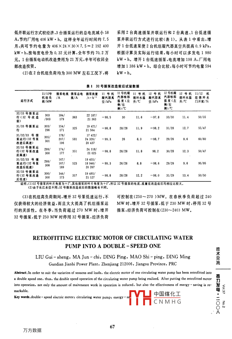 循環(huán)水泵電動機雙速改造劉桂生,馬駿馳,丁平,冒士平,丁銘國電諫壁發(fā)電廠,江蘇鎮(zhèn)江212006[摘要]為適應季節(jié)和負荷變化,將1臺循環(huán)水泵電動機改為雙速電機動,改造投用后,不但運行維護量少且節(jié)能效果明顯[關鍵詞]循環(huán)水泵;雙速電動機;凝汽器;節(jié)能[中圖分類號]TM3[文獻標識碼]B[文章編號]1002-3364(2008)02-0066-02國電諫壁發(fā)電廠六期2×330MW機組汽輪機型(1)根據三相繞組對稱和繞組系數盡可能高的原號為N330-16.67/538/538,配置有4臺PHZ1600-則,在不更換定子鐵芯的前提下,將同一繞組變?yōu)?61100型50%容量的循環(huán)水泵(循泵,分別為31號~34極(371r/min)及18極(333r/min)。號),單泵流量為23400m3/h,揚程為16m,配套電動(2)對電動機的相關參數進行核算,防止在18極機型號為YL1800-16/1730-1,功率為1800kW,電時電動機產生異常振動及噪聲。壓為6000V,轉速為371r/min。2×330MW機組的(3)通過改變外部接線實現333/min(18極)和循環(huán)水系統采用母管制運行方式。在運行中,循環(huán)水371r/min(16極)2種轉速的切換。量只能通過增減循環(huán)水泵臺數來調節(jié),在春秋季70%(4)當電源電壓在(5.6~6.6)kV之間變化時,保負荷和冬季90%以上負荷時,2臺循泵運行水量偏少電動機在2種轉速下的輸出功率維持在相對應的額3臺循泵運行水量偏多。對此,擬將1臺循泵電動機定值內由單轉速改為雙轉速,以實現循泵雙速運行和節(jié)能降(5)允許全壓起動,最低起動電壓不低于70%額耗定電壓,可帶負荷起動,電動機繞組為F級絕緣,部件3臺溫升滿足B級要求。允許冷態(tài)下連續(xù)起動2次1循泵電動機改造方法熱態(tài)下起動1次。(6)在2種轉速下三相磁場對稱,振動值不大于根據循泵的性能曲線,其轉速改變不太大時,泵的0.05mm技效率近似不變,流量揚程功率則與轉速近似成一次(7)在2種轉速情況下電動機的繞組均有較高的分術方、二次方、三次方關系下降。2X300MW機組循泵布系數,具有良好的運行性能,不應有異常的電磁噪聲流電動機繞組極數為16極,定子槽數為108槽、轉子槽數為132槽,雙鼠籠結構。如將繞組極數改為18極,2運行效果分析熱轉速將變?yōu)?3r/min,此時泵的流量揚程功率分別為原轉速(37lr/mn)時的88.8%、0.789%、71.0%(1)在2臺機組負荷均為300MW左右工況下,將電可較好地滿足運行要求。因此,決定將32號循泵電動采用3臺高速循泵并聯運行與2臺高速1臺低速循泵機進行改造。中國煤化工從表1中看出,2高1確O作者簡介:劉桂生(1969),男,國電津壁發(fā)電廠設備管理部工程師從事汽輪HCNMHGE-mailu. com低并聯運行方式較經濟,3臺循泵運行的總電流減小58采用2臺高速循泵并聯運行和2臺高速、1臺低速循A,節(jié)約廠用電406kW·h。這樣全年運行時間約7.5泵并聯運行方式進行比較(表1)。從表1中看出,增月,共可節(jié)約電量為406×24×30×7.5=2192400開1臺低速泵使2臺機組凝汽器真空共提高0.9kPa,kW·h,按每度電價為0.32元計算,全年節(jié)約70.2萬根據計算及實際運行結果,每小時可以多發(fā)電1980。1臺循泵電動機改造費用為21萬元,半年可收回全kW·h。增開1臺低速循泵,電流增加198A,廠用電部改造投資增加1386kW·h。綜合比較,每小時可節(jié)約電量5942)在2臺機組負荷均為300MW左右工況下,將kW·h表132號循泵改造前后試驗數據112號循泵電流循泵總電循泵流量11號機11號機凝11號機11/12機機組負/A汽器真汽器喉部循環(huán)水溫組循環(huán)水運行方式荷/MW空/kPa溫度(左升/℃2::門開度/%側/右2/3號循果運303行(32號改造184/17922187/-92136311.67.833/3011.450/5531/33號循泵運303/15419421/-9828/2811.9-98.231/2812.755/47泵運行(32號泵305/178/31/32/33號循98.729/2660/60改造后高速)2043732/33號循泵運行(32號泵改造2411898.828/2811.898.230/2812.3后高速1/32/33號循299/泵運行(32號泵306189167/52318946/-99.326/268.89.6改造后低速)32/33號循泵運行(32號泵改造9495/211298.828/2812.2-98.031/2913.450/50說明;(1)32號循泵的葉片角度為+2,其他循泵的葉片角度為+0,所以32號循泵的電流、流量在改造前后均相應比較大2)由于長江水位不同,32號循泵改造前后的數據略有不同(3)在機組高負荷期間,增開32號泵低速運行,不可控制在(250~270)MW。在春秋季負荷超過240僅獲得較大的經濟效益,而且大大提高了機組循泵運MW時,增開32號循泵,低于230MW時,停用32號行的靈活性。在冬季,當負荷超過270MW時,增開循泵,經濟負荷可控制在(230~240)MW32號循泵,低于250MW時停用32號循泵,經濟負荷RETROFITTING ELECTRIC MOTOR OF CIRCULATING WATERPUMP INTO A DOUBLE-SPEED ONELIU Gui-sheng, MA Jun-chi, DING Ping, MAO Shi-ping, DING MingGuodian Jianbi Power Plant, Zhenjiang 212006, Jiangsu Province, PRC流Abstract: In order to suit the variation of seasons and loads, the electric motor of one circulating water pump has been retrofitted intoa double speed one, thus, the double speed operation of the circulating water pump being realized. After putting the retrofitted motorinto operation, not only the amount of maitenance work in operation is reduced, but also the effectiveness of energy-saving is re- R