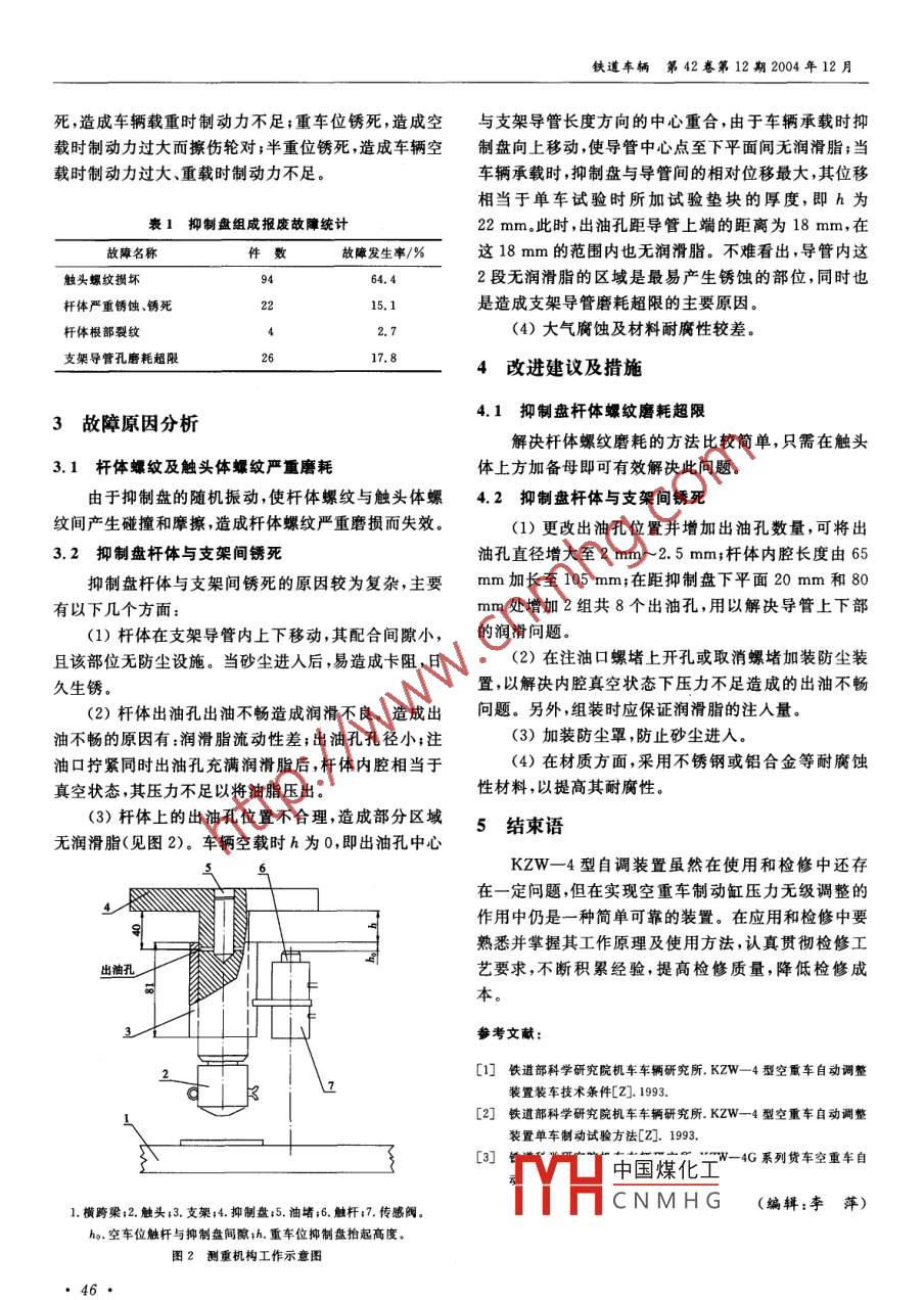 運用檢修鐵道豐輛第42卷第12期2004年12月文章編號:1002-7602(2004)12-004502KZW—4型空重車自動調(diào)整裝置測重機構(gòu)的故障分析與建議劉金海(鐵道部駐中國北車集團北京二七車輛廠車輛驗收室,北京100072)摘要:闡迷了KZW—4型空重豐自動調(diào)整裝置測重機構(gòu)存在的問題,對其原因進行了分析,并提出了改進建議關(guān)鍵詞:空重車自動調(diào)整裝置;KZW—4型;測重機構(gòu);故障分析;改進中圖分類號:U270.351文獻標識碼:BKZW-4型及KzW-4G型空重車自動調(diào)整裝置(以下簡稱自調(diào)裝置)已大量應(yīng)用于鐵路貨車上。裝用KZW-4型自調(diào)裝置的車輛已于1998年進入第1容積風(fēng)缸個廠修期,裝用KZW-4G型自調(diào)裝置的車輛也將于2004年進入第1個廠修期。KZW-4G型自調(diào)裝置是KzW-4型自調(diào)裝置的改進型,兩者結(jié)構(gòu)上有許多相20似之處。因此,對KZW-4型自調(diào)裝置在檢修中發(fā)現(xiàn)的問題進行認真分析,可以為KZW-4G型自調(diào)裝置入廠檢修提供重要的參考。隨著裝用KZW—4型自制動缸調(diào)裝置的貨車入廠檢修數(shù)量的不斷增加,其測重機構(gòu)報廢率高的問題顯得越來越突出。在實際檢修工作中,該部位是自調(diào)裝置中故障率最高的部位。為此,本1.橫跨梁;2.開口銷;3.調(diào)整螺母;4.支架;5.抑制盤;6.調(diào)文將針對此問題進行分析。壓彈簧:7.復(fù)原彈簧;8.觸桿;9.空重車顯示牌;10.顯示彈1測重機構(gòu)工作原理簧;11.顯示活塞;12.比例閥活塞;13.夾芯閥;14.壓力彈簧;15.止回閥;16.止回閥彈簧;17.傳感閥活塞KzW-4型空重車自動調(diào)整裝置的原理圖見圖1KZW-4型空重車自動調(diào)整裝置原理圖抑制盤安裝在支架的圓柱形導(dǎo)管上,并可在導(dǎo)管抑制盤組成作為KZW-4型自調(diào)裝置中測重機內(nèi)上下移動。轉(zhuǎn)動調(diào)整螺母可調(diào)整其長度。車輛為空構(gòu)的主要組成部分,其工作狀態(tài)如何對整個裝置來說車位時,抑制盤的圓盤坐落在閥座支架導(dǎo)管頂端作為是至關(guān)重要的??哲囄粫r傳感閥稱重的基準;當(dāng)車輛承載時,抑制盤調(diào)2故障統(tǒng)計整螺母與橫跨梁接觸后,圓盤則與橫跨梁維持不變的相對高度,作為承載時傳感閥稱重的基準。2003年12月—2004年4月,對北京二七車輛廠C-4傳感閥安裝在閥座支架上,觸桿向上,正對檢修的100套自調(diào)裝置抑制盤組成的故障進行了統(tǒng)計抑制盤的下盤面。車輛承載時,C-4傳感閥隨車體下(表1)。這100套自調(diào)裝置測重機構(gòu)中抑制盤組成移,其觸桿與抑制盤下盤面的距離將隨載重的增加而100%報廢。從表1可以看出,造成抑制盤組成報廢的增加。車輛制動時,C一4傳感閥根據(jù)觸桿伸出的長度原因主要是觸頭螺紋損壞、桿體嚴重銹蝕或銹死、支架來測量載重并通過進入容積風(fēng)缸的壓力空氣去驅(qū)動導(dǎo)管THS中國煤化工B-4比例閥,從而控制進入制動缸的空氣的壓力體與CNMHG調(diào)裝置中有22套桿,口心雙22%。其中,10件是收稿日期:200407-23重車位銹死,9件是空車位銹死,3件是半重位銹死。作者簡介:劉金海(1967-),男,工程師不論是哪一種情況,都可能危及行車安全,即空車位銹45·鐵道車輛第42卷第12期2004年12月死,造成車輛載重時制動力不足;重車位銹死,造成空與支架導(dǎo)管長度方向的中心重合,由于車輛承載時抑載時制動力過大而擦傷輪對;半重位銹死,造成車輛空制盤向上移動使導(dǎo)管中心點至下平面間無潤滑脂;當(dāng)載時制動力過大、重載時制動力不足。車輛承載時,抑制盤與導(dǎo)管間的相對位移最大,其位移相當(dāng)于單車試驗時所加試驗墊塊的厚度,即h為表1抑制盤組成報廢故障統(tǒng)計22mm此時,出油孔距導(dǎo)管上端的距離為18mm,在故障名稱件數(shù)故障發(fā)生率/%這18mm的范圍內(nèi)也無潤滑脂。不難看出,導(dǎo)管內(nèi)這觸頭螺紋損壞2段無潤滑脂的區(qū)域是最易產(chǎn)生銹蝕的部位,同時也桿體嚴重銹蝕、銹死是造成支架導(dǎo)管磨耗超限的主要原因。桿體根部裂紋(4)大氣腐蝕及材料耐腐性較差支架導(dǎo)管孔磨耗超限17,84改進建議及措施3故障原因分析4.1抑制盤桿體螺紋磨耗超限解決桿體螺紋磨耗的方法比較簡單,只需在觸頭3.1桿體螺紋及觸頭體螺紋嚴重磨耗體上方加備母即可有效解決此問題由于抑制盤的隨機振動,使桿體螺紋與觸頭體螺4.2抑制盤桿體與支架間銹死紋間產(chǎn)生碰撞和摩擦,造成桿體螺紋嚴重磨損而失效(1)更改出油孔位置并增加出油孔數(shù)量,可將出3.2抑制盤桿體與支架間銹死油孔直徑增大至2mm~2.5mm;桿體內(nèi)腔長度由65抑制盤桿體與支架間銹死的原因較為復(fù)雜,主要mm加長至105mm;在距抑制盤下平面20mm和80有以下幾個方面:mm處增加2組共8個出油孔,用以解決導(dǎo)管上下部(1)桿體在支架導(dǎo)管內(nèi)上下移動,其配合間隙小,的潤滑問題。且該部位無防塵設(shè)施。當(dāng)砂塵進入后,易造成卡阻,日(2)在注油口螺堵上開孔或取消螺堵加裝防塵裝久生銹。置,以解決內(nèi)腔真空狀態(tài)下壓力不足造成的出油不暢(2)桿體出油孔出油不暢造成潤滑不良。造成出問題。另外,組裝時應(yīng)保證潤滑脂的注入量。油不暢的原因有:潤滑脂流動性差;出油孔孔徑小;注(3)加裝防塵罩,防止砂塵進人。油口擰緊同時出油孔充滿潤滑脂后,桿體內(nèi)腔相當(dāng)于(4)在材質(zhì)方面,采用不銹鋼或鋁合金