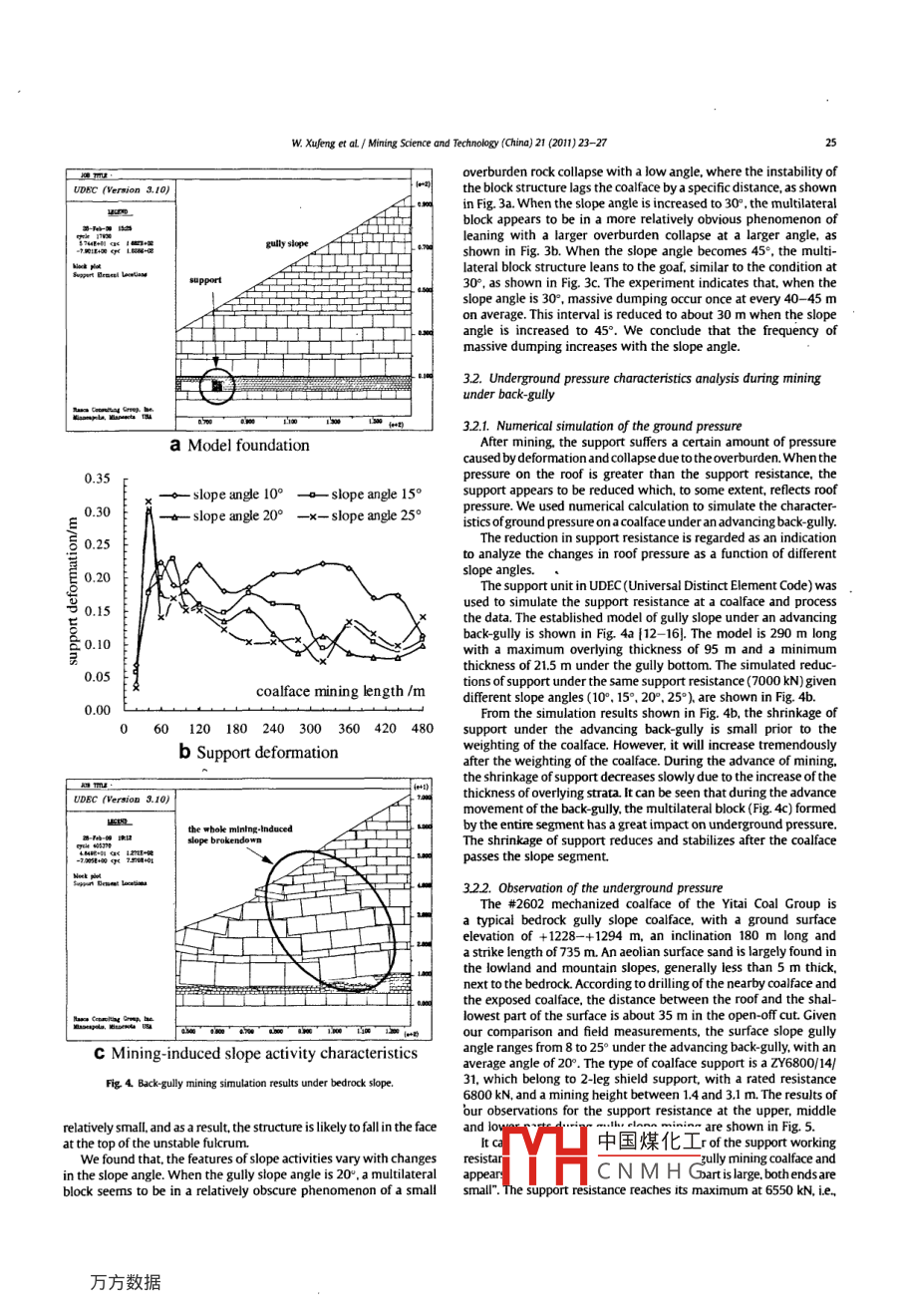 Mining Science and Technology( China)21 (2011)23-27Mining Science and Technology( china)ELSEVIERjournalhomepagewww.elsevier.com/locate/mstcUnderground pressure characteristics analysis in back-gully mining of shallowcoal seam under a bedrock gully slopeWang Xufeng,", Zhang dongsheng Fan Gangwei, Zhang ChengguosTate Key Laboratory of Coal Resource and Mine Safety, China University of Mining S Technology. Xuzhou 221008,ChinaARTICLE IN FOA BSTRACTWe studied underground pressure and its mechanism during back-gully mining in a shallow coal seamI April 2010nder a bedrock gully slope, by means of physical simulation, numerical modeling and field monitoring. TheJune 2010esults show that the intensity of underground pressure is relatedrelative position at the coalface. Thederground pressure is intensive and the support resistance reaches a maximum when the coalface is ate bottom of the gully, whereas the underground pressure is moderate and decreases gradually when theShallow coal seamdirection to the slope dip during back- gully mining and form an unstable. multilateral block hingedtructure, due to slipping. The subsidence of multilateral blocks is considerable when the block fragmen-rmous changes in the underground pressure with an increase in the mass ofhe block body, the block displacement will be reduced in conjunction with an increased clamp effect byboth the unbroken rocks and broken rocks in the goaf, resulting in a decrease of the underground pressure.Copyright o 2011, China University of Mining Technology. All rights reserved.1. Introductionunderground pressure and reveal its mechanism. The preliminarystudies have shown that the composition of gully slope materialThe undulating surface topography features are the result of and the advancing direction of a coalface have a large effect on thenew characteristics of underground pressure during long-wall pressure at underground coalfaces. Hence, we introduce themining in shallow coal seams in northwestern China. Increasingly,advance of coalfaces under back-gullies as the main miningmore attention is paid to this phenomenon with its adverse effect method, based on the geological conditions of bedrock gullieson safety and efficiency in coal production. Zhong, Zhang et alKang, Kang et aL. and Wang et al. have pointed out the particular 2. Shape and material composition of bedrock gully slopesphenomena of underground pressure and surface subsidenceduring coal mining under mountains in western areas of ChinaBy bedrock gully slopes, we refer to slopes entirely composed of11-5). In addition, we carried out a series of studies on the features weathered bedrock, or slopes covered with a thin unconsolidated layerof gully slope activities and their classification for mining under under conditions which can be ignored for the entire slope(category l).slopes in mining areas of western China with wide gullies 6-8Their shapes and characteristic material composition are shown in Fig 1.These investigations have provided the technical support forAs part of the dongsheng coalfield, the Yitai coalfield is mostlyground control, as well as enriching ground control theories of covered with material from the quaternary. A subject to the impactofshallow coal seam mining in this area. However, special studieswater erosion, the region is full of criss-crossed gullies, with exposedthe characteristics of ground pressure during shallow coal minirbedrock and the variation in surface height is relatively large. Besides,the under gully slopes are just at an initial stage and the achieve- the varied morphology of the overlying gully slopes is that of typicalments of these studies have not yet been systemic or thorough. hilly erosion of a plateau. Within this mining area, bedrock gullies aremining practices under gully slopes will become more commonostly eroded slopes with dual-structured material composition.The upper part is a loess layer of different periods of the quatenary,Therefore, it is necessary to analyze the characteristics ofusually 2-3 m thick but may be as much as 10 m. Thexposed in the lower part, where weathering is very serious. TheslopeCorresponding author. Tel: +86 15950672601.中國(guó)煤化工 generally2045. DitchesE-mail address: wangxufengecumteducn(W. Xufeng).CNMHG1674-5264/s-see front matter Copyright e 2011, China University of Mining Technology. All rightdoi:10.1016/msc201012002w. Xufeng et aL/Miming Science and Technology( China)21(2011)23-27is only one thick and hard rock in the bedrock which controls theoverburden movement and either lies in the lower part of the frac-tured zone or in the caved zone3. Undergroback-gully mining under bedrock gully slopes3.1. Physical simulation of slope activities during back-gully miningunder bedrock gullies3. 1.1. PhysicalA physical model was established basing on the geology of thelayewusu gully at the Nalinmiao coalmine with dimensions5 m x 0.3 m x 0.95 m. The major similarity coefficients are asa category Ifollows: geometric ratio ar- 100; bulk density ratio ar=167 andintensity ratio ar =aI x ay= 167. Sand is used as an aggregatematerial and calcium carbonate together with gypsum as cementing material. The corresponding material ratios of the various rockswere determined basing on a comprehensive consideration of thecharacteristics of rock deformation 9-11]. In order to improve onthe limitations of our plane stress model and reduce the test errors.a transparent plexiglass was placed at the bottom of the model,preventing excessive lateral deformation and fragmentary leakageIn order to analyze the features of slope gully mining activitiesunder different conditions of slope angles without changing thegeological conditions, two physical models with slope angles of 20,30 and 45 were established. Fig. 2 shows the model of a simulatedvertical gully, 73.5 m deep with a slope angle of 30b3. 1.2. Slope activitiesFig. 1. Bedrock gully slope shape and features of material composition.The slope activities of the bedroc