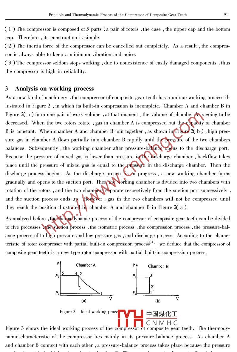 International Joumal of Plant Engineering and ManagementVol. 10 No.2June 2005Principle and Thermodynamic Process of the Compressorof Composite Gear TeethXIONG Wei , YU Xiao-ling , PENG Xue-yuan , FENG Quan-keSchool of Energy and Power Engineering , Xi' an Jiaotong University ,Xi'an , Shaanxi 710049 , P. R. ChinaAbstract : The compressor of composite gear teeth is a new type of rotor compressor with partial built-incompression process. Analysis of its thermodynamic process indicates that the built-in process is incom-plete. The thermodynamic process of the comupressor of composite gear teeth can be considered as fiveprocesses : the suction process , the isometric process , the compression process , the pressure-balanceprocess at high pressure and low pressure gas , and discharge process. Here ,it is necessary to explainfurther the pressure-balance process. The pressure-balance process is isometric process. It is found thatthe isometric process of gas in chamber A whose capacity is 83 percent of total work volume can be elim-inated basically through extending the discharge port to connect early the discharge port with the cham-ber B. By the above-mentioned method ,the loss of energy will be reduced.Key word : rotor compressor , pressure-balance , isometric process1 IntroductionThe gear pump is used extensively as a pumping-liquid mechanism. However , the gear pump trans-mits relatively lttle liquid in one rotation due to lttle inter-lobe area on the end face. For this prob-lem , Erich , proposed the mechanism of composite gear teeth in 19681. In the proposed mecha-nism , some of the small gear teeth are replaced by several big gear teeth respectively , correspond-ingly , some of the small grooves are replaced by several big grooves. By this way , the inter-lobe ca-pacity increases greatly ,resulting in high capacity transported in one rotation. The design refers to agear type rotary mechanism for transporting liquid , compressing and expending gas. It is composedof a case and a pair of gear-type rotors installed in the case. The driving shaft of the rotors is drivenby synchromesh gear which is installed out of the case for transmitting torque. In this design , thegear teeth do not contact with each other. Each gear includes several sets of small teeth and one ormore big teeth alternated with them.In fact , although the two rotors keep engaging with each other , they are out of actual metallic contactwith each other. Therefore , additional gears (中國煤化工be mounted out of thecase so as to drive the shaft of the rotor. Several kMYHC N M H Gned as the flank profileof the big teeth of the gear type rotor , without being the same as the small teeth. The effective areaused for fluid transferring by the rotors of the gear pump is greatly increased. Unfortunately , the seal .effect cannot be kept between the two big teeth , resulting in a great amount of backflow , thus the ef-Received 17 July 200490International Joumal of Plant Engineering and ManagementVol. 10 No.2June 2005ficiency of the fluid transmission is low , with nearly no function of compressing or expanding gas.The principle of an engaging rotor , proposed by Liao Zhenyf21 , in 1993 , resolved the transmissionof the gear composed of big gear teeth and small teeth. However , there are shortcomings in the prin-ciple , such as inflection point in the profile of the big teeth and imperfect seal. In the compressor ofcomposite gear teeth , suggested by Shen Jinfeng et al.C31 , in 1997 ,the inflection point between thebig teeth and the small teeth was eliminated , and the profile was replaced with none-symmetry pro-file to improve seal function. Subsequently , we carried out theoretic analysis and experiment of thiscompressor. An improved scheme was put forward according to the results of the theoretic analysisand experiment result.-Discharge pipe2 Construction of the prototype compressorDesigned for application in split type air conditioner , theprototype compressor which adopts hermetic upright con-Driving shaftostruction has the similar construction to a typical rotary air-Driven shaf修利主Discharge portconditioning compressor , except that it has two shafts , notDriving gc作期Upper capCylindersingle shaft. As shown in Figure 1. The manner of pumping Driven gear-oil in the lubricating system adapts differential pressureSuction pipeBottom cappumping and helical blade pumping consulting typical rota-ry air-conditioning compressor.Figure 1 Sctional view of the compressorThe compressor of composite gear teeth is composed of cyI-of composite gear teethinder , upper cap , bottom cap , driving gear and driven gear. As shown in Figure 2 ,a pair of en-gaged gear-type rotors is located in the cylinder , three big teeth are distributed evenly in circumfer-ential direction on the driving rotor , and three grooves on the driven rotor. A certain number of smallinvolute gear teeth on the two rotors are functioned as timing and torque transmission. The chambersurrounded by the three big teeth and grooves is used for gas compression. Evidently , the three bigteeth and grooves are also functioned as sealing and torque transmission.Suction portDriven gear ;中CylinderDChamber B1 Driving gearDischarge portChamber Aa)b)Figure2 Working principle of中國煤化工h”YHCNMHGThe suction port is so constructed that the inlet gas is drawn into the working chamber through thecylinder approximately in radial direction. The discharge port is arranged axially in the end plate.It is obvious that , compared with most of other positive displacement compressors , the compressor ofcomposite gear teeth has the advantages as below :Principle and Thermodynamic Process of the Compressor of Composite Gear Teeth9( 1 ) The compressor is composed of 5 parts :a pair of rotors , the case , the upper cap and the bottom .cap. Therefore , its construction is simple.(2 ) The inertia force of the compressor can be cancelled out completely. As a result , the compres-sor is alwa