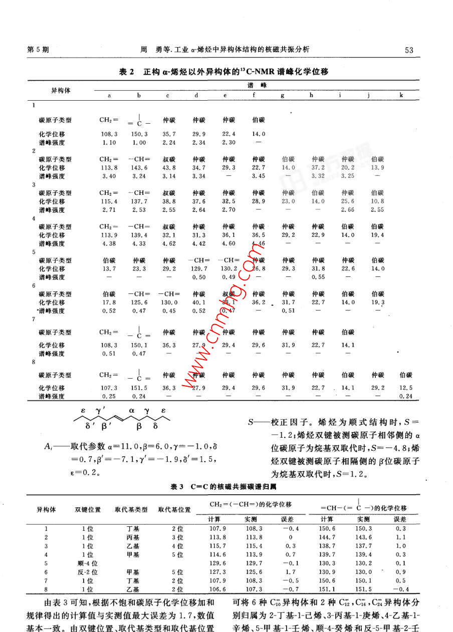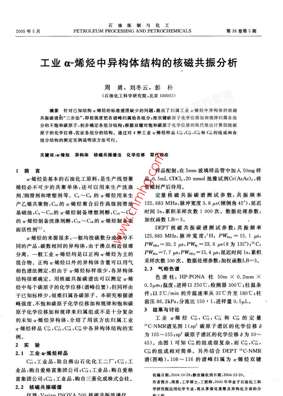 石油煉制與化工2005年5月PETROLEUM PROCESSING AND PETROCHEMICALS第36卷第5期工業(yè)a-烯烴中異構體結構的核磁共振分析周勇,劉冬云,彭樸(石油化工科學研究院,北京100083)摘要針對已知結構a烯烴的標準譜圖缺少的問題,提出了歸屬工業(yè)a烯烴中異構體的核磁共振碳譜的“三步法”,即按強度把各譜峰歸屬給各組分;按雙鍵碳原子化學位移加和規(guī)律歸屬各組分的不飽和碳原子,初步確定各組分結構;根據(jù)雙鍵對飽和碳原子化學位移的取代效應計算烷鏈碳原子的化學位移,佐證各組分的結構。通過對4種工業(yè)a烯烴樣品Cro,Ci,C和Ci的組成和各組分結構的測定實例說明該方法可行。關鍵詞:a烯烴異構體核磁共振譜法化學位移取代效應樣品配制:在5mm玻璃樣品管中加入50mg樣a-烯烴是基本的石油化工原料,是生產線型聚品,0.5mL CDCIs ,20 mmol弛豫試劑Cr(AcAc)s ,將烯烴必不可少的共聚單體,還可以用來生產洗滌管帽封嚴后待用。劑:潤滑劑和增塑劑等。C.~C;的a烯烴用來生定量核磁共振碳譜測試參數(shù):共振頻率產乙烯共聚物,Co的ar烯烴聚合后作高級潤滑油125. 683 MHz,脈沖寬度3. 8 μs(傾倒角45*),延遲基礎油,C。~Co的a烯烴制備增塑劑醇,Cio~C.時間3s,累積采樣次數(shù)1 000次。數(shù)據(jù)處理參數(shù):的a烯烴制備洗滌劑醇,Cx~Cis的ar烯烴制備表加權函數(shù)LB=3。面活性劑”。DEPT核磁共振碳譜測試參數(shù):共振頻率a烯烴的來源很多,一般均按碳數(shù)分成牌號不125. 683 MHz,脈沖寬度:H; PWox=15. 1 μs,同的產品,碳數(shù)相同的異構體,由于沸點相近很難PW80x= 30.2 μs,PWe =22.6 μs(θ為135*);"C:分離。一般工業(yè)a烯烴均是以正構a烯烴為主的PWox=7.7 μs,PW8o,=15.4 μs,延遲時間1s,累積混合物。正構a烯烴以外的異構體含量可以用氣采樣次數(shù) 100次。數(shù)據(jù)處理參數(shù):加權函數(shù)LB=3。相色譜法測定,但由于a-烯烴標樣很少,各異構體2.3 氣相色譜結構很難確定。用核磁共振碳譜法可以測定a-烯色譜柱:HP-PONA柱50mX0.2mmX烴中每個碳原子的化學位移(譜峰位置) ,但同樣由0.5μm;溫度:進樣口250C,檢測器300'C;柱溫條于已知標樣少,很難歸屬各碳原子。本研究根據(jù)譜件:以2C/min的升溫速率從35C升至180C;柱峰強度、不飽和碳原子化學位移加和規(guī)律和飽和碳前壓86. 2kPa,分流比150: 1,進樣量0.5uL。原子化學位移加和規(guī)律來歸屬組成不是十分復雜3結果與討論的未知a烯烴異構體,介紹了用該方法歸屬工業(yè)工業(yè)a烯烴Co,Ciz,C%。和Ca的定量a烯烴樣品Co,Cr,C16,Cu中各異構體結構的實1C-NMR譜見圖1(sp2碳原子譜區(qū)的化學位移δ為105~155;sp’碳原子譜區(qū)的化學位移δ為10~例。45)。由圖1可知Cro的組成很復雜,而Ciz,C%,Ca的組成相對簡單。另外結合DEPT 1C-NMR2.1工業(yè) a-烯烴樣品Cro :工業(yè)品,取自燕山石化化工二廠;Cz:工譜(圖略), 108~116的譜峰歸屬為a烯烴雙鍵業(yè)品,購自愛格富集團公司;Ci:工業(yè)品,購自愛格收稿日期:2004-10-29;修改稿收到日期:2004-12-20.富集團公司;Ca :工業(yè)品,購自三菱化成株式會社。作者簡介:周勇,工學碩士,工程師,2000年畢業(yè)于石油化工科2.2核磁共振碳譜學研究院應用化學專業(yè)。現(xiàn)從事催化重整及異構化方面的分500核T5土振沽遵心第5期周勇等.工業(yè)a烯烴中異構體結構的核磁共振分析53表2正構a-烯烴以外異構體的'C-NMR譜峰化學位移譜峰異構體碳原子類型CH:= -。-仲碳仲碳仲碳 伯碳化學位移108. 3150. 335. 729. 922.4 14.0譜峰強度1.10.2.242.342.30.CH2=一CH=叔碳伯伯碳113.8143. 643.834.729.322.714.037.220.213.93. 403.243. 343. 453.323.25CH2= - CH=115.4 137. 738. 837. 632.528. 923.05.610.82.712.552.642.70.2.66CH2- - - CH=仲碳 仲碳 仲碳113.9 139.431.336.136.529. 22.919, 44.38 4. 334.62.4.424.60CH= -CH≈ 仲碳13.729.2129. 7130. 226. 829. 331.22.6諧峰強度0.500.490.55伯碳-CH= -CH=叔碳仲碳仲伯碳伯碳17.8 125. 6130. 040.133.122.14.019. 3“譜峰強度0.52 0.47 0. 45.0.520.470. 51CH2= _ c-仲碳仲碳仲碳仲碳仲碳27.9 29.4 29.6 31.9 22. 714. 10.51 0. 47CH2= _ c_仲碳.仲碳仲碳仲碳仲碳仲碳伯碳仲碳伯碳107.3 151. 536. 327.929.429.631.922.7 , 14.129.2 12.0.24o, 24S- 校正因子。烯烴為順式結構時,S=δ' ββδ-1.2;烯烴雙鍵被測碳原子相鄰側的aA,-取代參數(shù) a=11.0,β=6.0,r= -1.0,8位碳原子為烷基雙取代時,S=-4.8;烯=0.7,p'=-7.1,r'=-1.9,8'=1.5,烴雙鍵被測碳原子相隔側的β位碳原子e=0.2。為烷基雙取代時,S=1.2。表3 C=C的核磁共振碳譜歸屬雙鍵位置取代基類型取代基位置CH2=(-CH=)的化學位移=CH-(= C -)的化學位移計算實測誤差1位丁基2位107.9108.3-0.4150. 6150. 30.3丙基3位144.7143.61.1乙基4位115.7115.4138. 7137.71.0甲基5位114.6113.90.7139.7139.4順-4位129. 6129.7-0.1130. 3.1反-2位127.3125.61.7130. 9130.0.9-0.5150.6150. 10.5106. 6107.3-0.7151. 1151. 5由表3可知,根據(jù)不飽和碳原子化學位移加和可將6種C%異構體和2種Cz,C1 ,Ci異構體分規(guī)律得出的計算值與實測值最大誤差為1.7,數(shù)值別歸屬為2-丁基-1-己烯、3-丙基1-庚烯、4-乙基-1-基本-一致。由雙鍵位置、取代基類型和取代基位置辛烯、5-甲基-1-千烯、順-4-癸烯和反-5-甲基-2-千54石油煉制與化工2005年第36卷烯、2-丁基-a-烯烴和2-乙基-a-烯烴。移的公式,其余7種異構體的烷鏈碳原子的化學位3.4用模型化合物驗證飽和碳原子部分的化學位移可以根據(jù)相應的飽和烴(母體化合物)中碳原子的移化學位移計算。表4給出了4種烯烴的模型(RX)在初步確定了雙鍵位置、取代基位置和各取代和相應的
